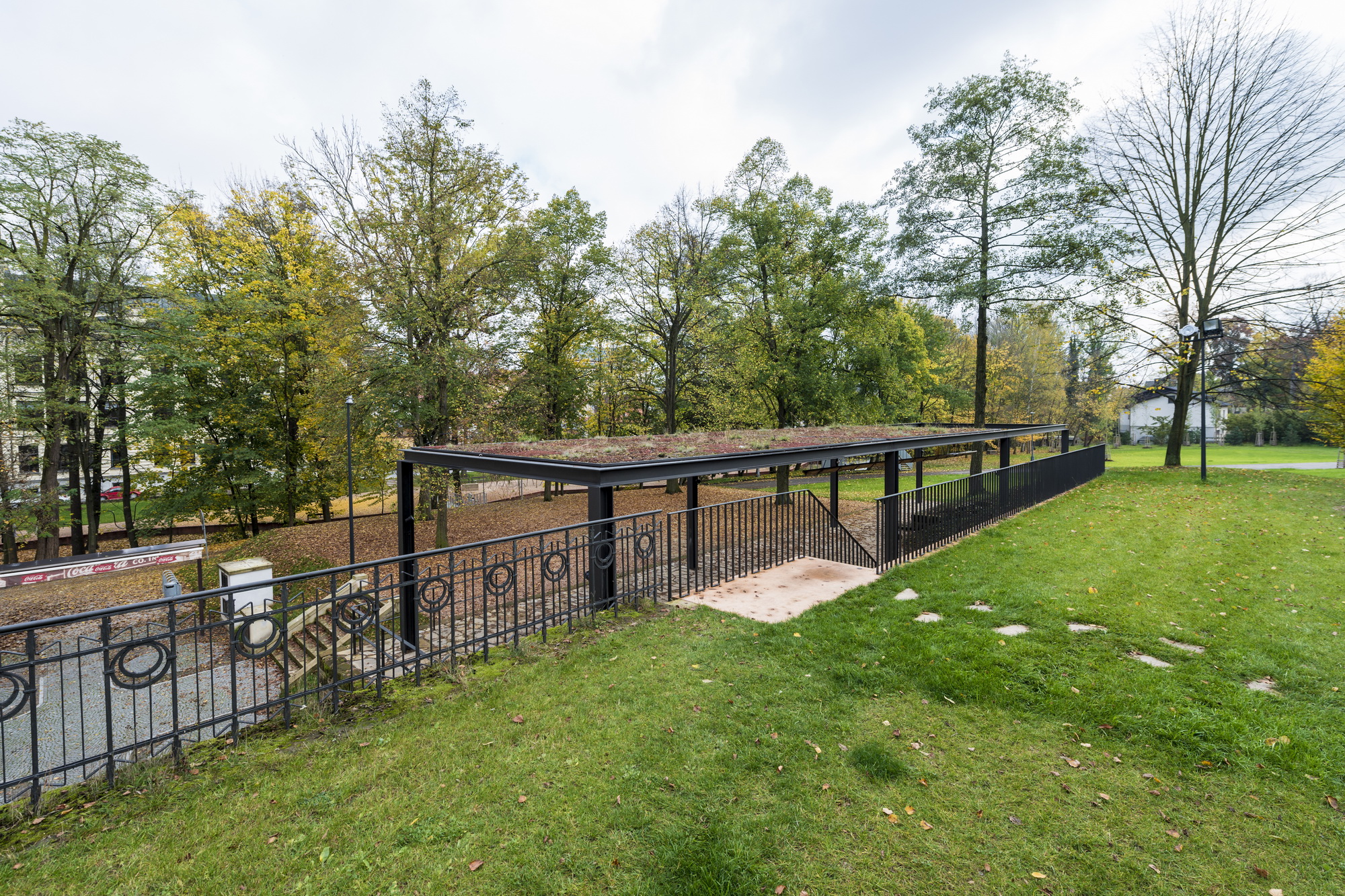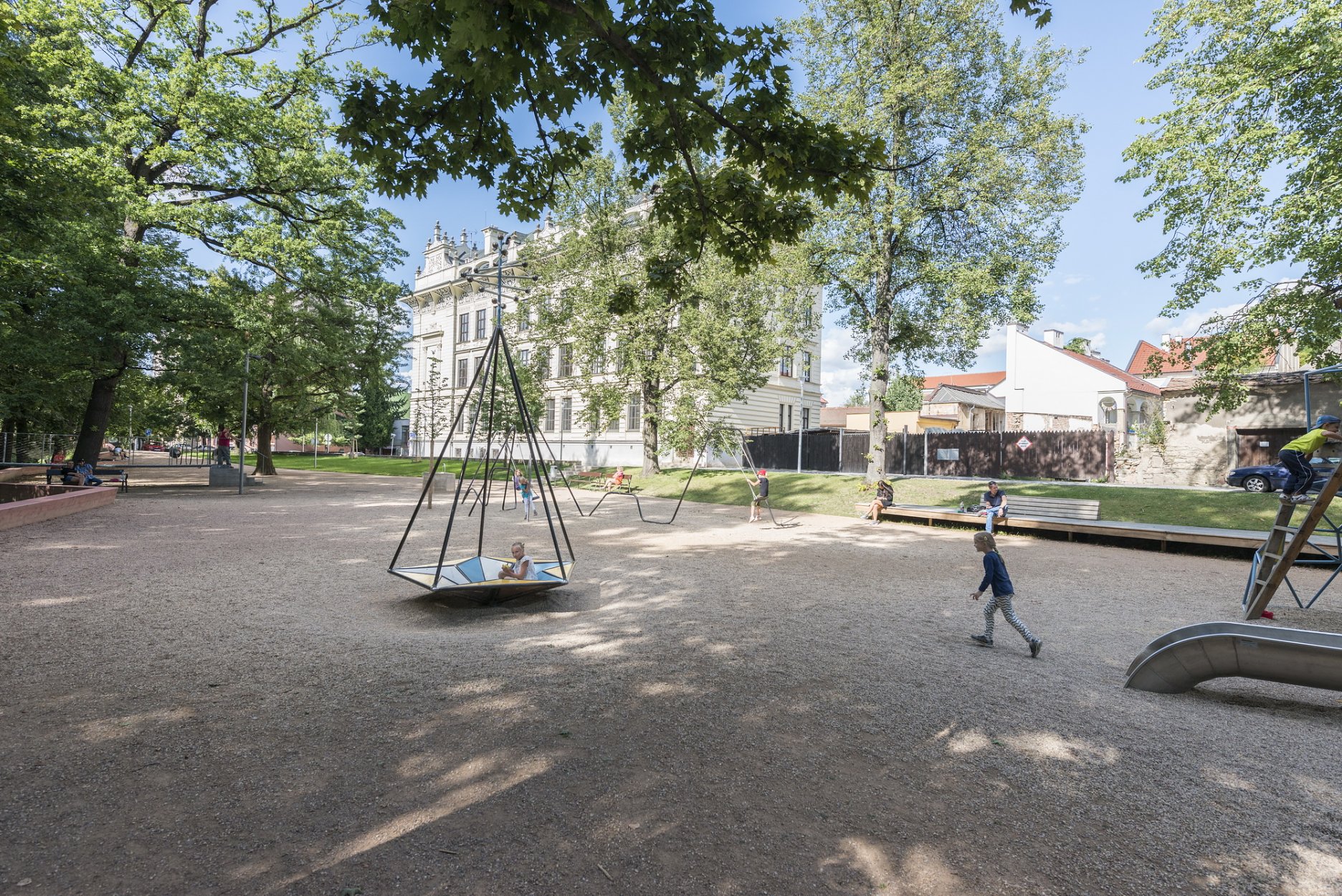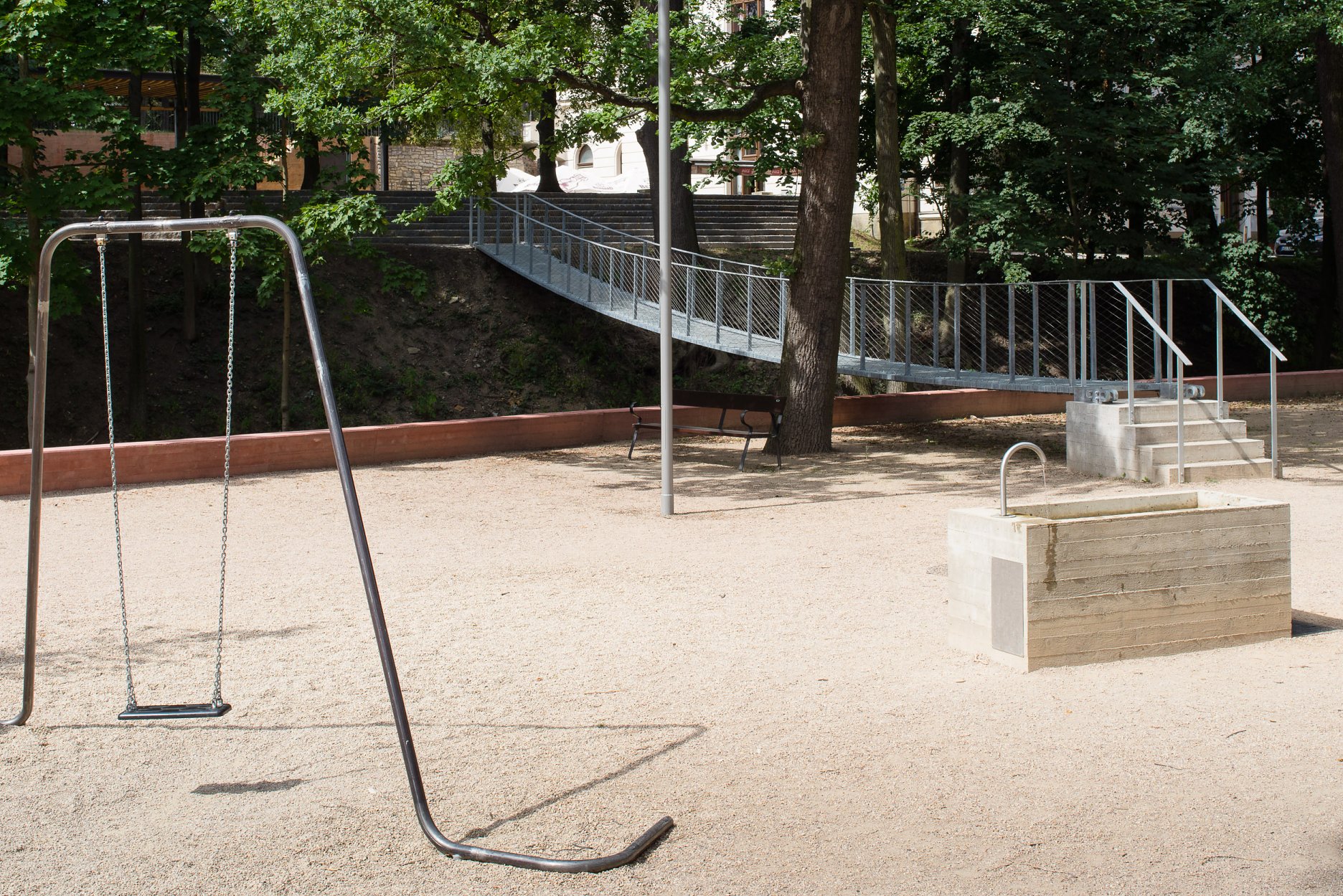 Ťažisko tvorí promenáda na nábreží s originálnym ihriskom pre návštevníkov všetkých vekových kategórií. Sochársky stvárnené ihrisko s hudobnými motívmi od sochárov Pavly Scerankovej a Dušana Zahoranského. “Herní prvky navazují na poválečnou tradici umělecky ztvárněných hřišť v Československu”, vysvetľujú architekti.