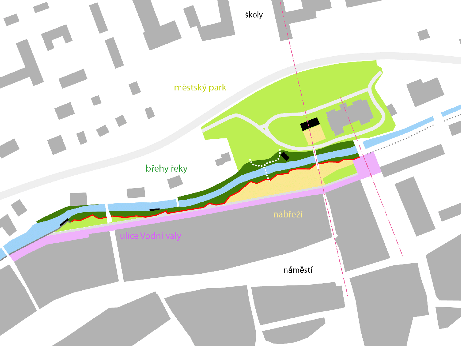 Projekt stojí na koncepcii obnovy a prepojenia štyroch rôznych mestských priestorov - nábrežia, brehov rieky, parku a ulice - do fungujúceho celku. Veľký dôraz bol pritom kladený na zachovanie a posilnenie prirodzených kvalít miesta, hlavne prírodného charakteru brehu rieky Loučná.