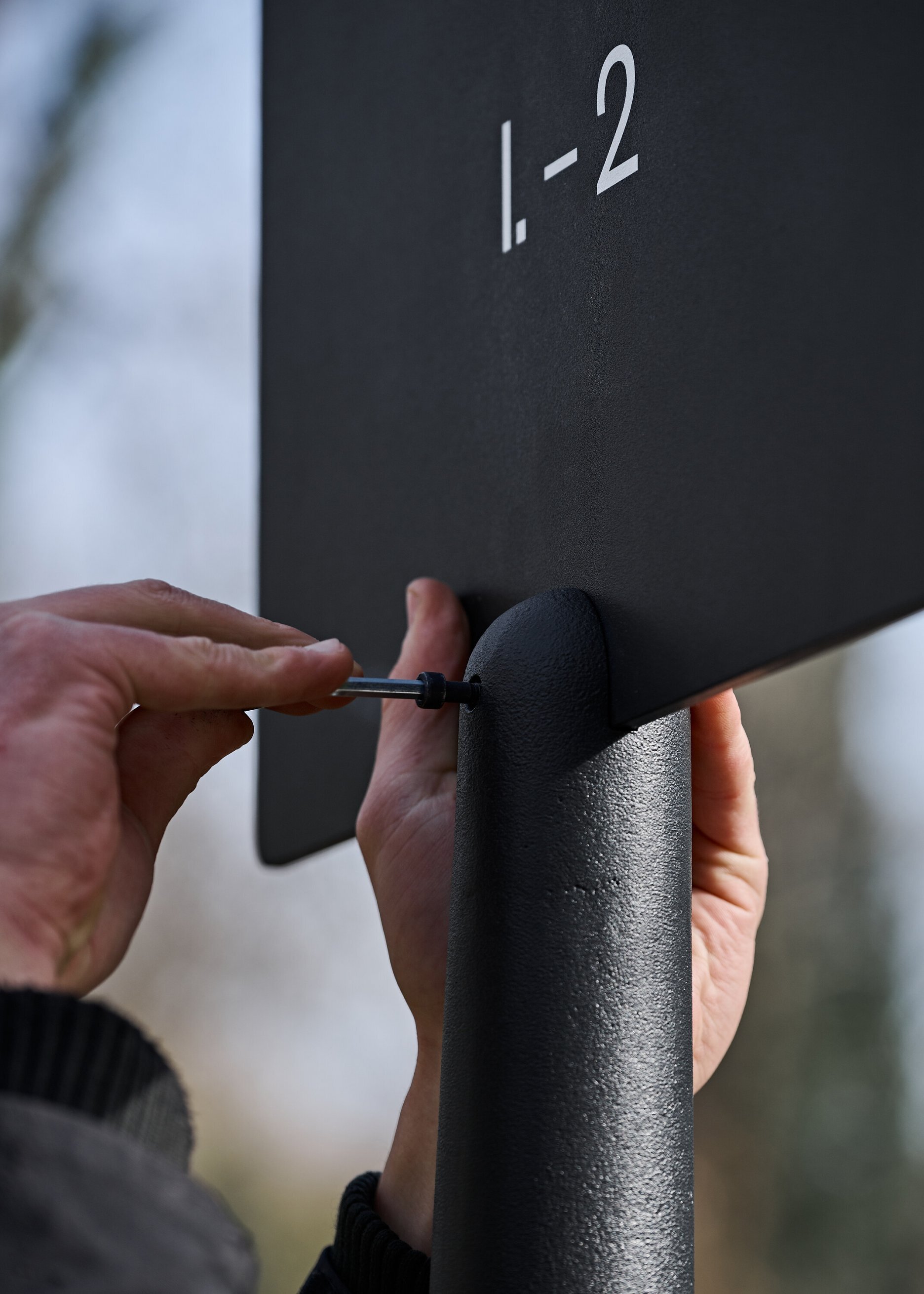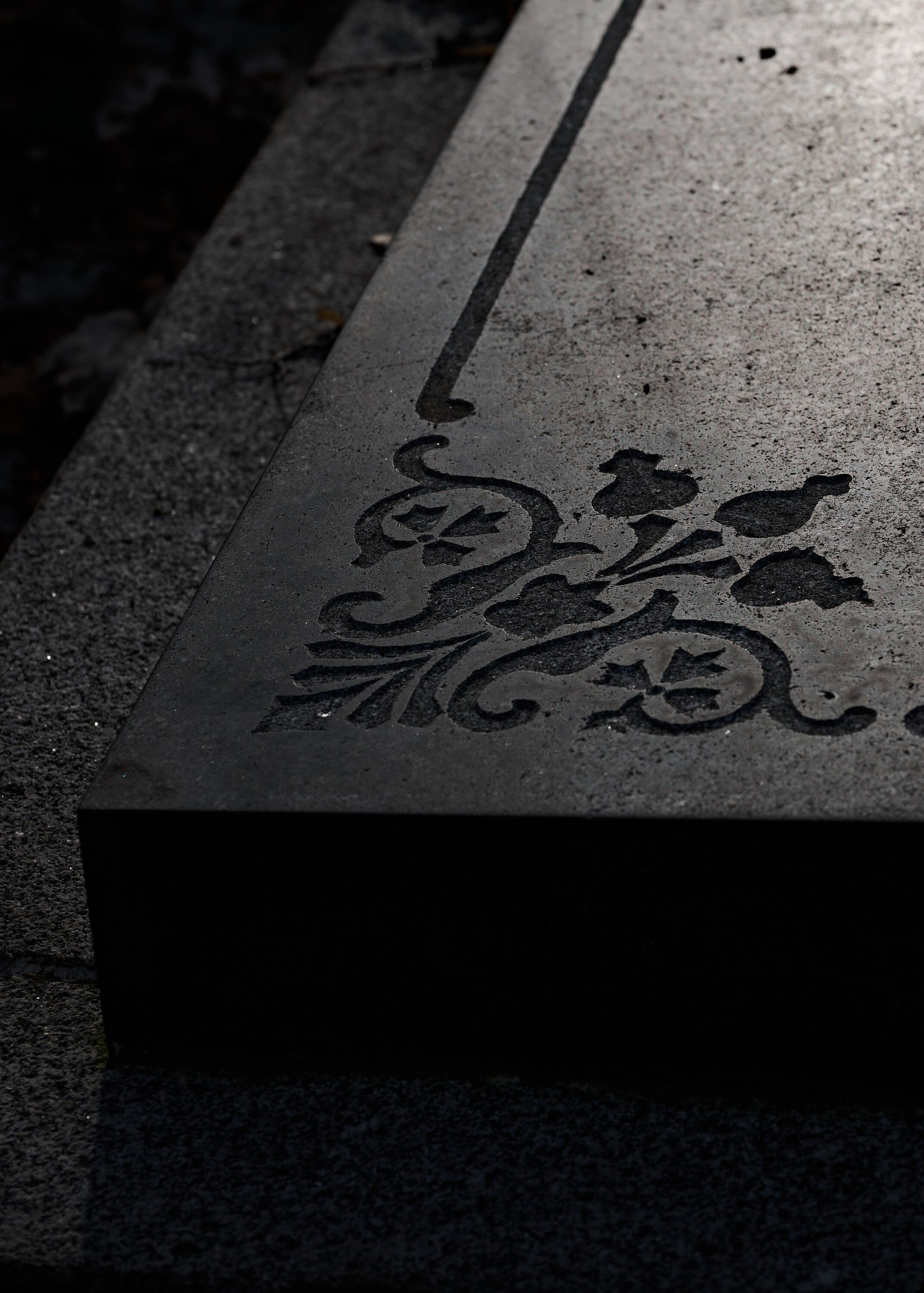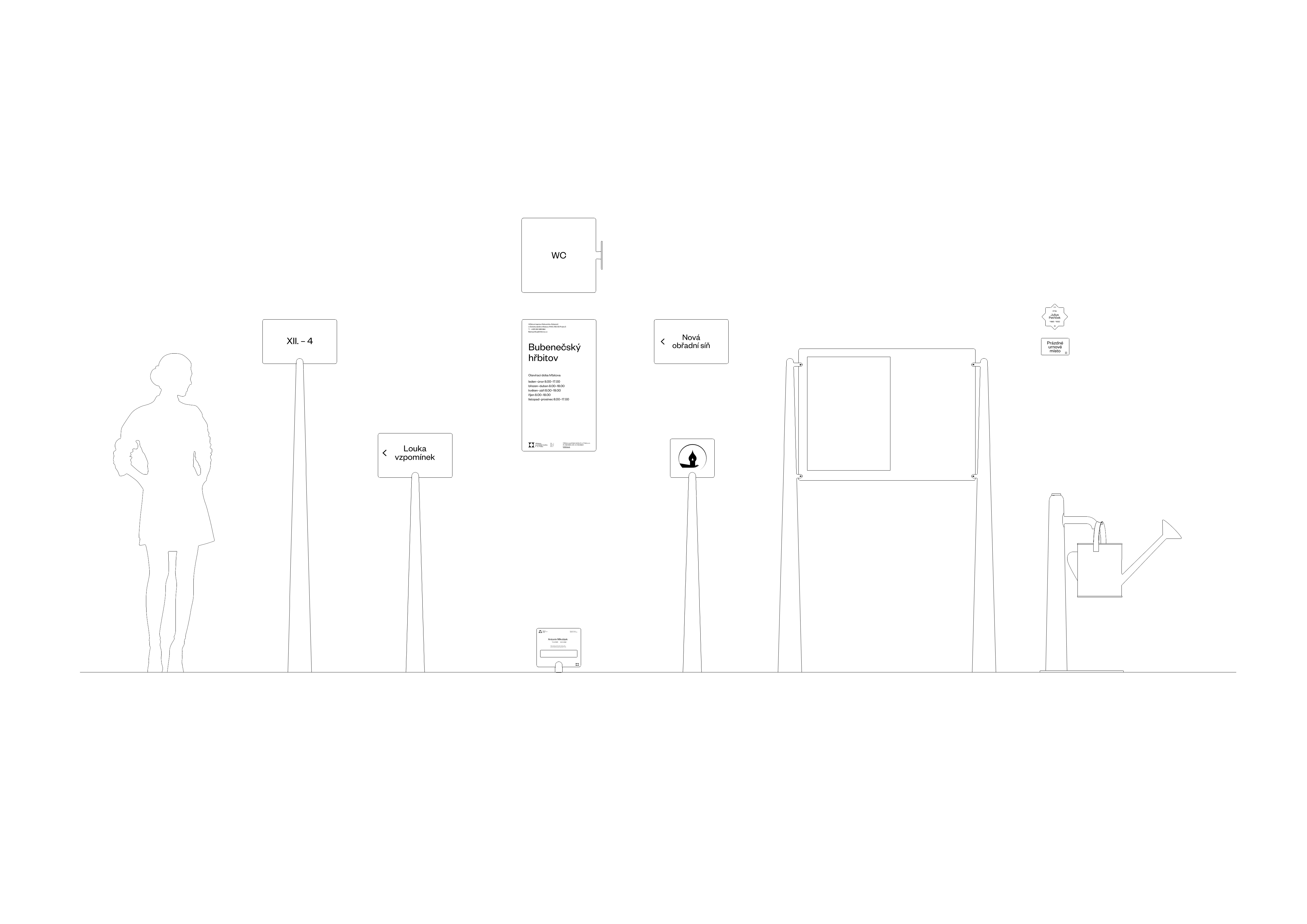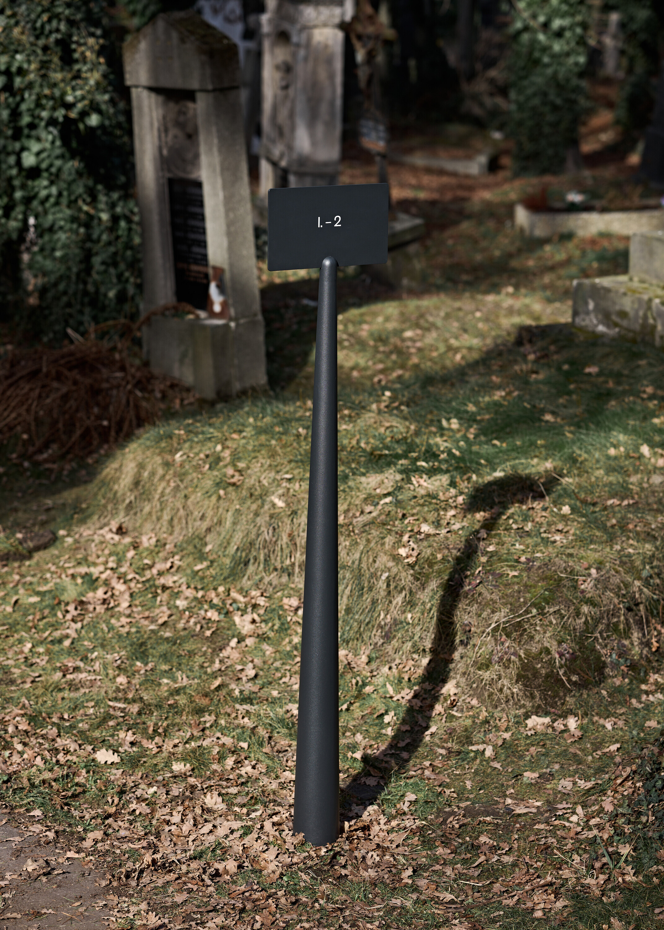 Dizajn využíva ako materiál klasickú liatinu. „Naším záměrem bylo vytvořit prvky, které respektují historii místa a zároveň přinášejí čistý estetický dojem,“ uvádzajú dizajnéri. „Na hřbitovech jsme strávili mnoho času a všimli jsme si, že původní označníky z dob habsburské monarchie stále dobře fungují a zapadají do prostředí,“ vysvetľujú. Práve z týchto historických foriem nový dizajn vychádza – rešpektuje tradíciu, zároveň však nie je historizujúci a dbá na praktické aspekty riešenia. Kužeľovité stĺpy a minimalistické dosky sú variabilné a možno ich prispôsobiť potrebám konkrétnej lokality.