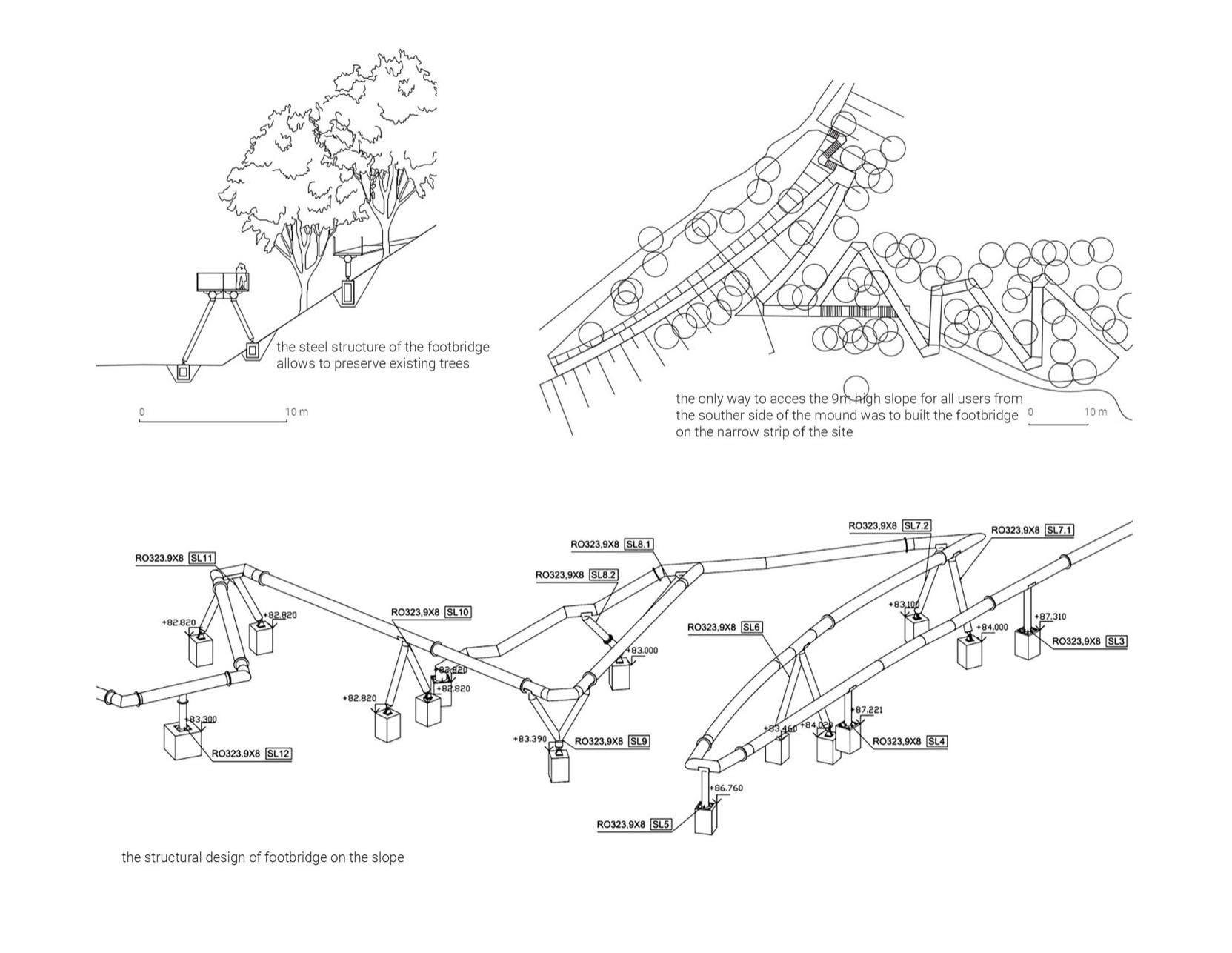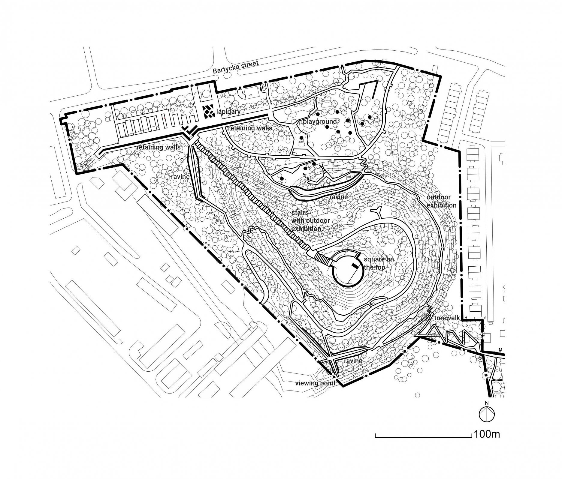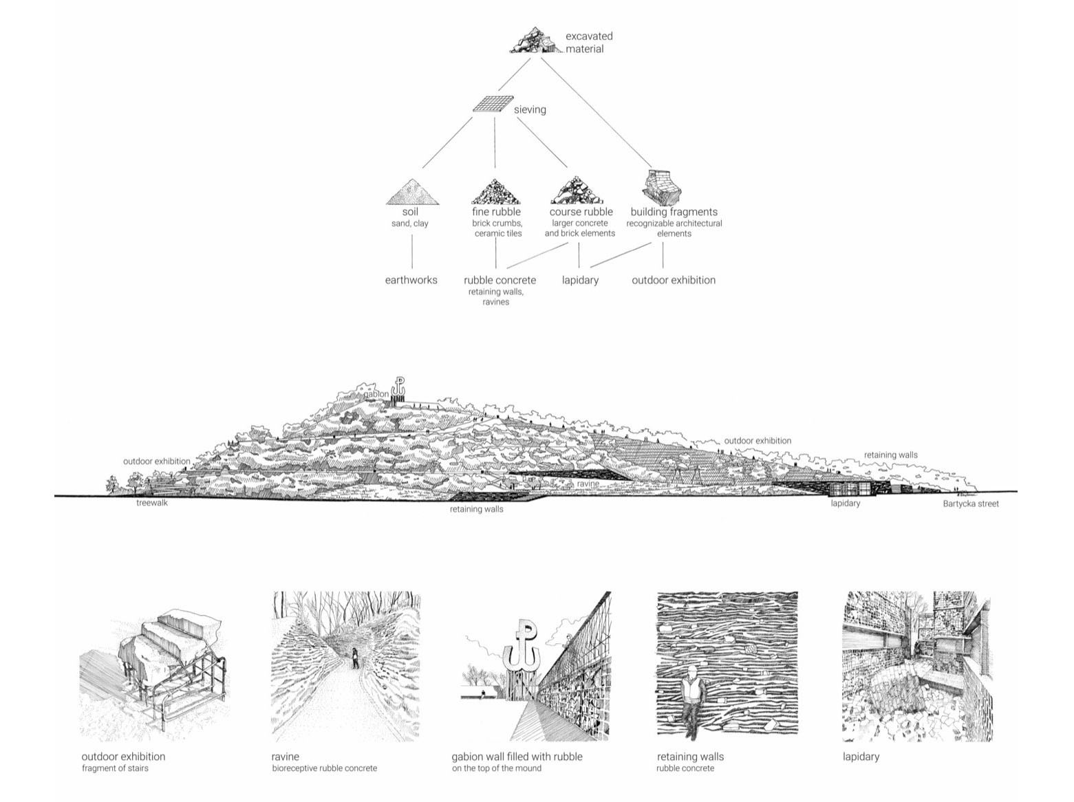 Toto miesto bolo dlhý čas skládkou. Po páde komunizmu v 90. rokoch vznikol na vrchole pamätník pripomínajúci Varšavské povstanie. Keď sme sem prišli, videli sme na mieste so všadeprítomnými troskami a hustou vegetáciou potenciál. Uvedomili sme si, že nejde len o symbol Varšavského povstania, ale aj o obnovy mesta po takmer úplnom zničení, čo sme chceli v celom projekte tiež odzrkadliť.
