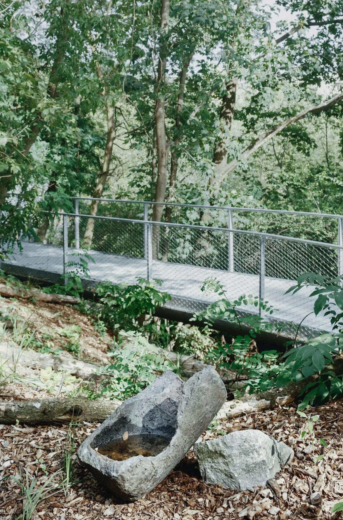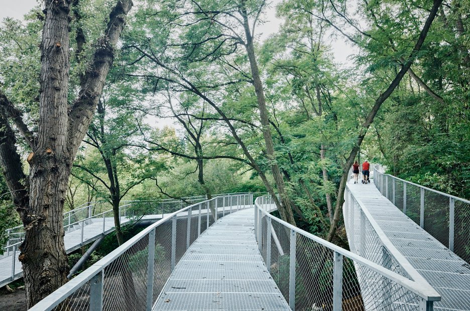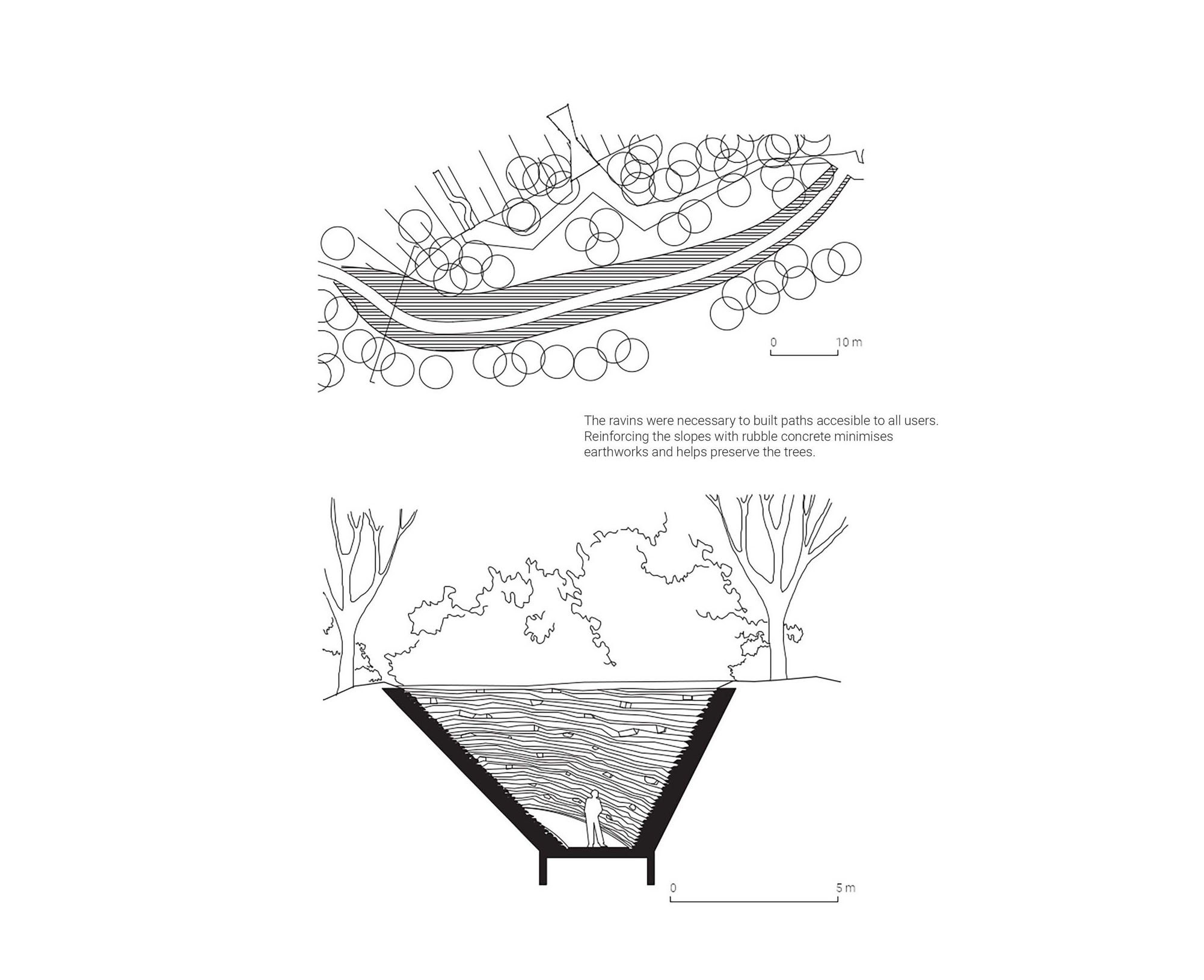 Stavebná suť a vrstva pôdy tvorili nestabilné a nepredvídateľné prostredie. Kvôli ochrane lokality sme nemohli odstrániť pôdne vrstvy. Museli sme teda použiť špeciálne metódy na budovanie základov pre chodníky a schody. Prostredníctvom siete svahovaných, zapustených a vysutých trás sme zabezpečili bezbariérový prístup až na vrchol. Zároveň sme v projekte pracovali s vegetáciou, ktorá na mieste spontánne rástla posledných 40 rokov.