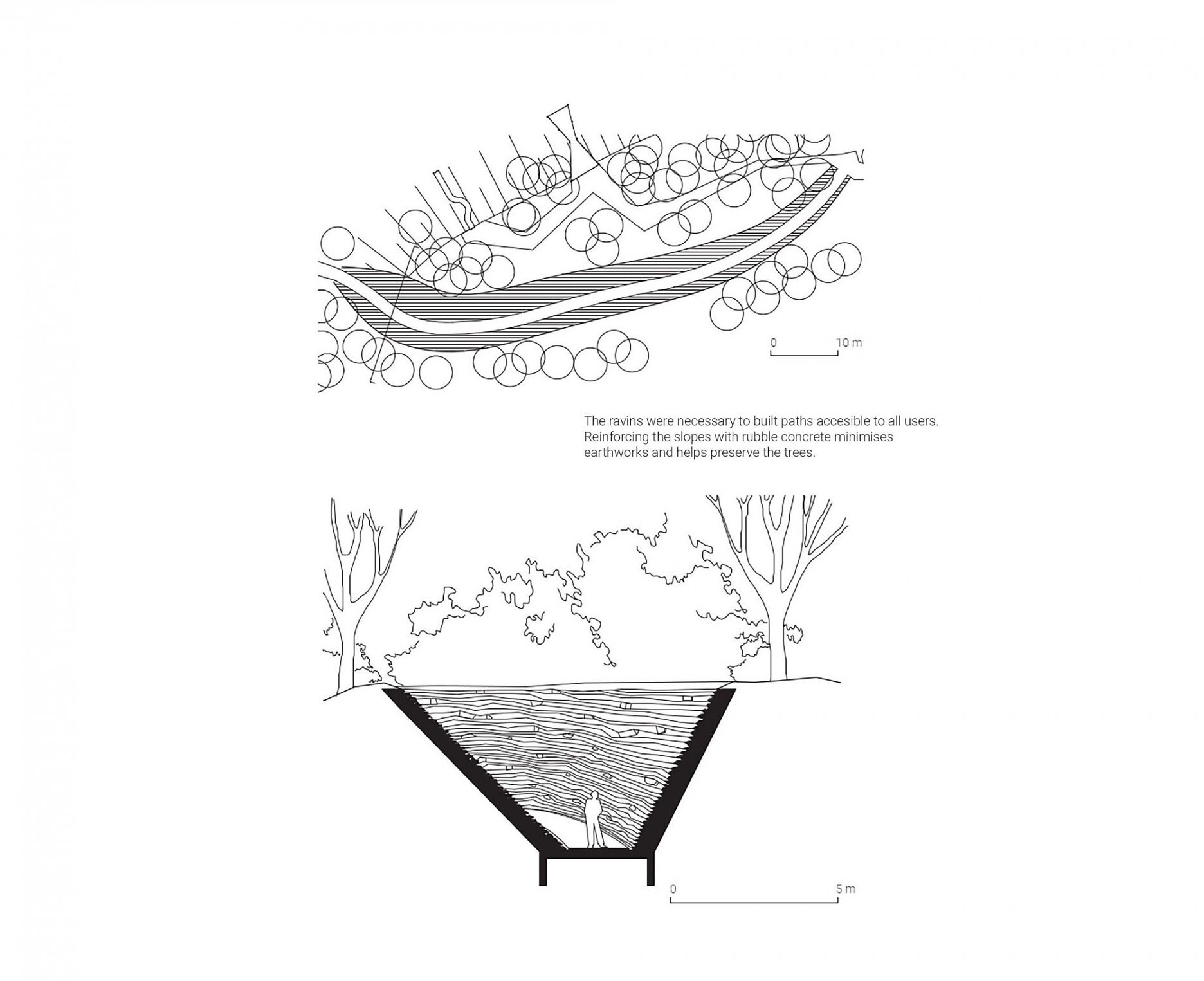 Trasovanie bezbariérových chodníkov si vyžiadalo ich čiastočné zapustenie pod úroveň terénu. Segmenty komunikácií tak lemujú oporné múry s vrstevnatou štruktúrou. Ako vznikali?
