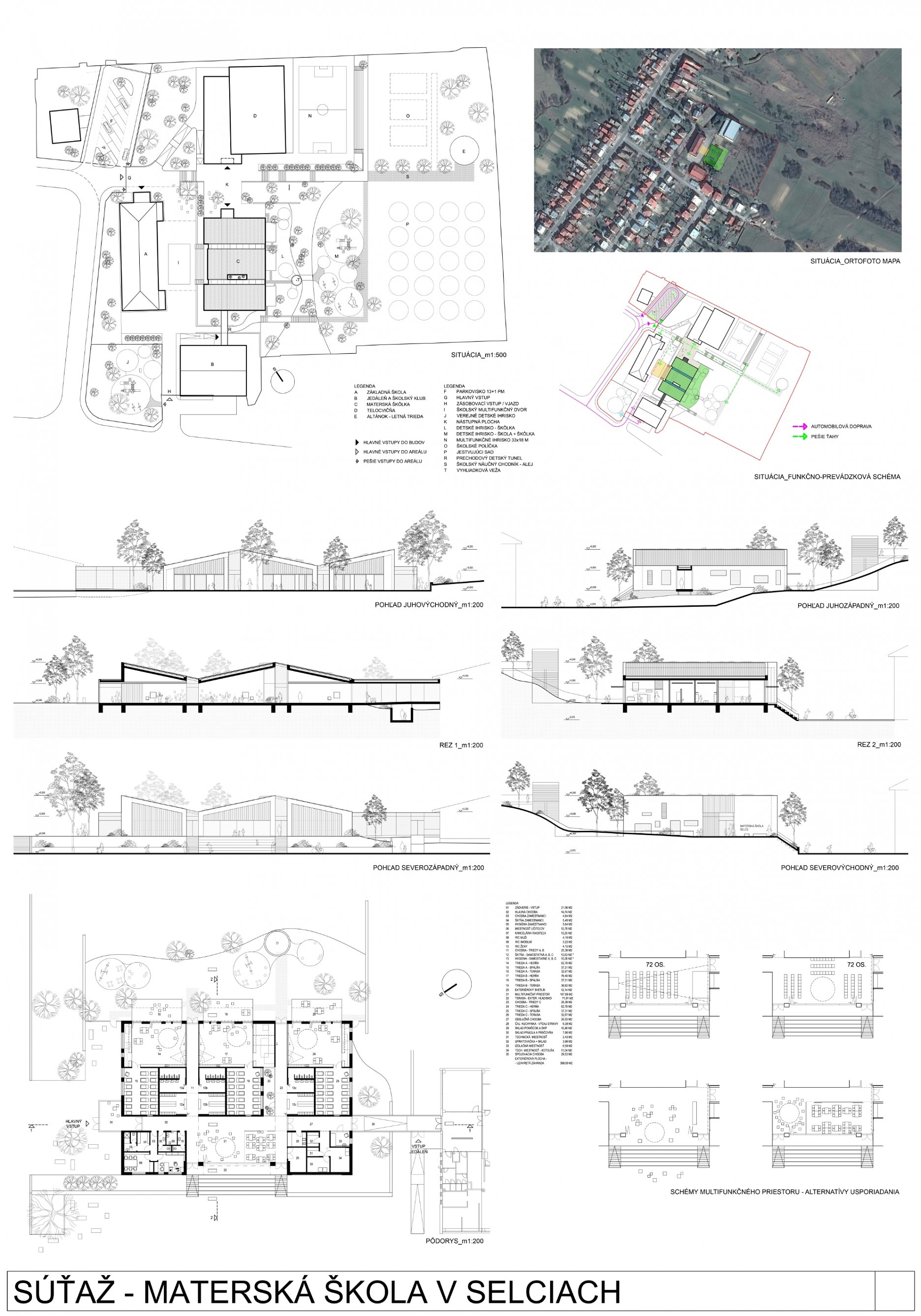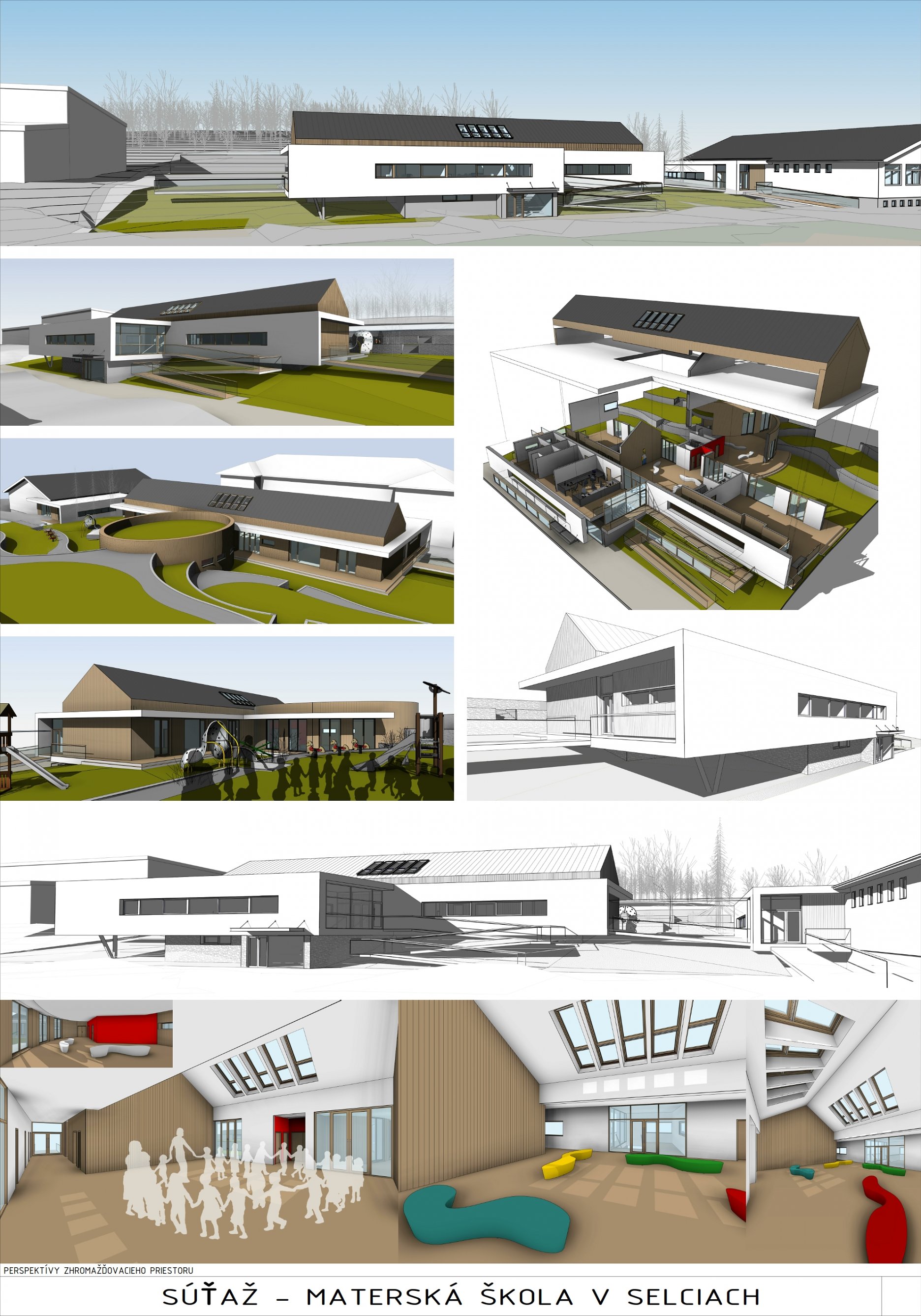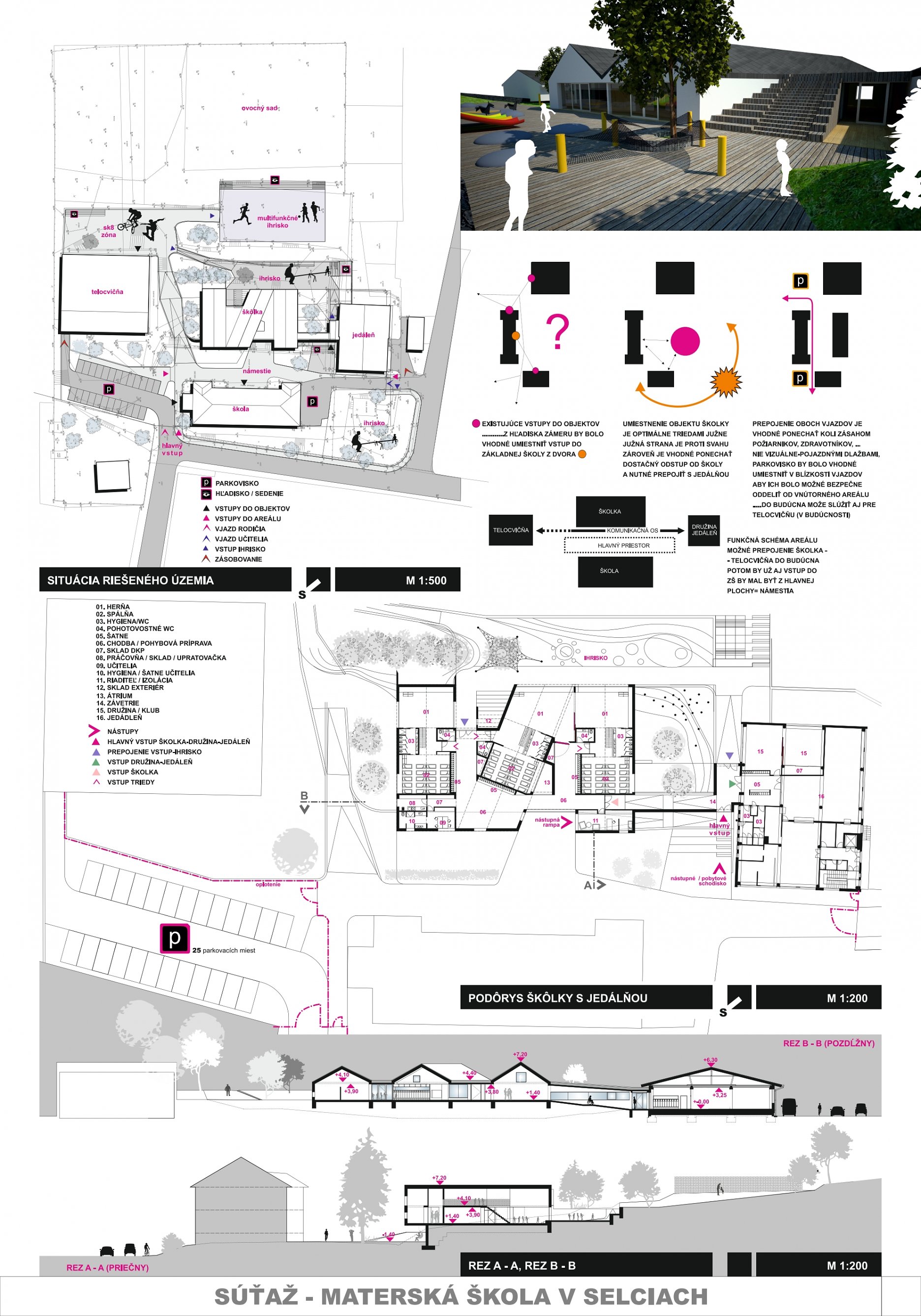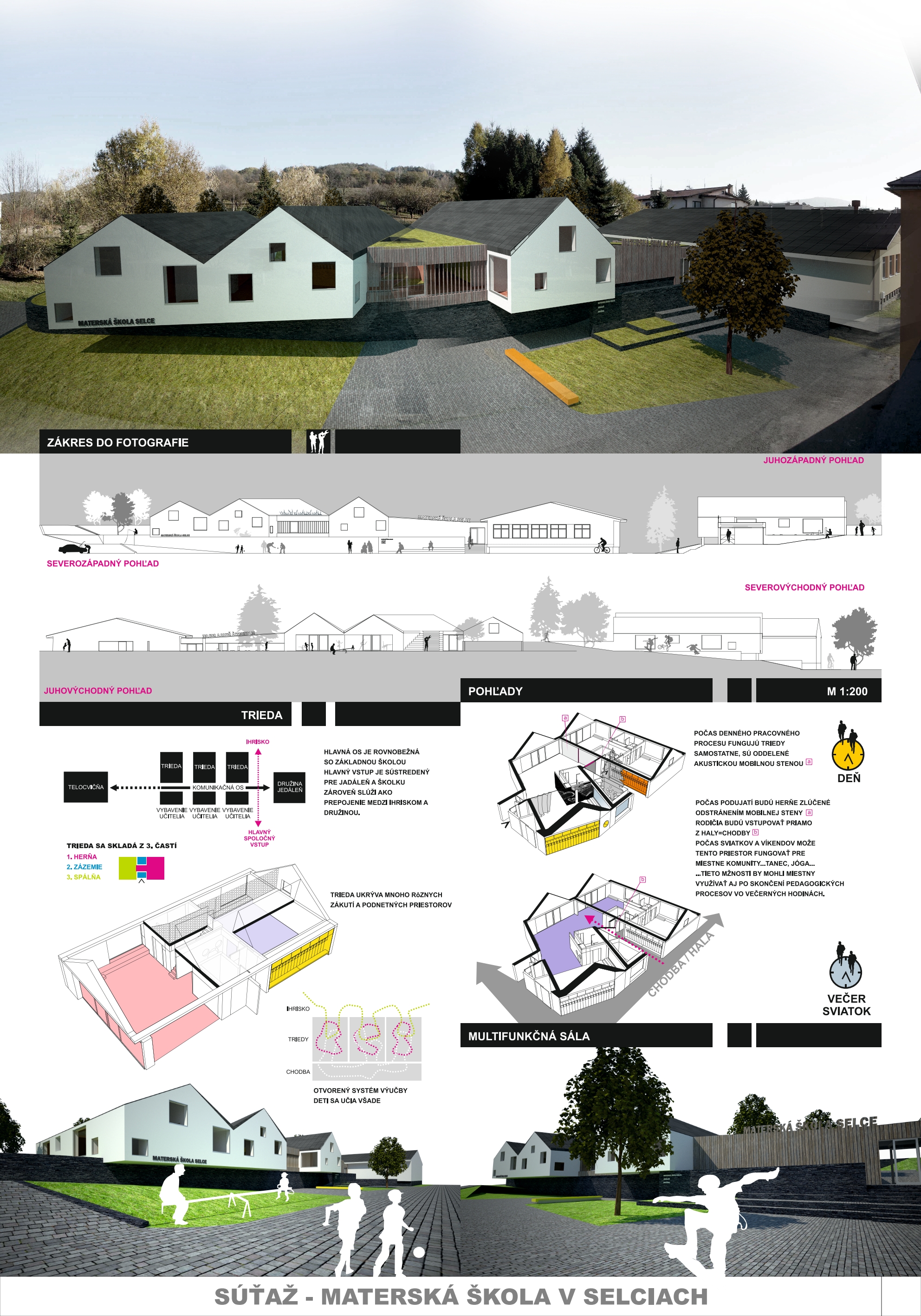 "Vzhľadom k členitosti terénu sme sa rozhodli objekt navrhnúť ako dvojpodlažný. Na vstupnom podlaží sa nachádza viacúčelová miestnosť, ktorá môže slúžiť ako priestor priestor pre stretávanie sa rodičov s deťmi, či spoločenské udalosti v kontexte obecného významu, pre hru detí v nepriaznivom počasí, ako alternatívna možnosť pre stravovanie žiakov školky.Priestor môže byť v čase rekonštrukcie objektu telocvične využívaný ako dočasný priestor pre telovýchovu, a v neposlednom rade môže tento priestor využívať aj jedna trieda školskej družiny. Vzhľadom k objemu stavby sme sa rozhodli jednu triedu školskej družiny ponechať v objekte školskej jedálne."