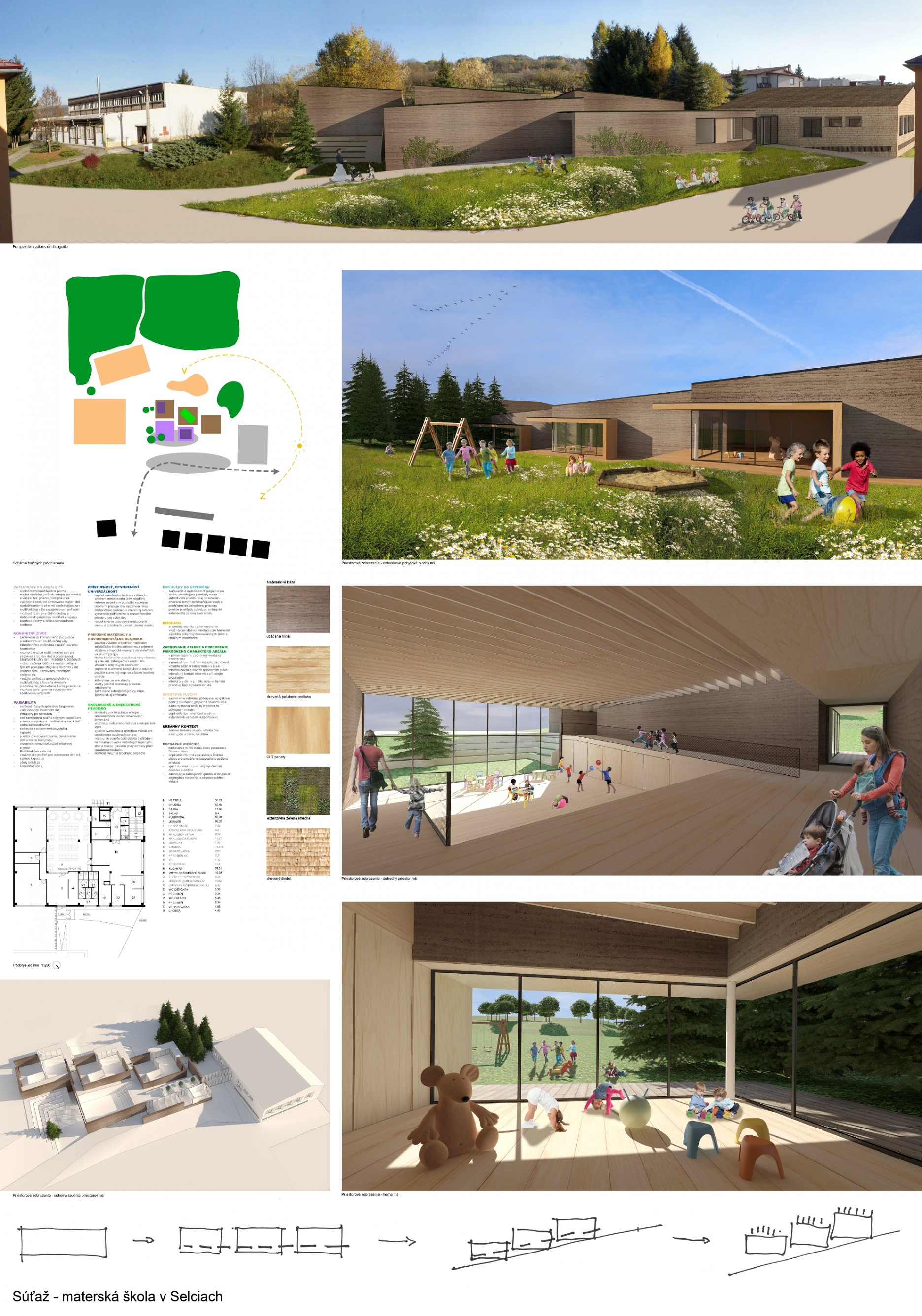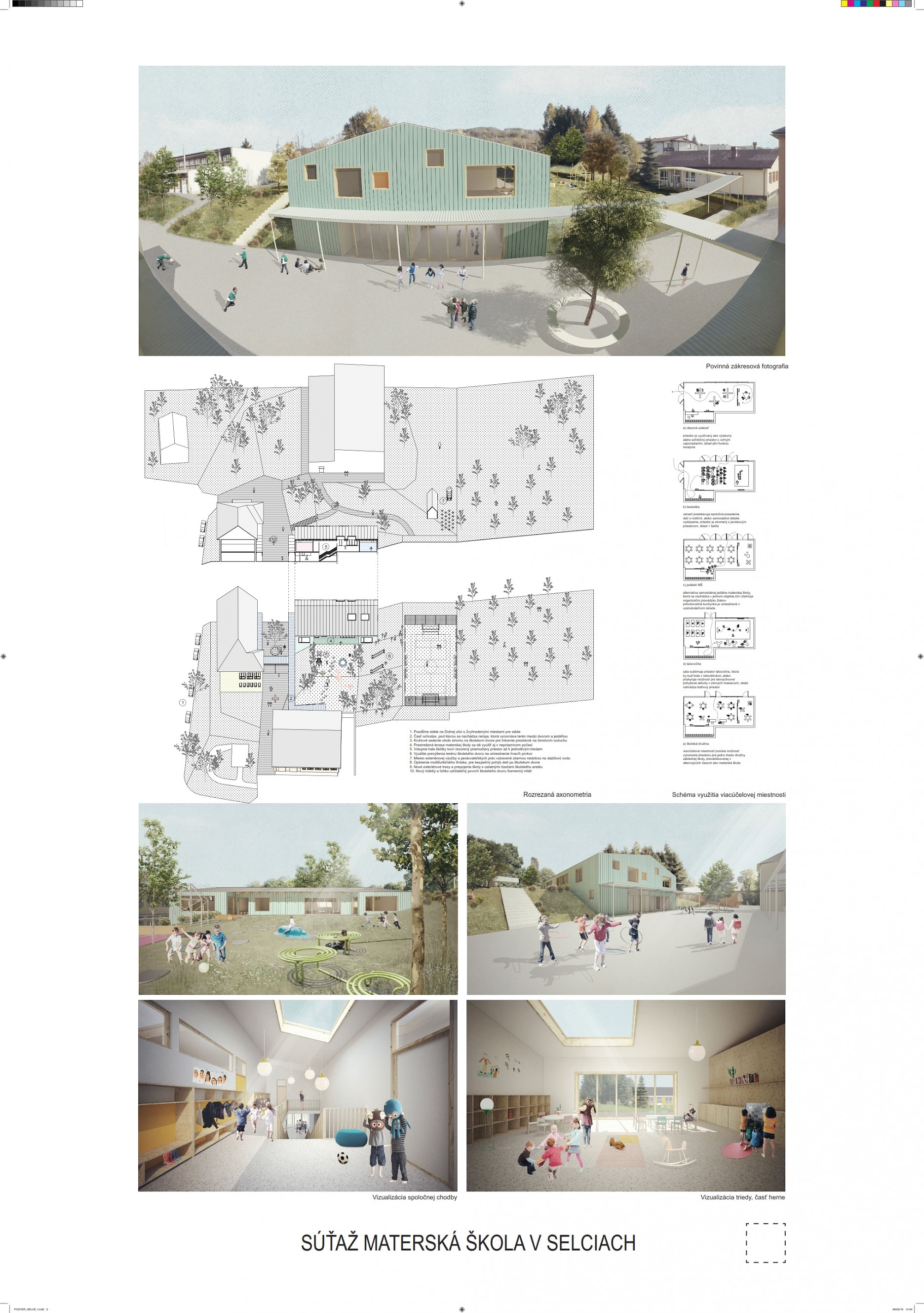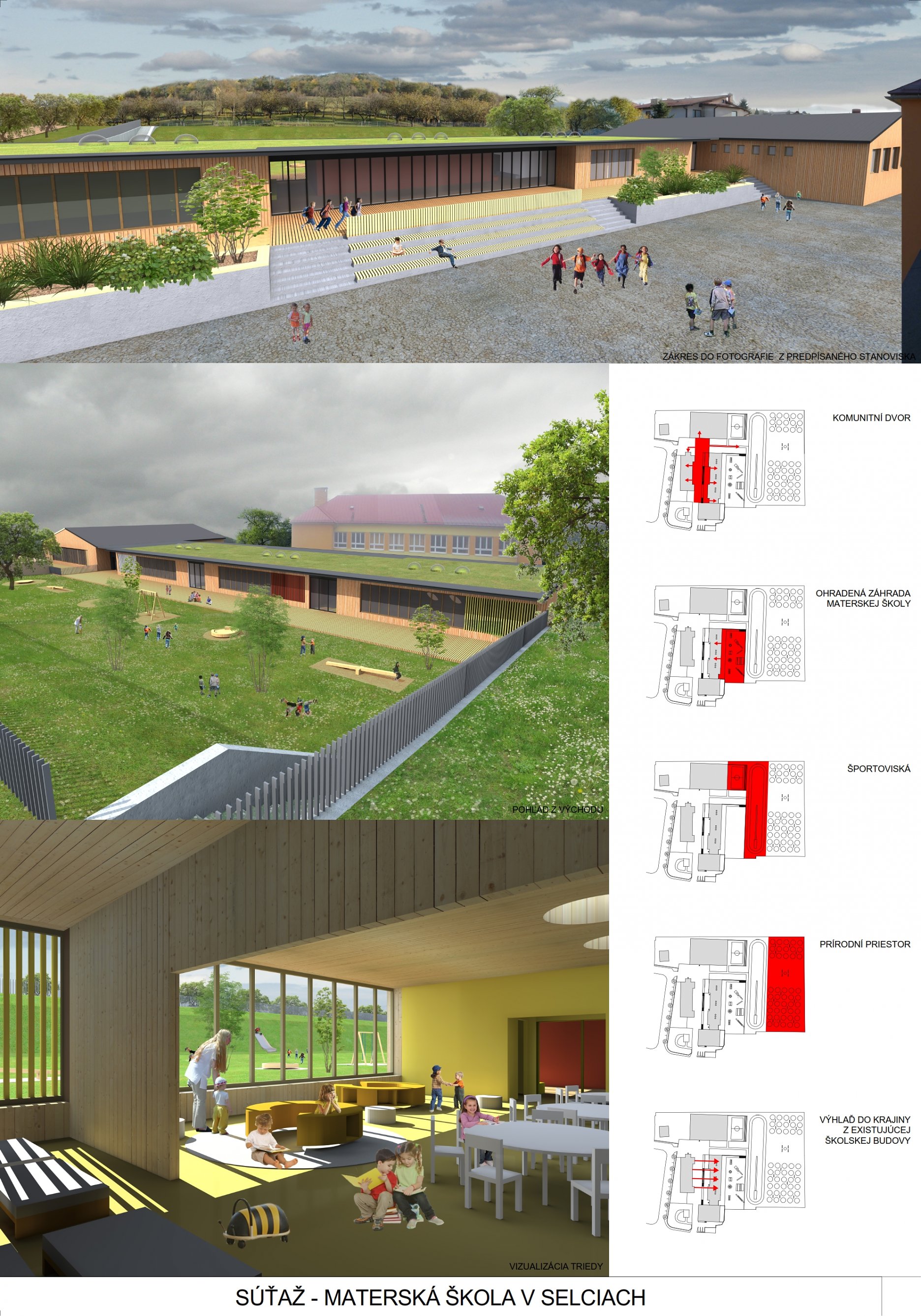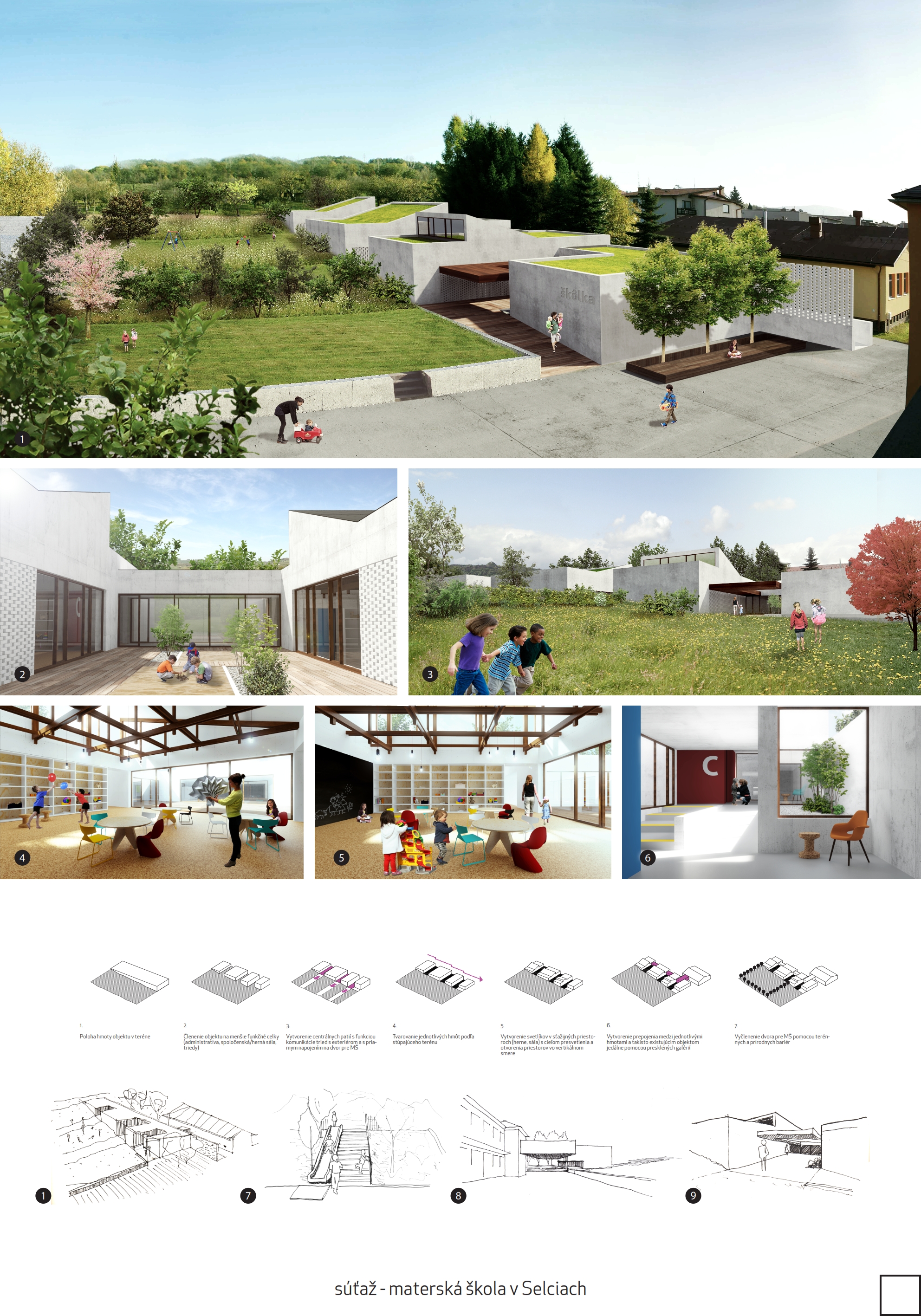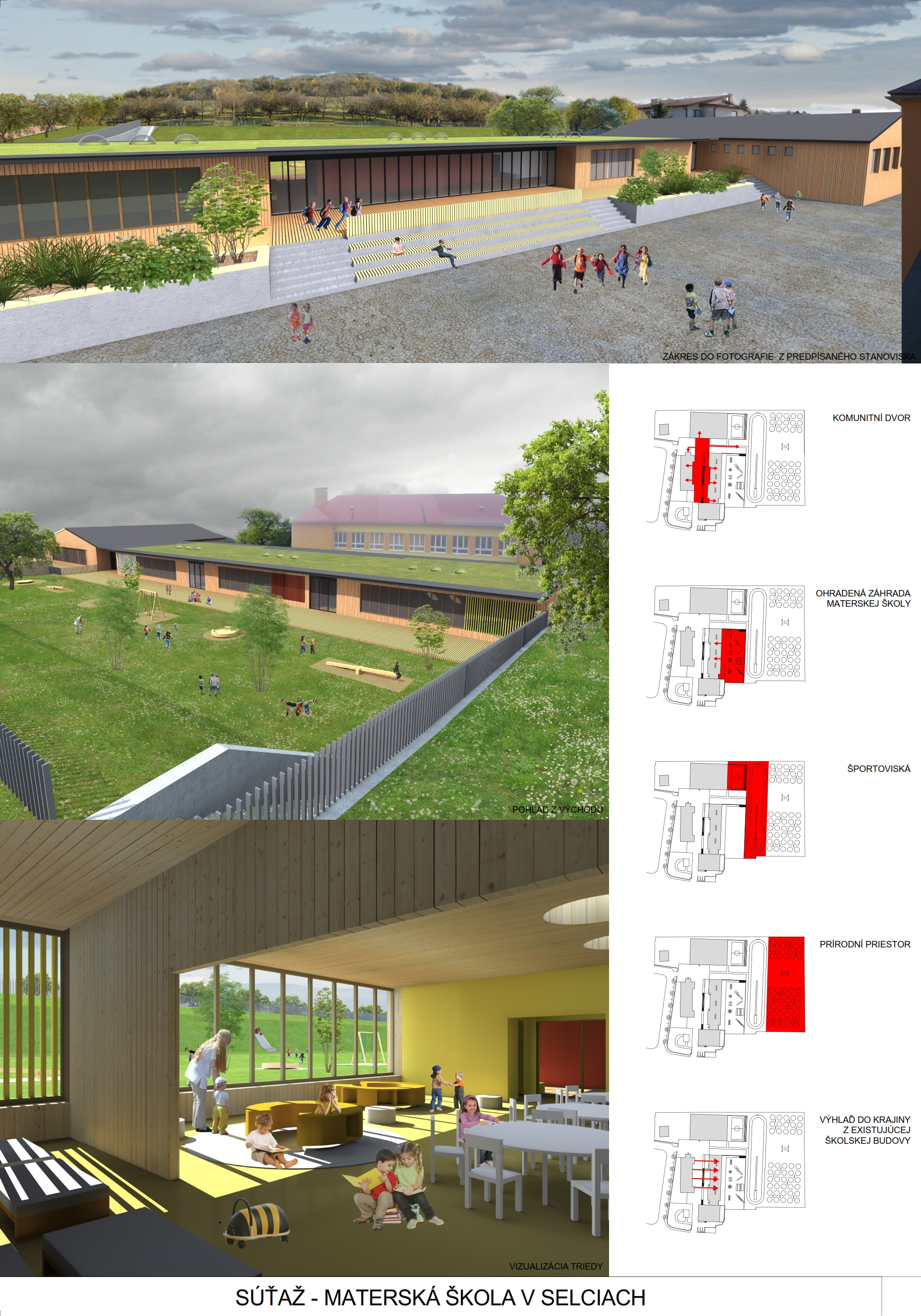 "Pretiahnutý prízemný tvar materskej školy umiestnený na vrstevnici reaguje na prudký svah pozemku a zároveň otvára budovu jak do spoločného komunitného dvora, tak do oplotenej záhrady materskej školy. Vďaka zapusteniu budovy do terénu a zelenej streche budova splýva so svahom školského pozemku a neruší výhľady do krajiny z existujúcej školskej budovy."