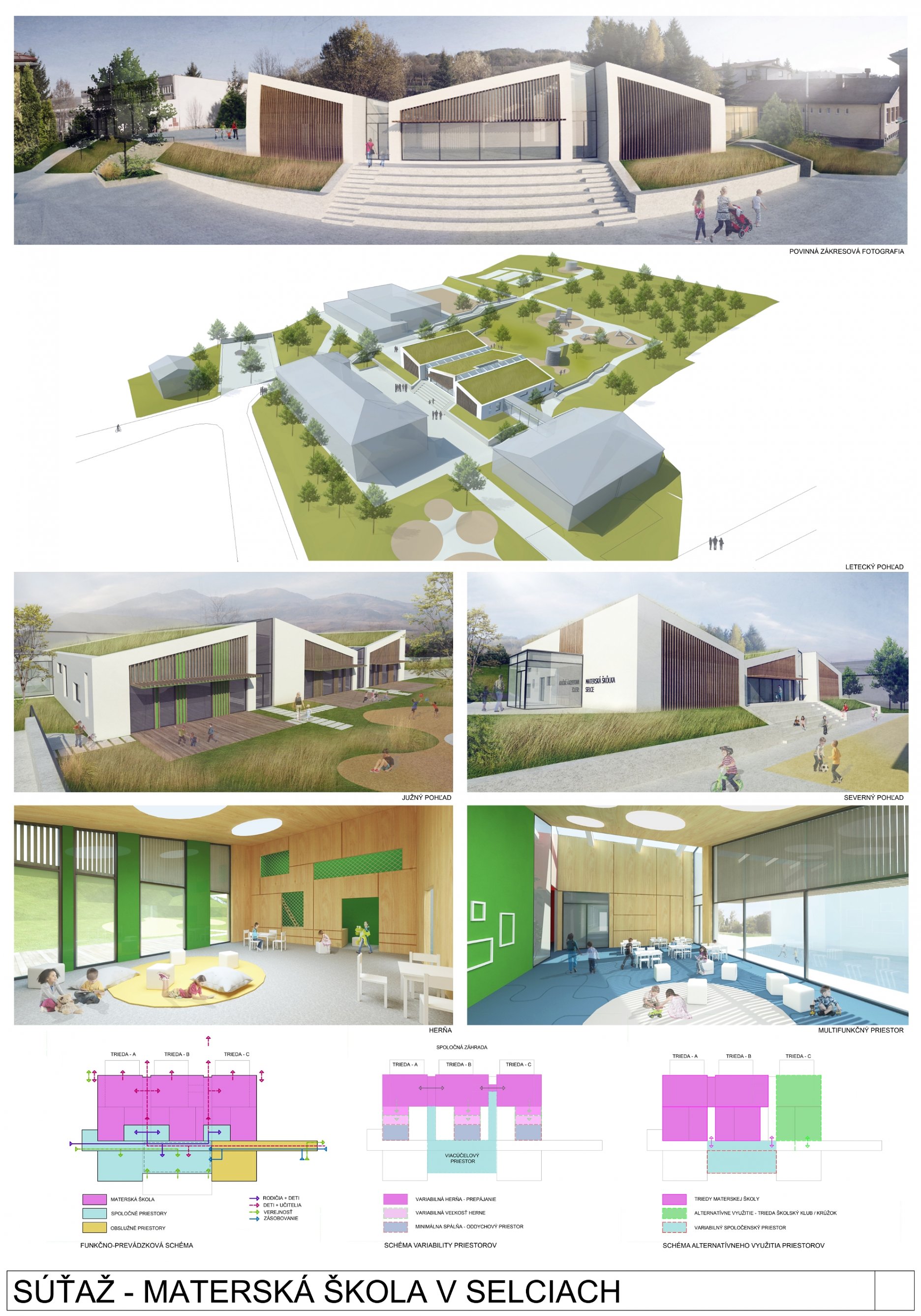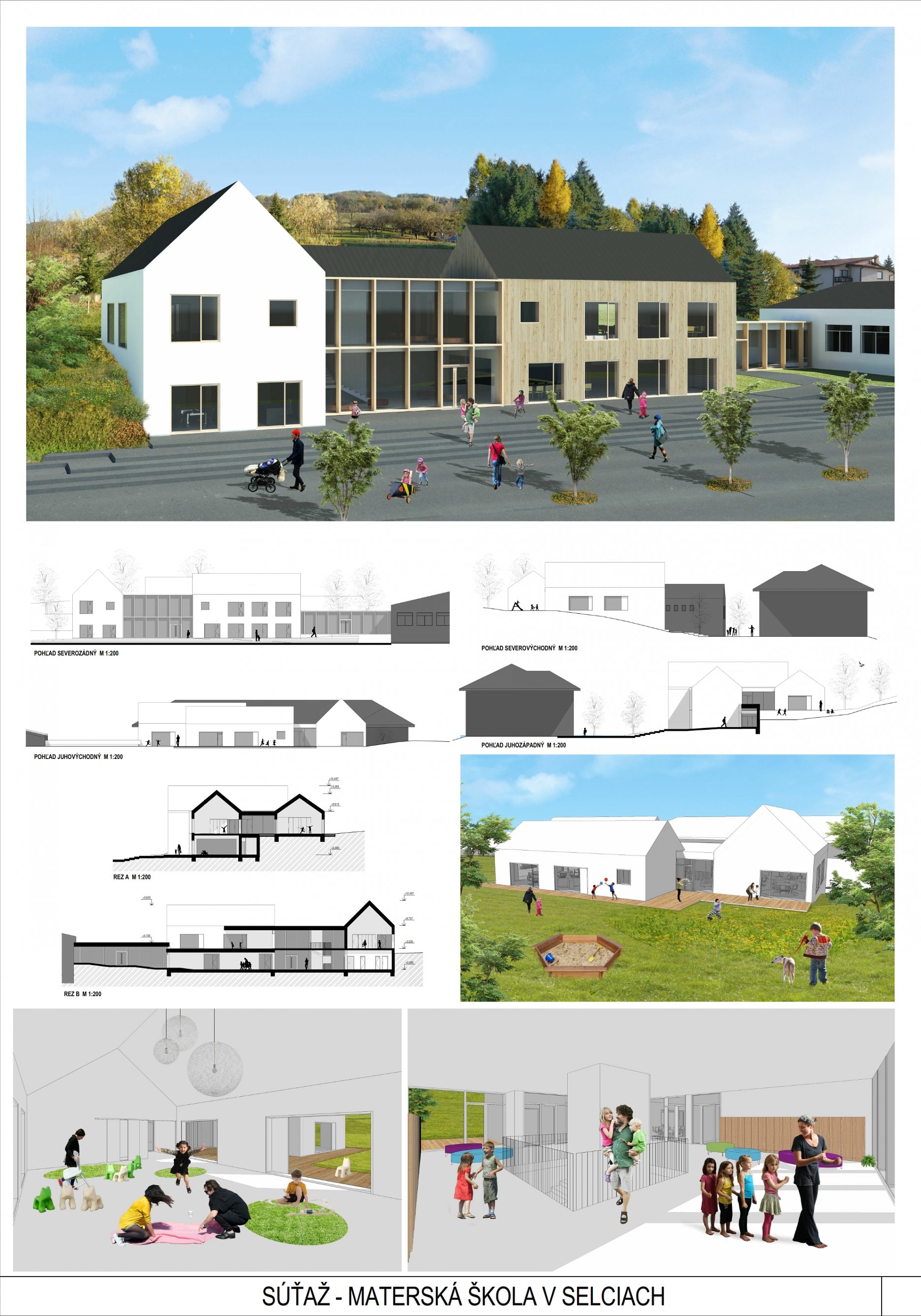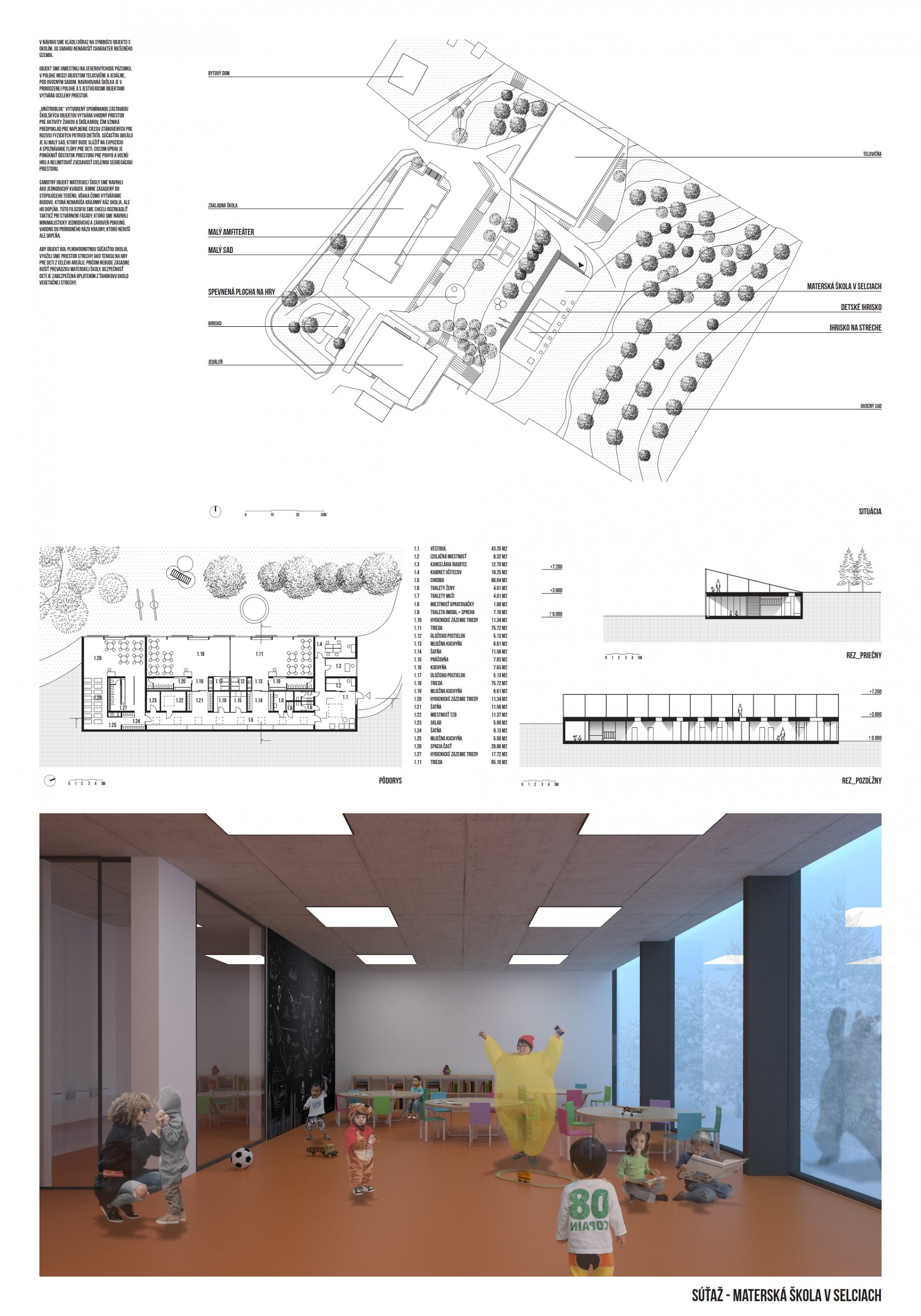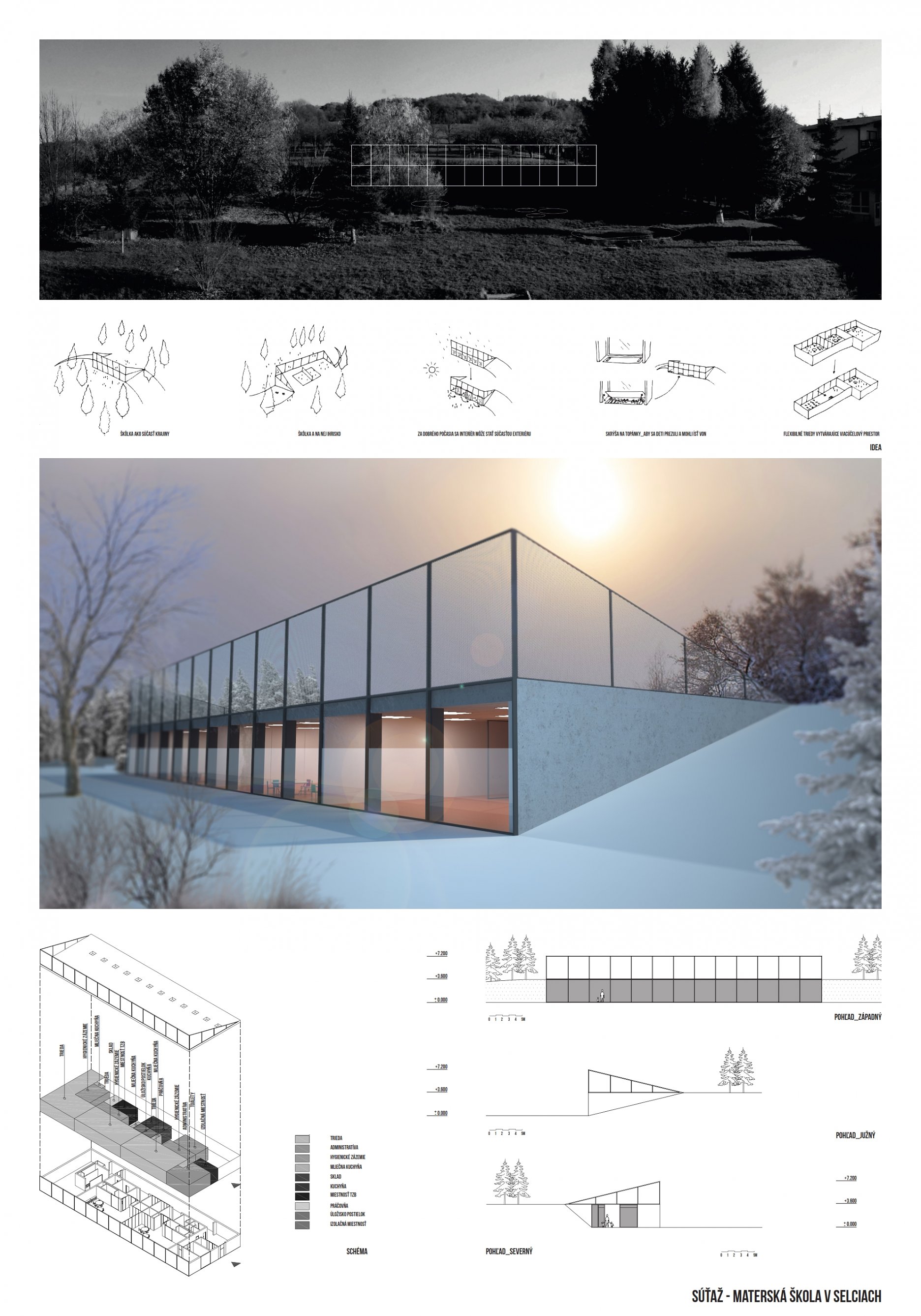 "Pretiahnutý prízemný tvar materskej školy umiestnený na vrstevnici reaguje na prudký svah pozemku a zároveň otvára budovu jak do spoločného komunitného dvora, tak do oplotenej záhrady materskej školy. Vďaka zapusteniu budovy do terénu a zelenej streche budova splýva so svahom školského pozemku a neruší výhľady do krajiny z existujúcej školskej budovy."