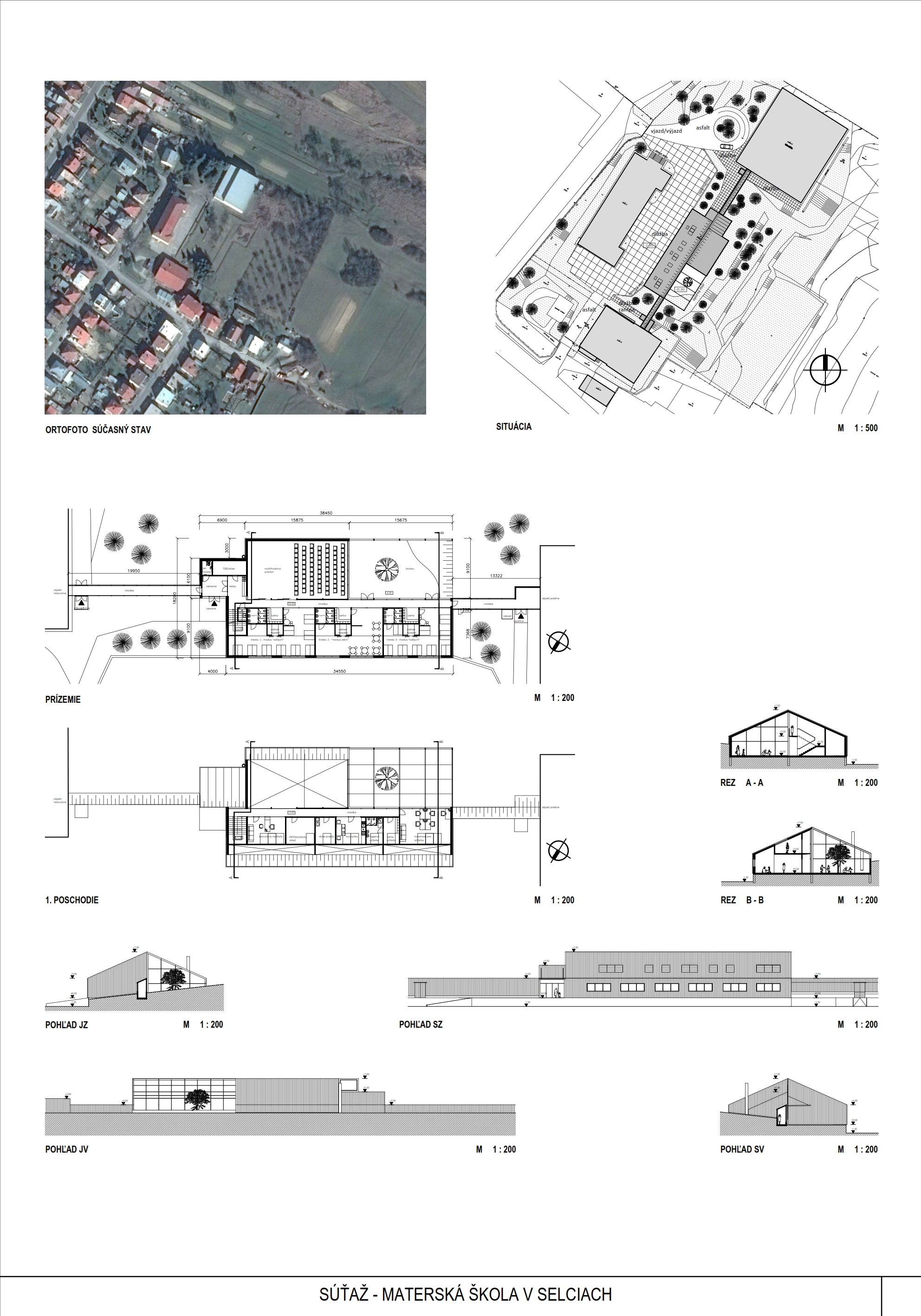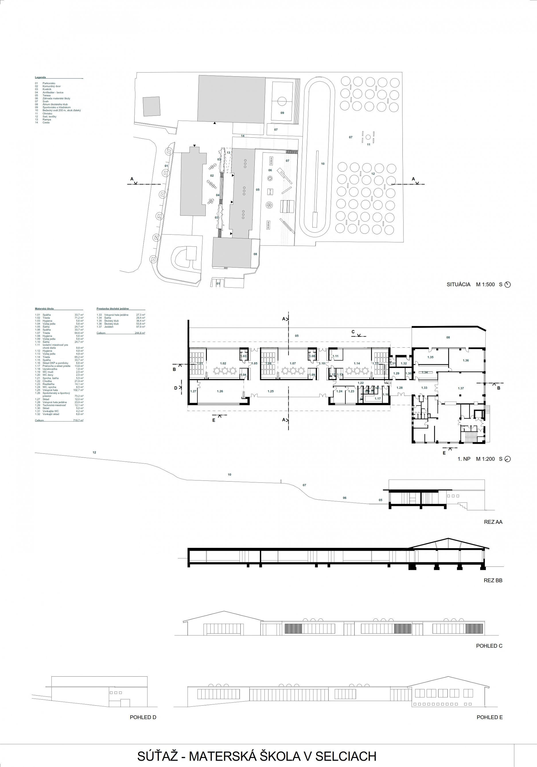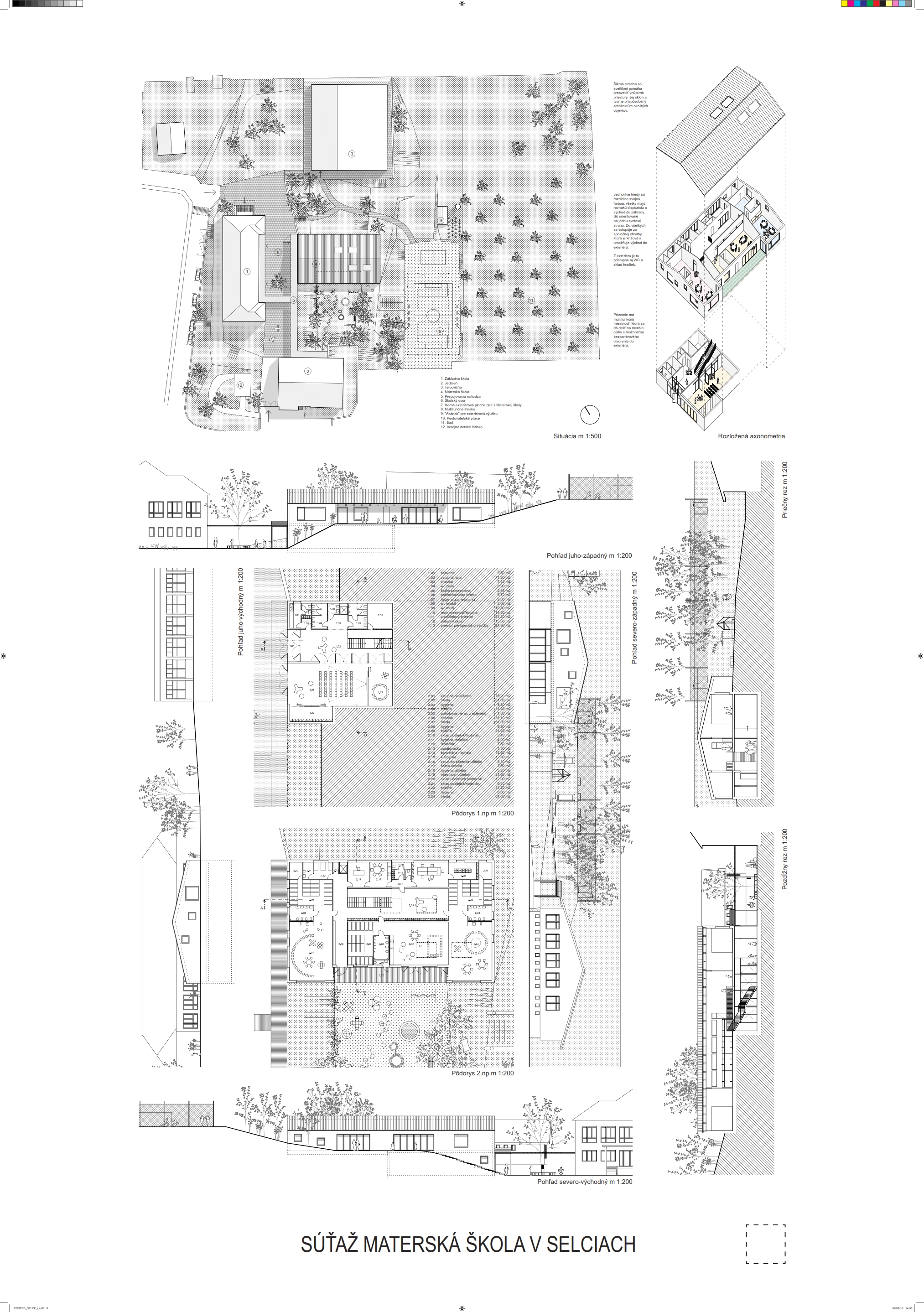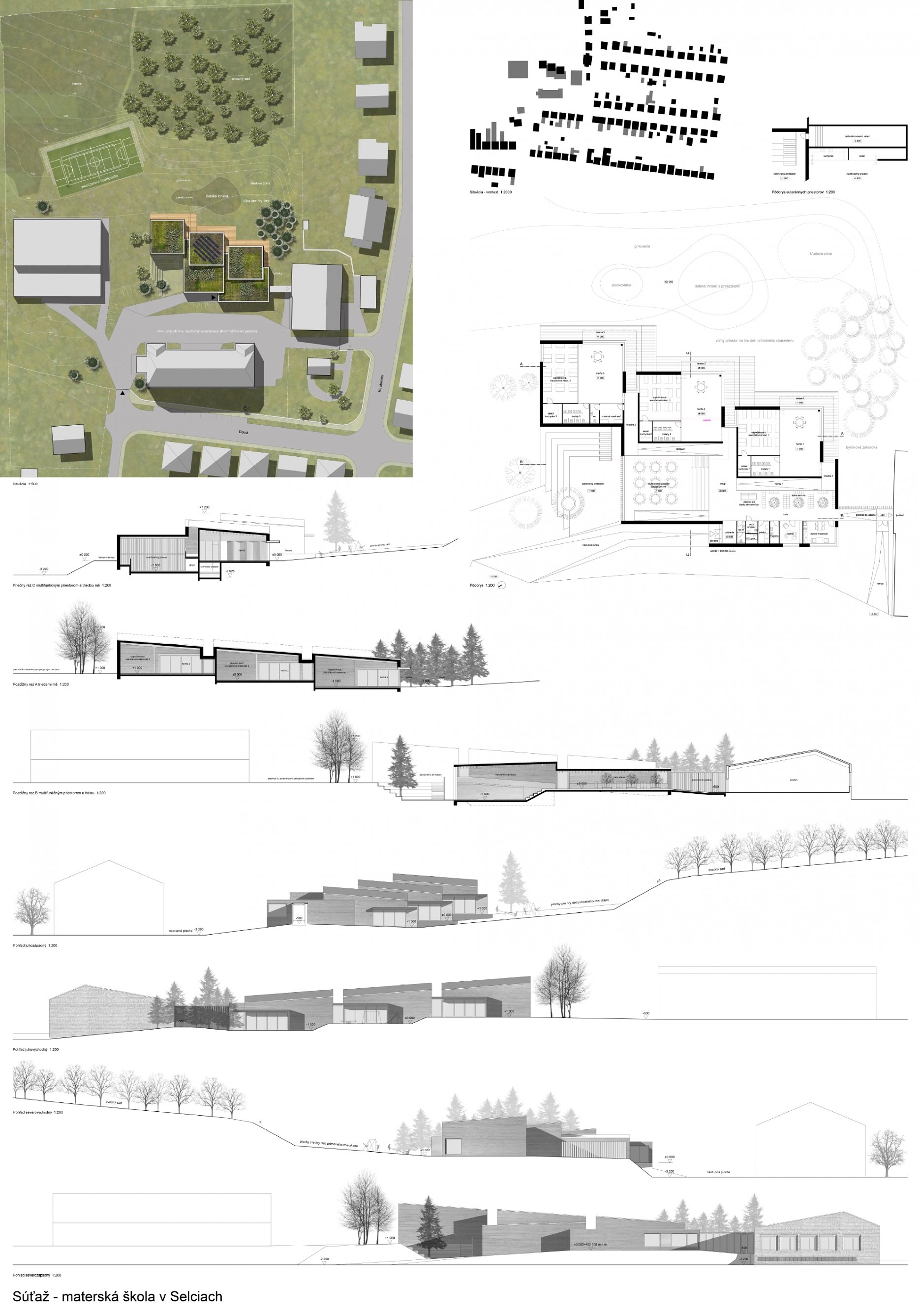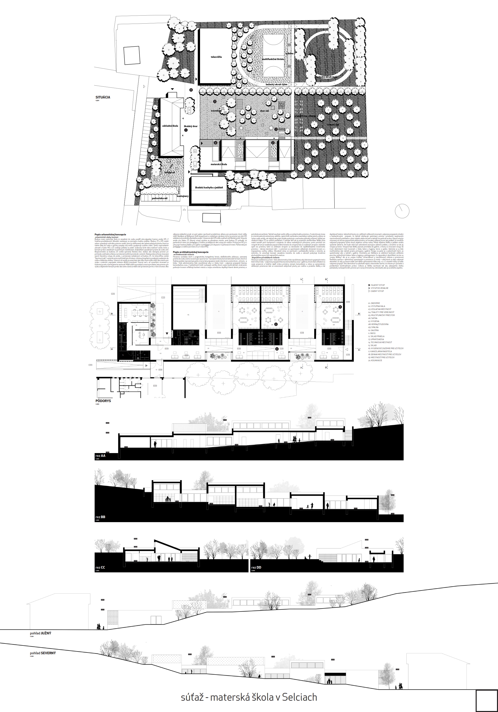 "Pretiahnutý prízemný tvar materskej školy umiestnený na vrstevnici reaguje na prudký svah pozemku a zároveň otvára budovu jak do spoločného komunitného dvora, tak do oplotenej záhrady materskej školy. Vďaka zapusteniu budovy do terénu a zelenej streche budova splýva so svahom školského pozemku a neruší výhľady do krajiny z existujúcej školskej budovy."