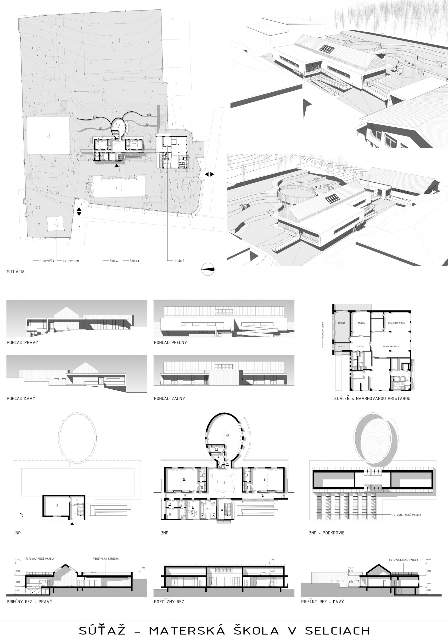 "Architektúra troch domov zo šikmou strechou je reakciou na budovu školy, jedálne a morfológiu prevažujúcich striech v obci. Návrh počíta s rekonštrukciou starej budovy telocvične na jej pôvodnom mieste a s novou fasádou pre jedáleň tak, aby bol vytvorený jednotný architektonický výraz celého areálu. Budova školy ostáva v pôvodnom stave."