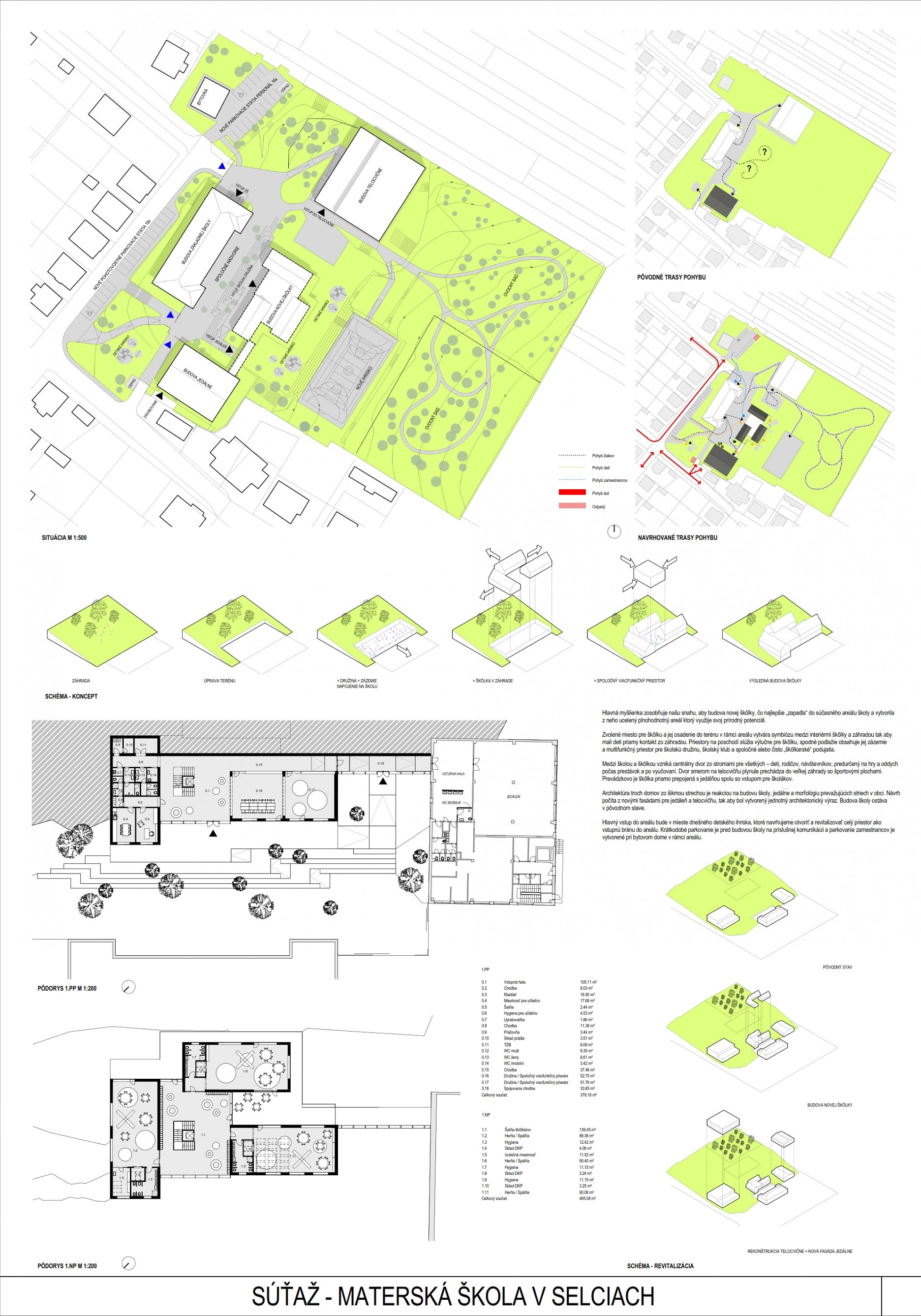"Koncepcia riešenia spočíva v rozvrhnutí dispozície v tvare trojuholníka, kde v jeho vrcholoch sa nachádzajú priestory samotných tried. V osi hmoty sa nachádza zhromažďovací priestor. Priestor chodby oddeľuje triedy od časti určenej pre zamestnancov materskej školy a zároveň tvorí koridor pre prepojenie s objektom jedálne na jednej strane (pravej) a telocvične na druhej strane (ľavej). Tvar hmoty je navrhnutý tak, aby zodpovedal tradičnej ľudovej architektúre v regióne, v kombinácií s modernými prvkami, so zachovaním kontextu s jestvujúcimi objektmi v areály školy. Vo vrchole trojuholníka je orientovaná hmota triedy v tvare elipsy – ktorá krivkami symbolizuje zrod nového života – vajce, vajíčko..."