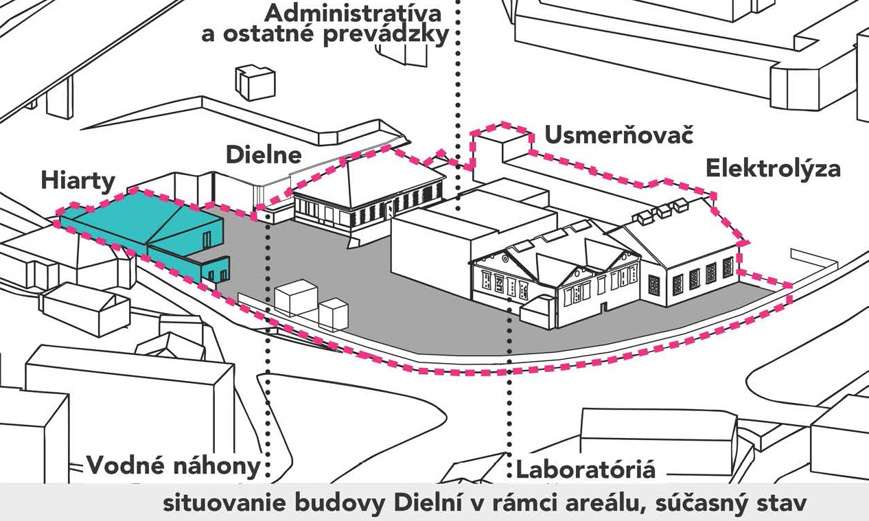 -6 architektonických vízií – štúdií možného využitia jednotlivých budov areálu na nové funkcie.