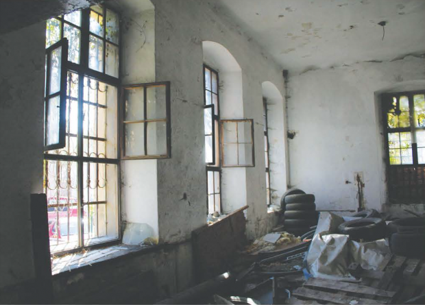 -prízemné časti obvodových murív a vnútorných stĺpov z lomového kameňa, tehlové pruské klenby s tiahlami z kovaného železa, tehlové opravy a doplnky staršieho kamenného muriva, zachované oblúky vstupných otvorov do haly, v interiéri zreteľné oblúkové okenné otvory neskôr zamurované.