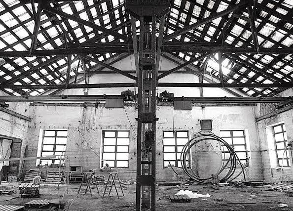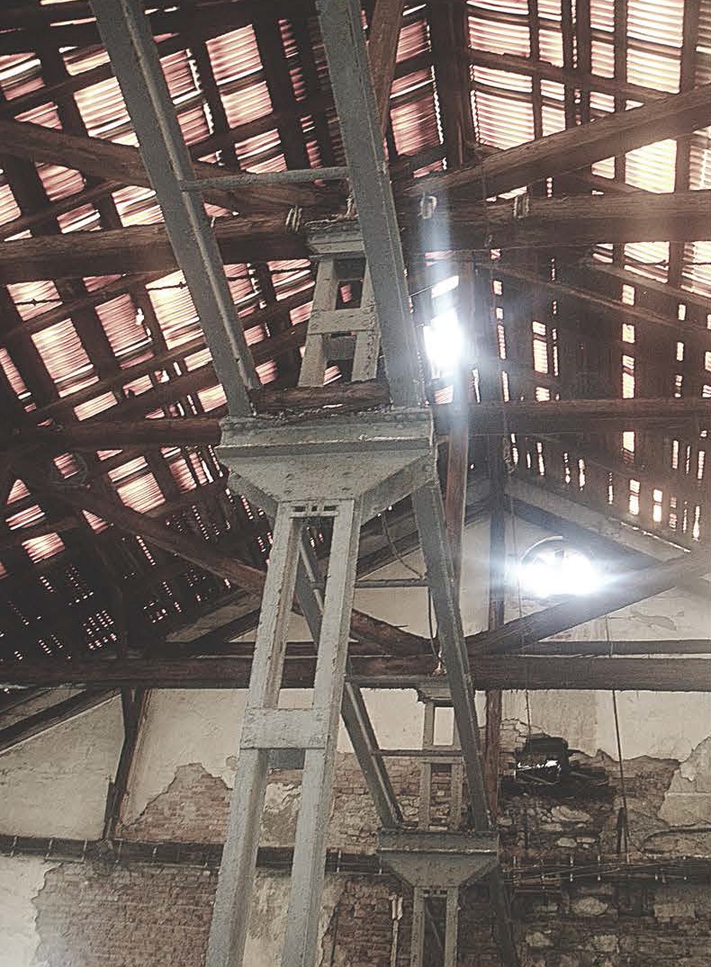 -oceľové stojky prútovej nitovanej konštrukcie podporujúce krov a žeriavovú dráhu