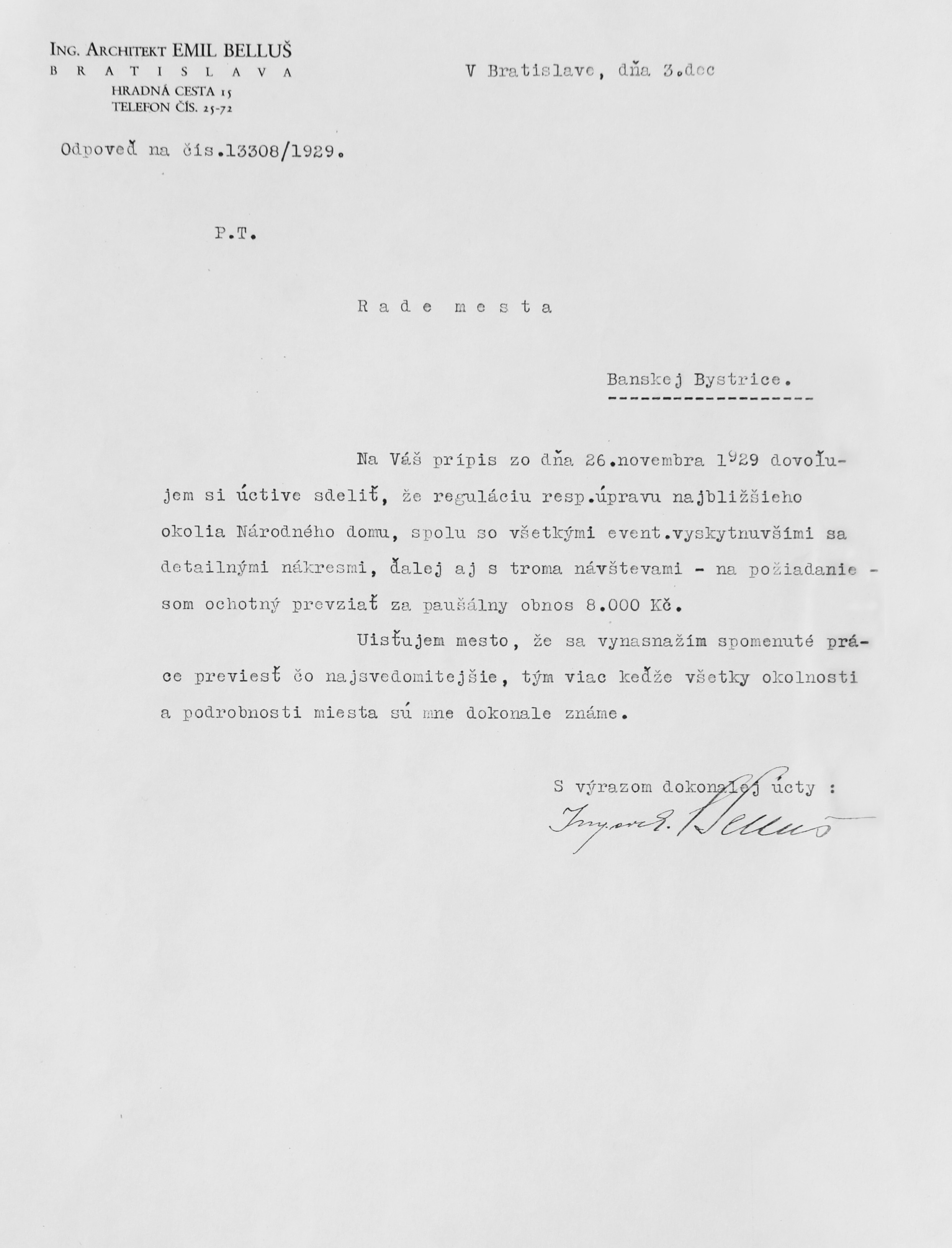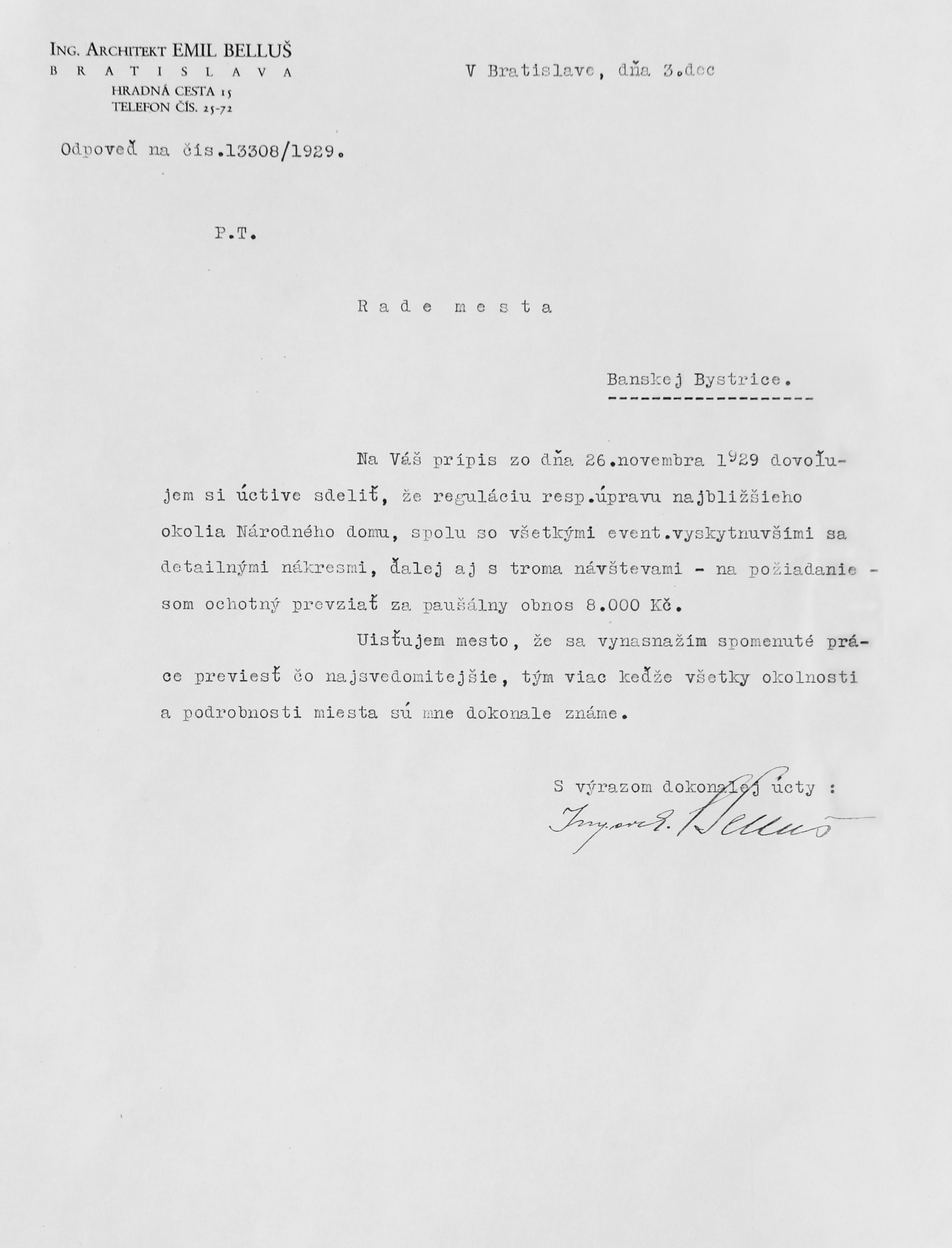 Príprava výstavby Národného domu s redutou išla svojou cestou. Keď sa konečne mestskí páni dohodli na stavebnom programe, teda obsahu tohto objektu, bolo vypísaných niekoľko architektonických súťaží. Zúčastňoval sa ich aj Emil Belluš a dosahoval popredné umiestnenia. Posledná vyzvaná súťaž bola vypísaná v roku 1926. Vyhral ju Emil Belluš ako mladý architekt iba 3 roky po skončení svojich štúdií...