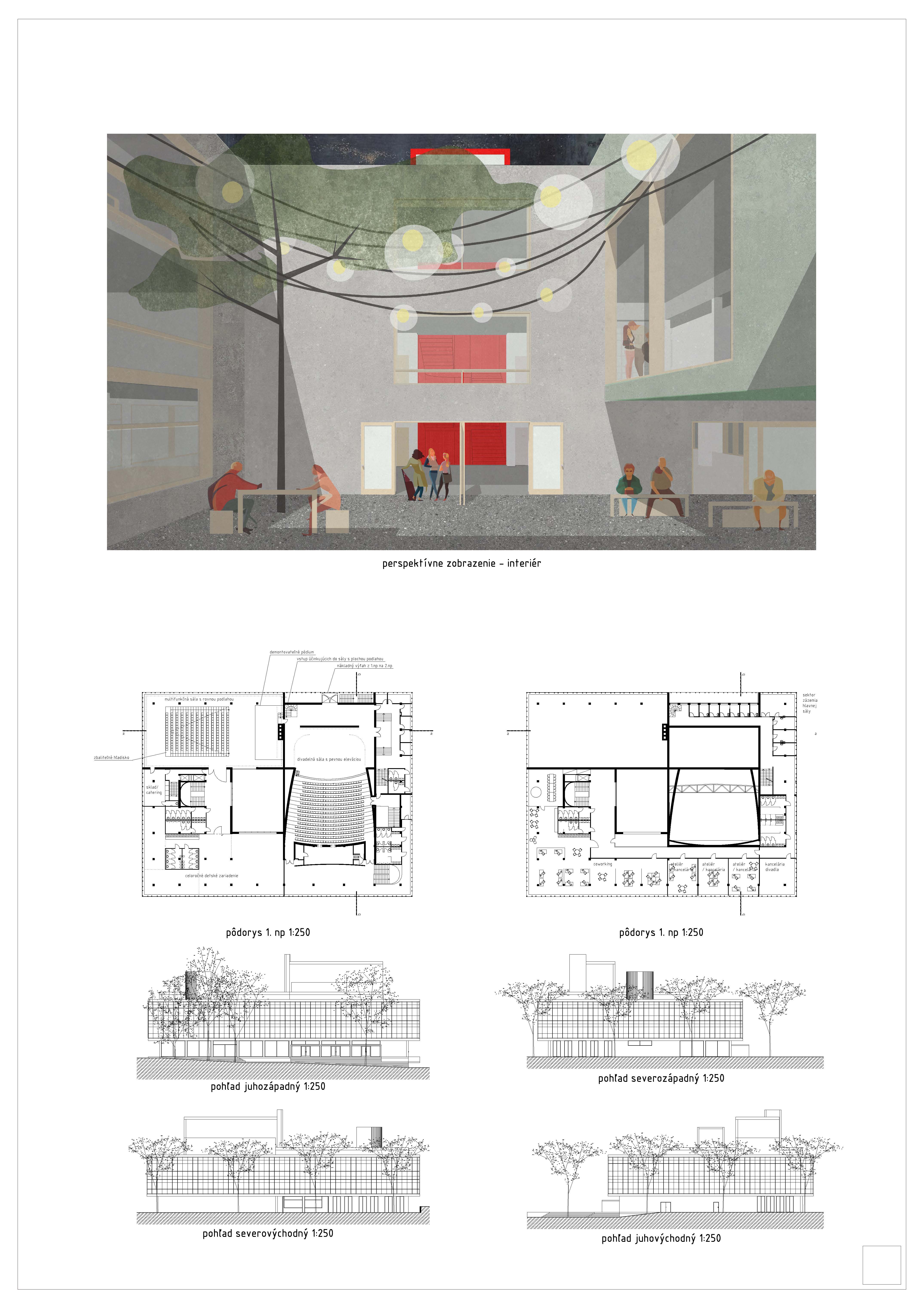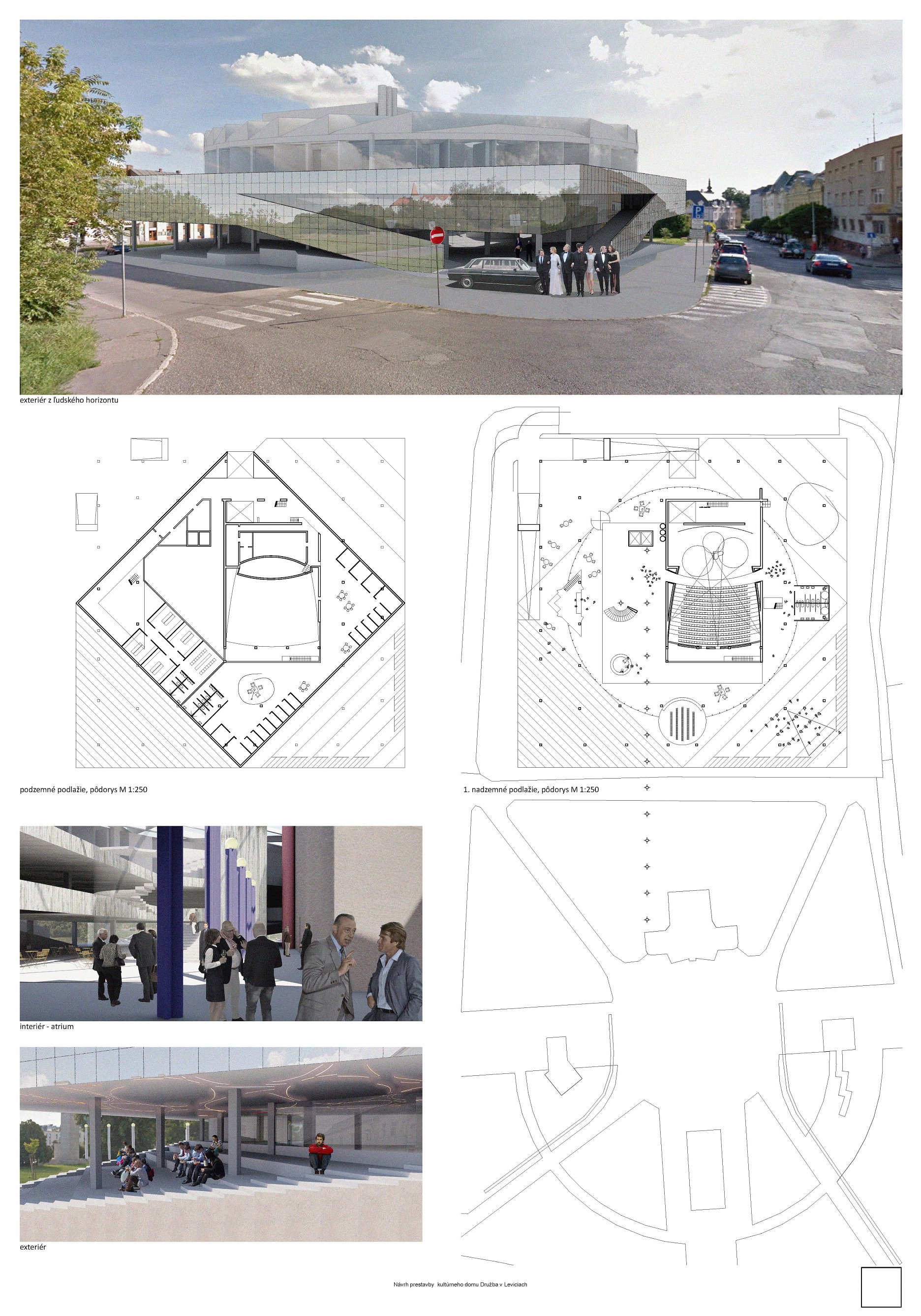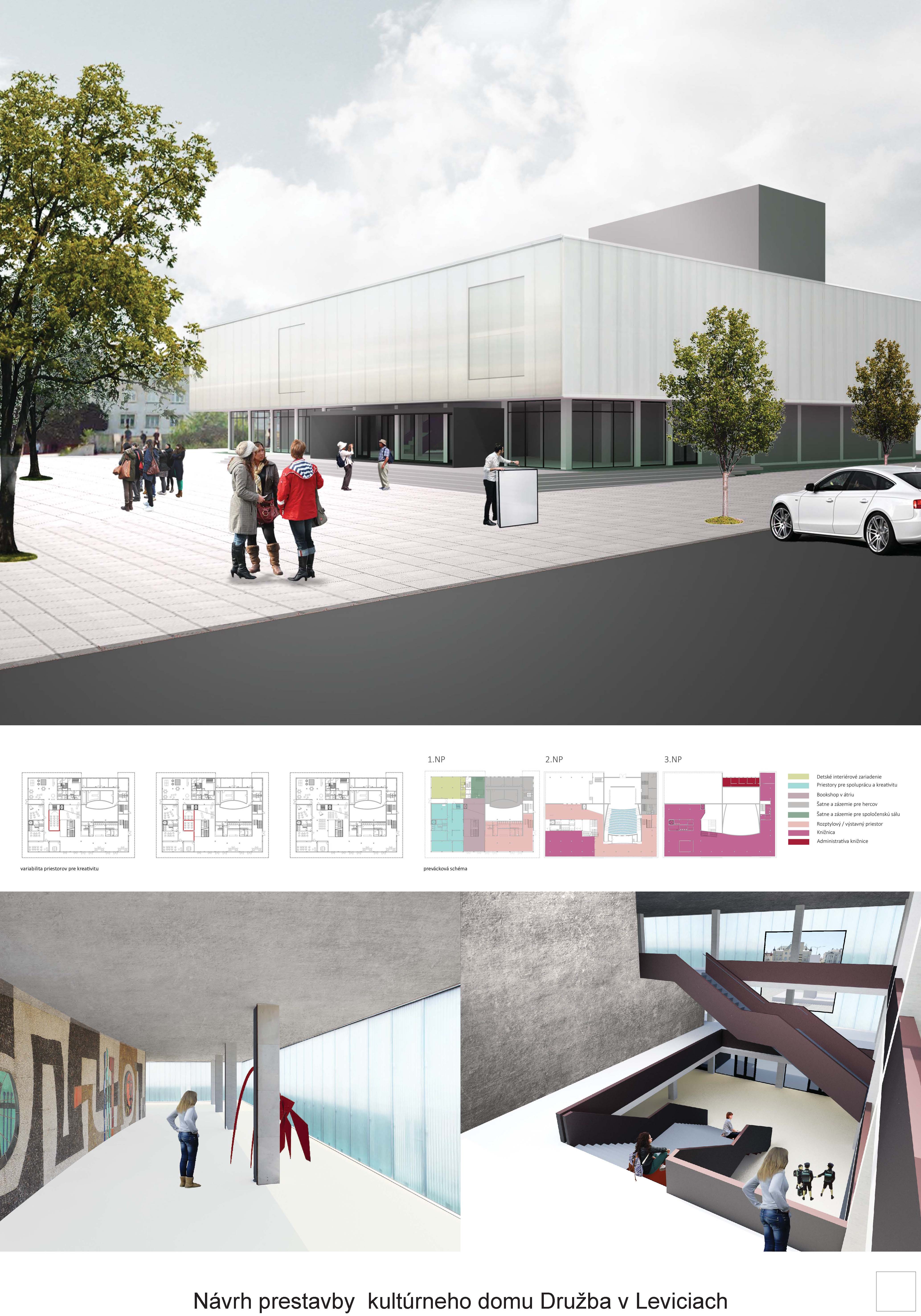 2. miesto patrí návrhu s pôsobivým priestorovým konceptom a jasným architektonickým názorom. Požiadavku na redukciu objemu budovy adresuje zväčšením átria, čím objekt získava navyše novú kvalitu. Komorné átrium sa tak mení na veľkorysejší vonkajší priestor (dvor), čo rozširuje možnosti jeho využitia a objekt získava intenzívnejšie presvetlenie svojho vnútra. Rafinovaným spôsobom tak dosahuje zásadnejšiu pozitívnu zmenu bez toho, aby sa to prejavilo na vonkajšom vzhľade objektu, ku ktorému autori pristupujú citlivo, s pochopením a bez potláčania jeho výrazu. Návrh ponúka zaujímavé spojenie priestorov pre deti, multifunkčnej sály a dvora, ktoré by mohli spolu výborne fungovať. Rovnako pozitívne je vnímané otvorenie domu, jeho orientácia, do viacerých strán. Celok je možné považovať za ekonomický a realizovateľný. Najväčšie pochybnosti vzbudilo riešenie bezprostredného okolia kultúrneho domu. Rozsiahla súvislá spevnená plocha (podstavec) pôsobí schematicky a neprimerane. Paradoxne uberá na presvedčivosti návrhu a strháva pozornosť na seba, čím oslabuje aj centrálnu ideu zväčšeného átria. Medzi prevádzkové nedostatky možno zaradiť značne poddimenzované stravovanie a tiež vyhradenie jedného celého krídla objektu pre prenajímateľné priestory, čo môže predstavovať veľké nároky na prenajímateľov. Časť poroty diskutovala aj o vhodnosti výberu materiálu pre zasklenú fasádu - hliníkový profilovaný plech