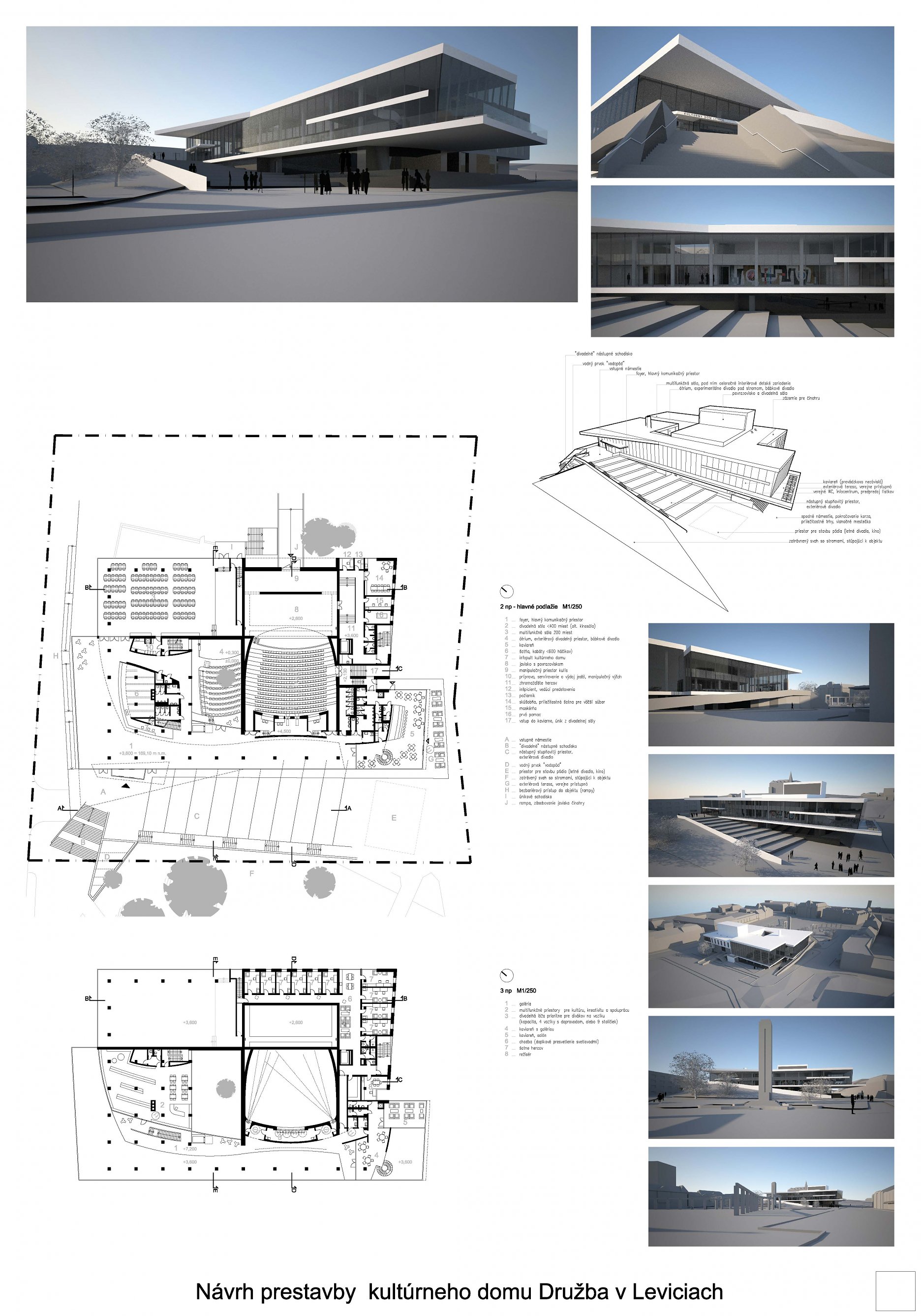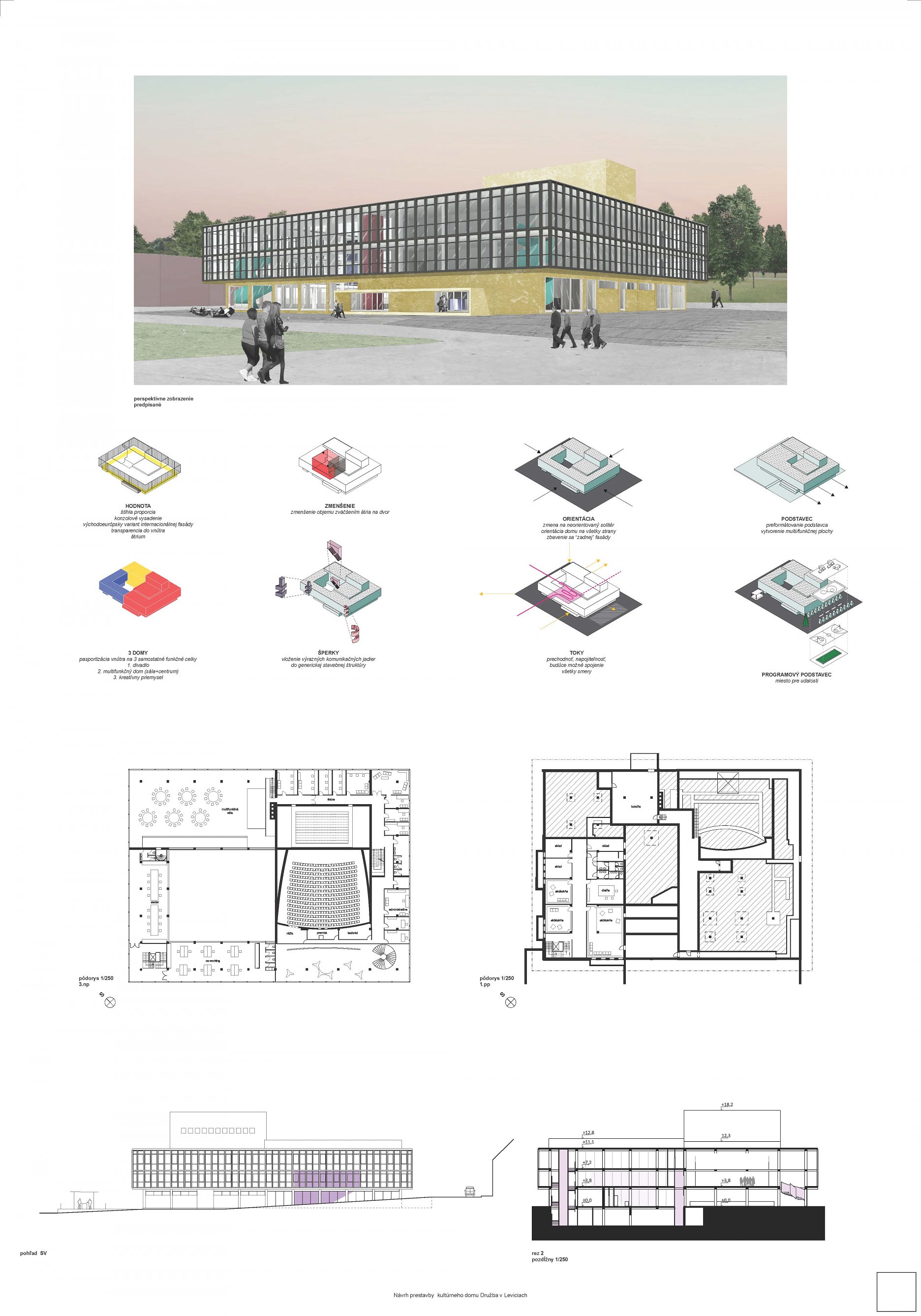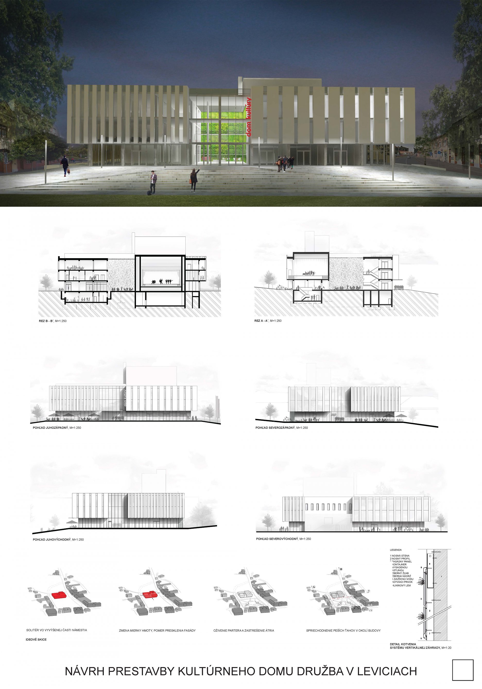 2. miesto patrí návrhu s pôsobivým priestorovým konceptom a jasným architektonickým názorom. Požiadavku na redukciu objemu budovy adresuje zväčšením átria, čím objekt získava navyše novú kvalitu. Komorné átrium sa tak mení na veľkorysejší vonkajší priestor (dvor), čo rozširuje možnosti jeho využitia a objekt získava intenzívnejšie presvetlenie svojho vnútra. Rafinovaným spôsobom tak dosahuje zásadnejšiu pozitívnu zmenu bez toho, aby sa to prejavilo na vonkajšom vzhľade objektu, ku ktorému autori pristupujú citlivo, s pochopením a bez potláčania jeho výrazu. Návrh ponúka zaujímavé spojenie priestorov pre deti, multifunkčnej sály a dvora, ktoré by mohli spolu výborne fungovať. Rovnako pozitívne je vnímané otvorenie domu, jeho orientácia, do viacerých strán. Celok je možné považovať za ekonomický a realizovateľný. Najväčšie pochybnosti vzbudilo riešenie bezprostredného okolia kultúrneho domu. Rozsiahla súvislá spevnená plocha (podstavec) pôsobí schematicky a neprimerane. Paradoxne uberá na presvedčivosti návrhu a strháva pozornosť na seba, čím oslabuje aj centrálnu ideu zväčšeného átria. Medzi prevádzkové nedostatky možno zaradiť značne poddimenzované stravovanie a tiež vyhradenie jedného celého krídla objektu pre prenajímateľné priestory, čo môže predstavovať veľké nároky na prenajímateľov. Časť poroty diskutovala aj o vhodnosti výberu materiálu pre zasklenú fasádu - hliníkový profilovaný plech