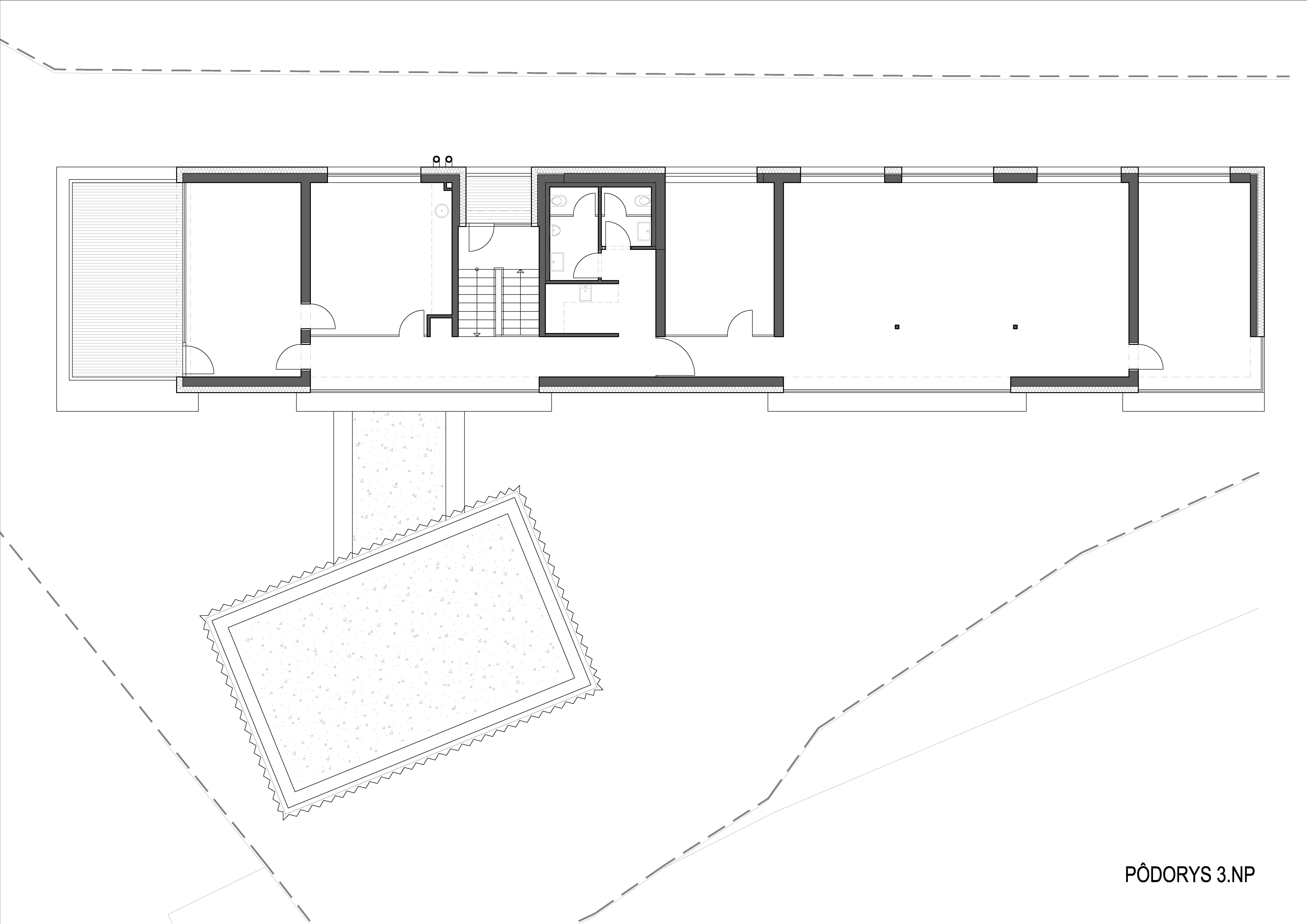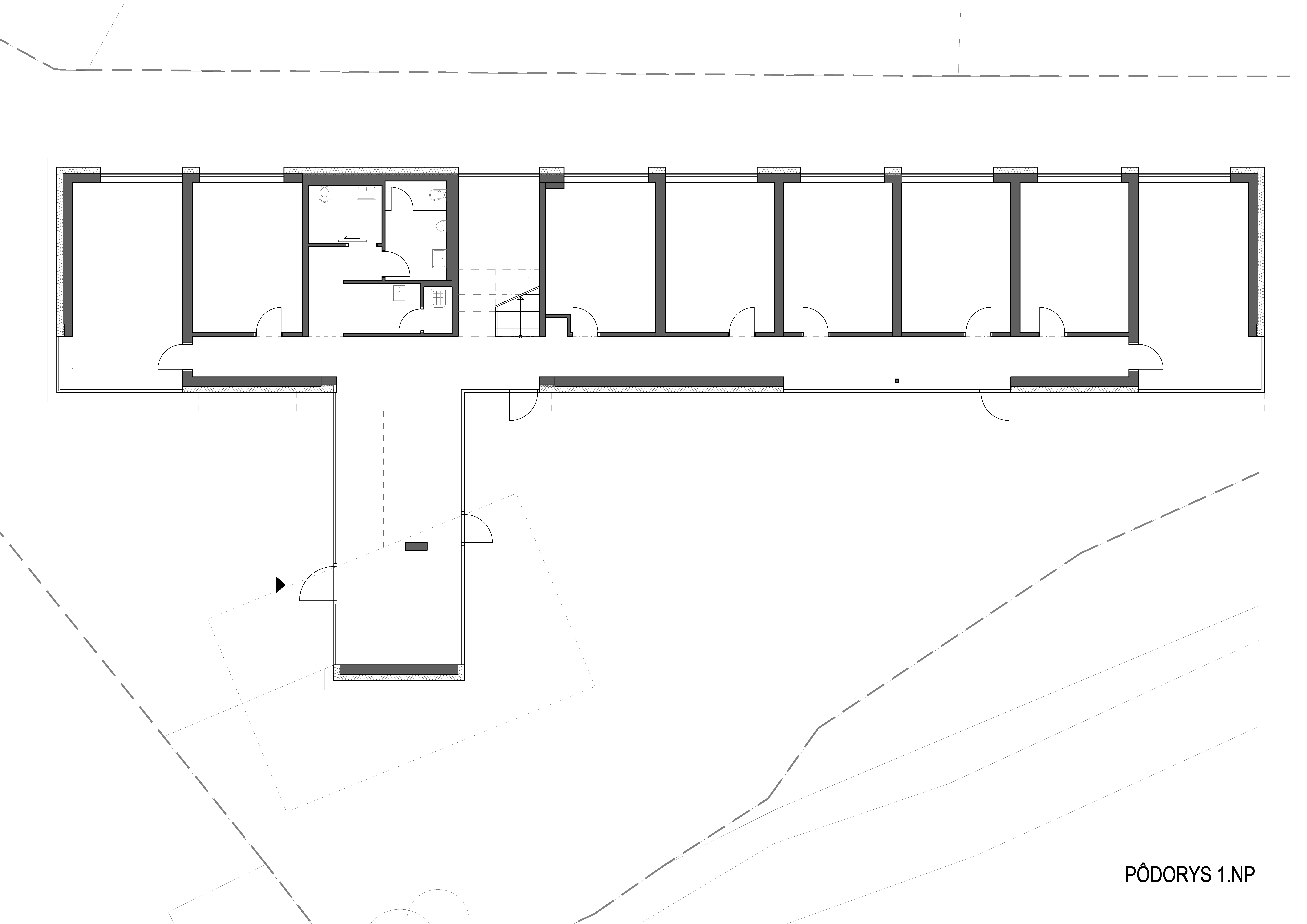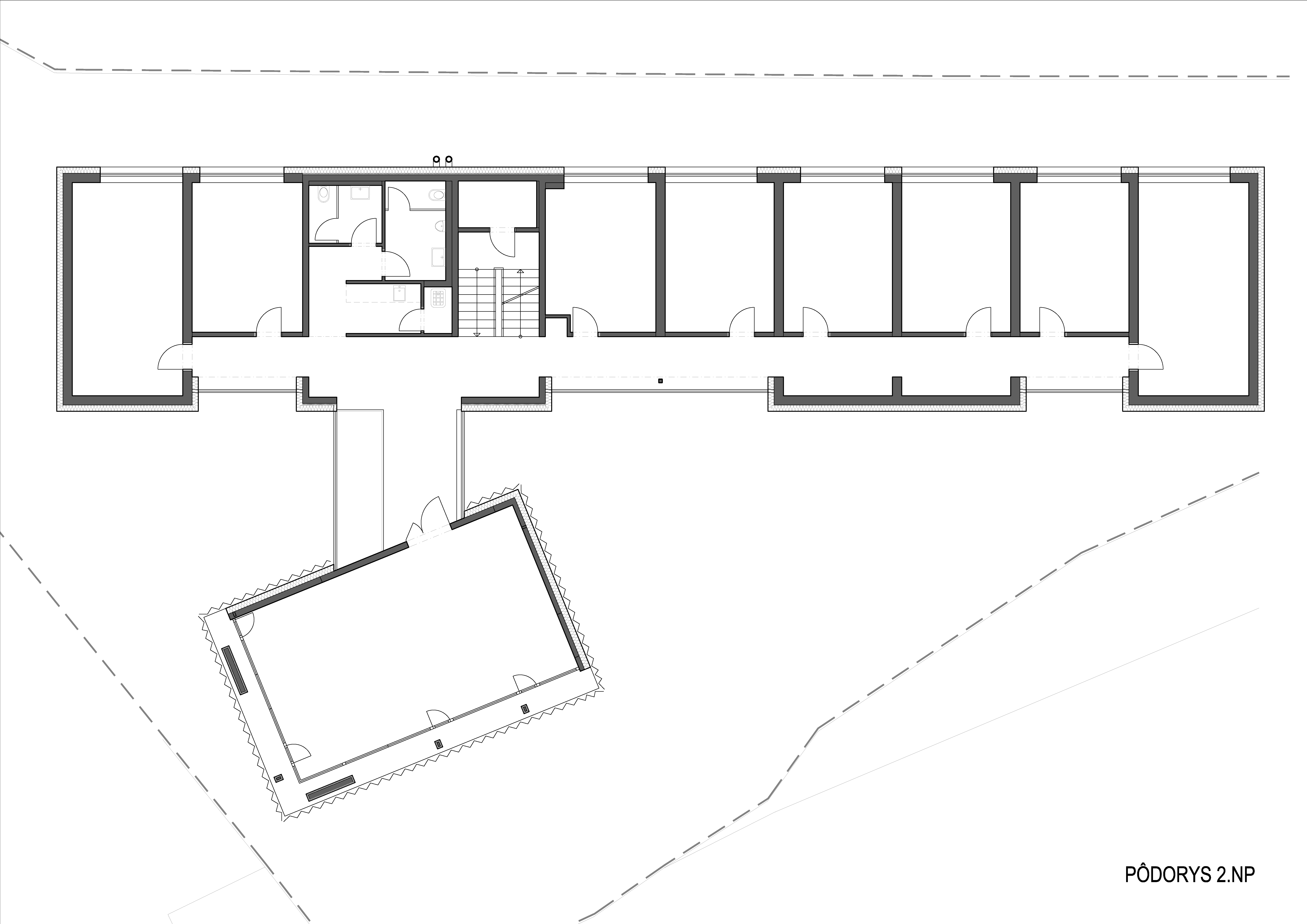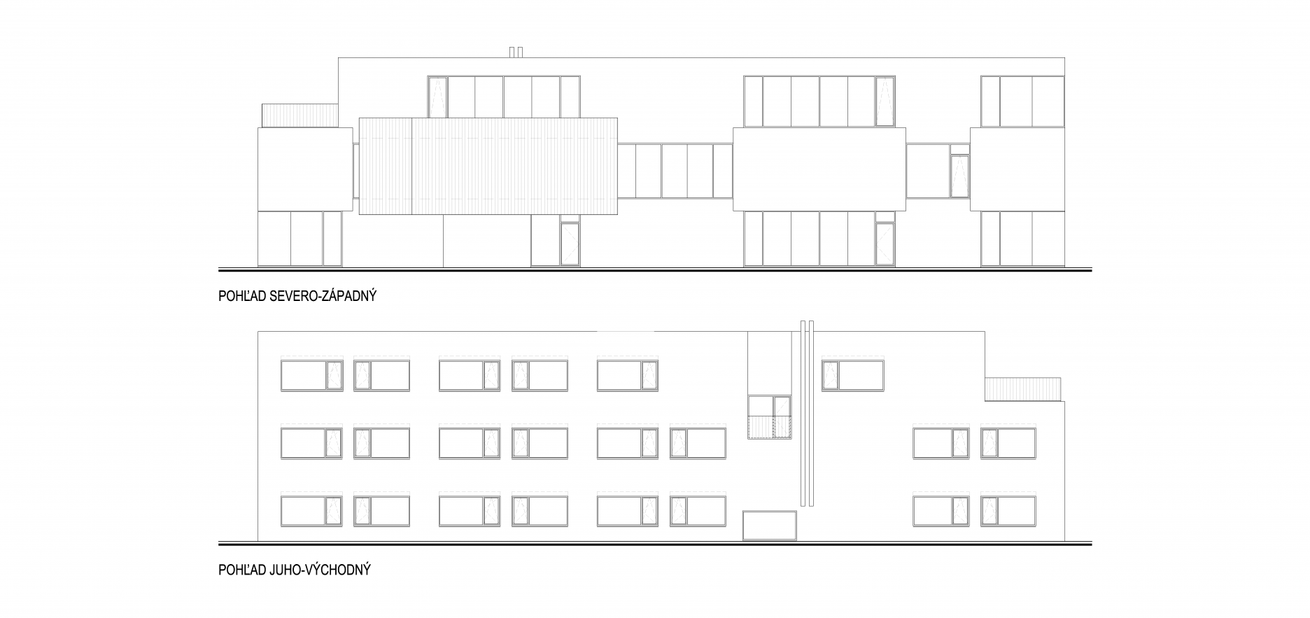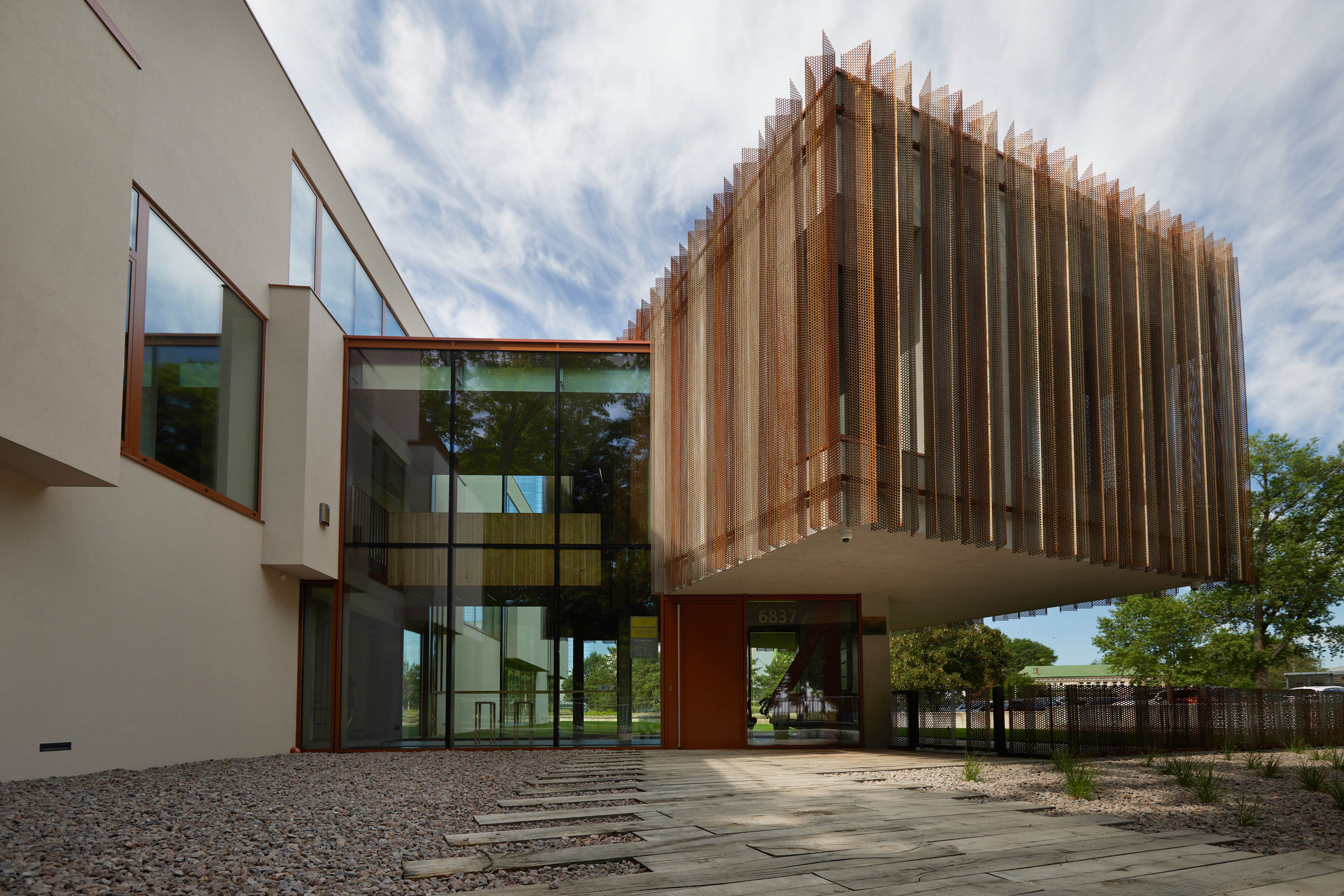 Samotná trojpodlažná budova s kanceláriami je situovaná paralelne so susedným objektom plavárne a svojim striedaním plných a presklených plôch vytvára hru monolitických blokov, plastizujúcich fasádu.