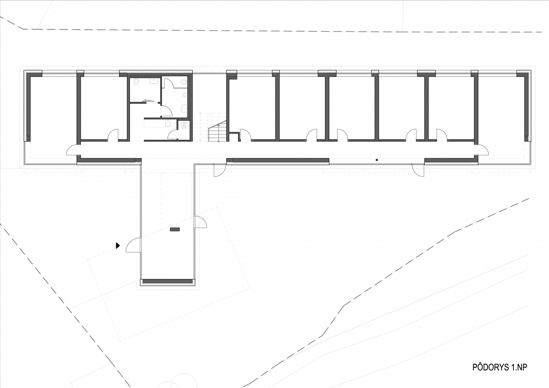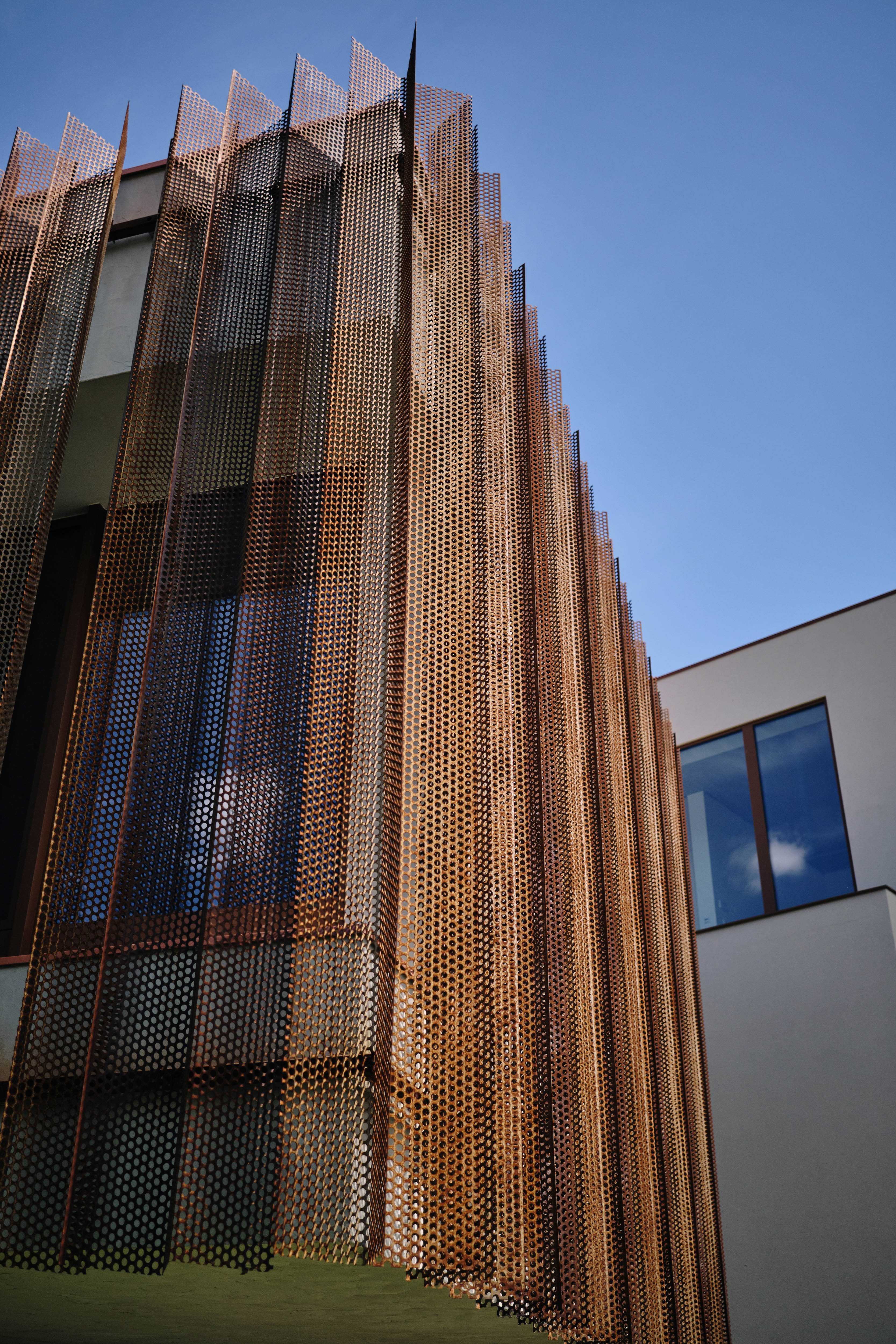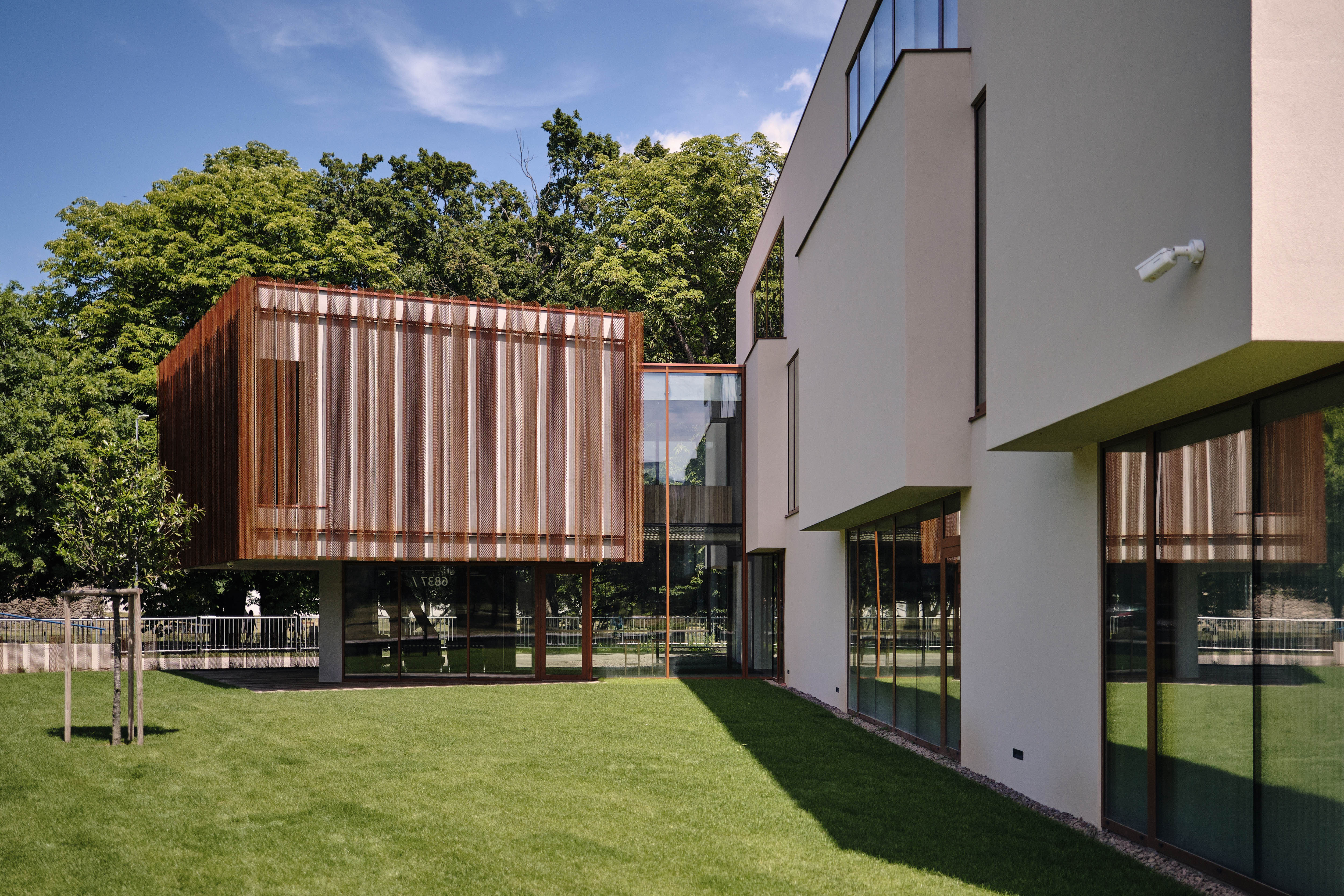 Objekt rokovacej miestnosti, ktorý stojí na odhmotnenej podnoži, v pôdoryse kopíruje tok Podlužanky. Predsadený translucentný plášť z cortenového ohýbaného dierokovu vytvára v pohľade zaujímavú vrstevnatosť a zjednocuje objem prvkov, pred ktoré je predsadený.