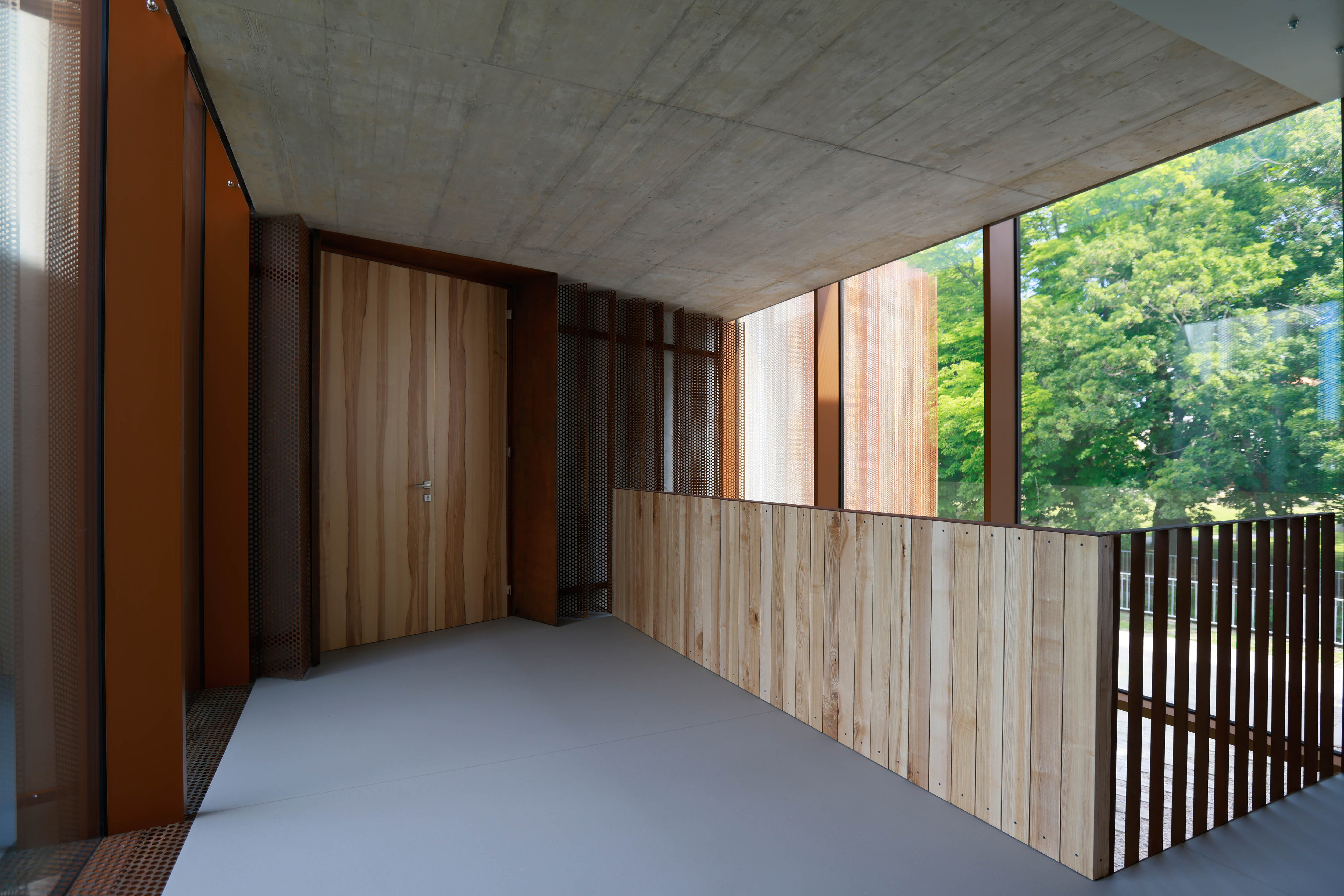 Stvárnenie interiéru nadväzuje na prácu architektov s elementárnymi formami. Hrdzavé odtiene cortenových prvkov v tomto prípade vynikajú na pozadí textúry prevládajúceho pohľadového betónu. Tvrdé povrchy dopĺňa drevo vo svojej prírodnej podobe.