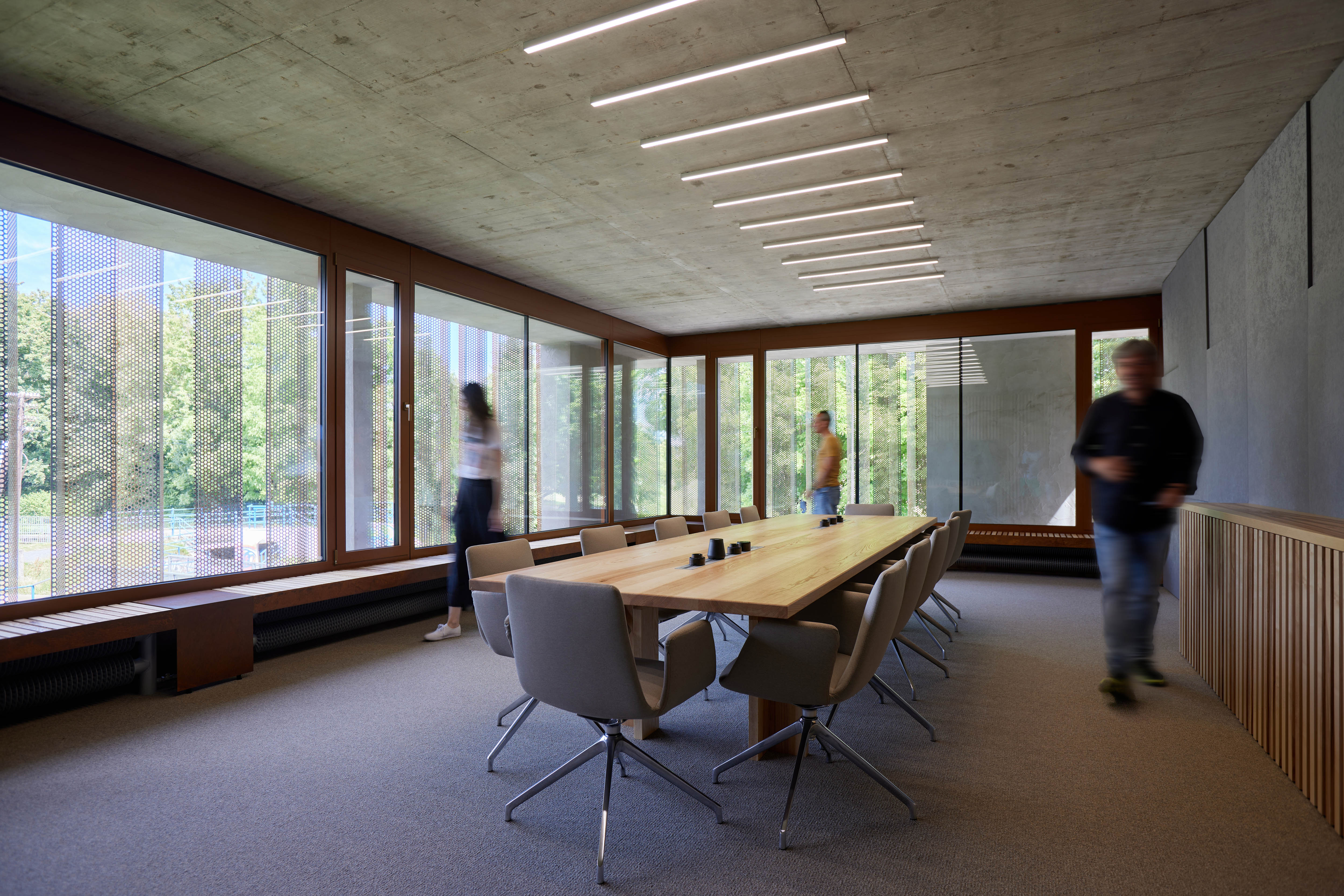 Podobné princípy boli použité aj pri tvorbe interiéru, kde obklady a dekorácie nahrádza pohľadový betón a naturálne povrchy cortenu a dreva. Takéto riešenie však kladie značné požiadavky na projekt a prípravu stavby - prípadné chyby nie je možné ľahko zakryť. V tomto prípade sa však zdá, že nie je čo ukrývať...
