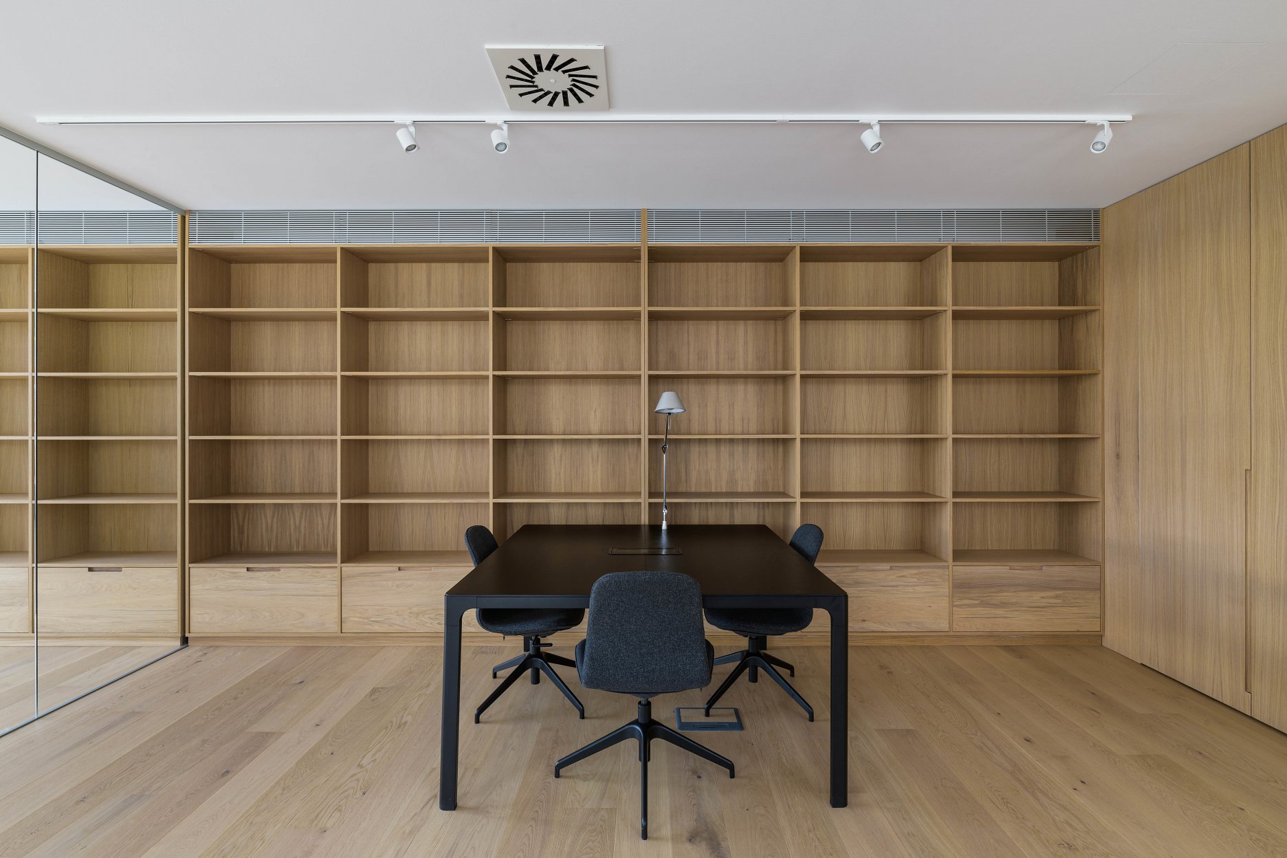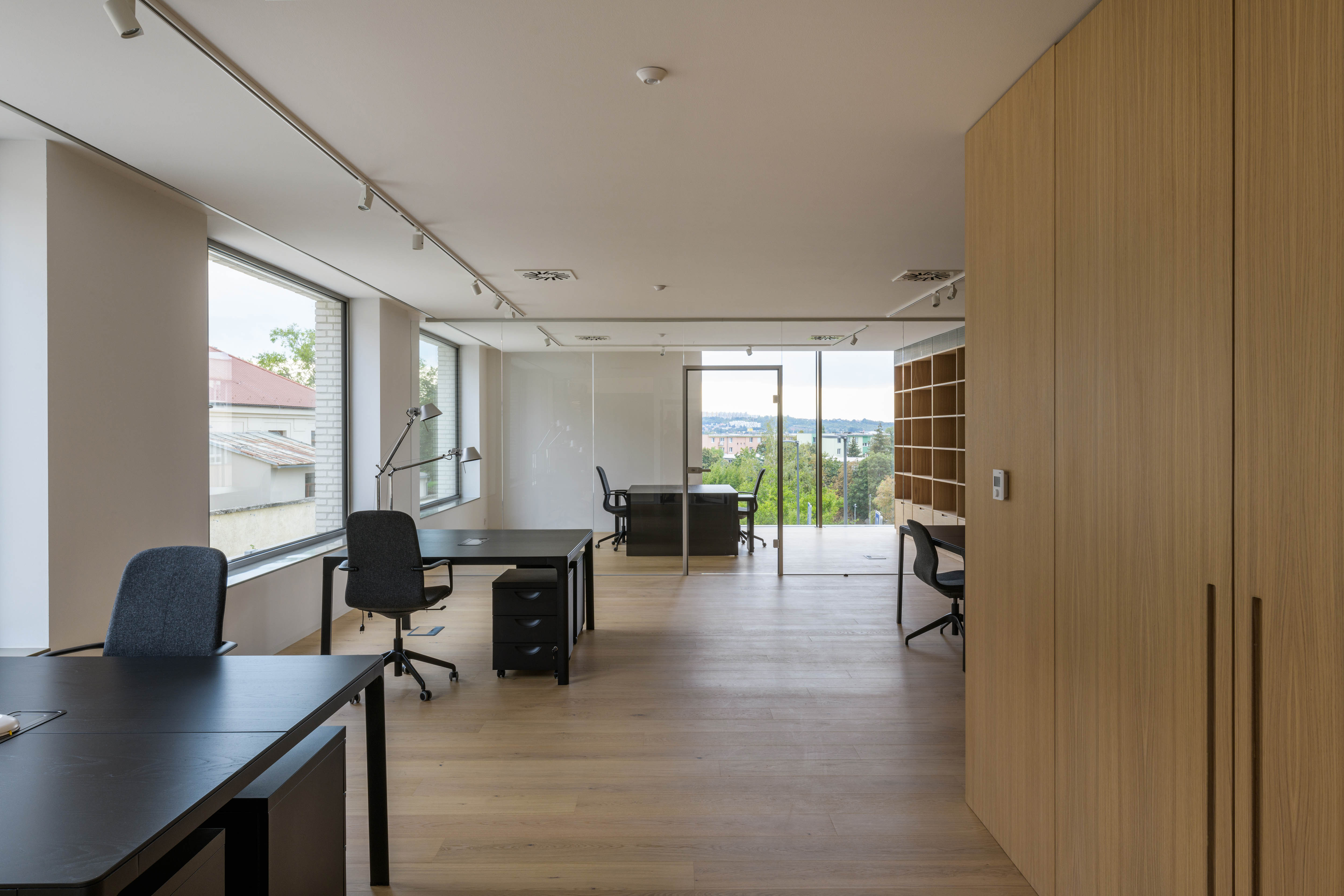 Na prízemí, prístupnom priamo z ulice Veterná víta návštevníkov prevýšené lobby. Celopresklená fasáda, smerujúca do Piaristickej ulice, umožňuje okoloidúcim nahliadnuť do otvoreného showroomu. Súčasťou prízemia je garáž pre tri autá (zvyšných osem parkovacích miest je v exteriéri, priamo za objektom), nevyhnutný technický blok a hygienické zázemie. Kancelárie na druhom a treťom nadzemnom podlaží tvorí mix open space priestorov a menších uzatvorených blokov. Zasadacia miestnosť je na každom poschodí. Priestory na najvyššom ustúpenom podlaží rozširuje pobytová terasa s výmerou 75 m2.