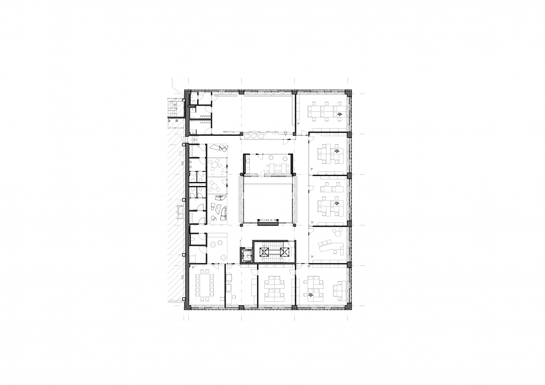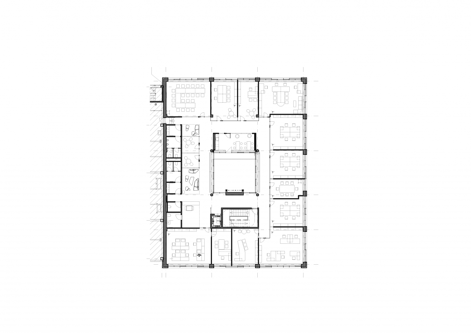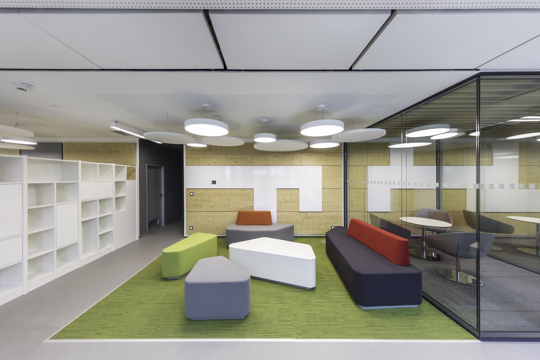 Kancelárske a zasadacie priestory sú doplnené o oddychové a združovacie zóny, kuchynky, fitness priestor s vyššou svetlou výškou, či školiace a prezentačné priestory na prízemí objektu. Dispozičné riešenie umožnilo vytvoriť otvorené a prepojené pracovné prostredie. Nielen z hľadiska priestorového usporiadania a prevádzky objektu, ale aj z pohľadu sociálnych kontaktov. Flexibilita priestorov je z dlhodobého hľadiska zabezpečená návrhom stropných konštrukcií s bezprievlakovými stropnými doskami.