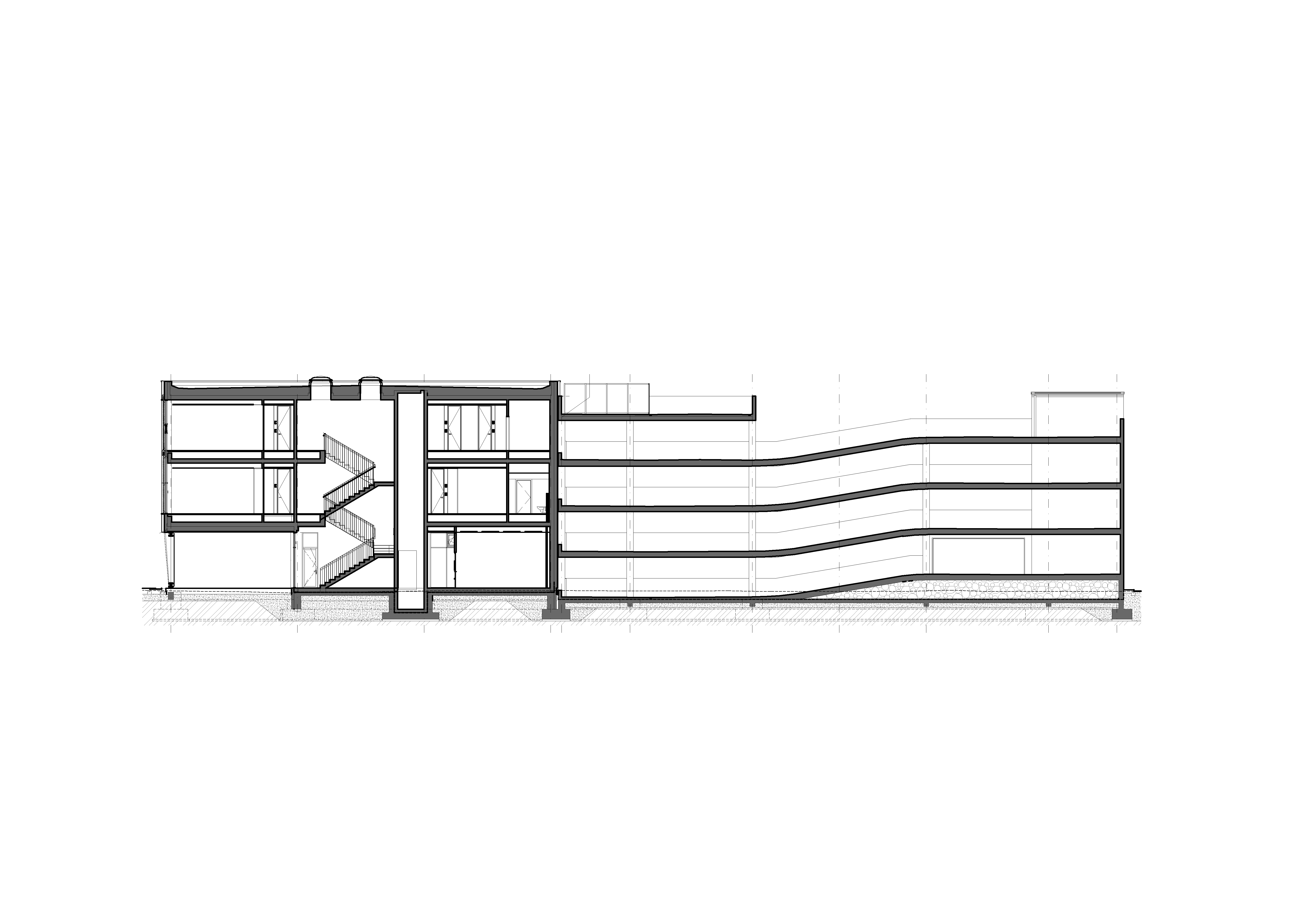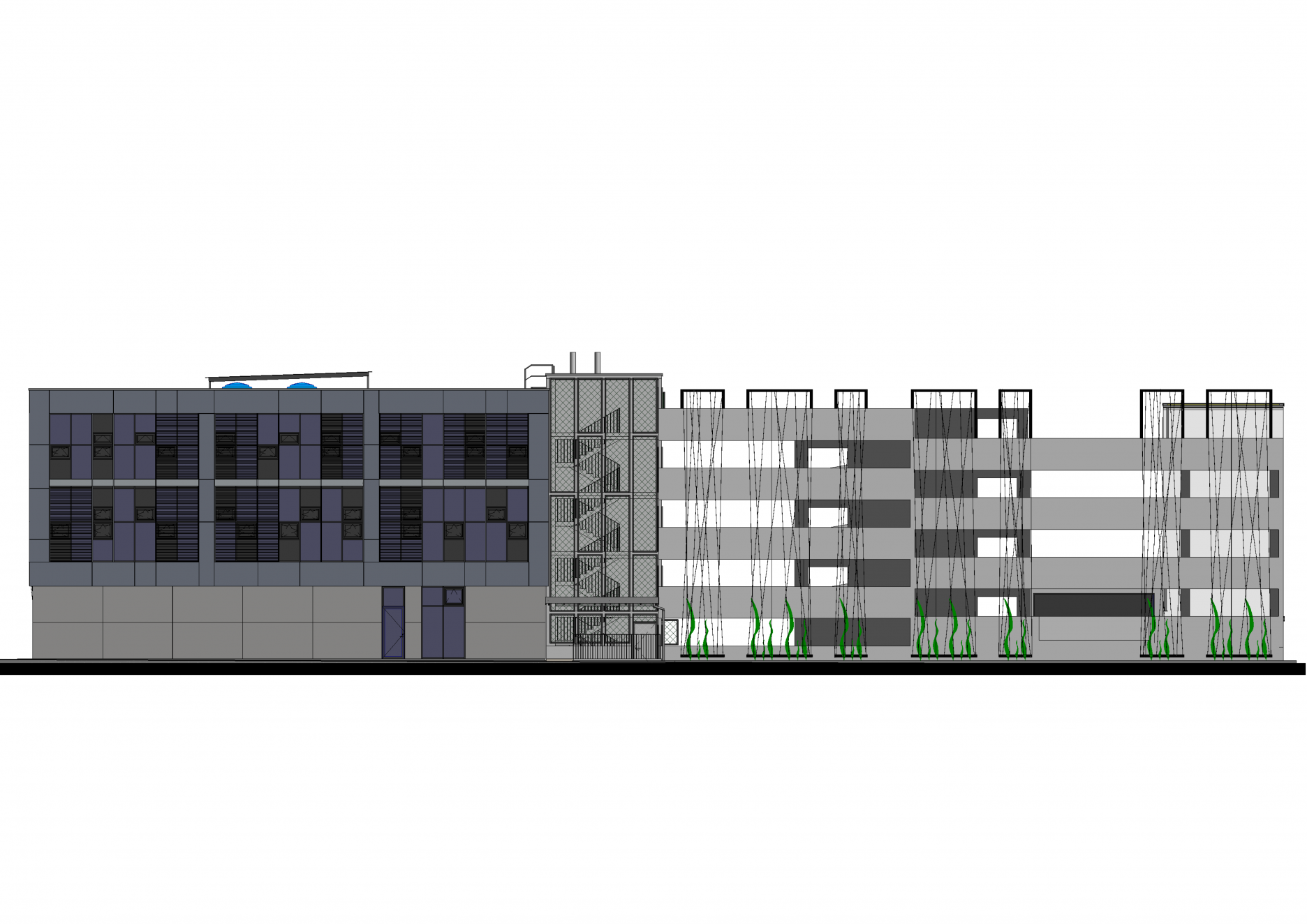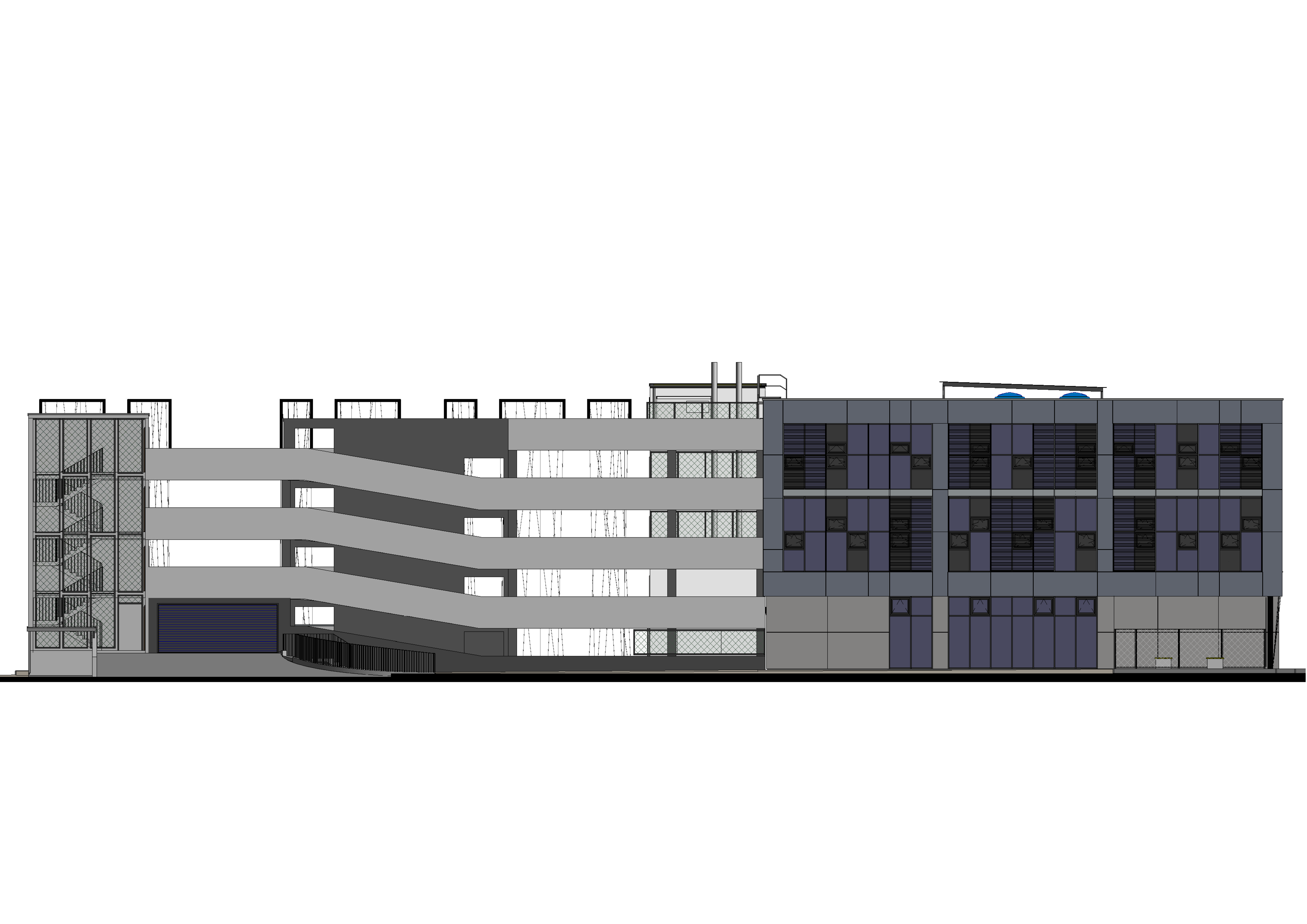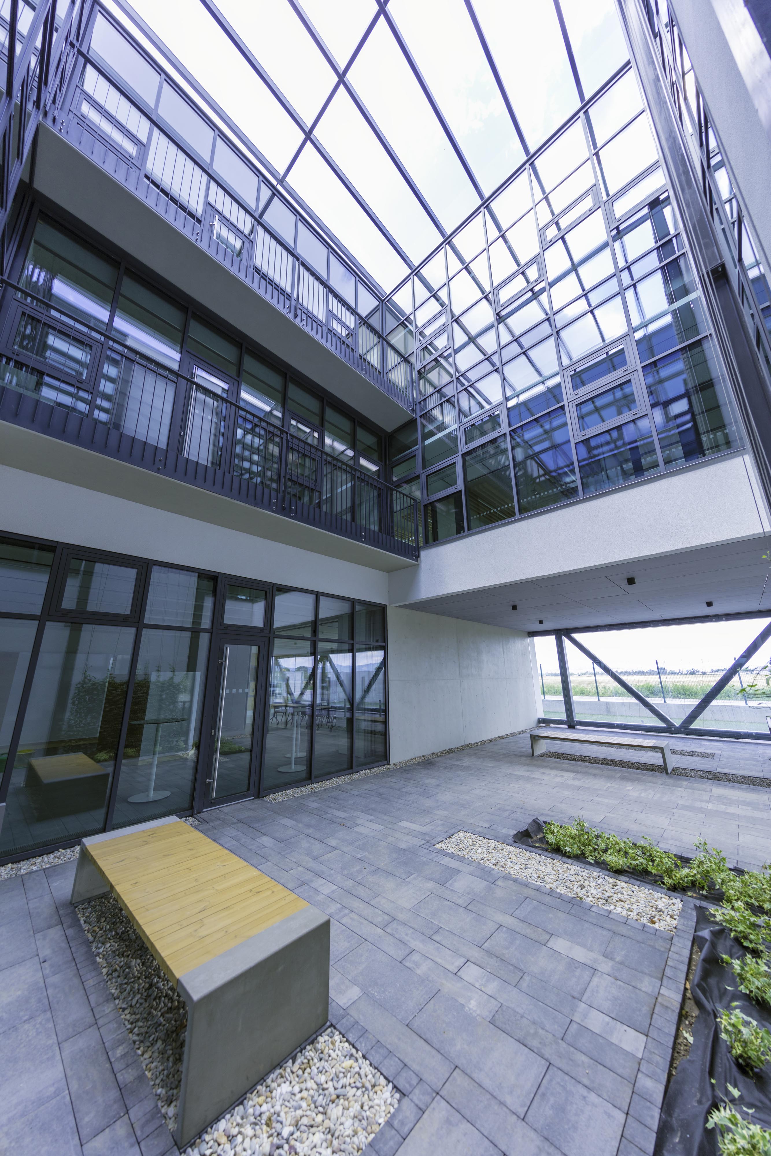Trojpodlažná administratívna budova s takmer štvorcovým pôdorysom je perforovaná v celej výške otvoreným átriom. Na administratívnu časť priamo nadväzuje štvorpodlažný parkovací dom pre zamestnancov. Toto neštandardné riešenie umožnilo uvolniť plochy na teréne pre budúci rozvoj firmy. Parkovací dom je priamo napojený na jednotlivé podlažia administratívneho objektu a tvorí zároveň krytý peší prechod do budúcej montážnej haly. Tu sa nachádzajú aj potrebné technické miestnosti pre administratívnu budovu, čo umožnilo veľkorysejšie koncipovanie kancelárií.