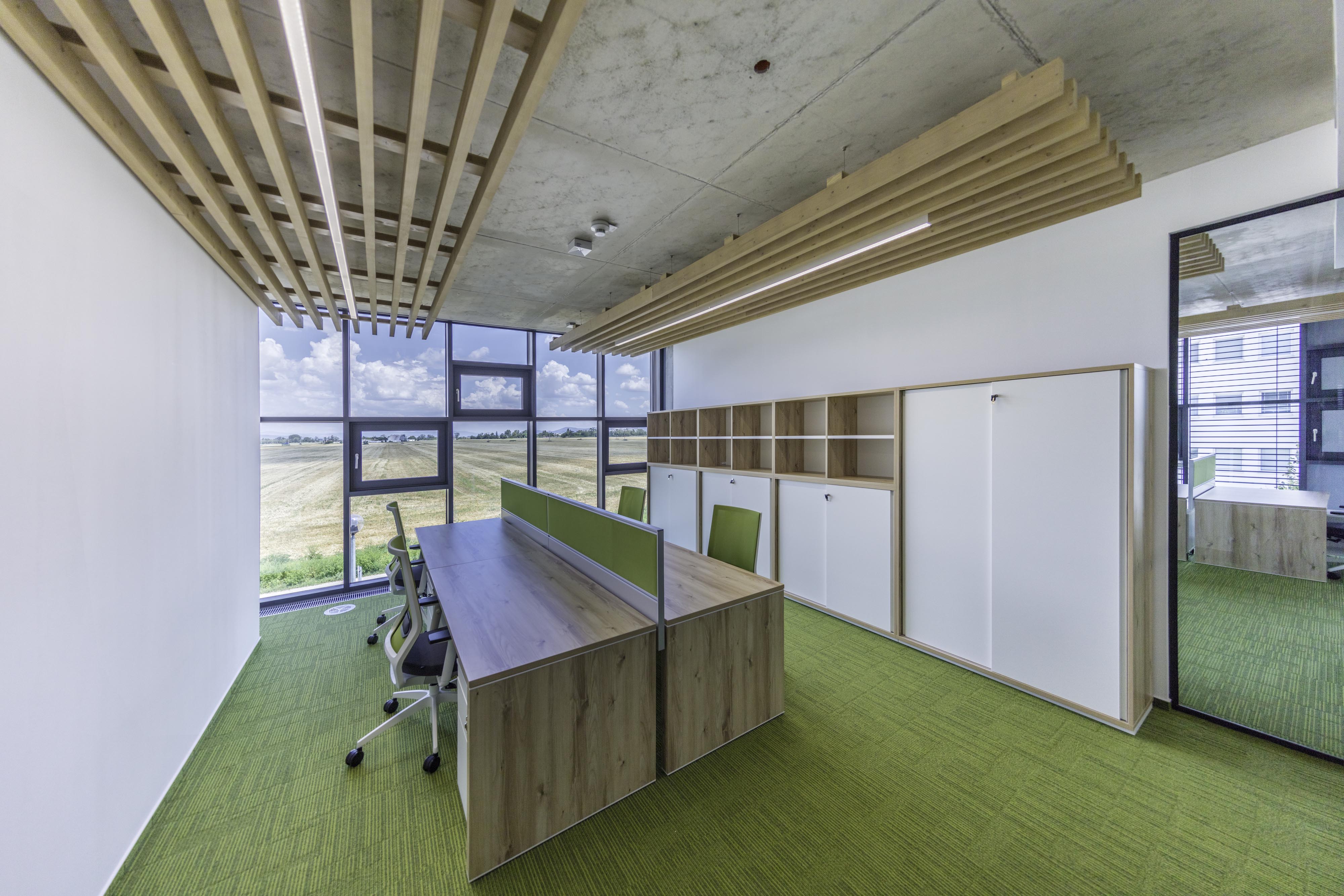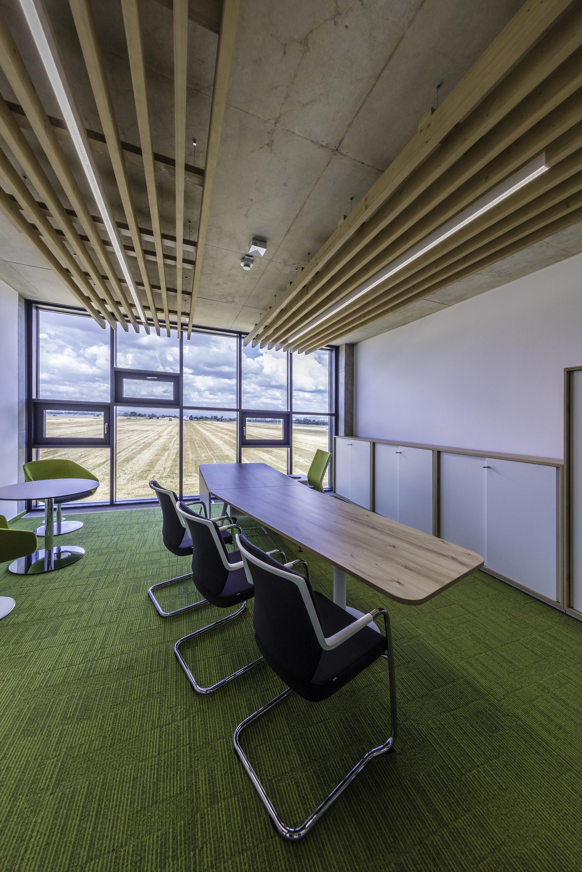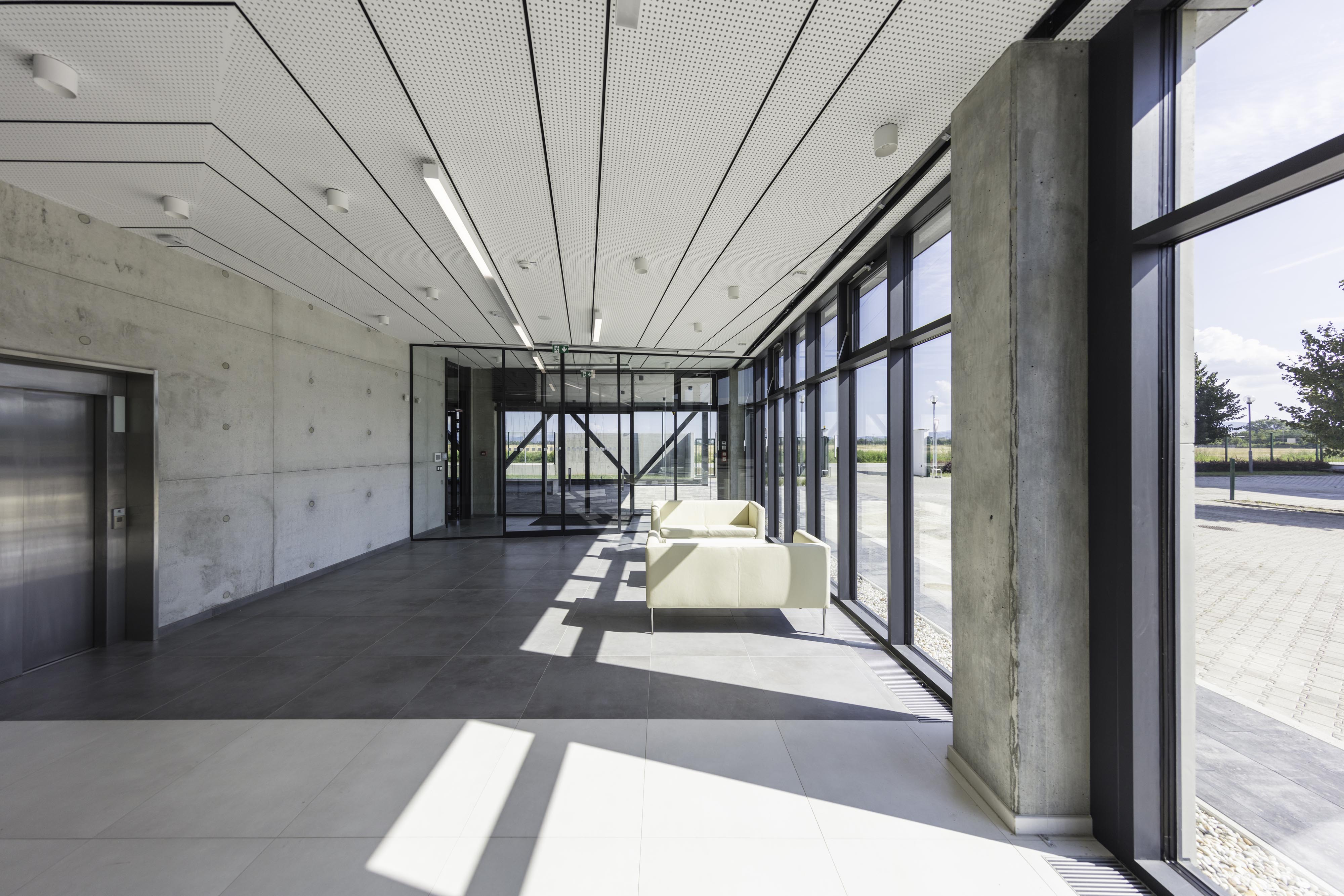 Keďže je nová administratívna budova centrálou výrobného podniku, v interiéri dominuje pohľadový betón a presklené steny s antracitovými profilmi. Kancelárske priestory sú zároveň navrhnuté bez viditeľných technických zariadení, ako sú radiátory alebo rušivé inštalácie v strope. Použité materiály sú zredukované na neutrálne biele steny, výrazný farebný koberec a priznaný betónový strop.