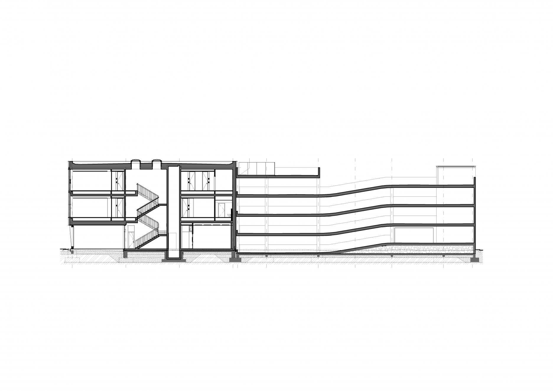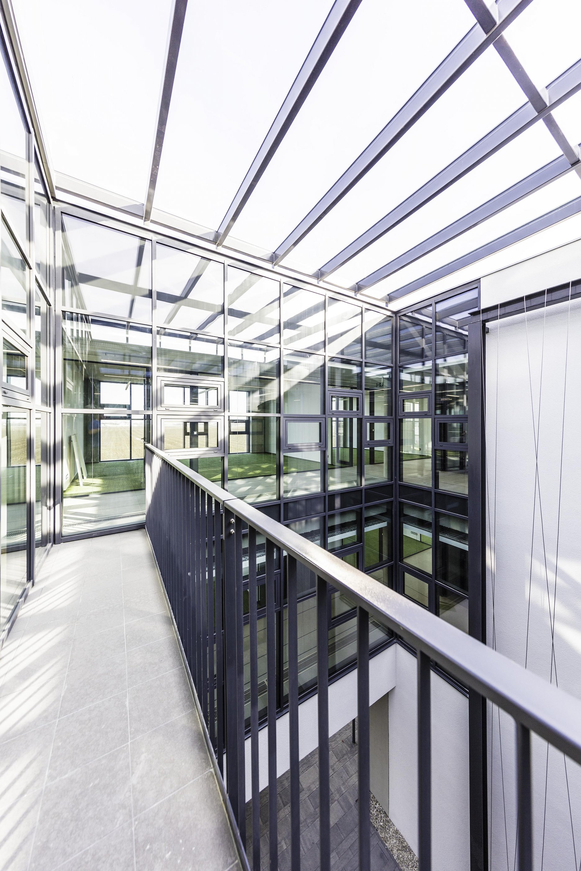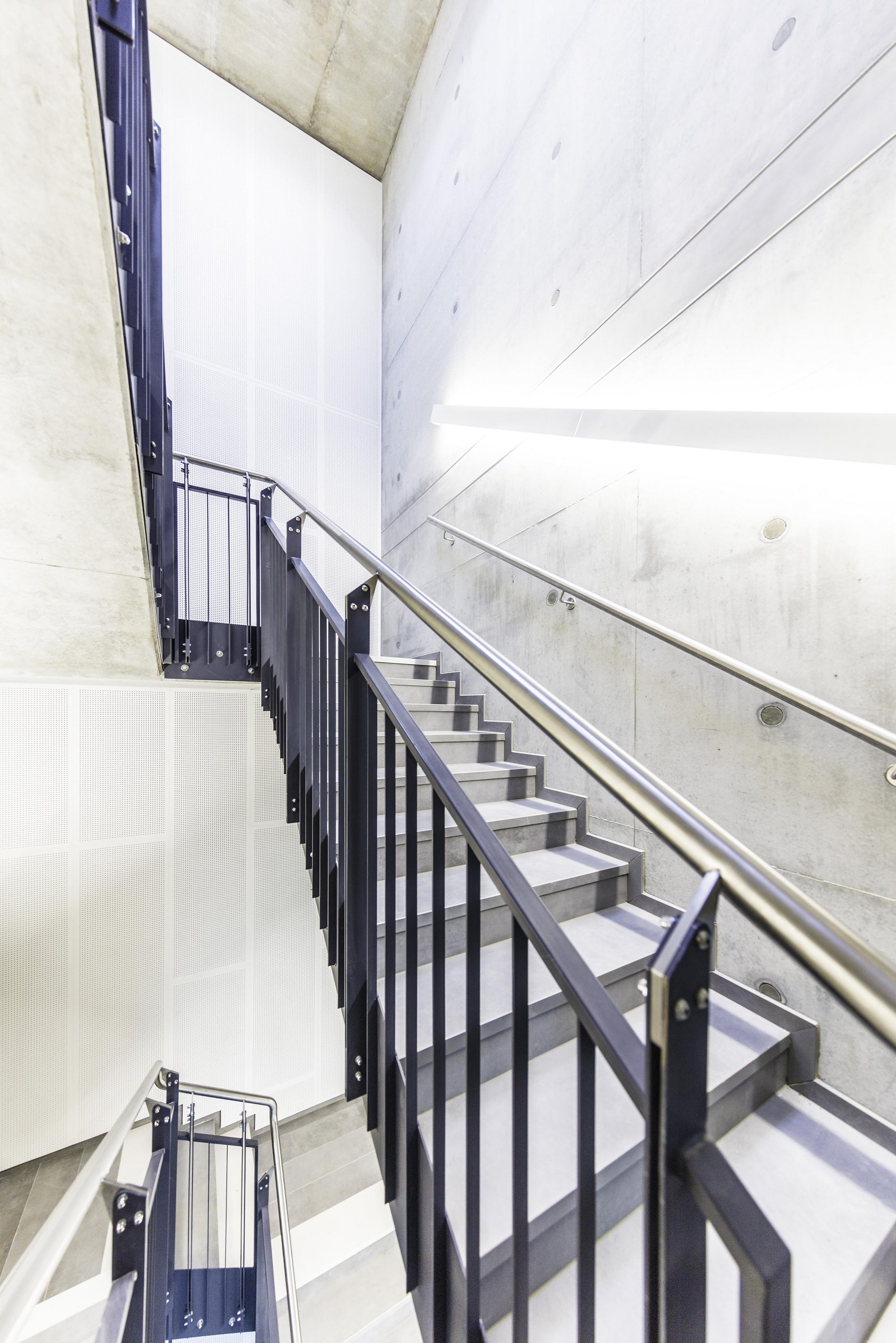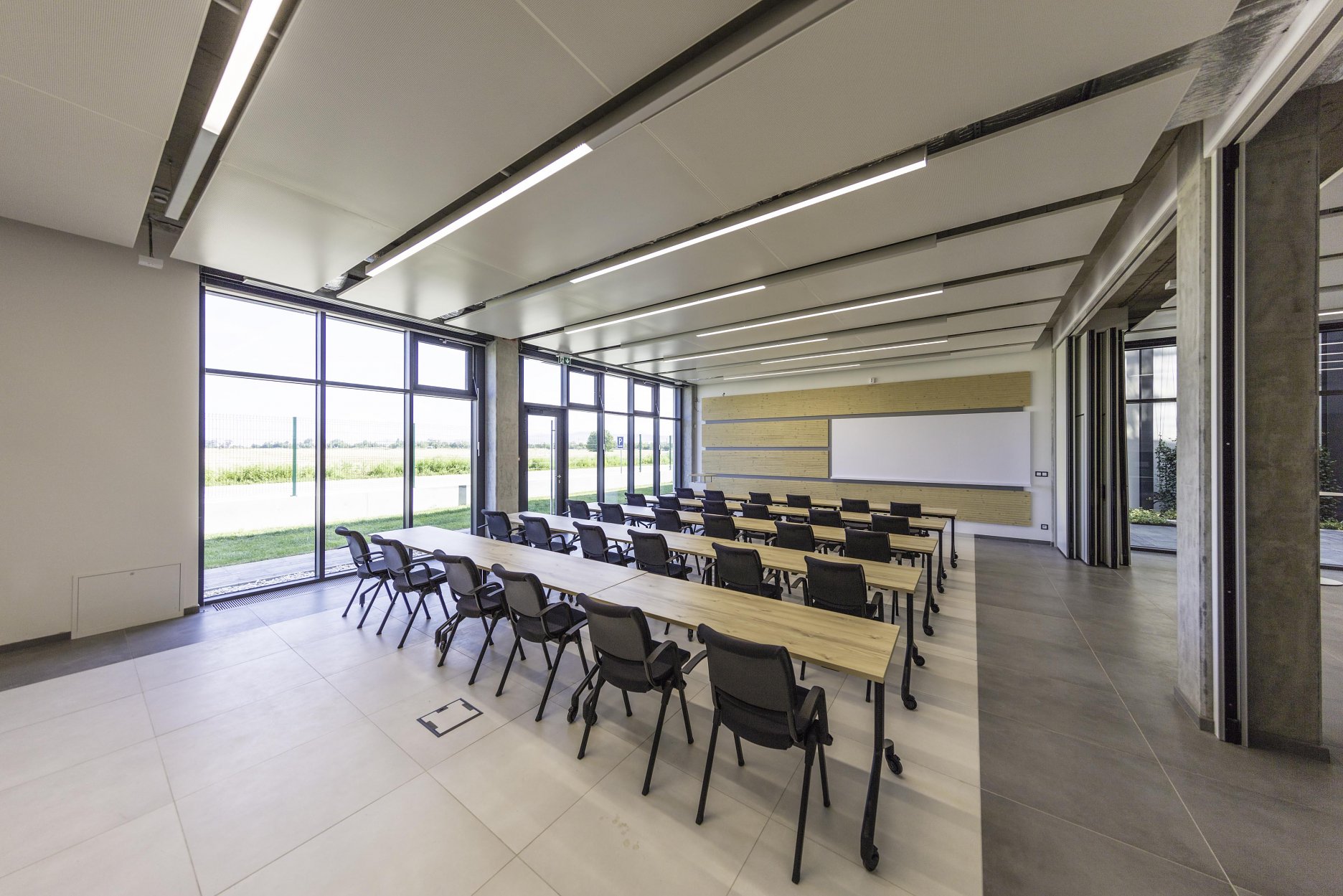 Keďže je nová administratívna budova centrálou výrobného podniku, v interiéri dominuje pohľadový betón a presklené steny s antracitovými profilmi. Kancelárske priestory sú zároveň navrhnuté bez viditeľných technických zariadení, ako sú radiátory alebo rušivé inštalácie v strope. Použité materiály sú zredukované na neutrálne biele steny, výrazný farebný koberec a priznaný betónový strop.