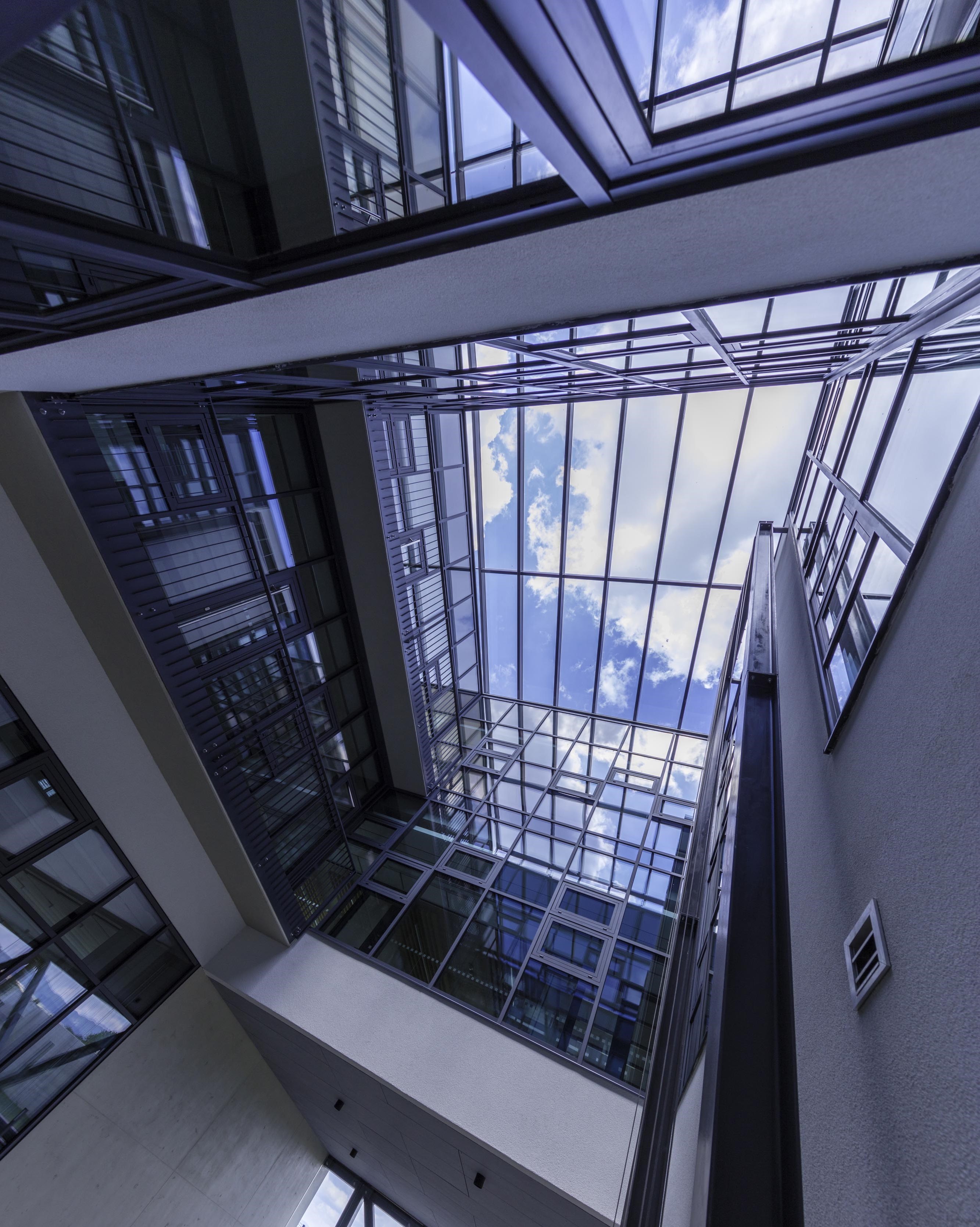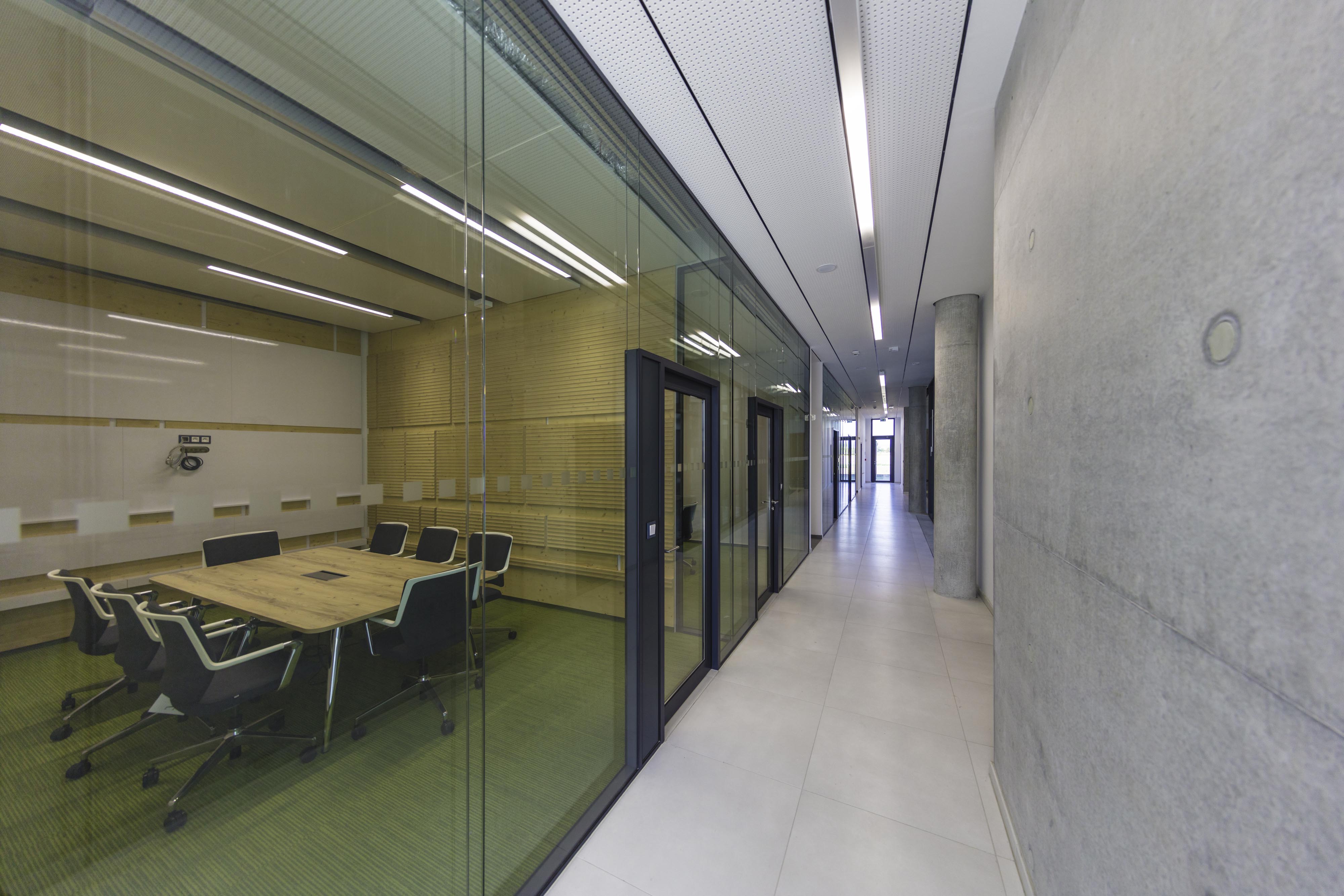 V spoločných priestoroch je použitá veľkoformátová dlažba alebo kaučuková podlaha. Rozvody sú ukryté za perforovaným sadrokartónovým podhľadom alebo akustickými panelmi. Na chodbách vedúcich okolo átria je na podlahe aj v strope vedená línia, ktorá vytvára výrazný orientačný prvok a zvýrazňuje perspektívu priestoru. Drevené obklady stien, sú na dotyk príjemné a majú dobré akustické vlastnosti. Napriek tomu v celkovom vnímaní interiéru prevažuje téma skla a transparentnosti. Obkladové drevené panely umožňujúi vznik individualizovaných povrchov, pričom majú aj funkciu popisovateľných alebo premietacích stien.
