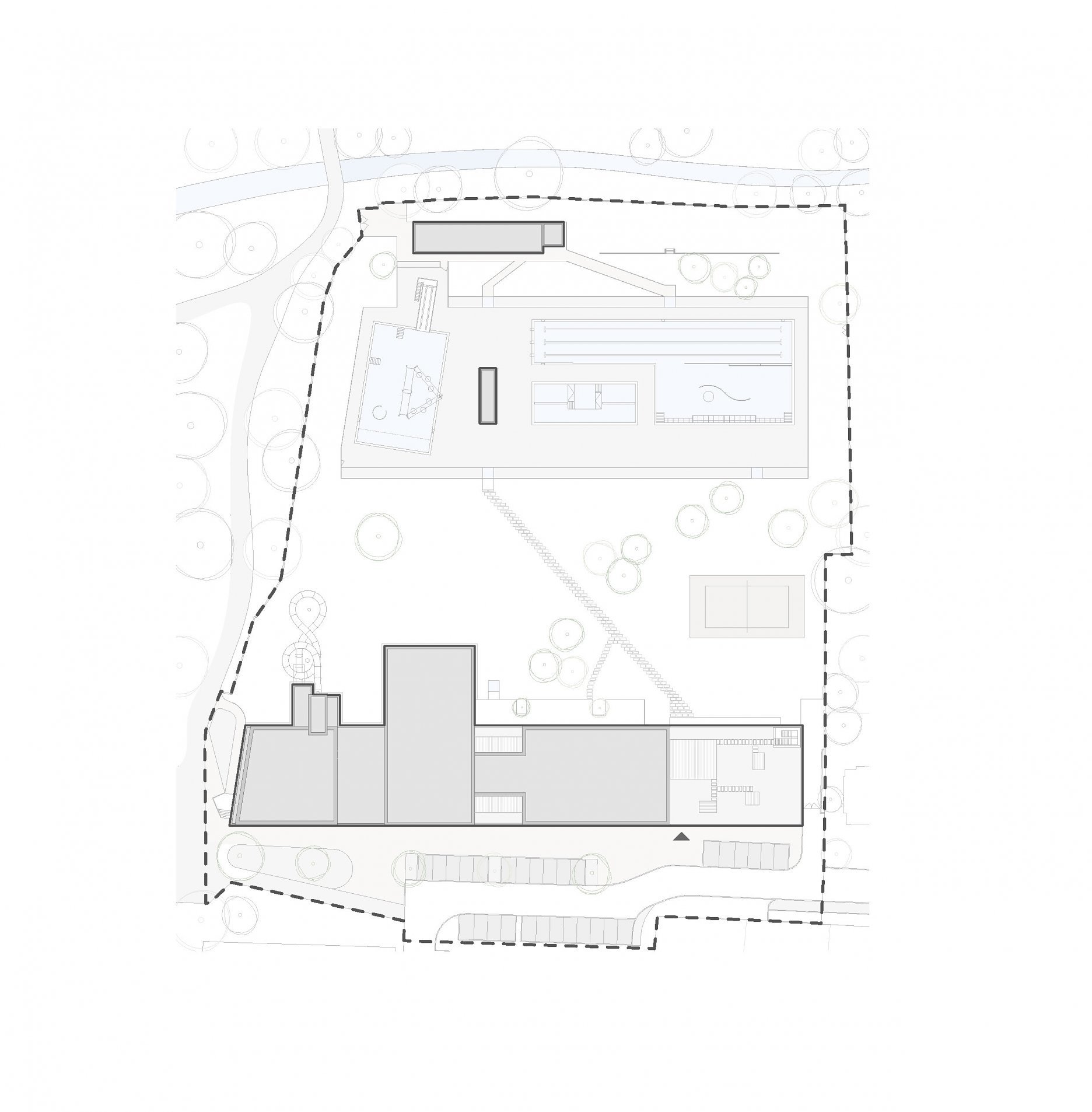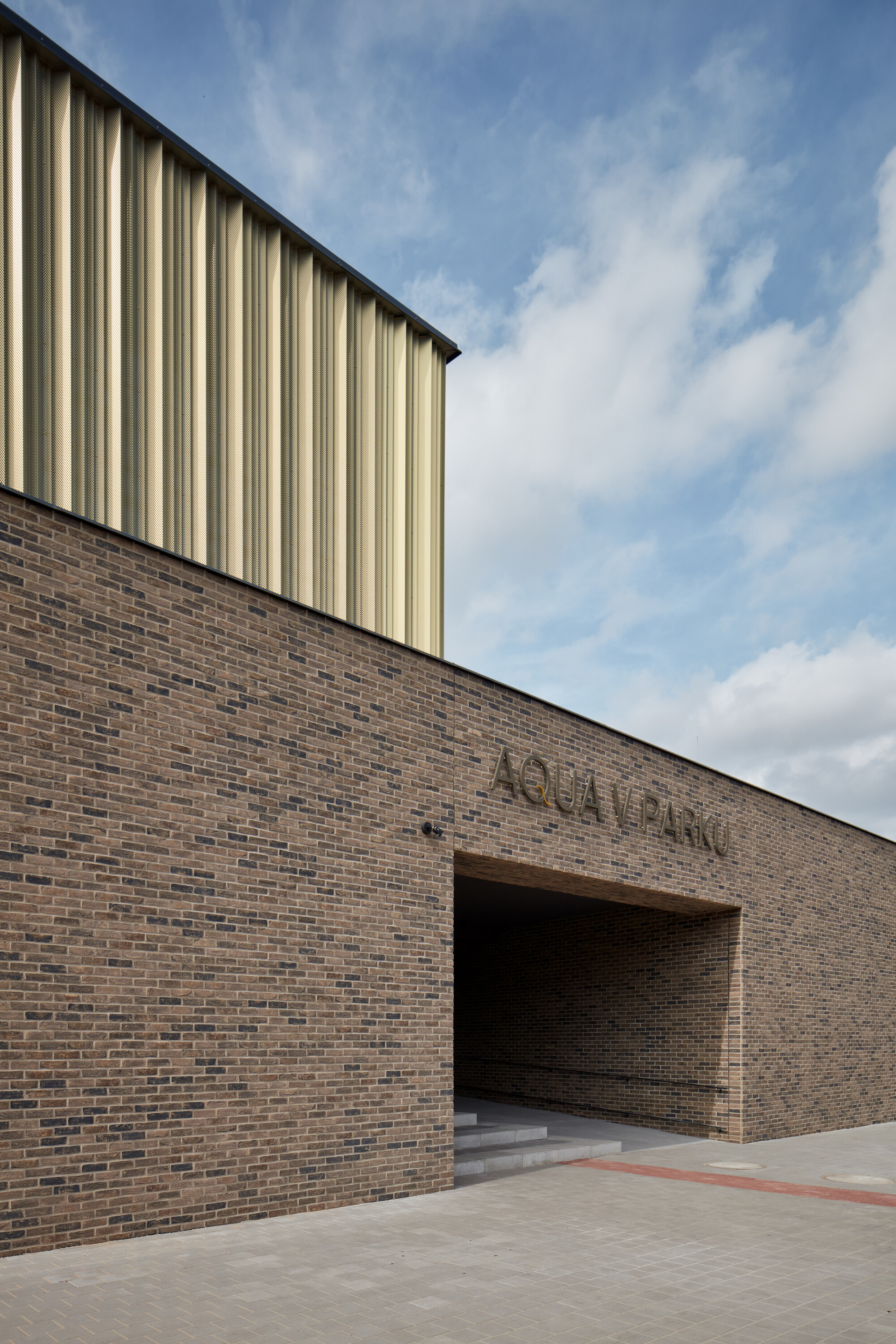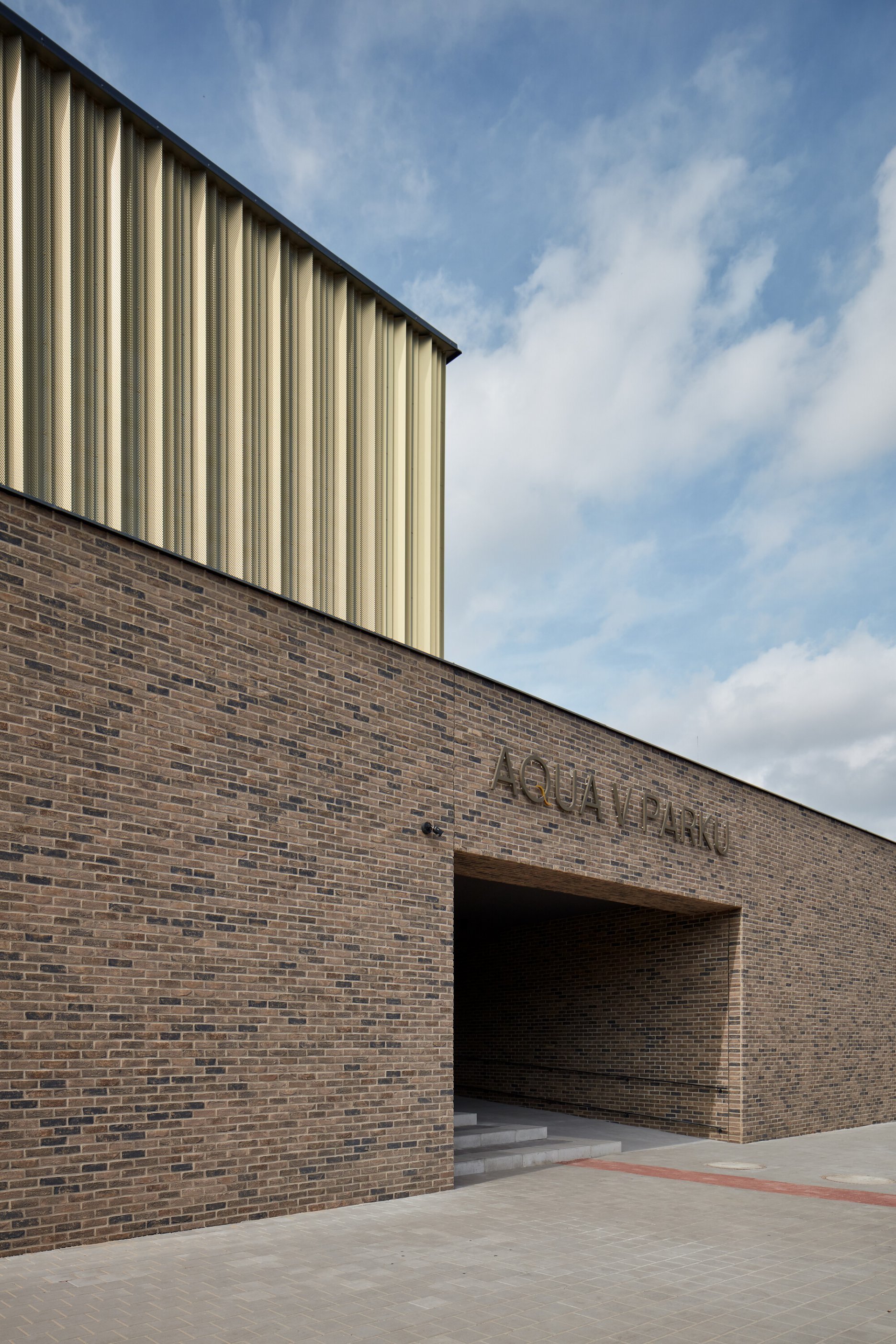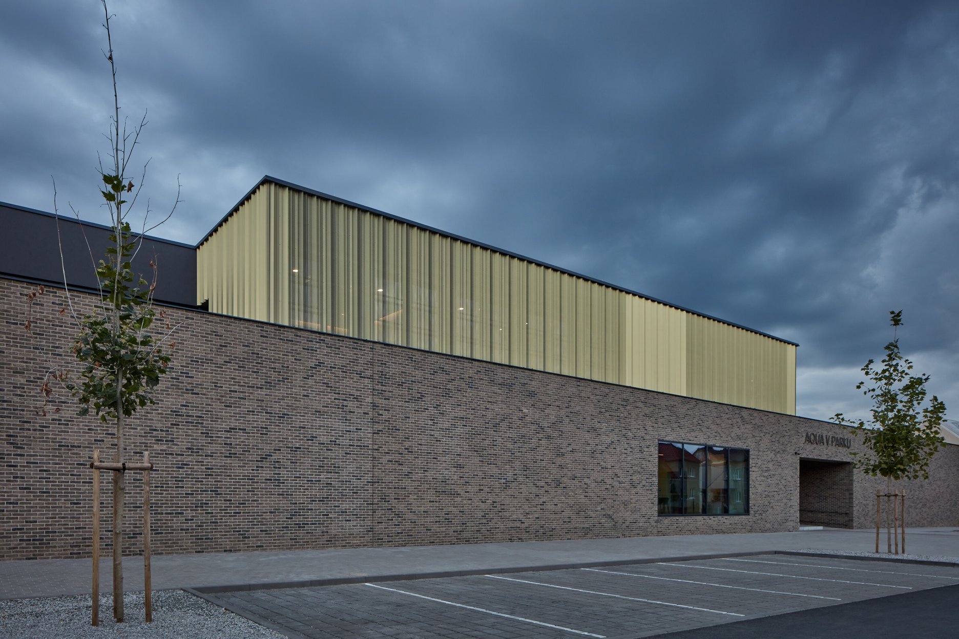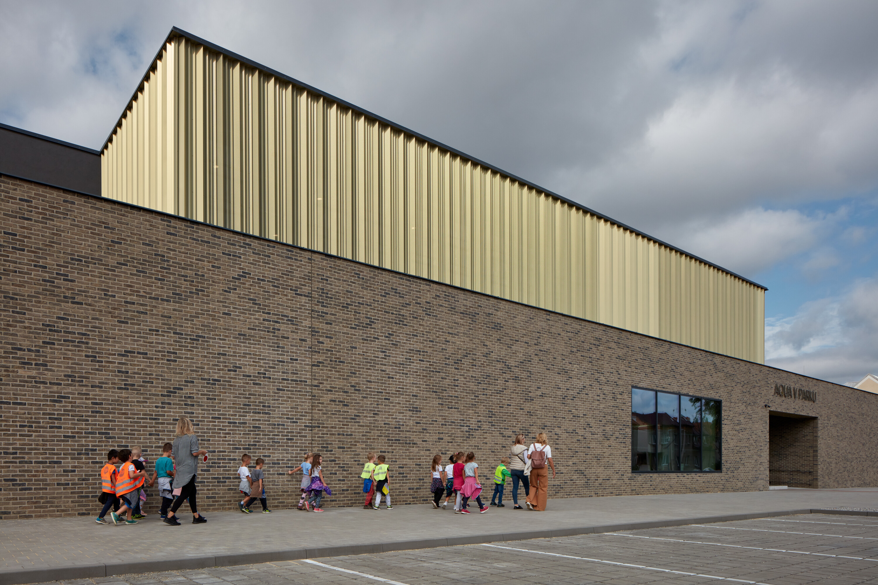Areál “Aqua v parku Kyjov” vznikol modernizáciou vonkajšieho mestského kúpaliska a jeho rozšírením o novostavbu krytého plaveckého bazéna. História športovo-rekreačného areálu v jedenásťtisícovom juhomoravskom meste siaha do začiatku 20. storočia, kedy tu vznikli riečne kúpele. Komplex na rozhraní hustej urbánnej štruktúry a parku v centre Kyjova dnes obklopujú koruny storočných stromov.