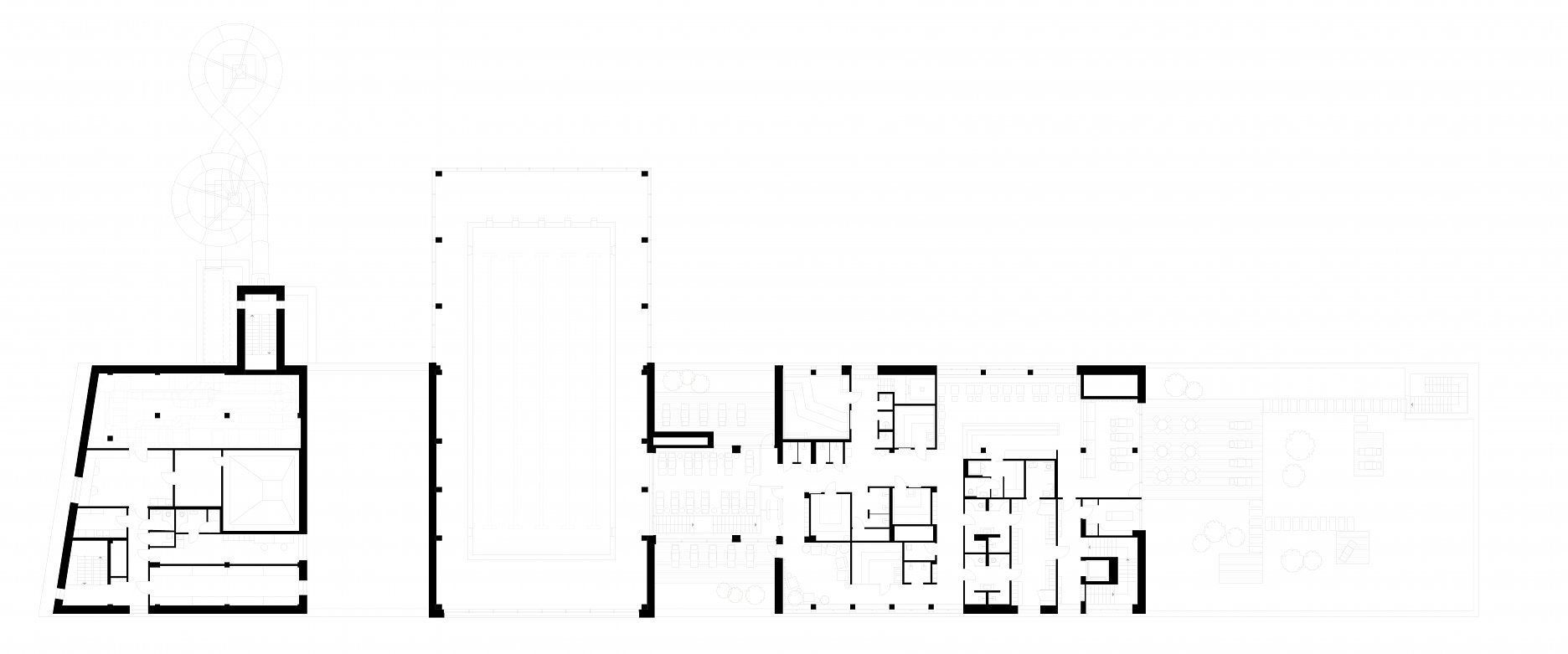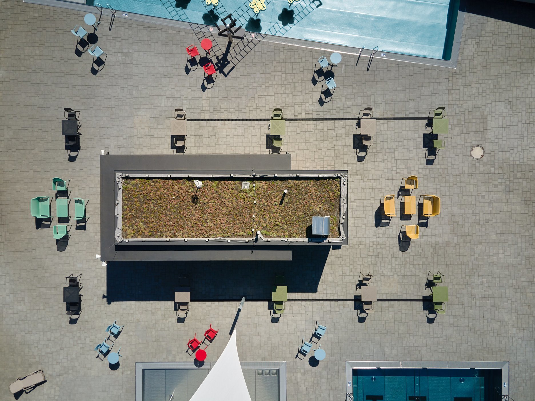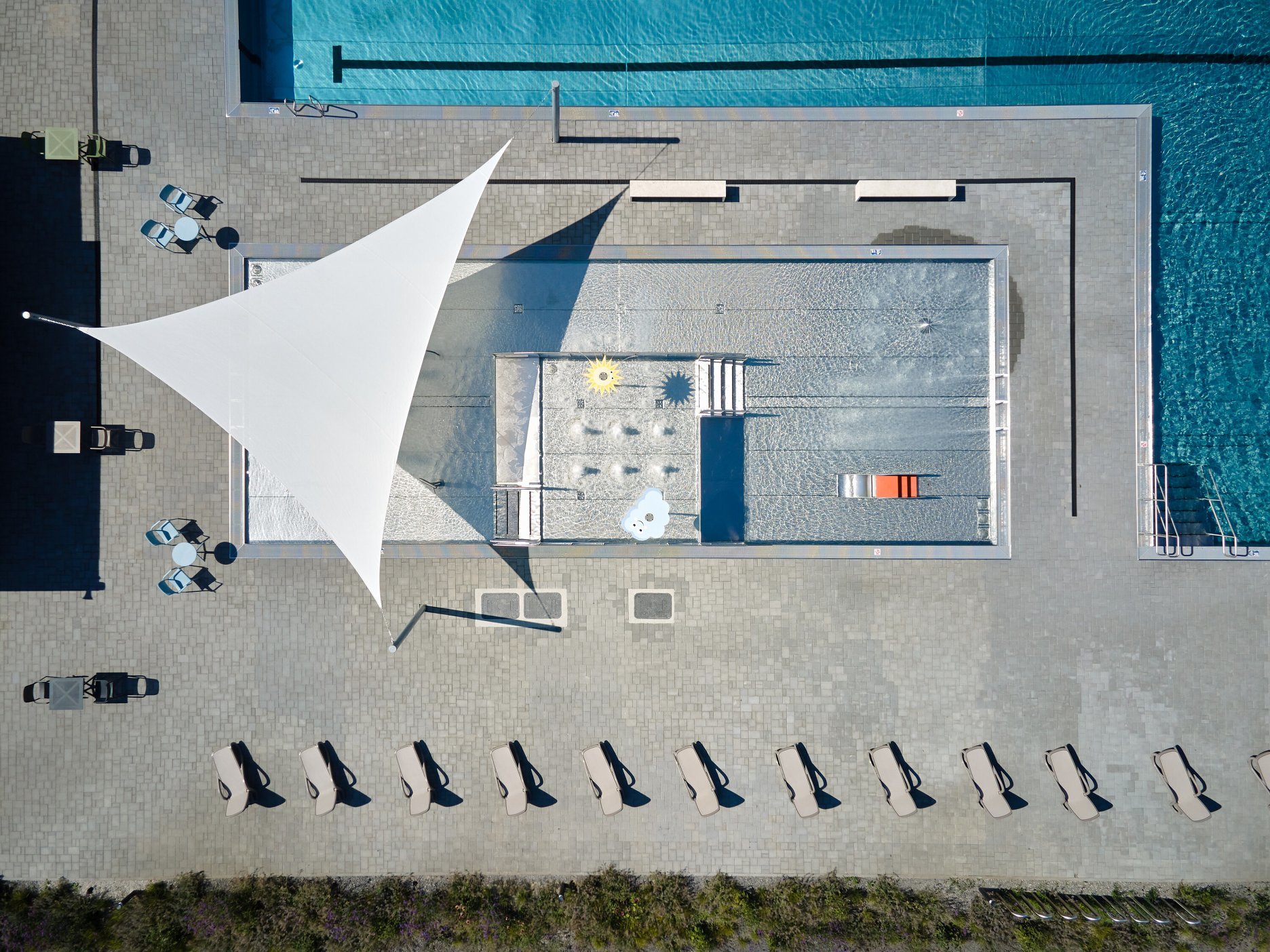 Usporiadanie vonkajších bazénov zostalo z veľkej časti zachované. Do pôvodných betónových telies však pribudli nové antikorové vane. Päťdesiatmetrový vonkajší plavecký bazén s tromi dráhami dopĺňa menšia zážitková vodná plocha. Vonkajší bar s občerstvením situovali architekti v centre kúpaliska.