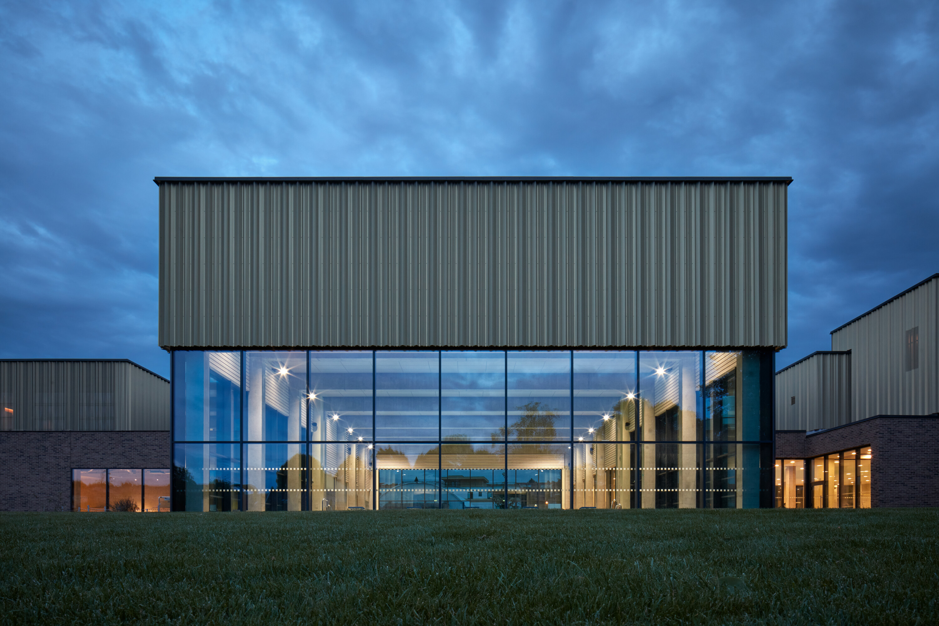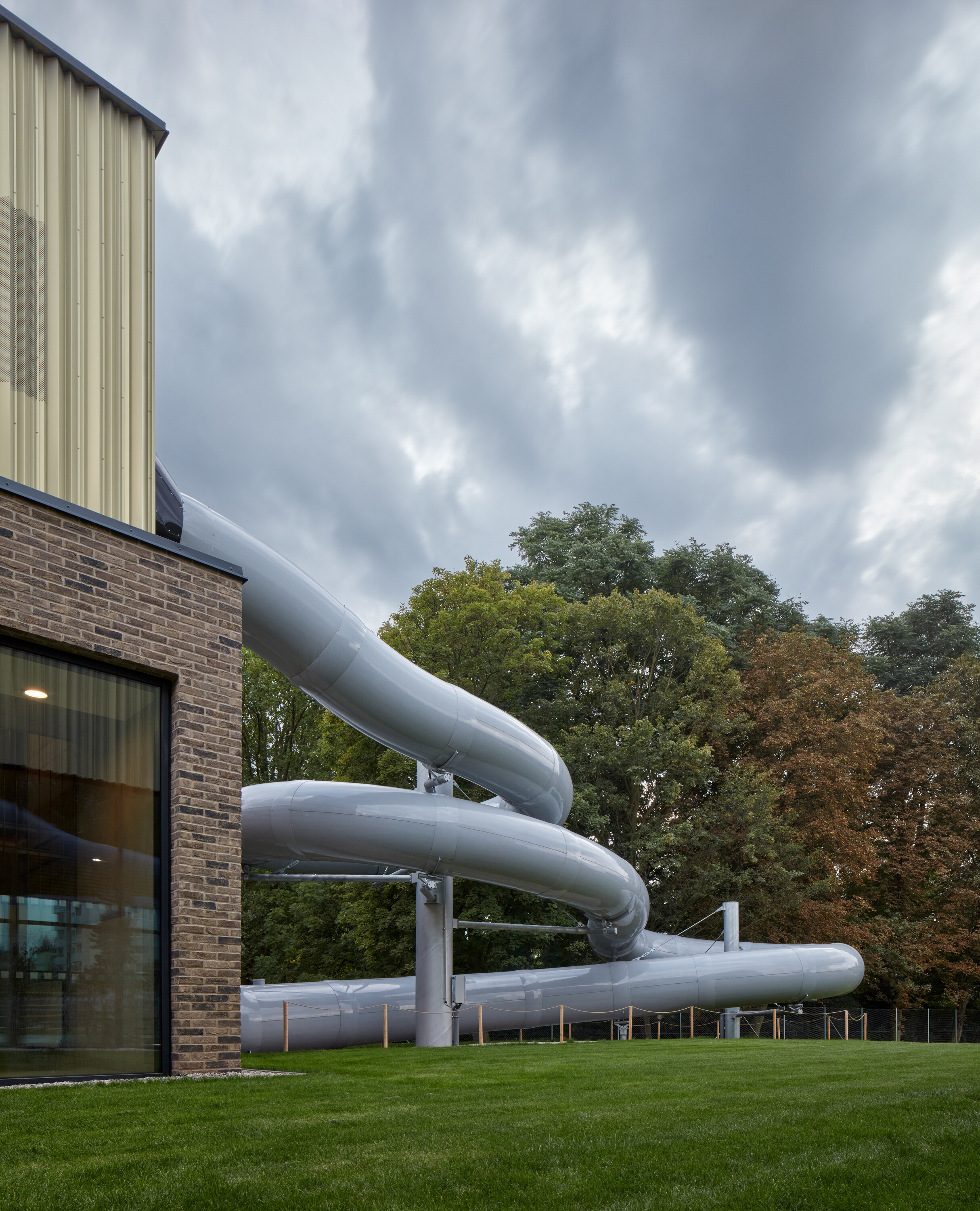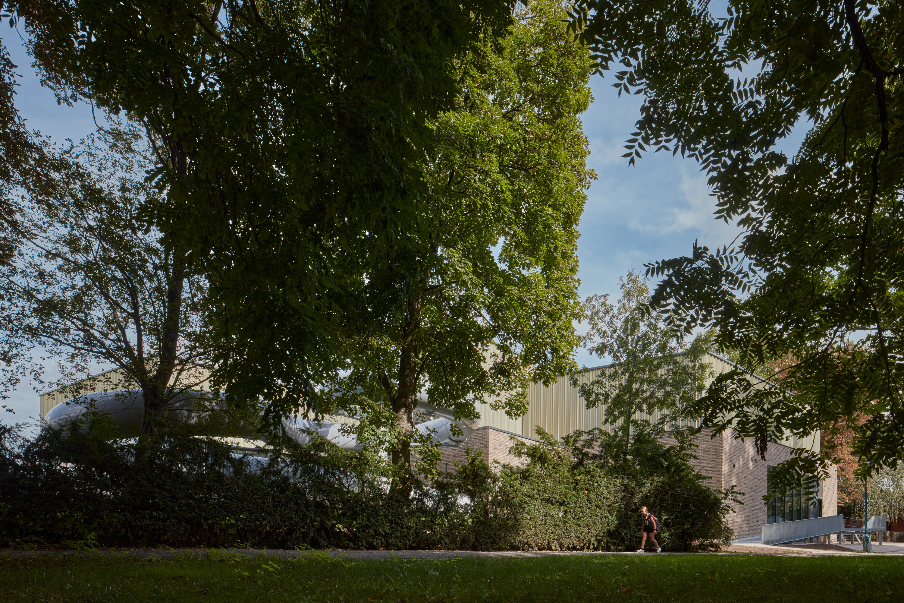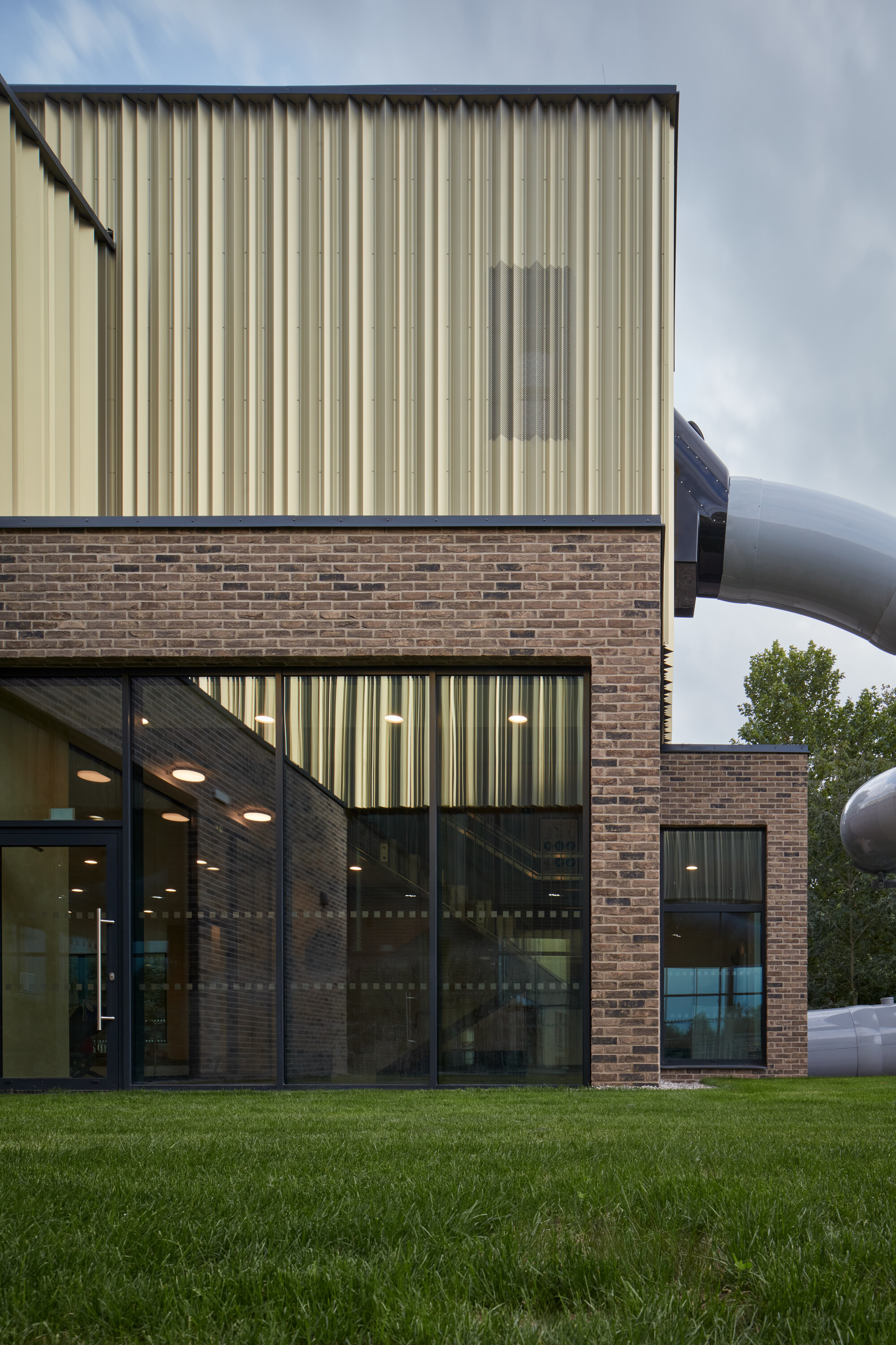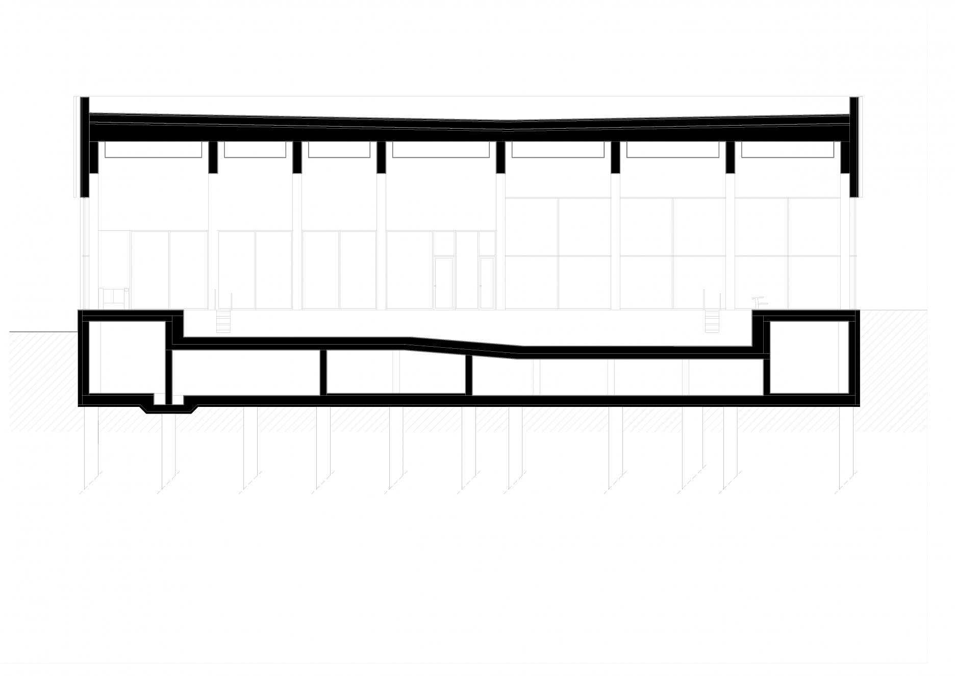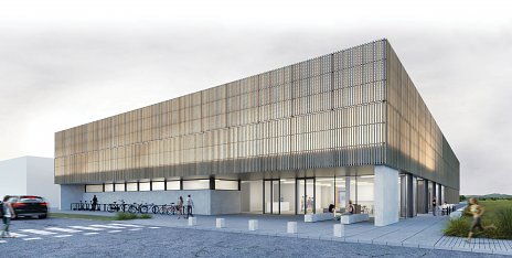 Objekt bazénovej haly stojí na vŕtaných pilótach s priemerom 600 mm. Vzhľadom na vysokú hladinu podzemnej vody tvorí spodnú stavbu monolitická biela vaňa z vodostavebného betónu Permacrete. Polia montovaného železobetónového skeletu nadzemnej časti vypĺňajú výmurovky. Kolmý trakt s plaveckým bazénom je opláštený CLT panelami s tepelnou izoláciou z minerálnej vlny. Pohľadovú vrstvu kontaktne zateplených stien na prízemí tvorí obklad z tehlových pásikov. Druhé poschodie má prevetrávanú fasádu s profilovaným plechom zlatej farby. Nad hydroizolačnou vrstvou strechy nájdeme pôdny substrát pre extenzívnu zeleň.