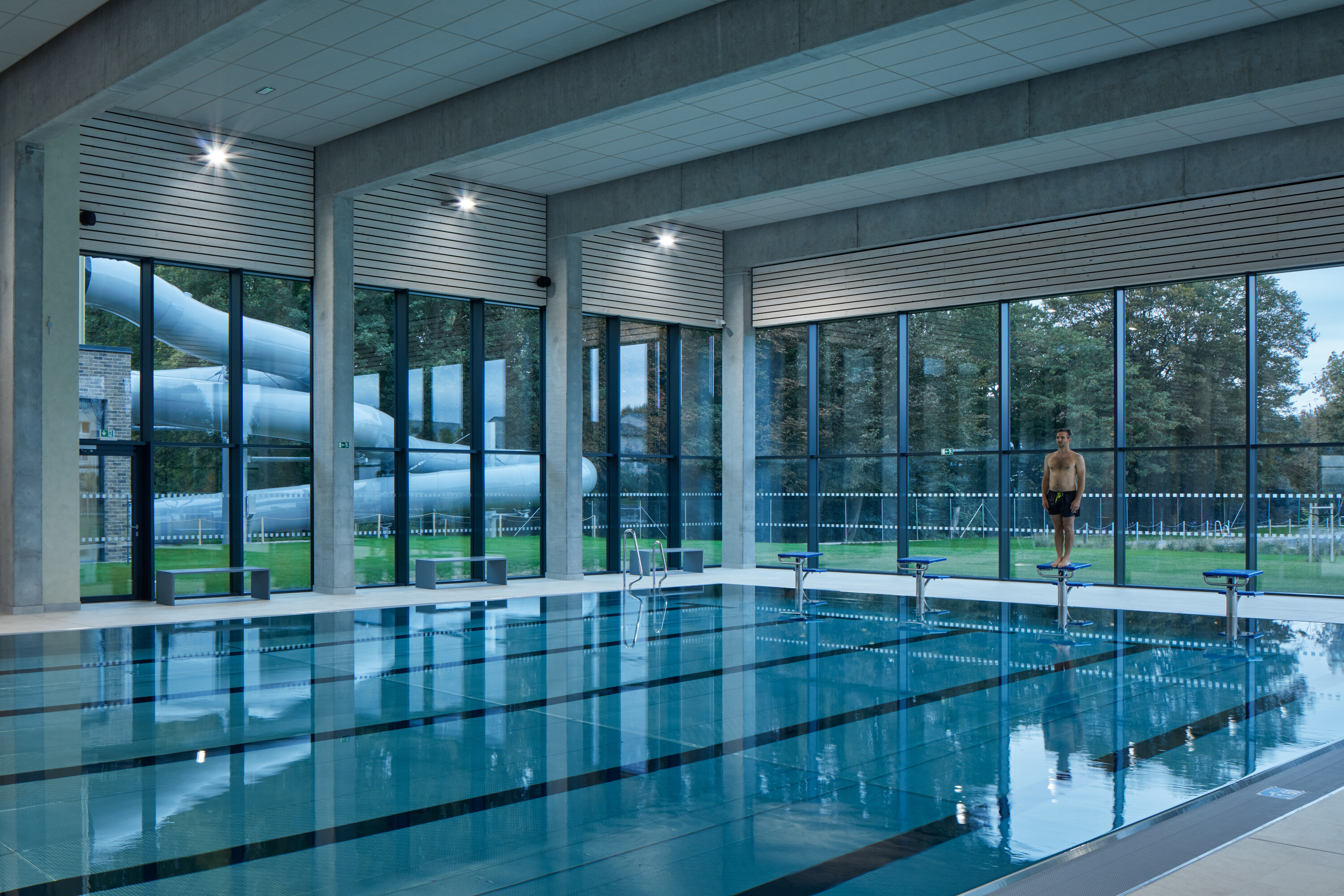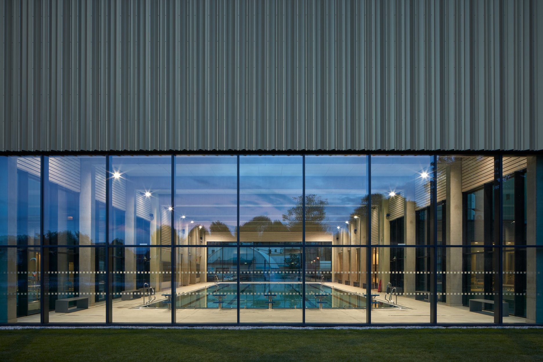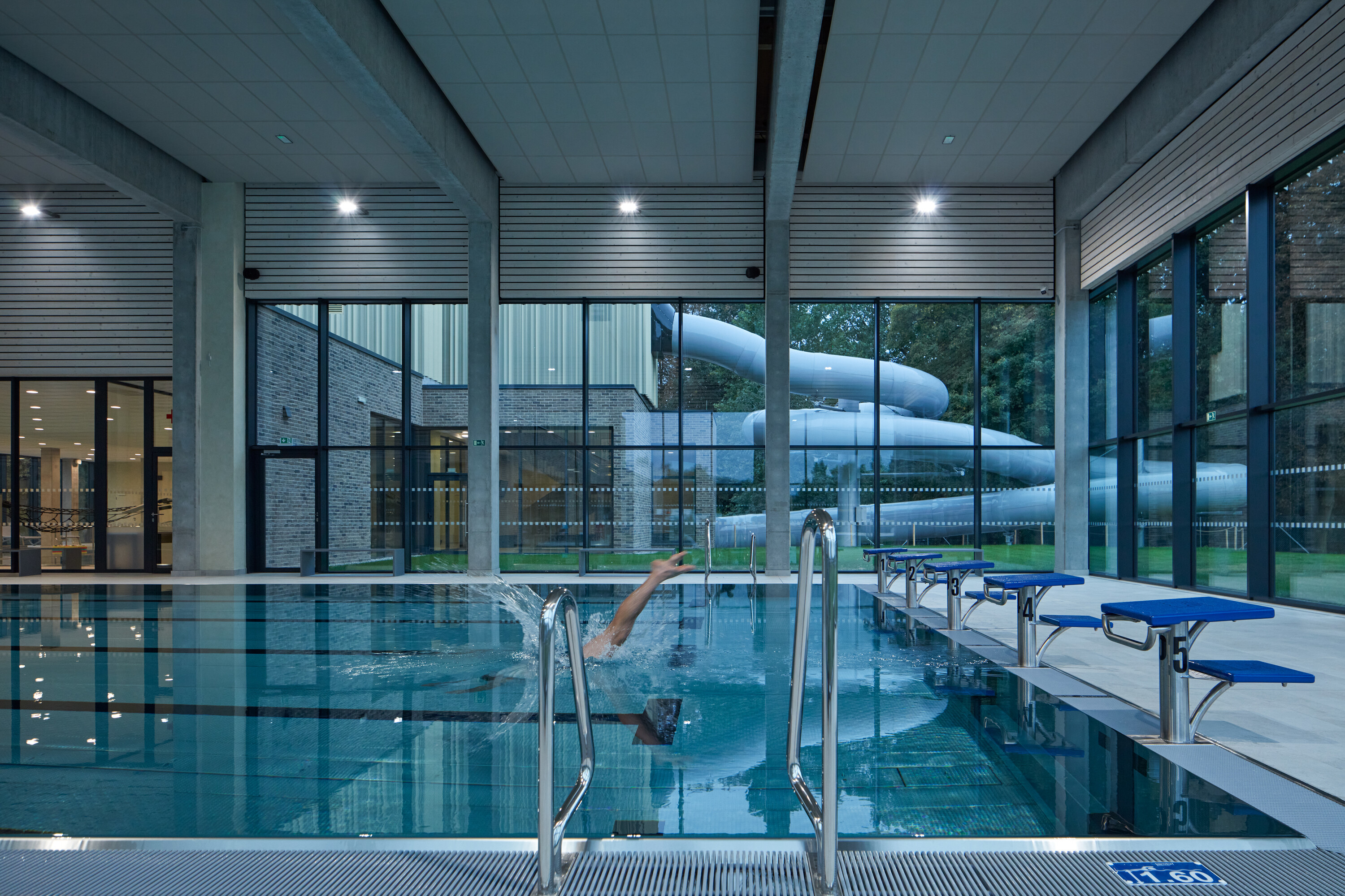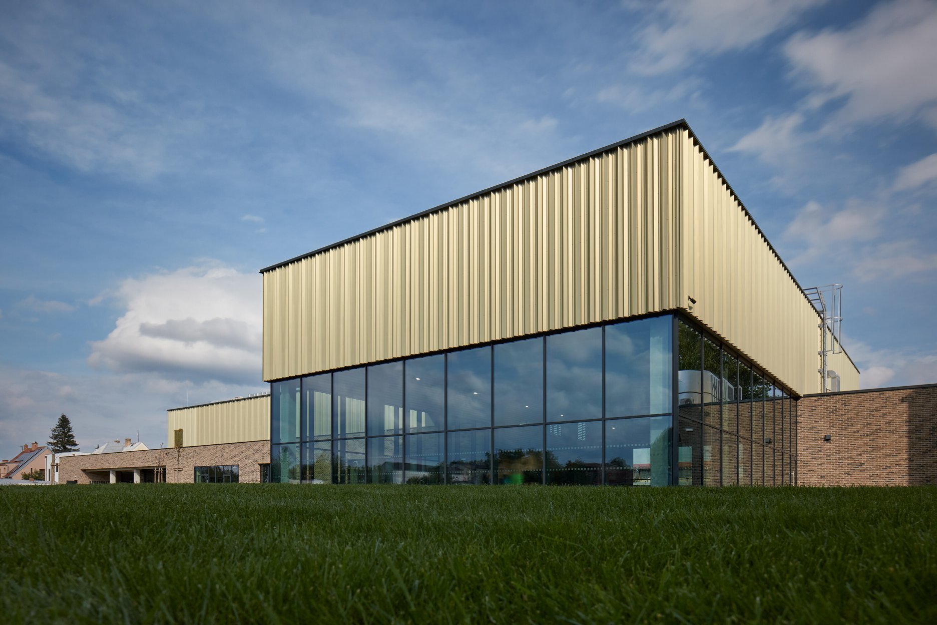 Krytý plavecký bazén z dĺžkou 25 metrov je voči pozdĺžnej osi objektu otočený o 90 stupňov. Kompozičné členenie objektu, vychádzajúce z jeho priestorovej logiky, zvýrazňuje materiálová skladba - obklad z tehlových pásikov a fasádny systém z profilovaných plechových šablón. Presklená fasáda kolmého traktu podporuje prepojenie bazénovej haly s vonkajším kúpaliskom.