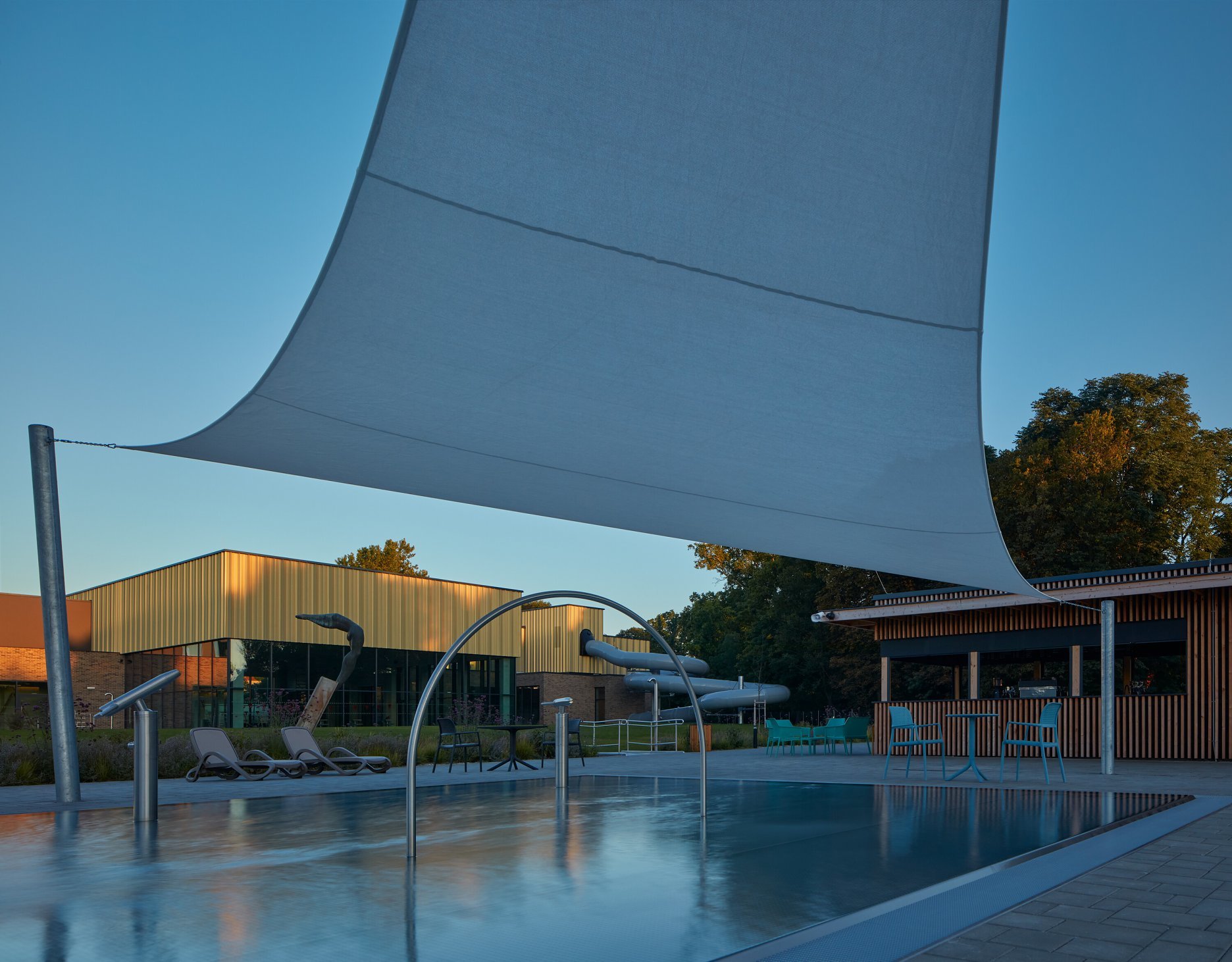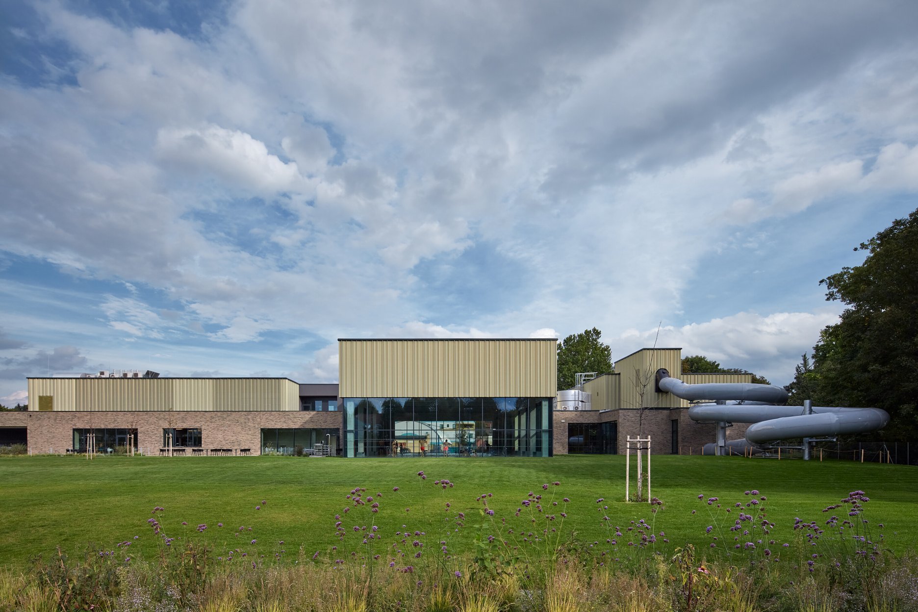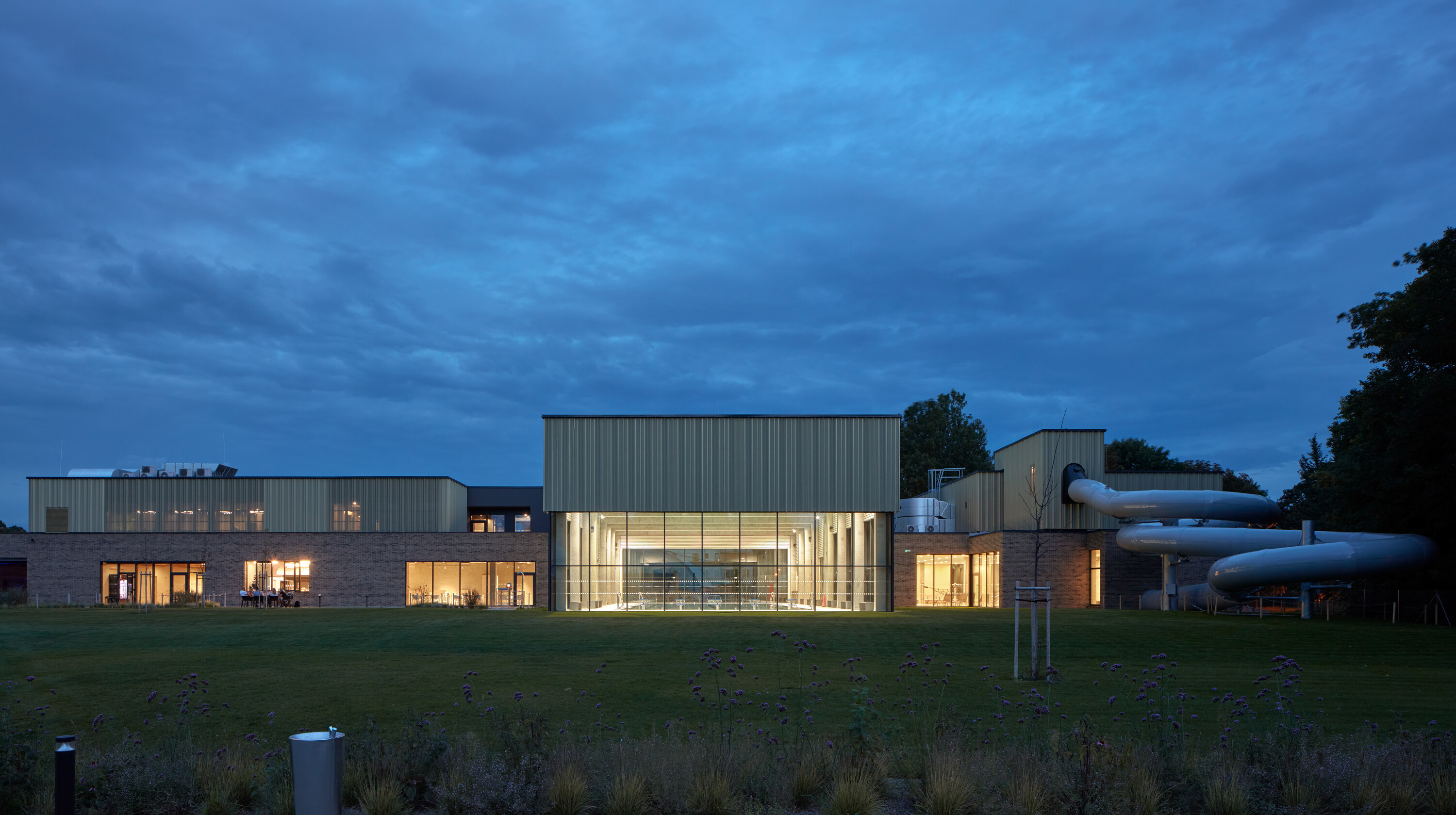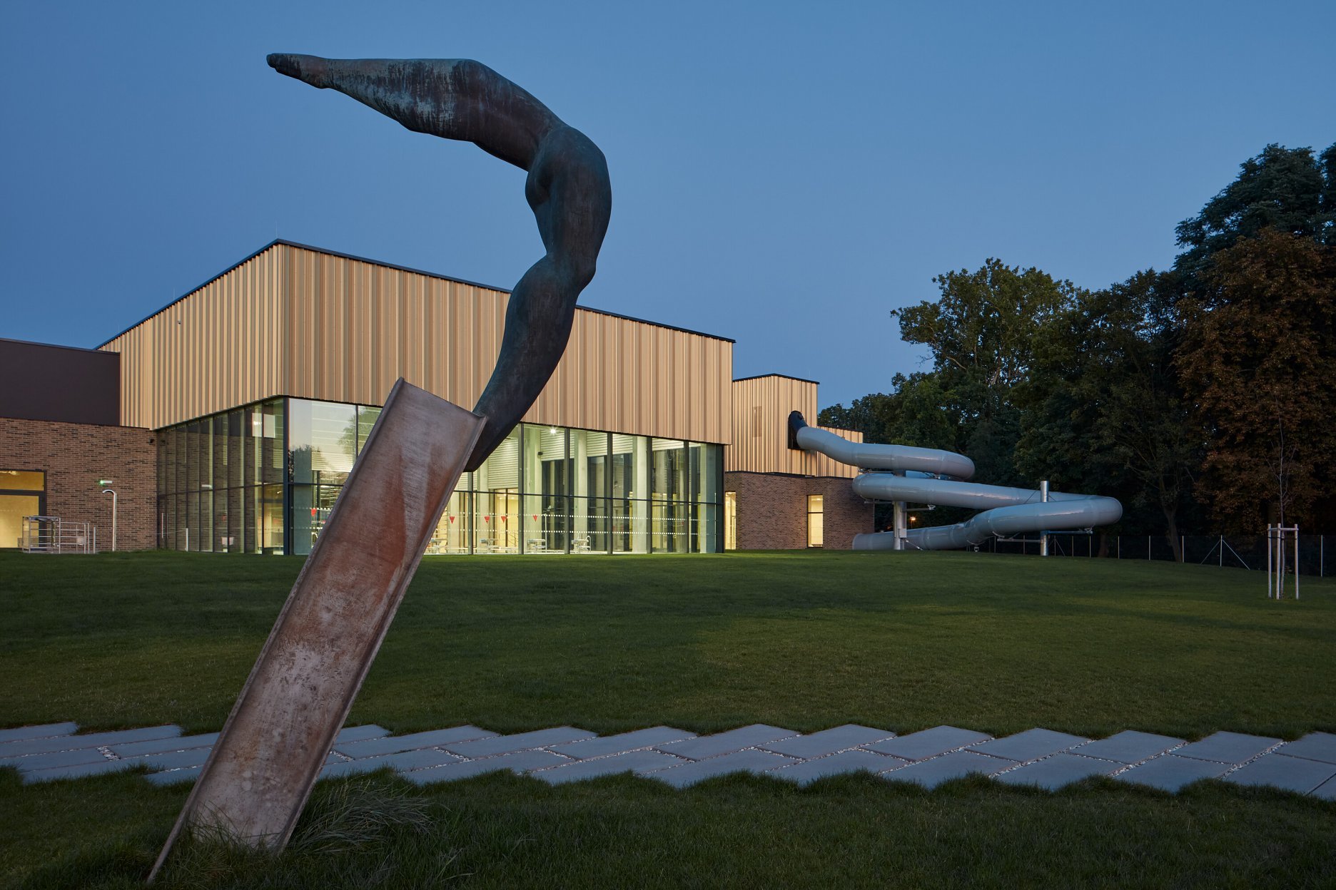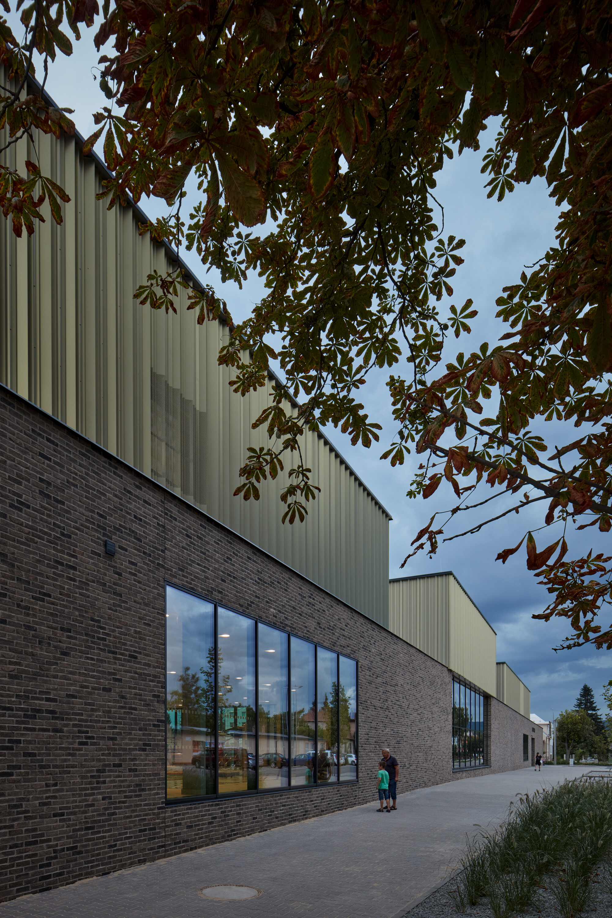Krytý plavecký bazén z dĺžkou 25 metrov je voči pozdĺžnej osi objektu otočený o 90 stupňov. Kompozičné členenie objektu, vychádzajúce z jeho priestorovej logiky, zvýrazňuje materiálová skladba - obklad z tehlových pásikov a fasádny systém z profilovaných plechových šablón. Presklená fasáda kolmého traktu podporuje prepojenie bazénovej haly s vonkajším kúpaliskom.
