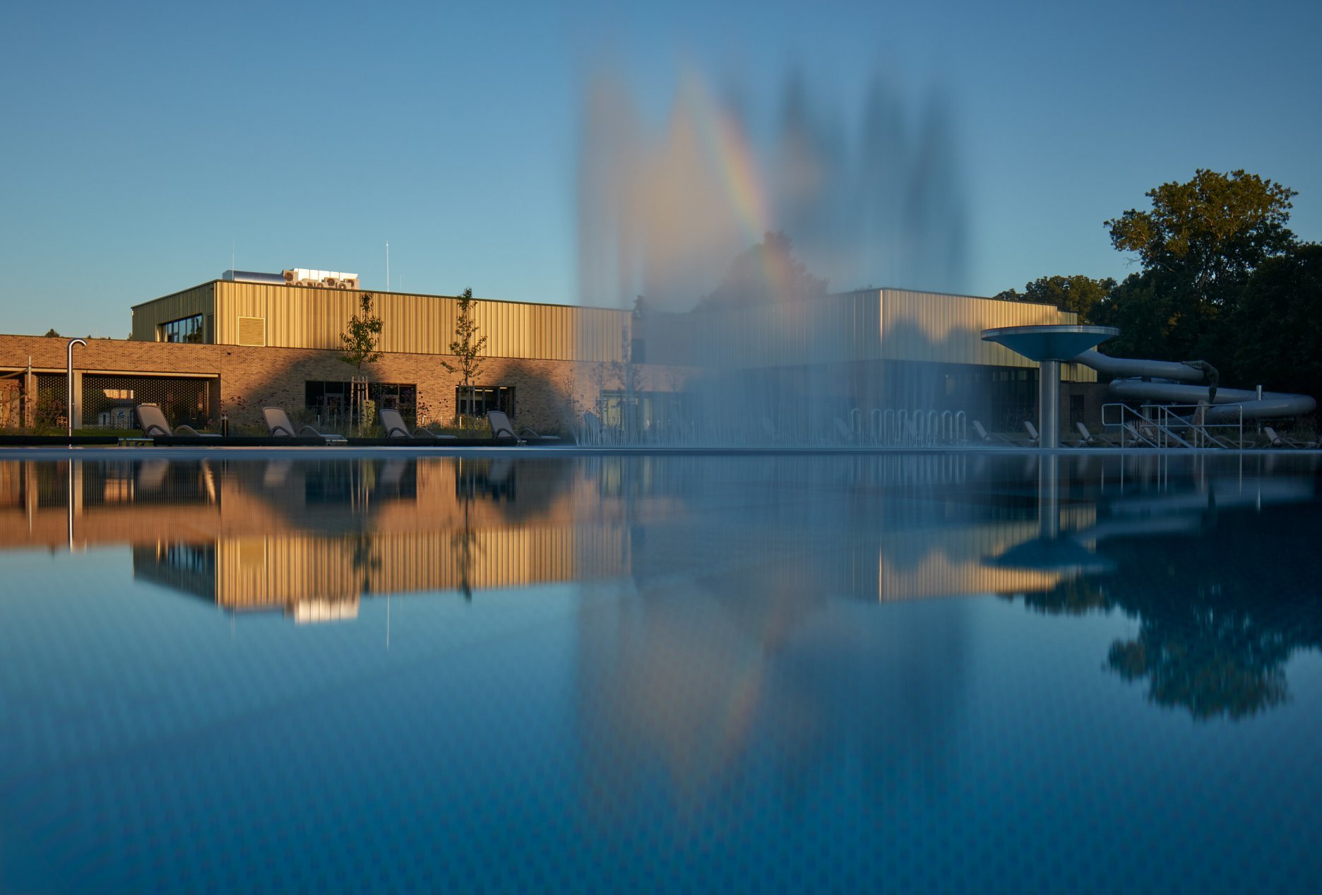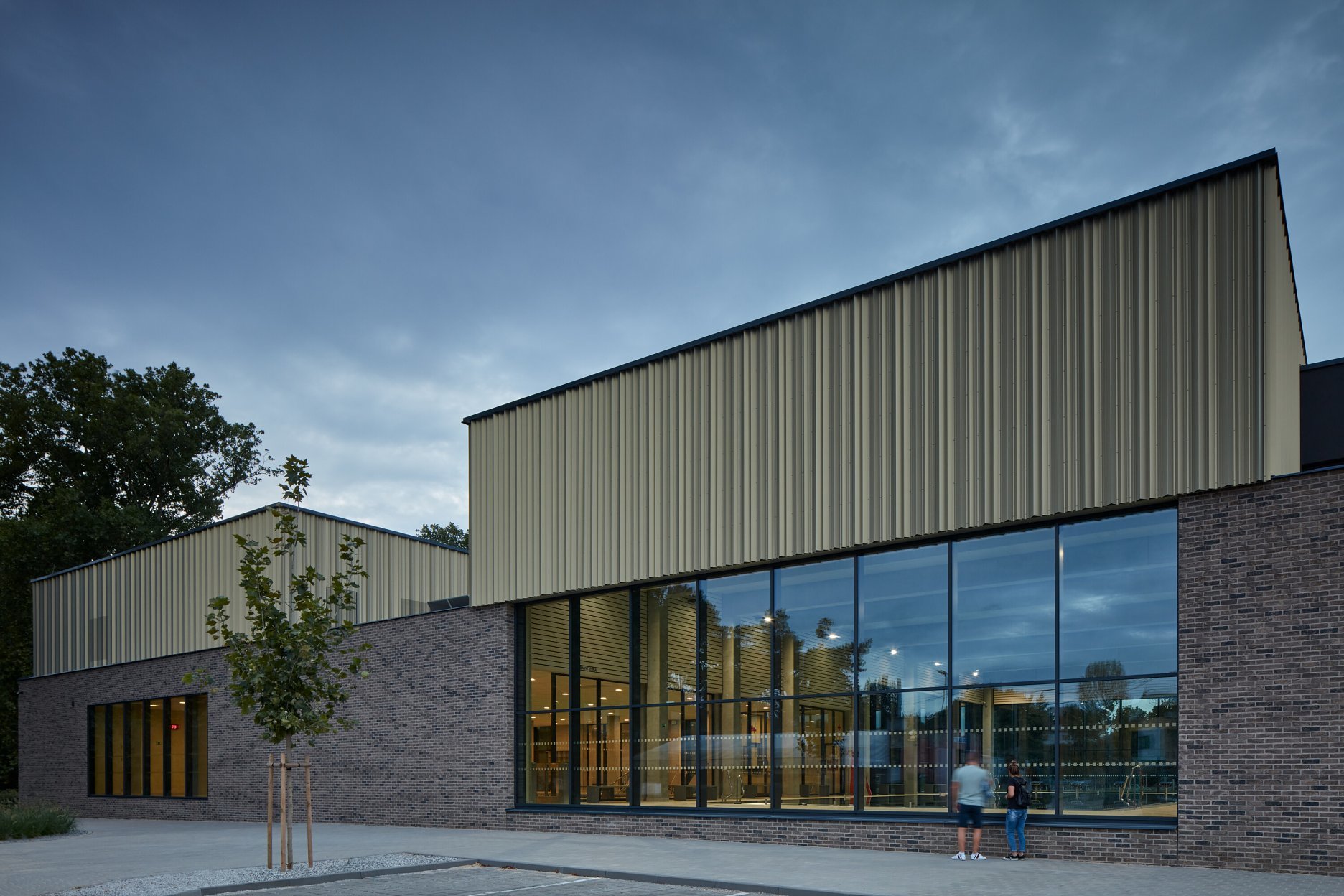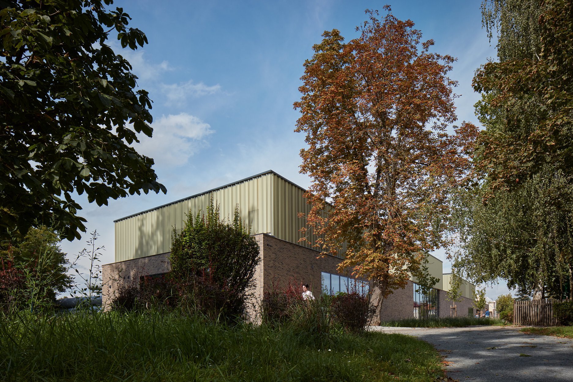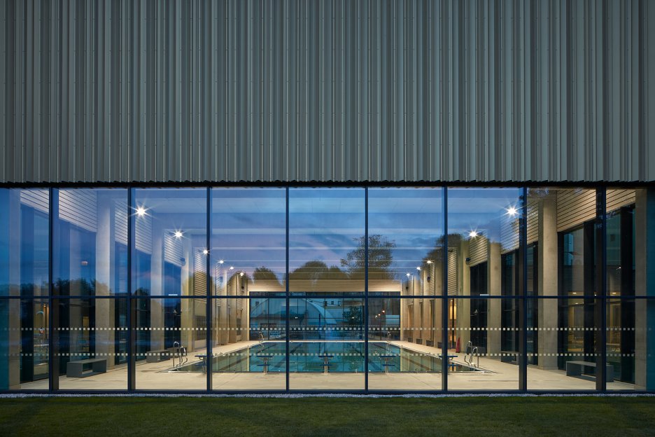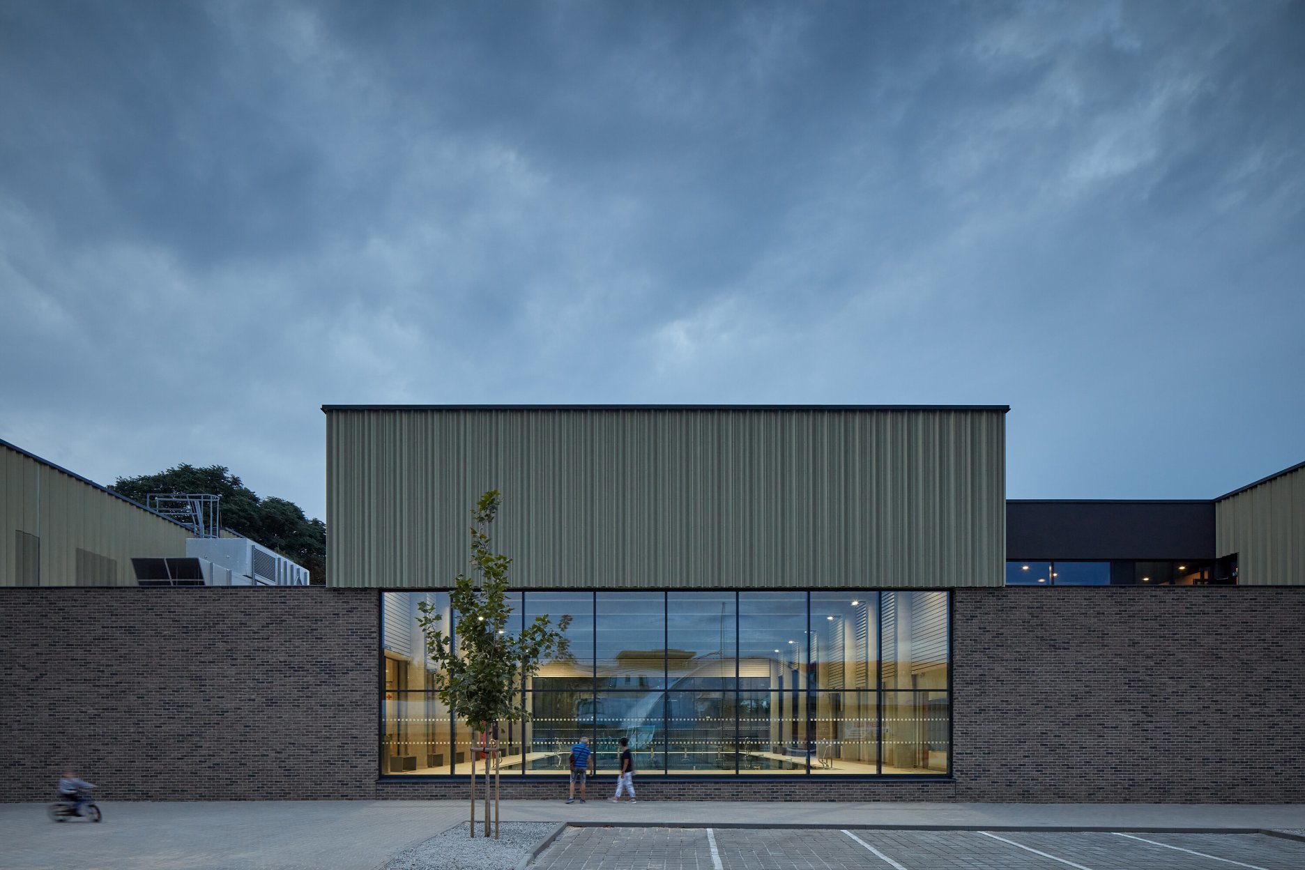 Krytý plavecký bazén z dĺžkou 25 metrov je voči pozdĺžnej osi objektu otočený o 90 stupňov. Kompozičné členenie objektu, vychádzajúce z jeho priestorovej logiky, zvýrazňuje materiálová skladba - obklad z tehlových pásikov a fasádny systém z profilovaných plechových šablón. Presklená fasáda kolmého traktu podporuje prepojenie bazénovej haly s vonkajším kúpaliskom.