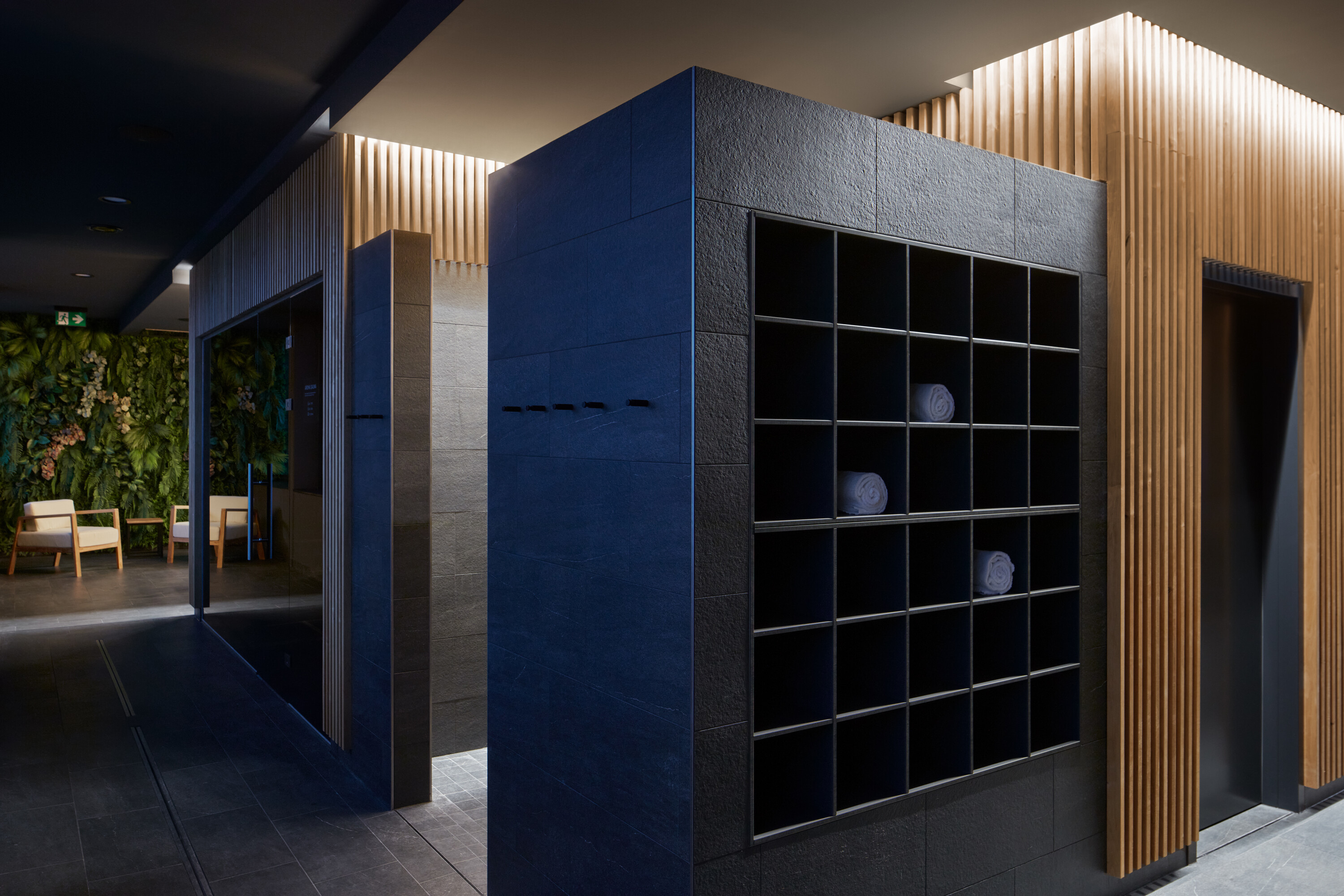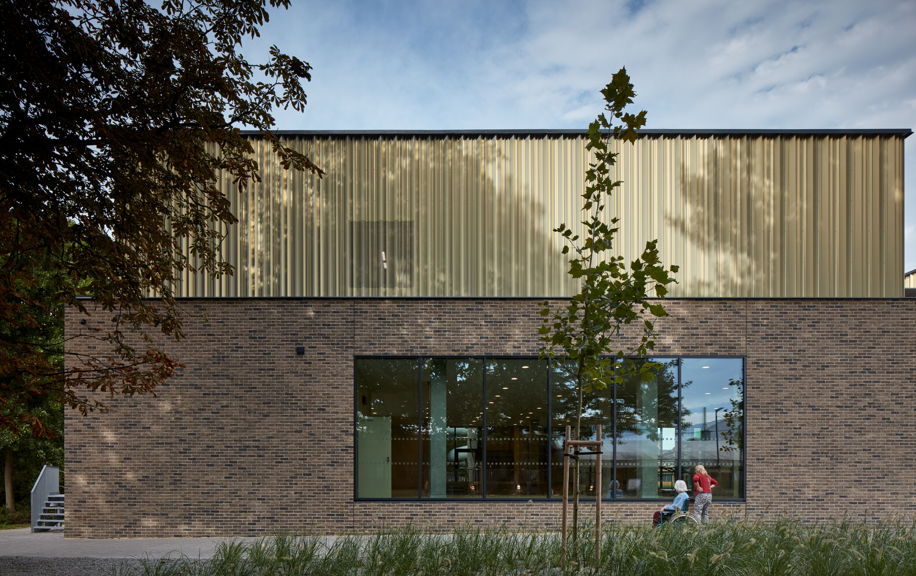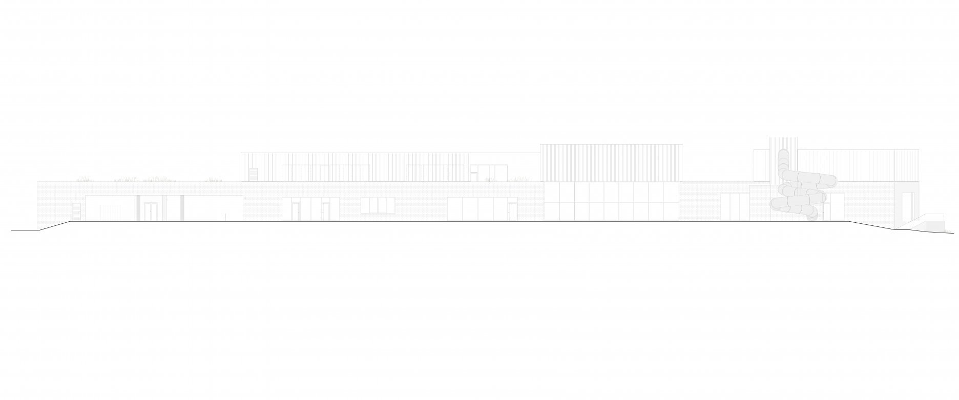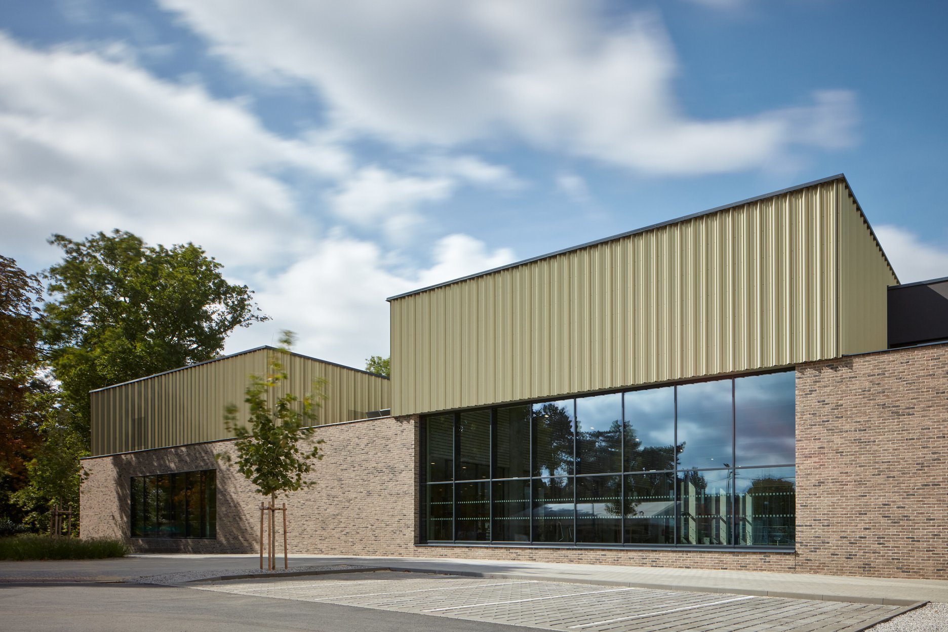 Krytý plavecký bazén z dĺžkou 25 metrov je voči pozdĺžnej osi objektu otočený o 90 stupňov. Kompozičné členenie objektu, vychádzajúce z jeho priestorovej logiky, zvýrazňuje materiálová skladba - obklad z tehlových pásikov a fasádny systém z profilovaných plechových šablón. Presklená fasáda kolmého traktu podporuje prepojenie bazénovej haly s vonkajším kúpaliskom.