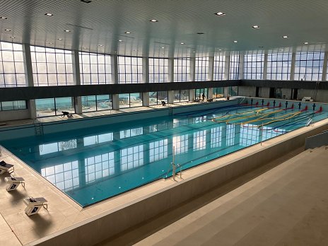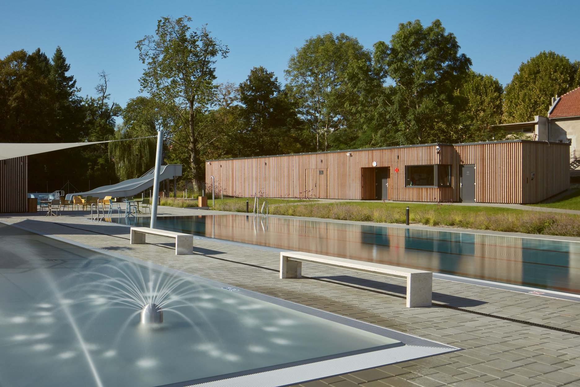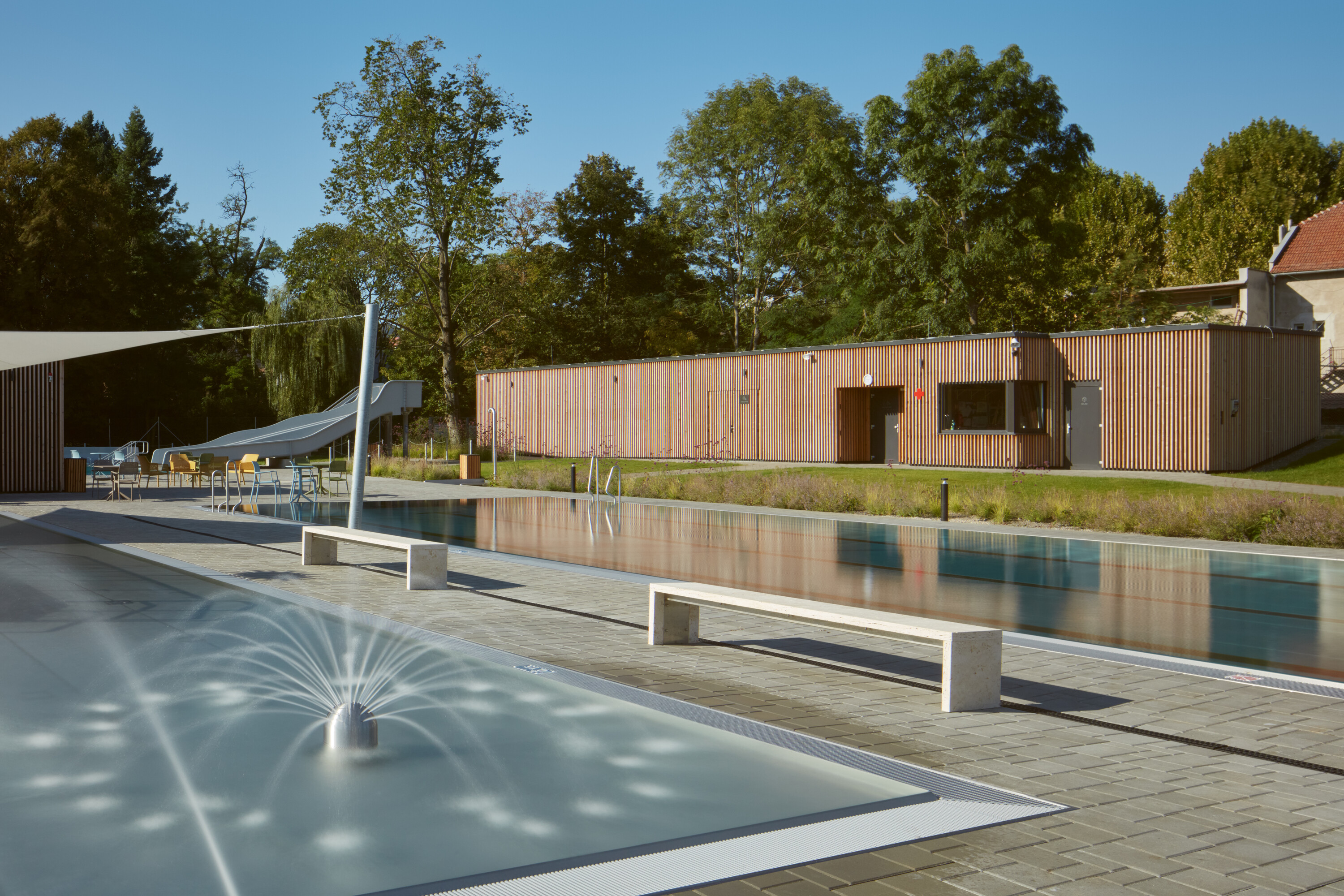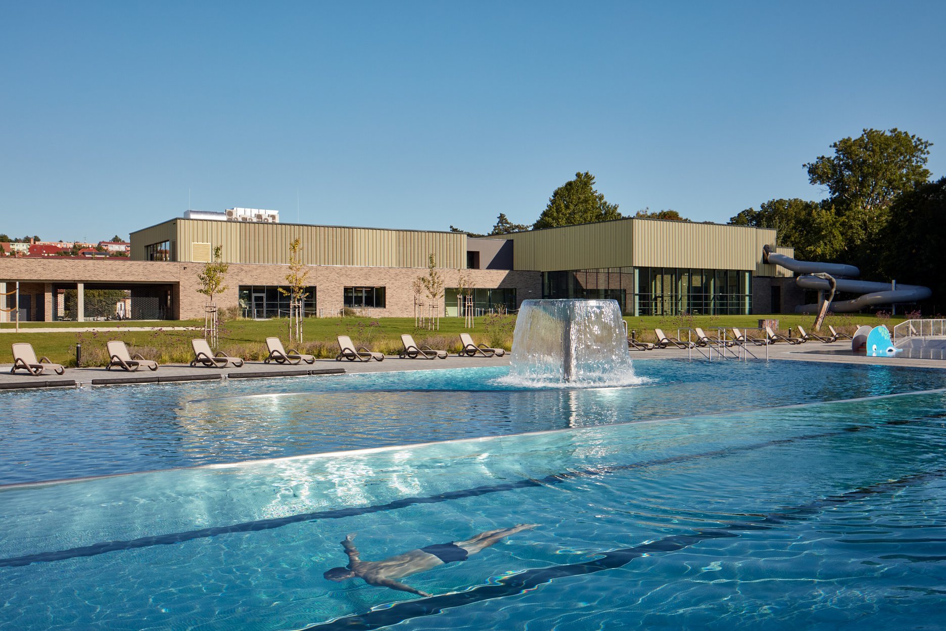 Nedávno dokončená rekonštrukcia okrem prestavby vonkajších bazénov zahŕňa tiež výstavbu bazénovej haly, ktorá zabezpečuje celoročné športové a relaxačné vyžitie areálu v kontakte s parkom. Nový lineárny objekt plynie pozdĺž ulice Mezivodí. V rámci revitalizácie predpolia stavby, ktorým prechádza hlavná mestská pešia a cyklistická trasa, bola obnovená alej a doplnený mobiliár. Návštevníci bazéna aj okoloidúci si tak môžu v lete vychutnať kávu na jednej z vonkajších terás, prístupnej z centrálnej haly.