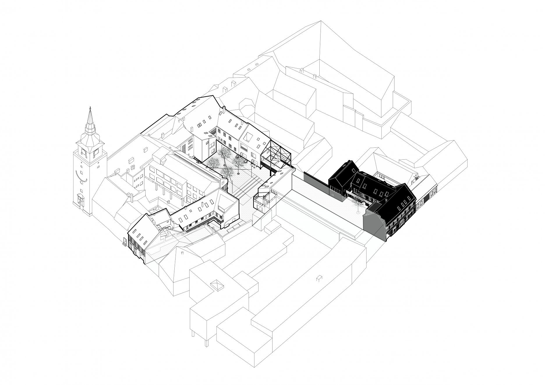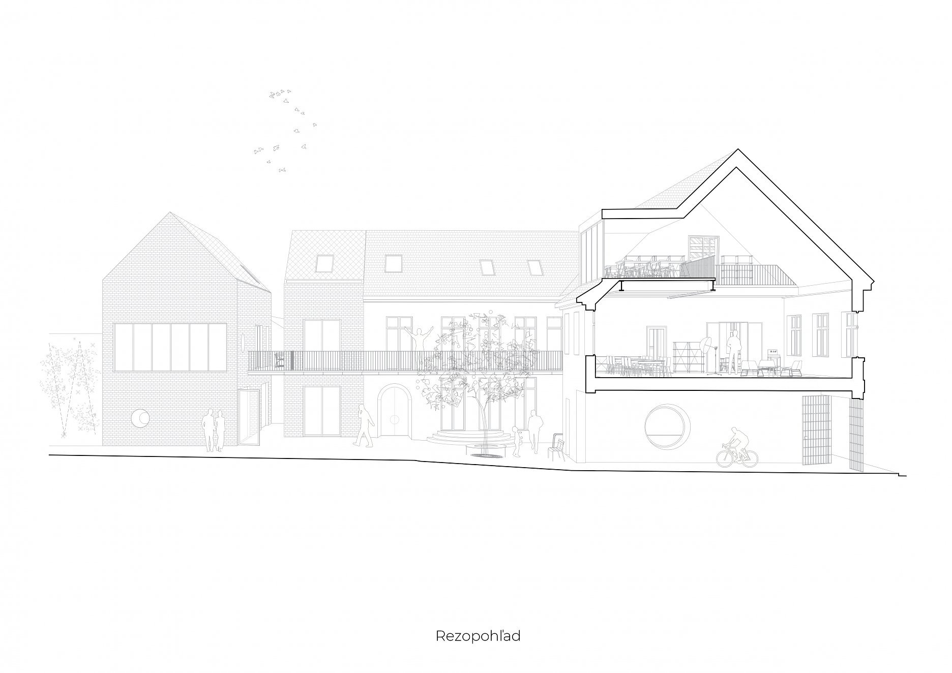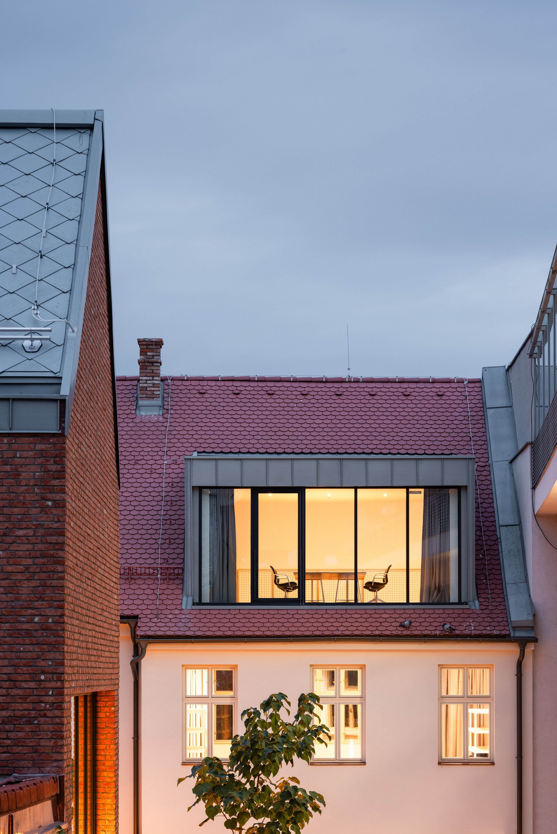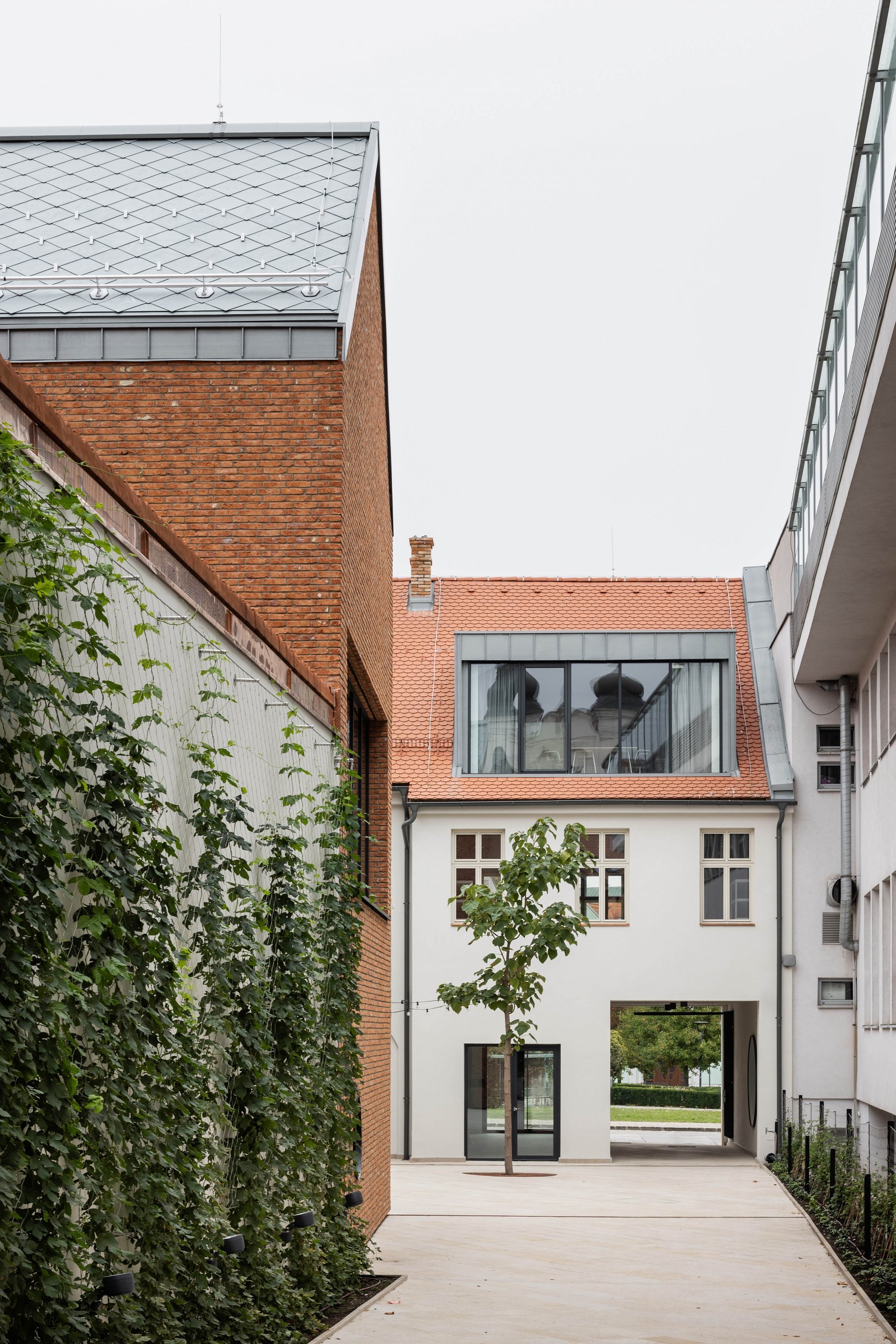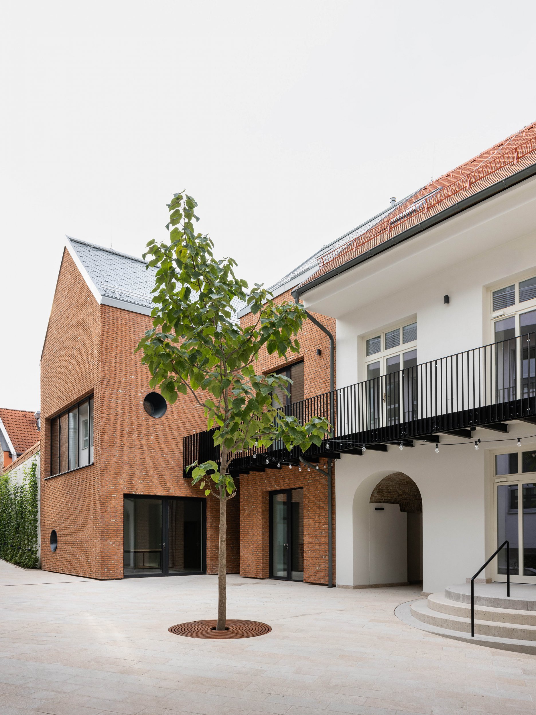 Novú časť tvorí kompozícia hmôt dostavby a priečneho dvorového krídla v pôvodnej pôdorysnej stope predošlej zástavby. Priebežná pavlač je tomto prípade použitá ako spoločná komunikácia, ktorá vizuálne oddeľuje jednotlivé hmoty.