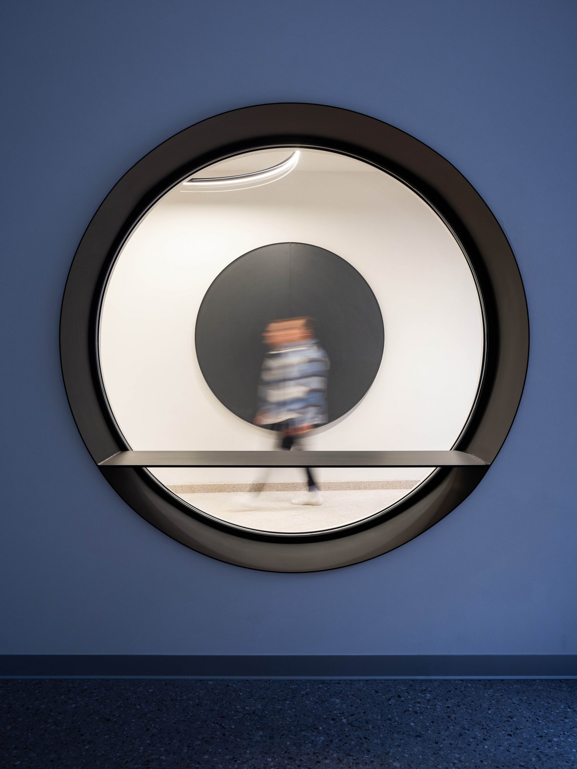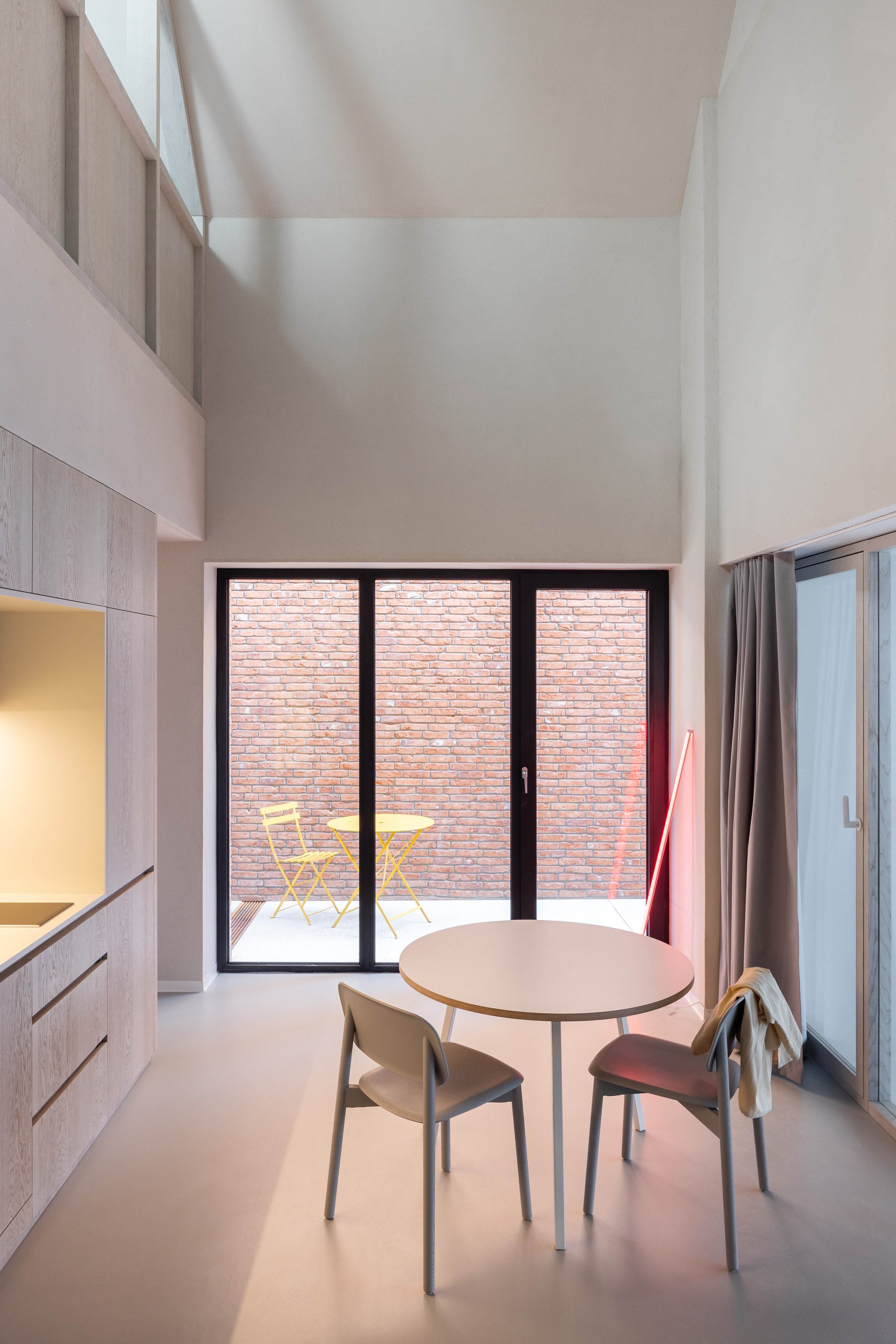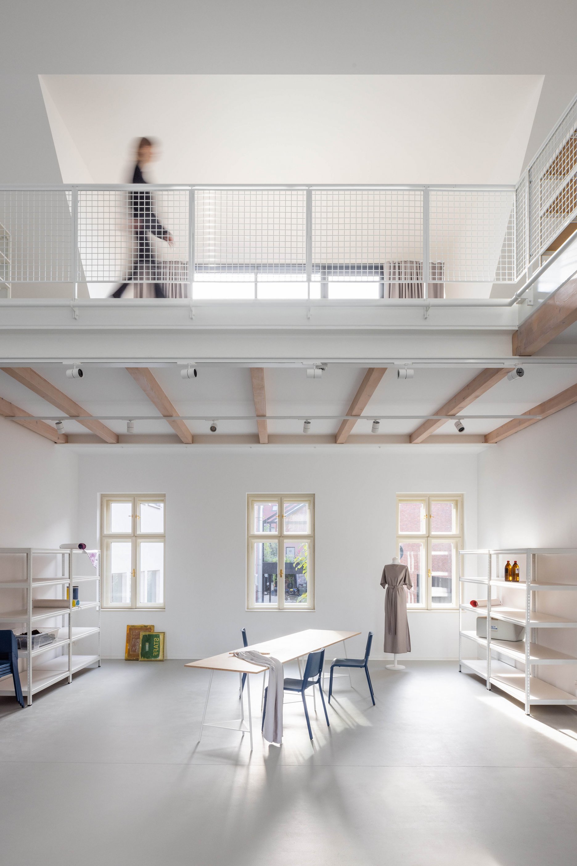 Na ďalšom podlaží sa nachádza hlavná zóna zázemia ateliéru, ktorá je prístupná z pavlače domu. Vizuálne je tento otvorený dvojpodlažný priestor prepojený s ateliérom. Na mezaníne, prístupnom interiérovým schodiskom, sa nachádza oddychová zóna zázemia.