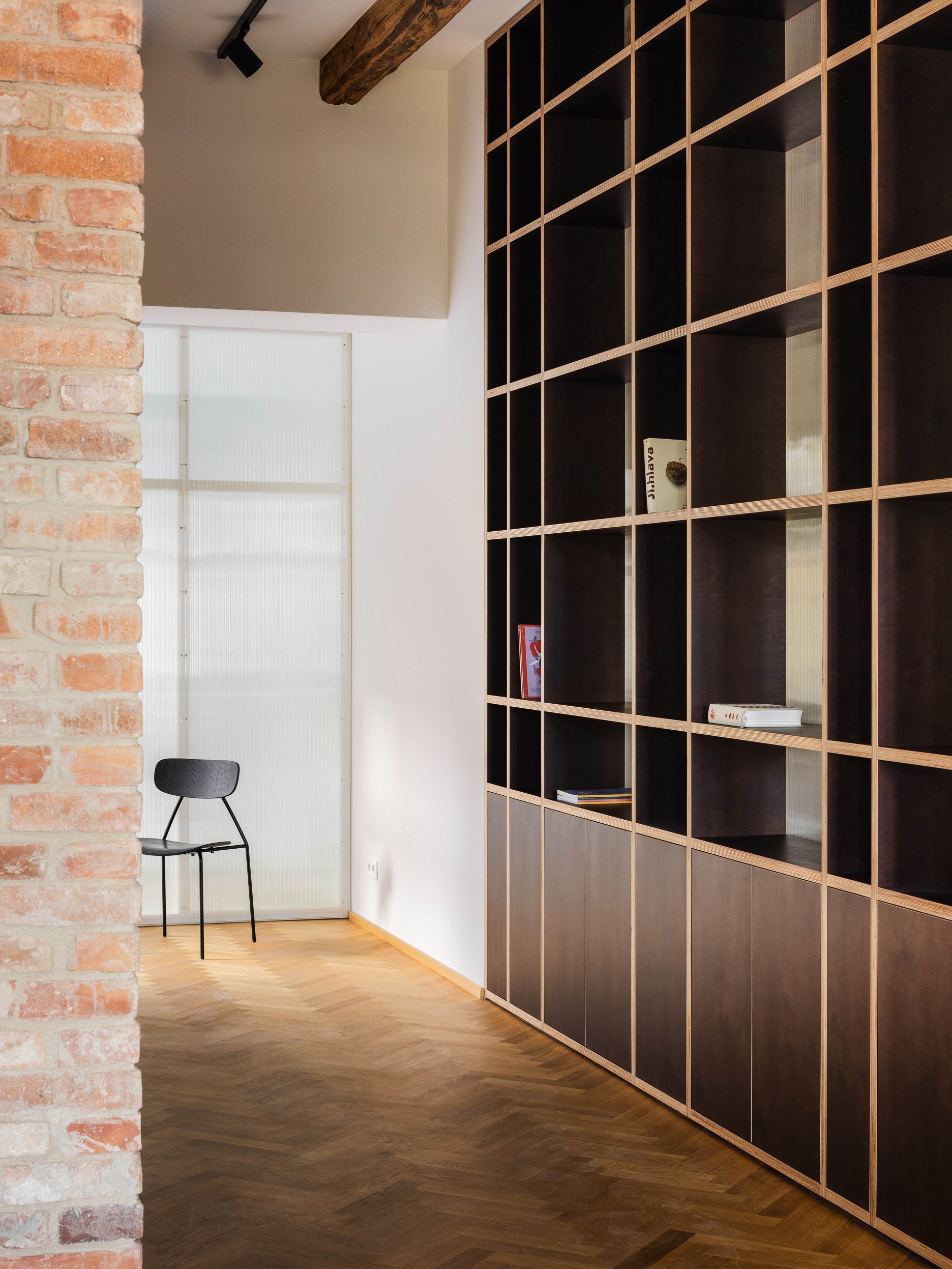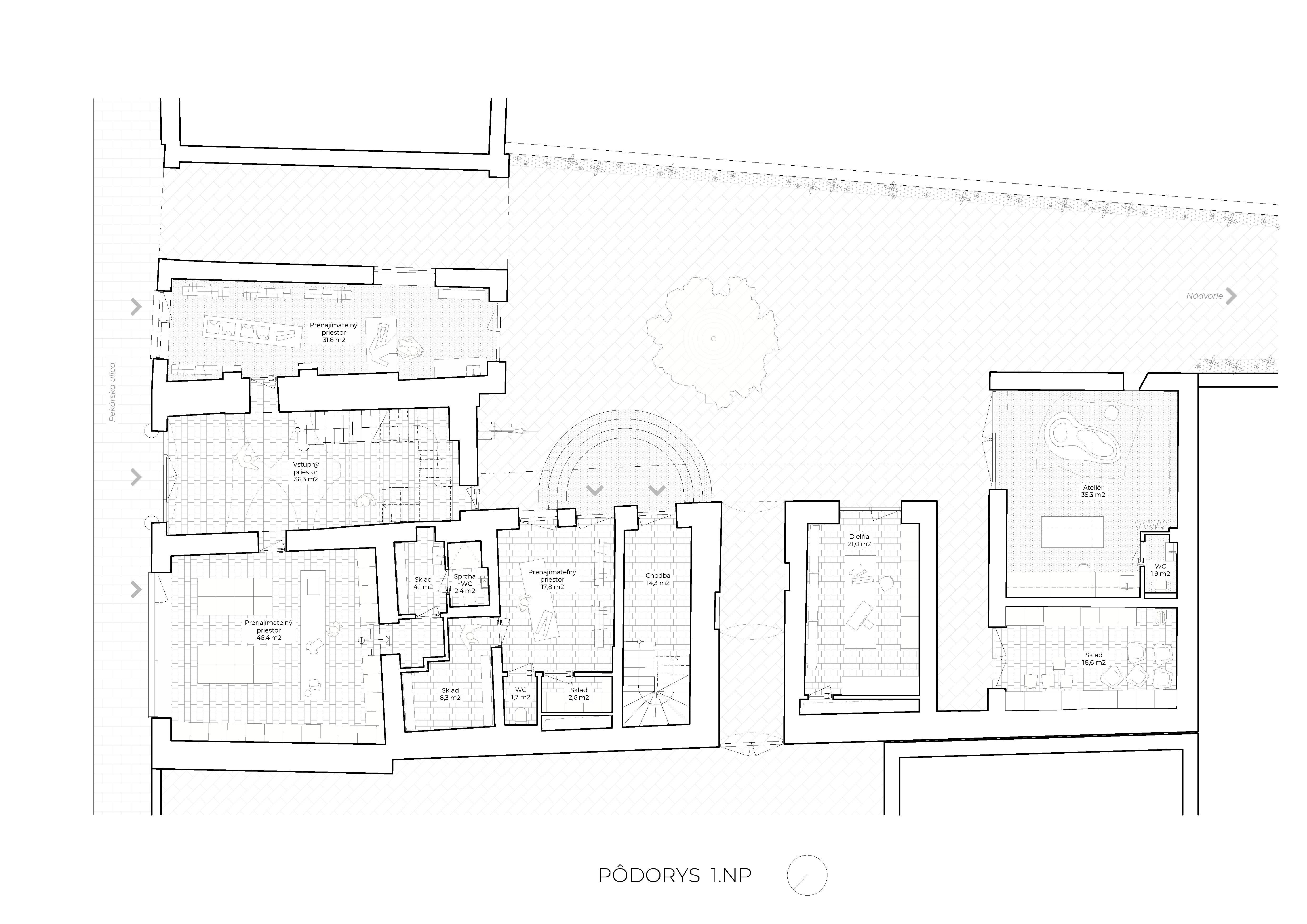 Toto zjednotenie prebiehalo takisto aj v dispozičnom riešení, kde boli obe časti navzájom prepojené. Okrem prenajímateľných priestorov ako aktívneho partru bol v prízemí umiestnený pop-up priestor kreatívneho centra, ktorý sa otvára do pasáže prejazdu veľkorysým oknom ako parafráza pôvodných historických priehľadov prízemnej miestnosti do dvora.