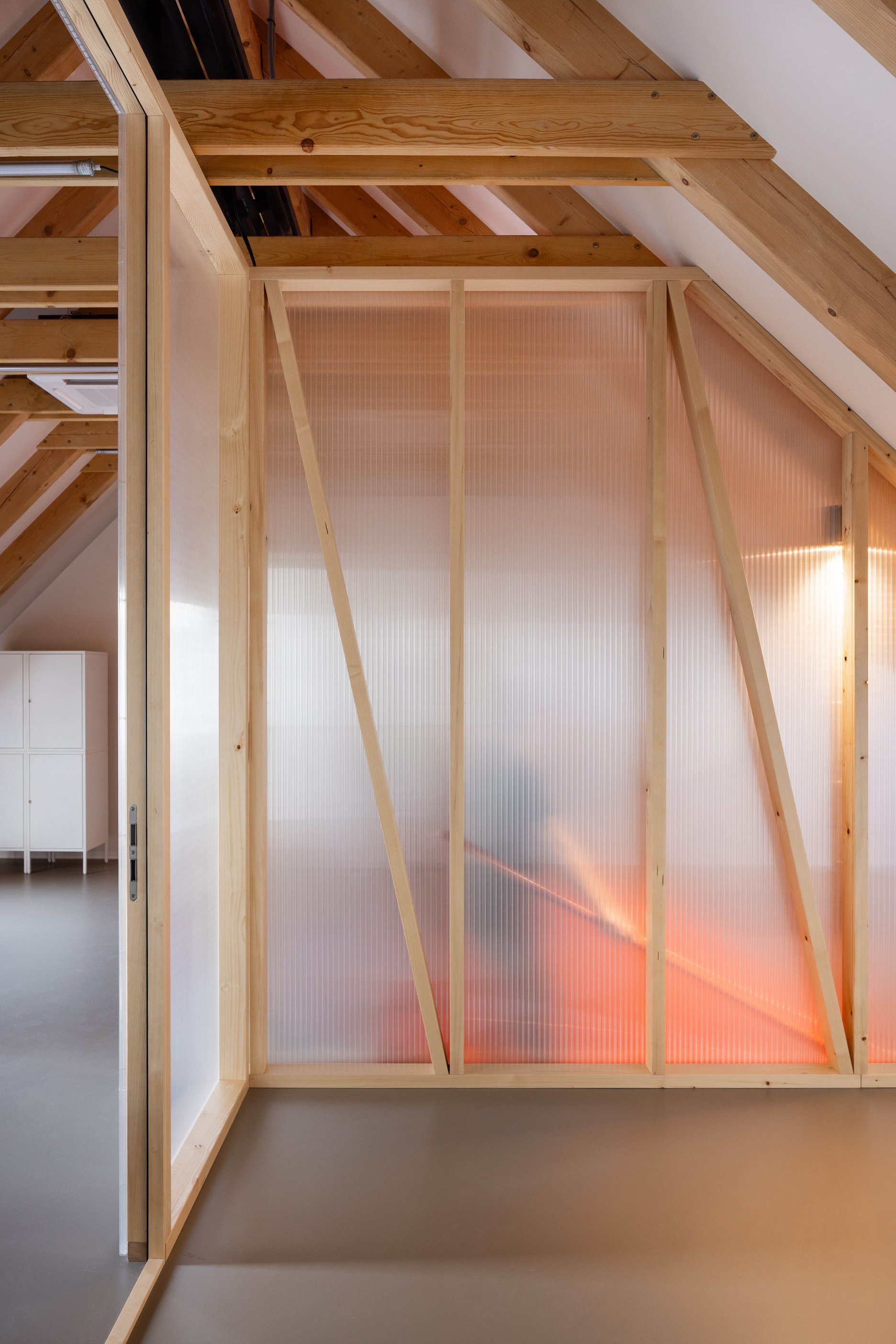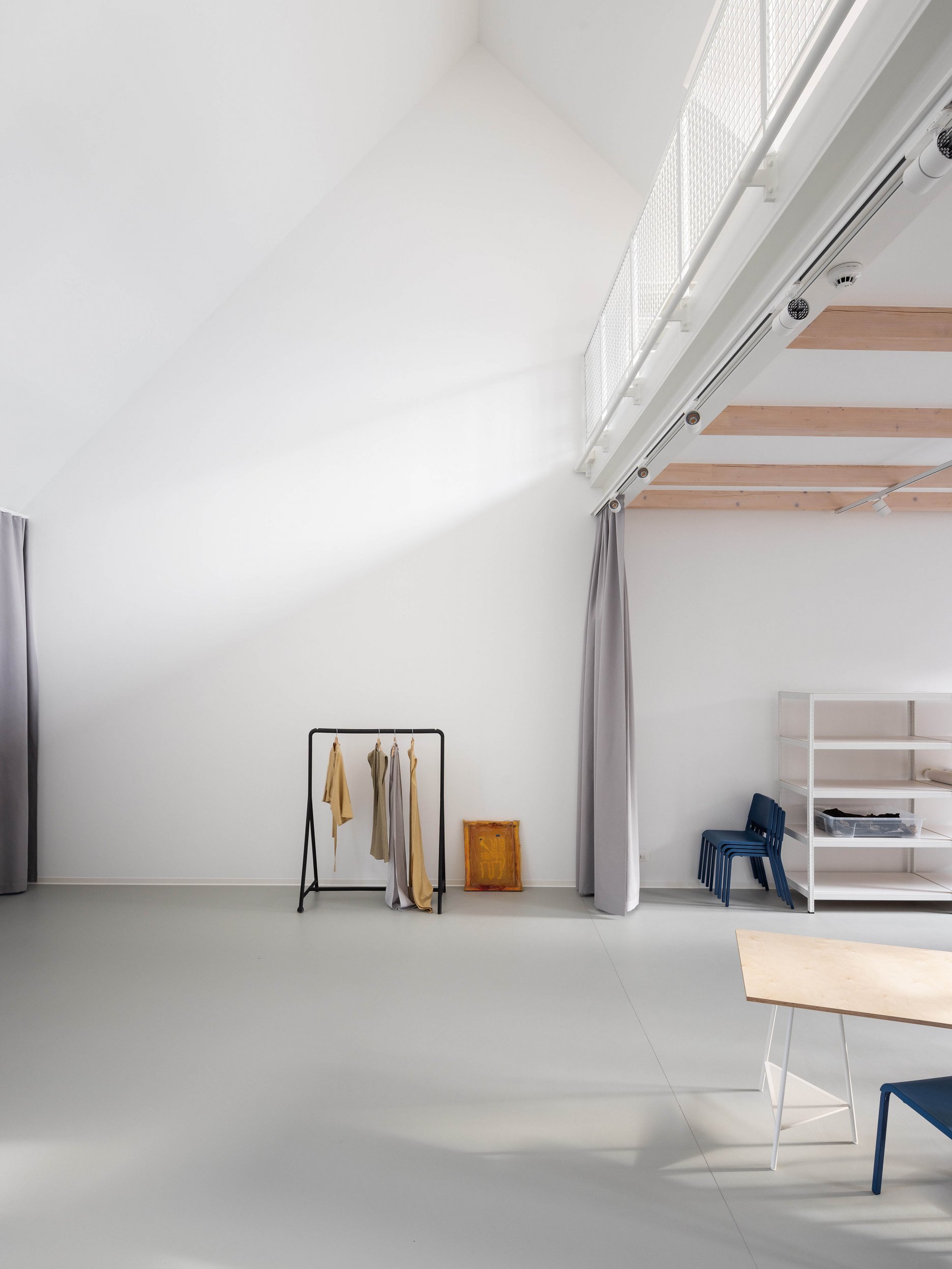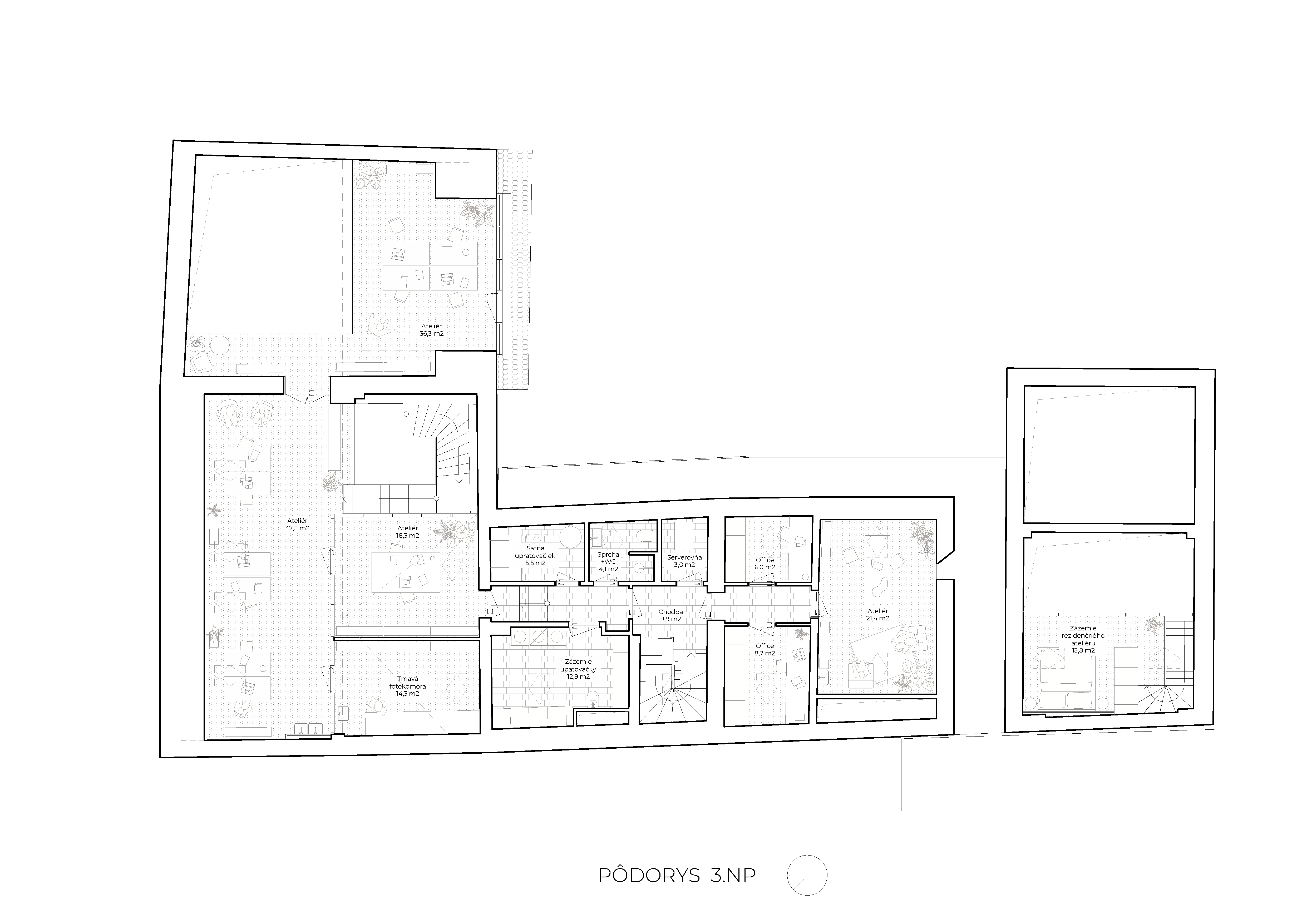Novým vstupom bolo využitie podkrovia ako zdieľaného ateliéru. To bolo zabezpečené vložením pokračovania otvoreného schodiska v podobe oceľového novotvaru. V priestoroch novej časti uličného krídla bol vytvorený dvojpodlažný priestor s mezanínom určený pre fotoateliér. Ustúpené podlažie v priestore vikiera orientovaného do dvora funguje ako rozšírenie zdieľaného ateliéru. Podkrovný ateliér je okrem oddelenej malej dielne vybavený tmavou komorou.