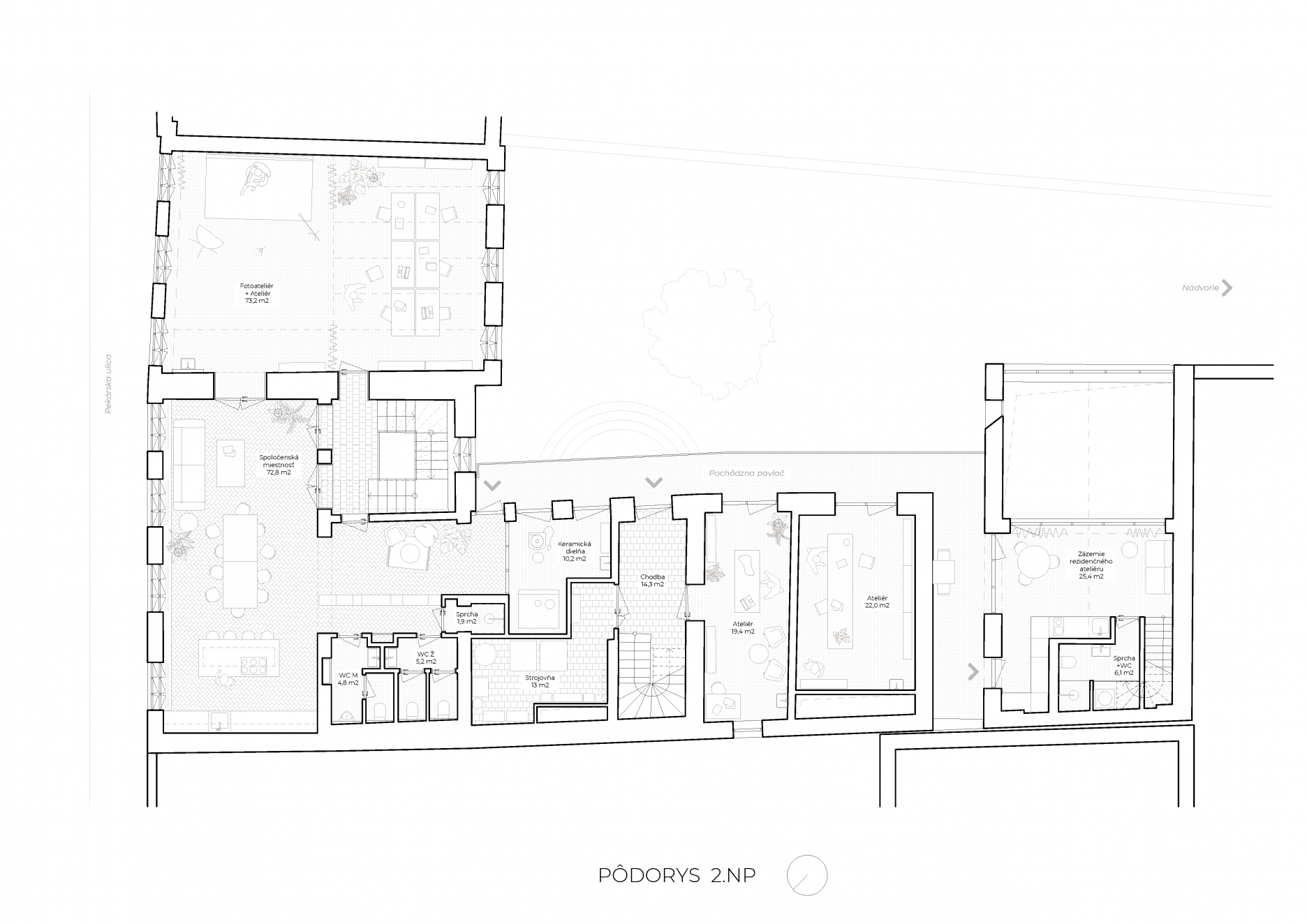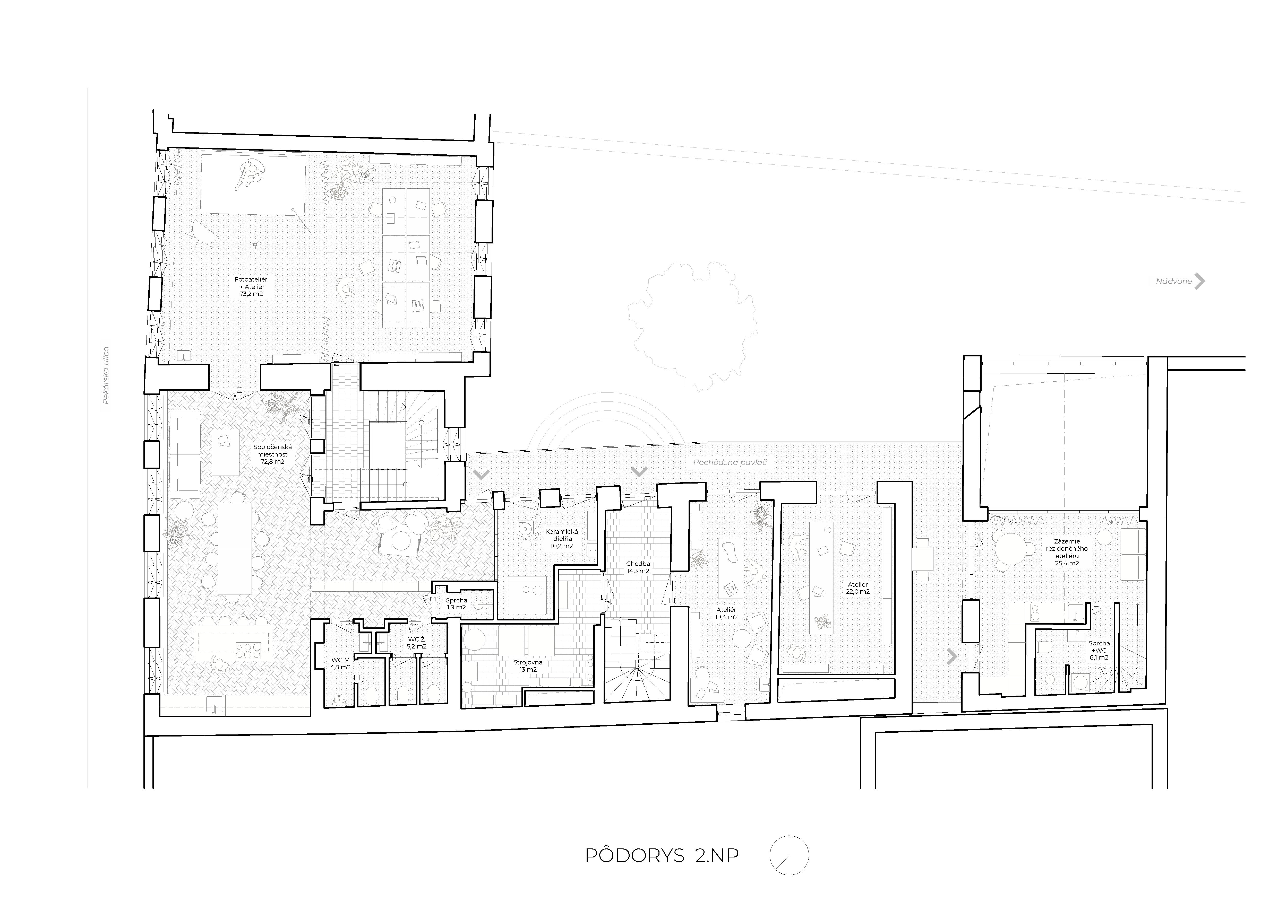 Kľúčovým priestorom je klubovňa kreatívneho centra, ktorý sa nachádza v strede uličného krídla na druhom nadzemnom podlaží. Multifunkčný priestor je vybavený flexibilným mobiliárom a umožňuje viacero scenárov využitia. Vstupná časť s knižnicou sprístupňuje novú pavlač v dvorovom krídle, ktorá je hlavným prístupom individuálnych ateliérov.