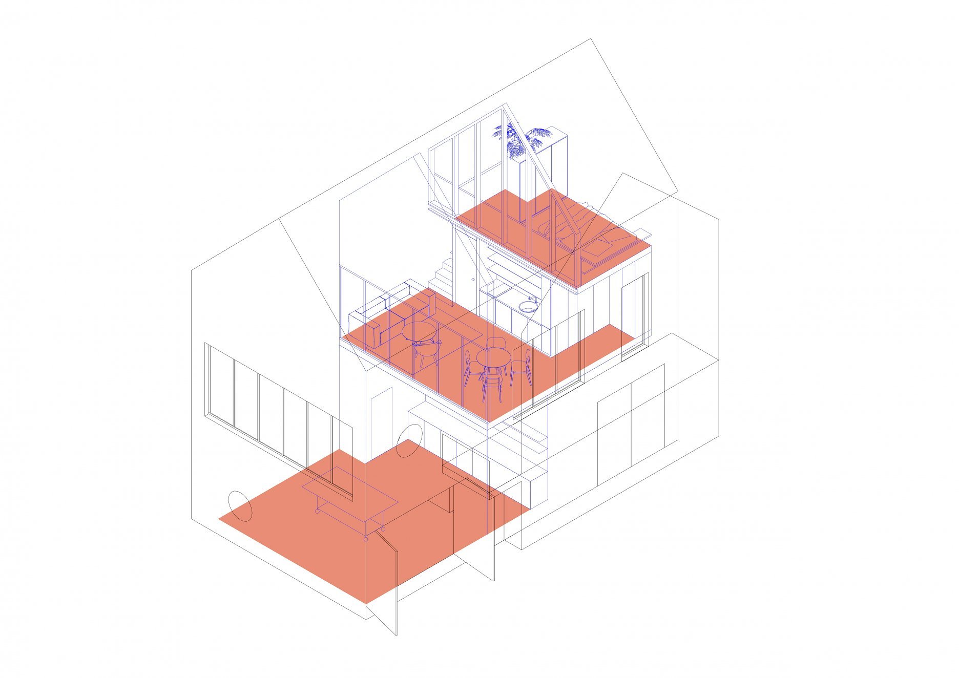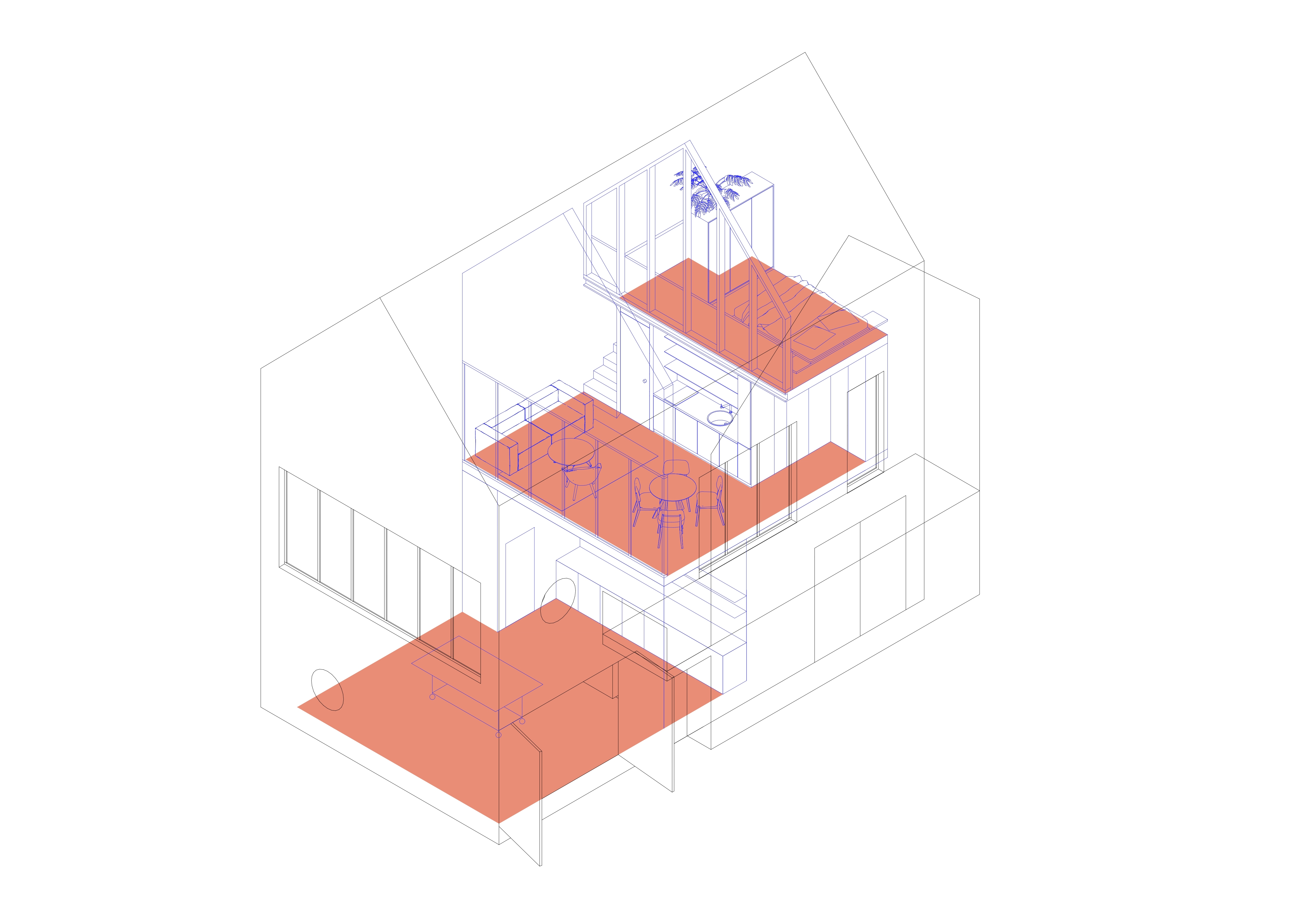 Návrh pracuje s priehľadmi a archetypálna forma schránky domu je vo vnútri koncipovaná ako kaskádovito ustupujúce podlažia, pričom je priestor nad kaskádami otvorený až po strechu domu. Vzniká tak spodný priestor ateliéru, ktorý siaha cez 3 podlažia a je možné ho otvoriť do dvora. Ateliér má príručnú dielňu, ktorú je možné oddeliť počas výstav. Zároveň je vybavený žeriavom s možnosťou zdvíhania a prenášania objektov. Táto možnosť ponúka využitie pre prácu na nadrozmerných objektoch.
