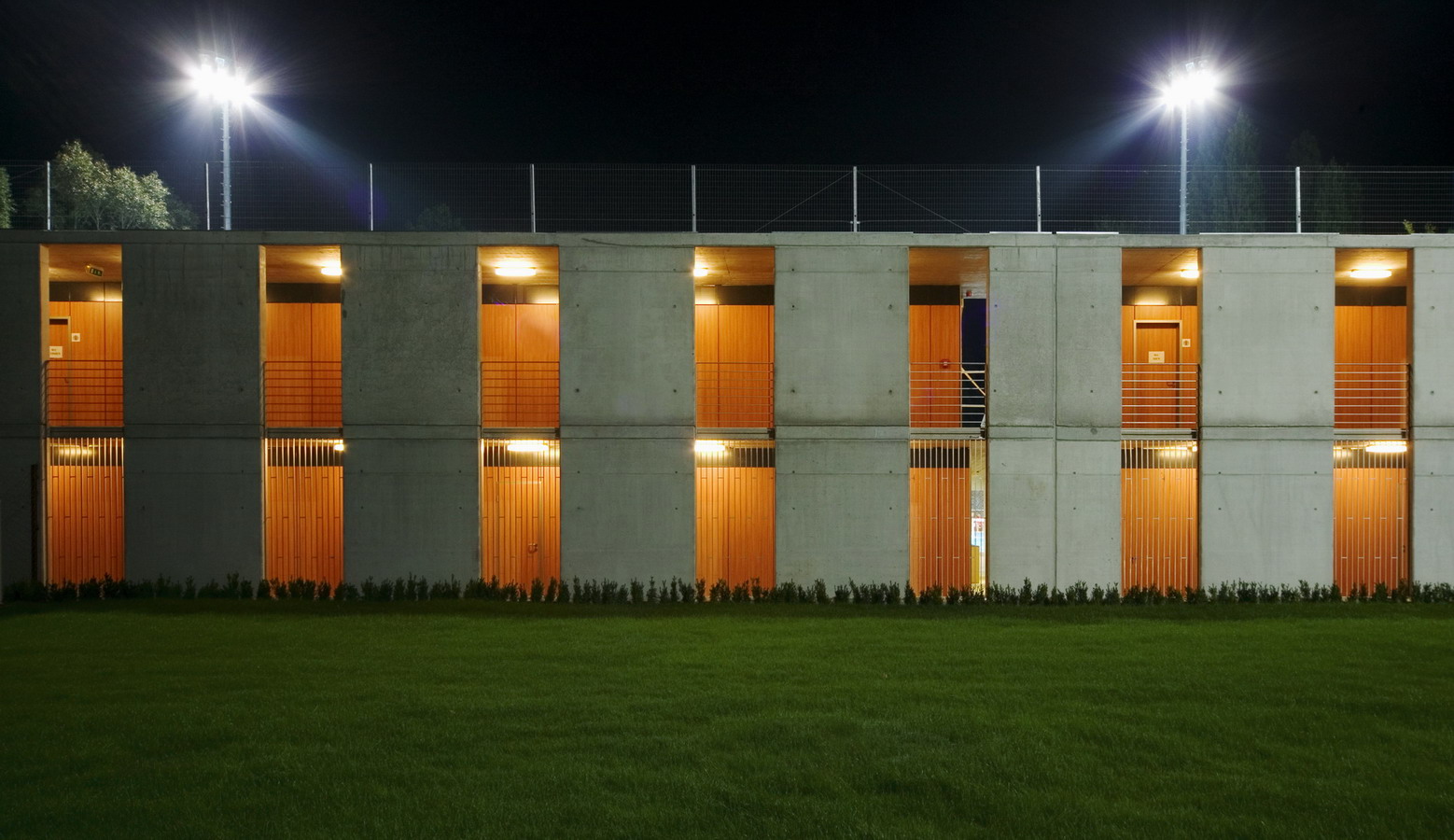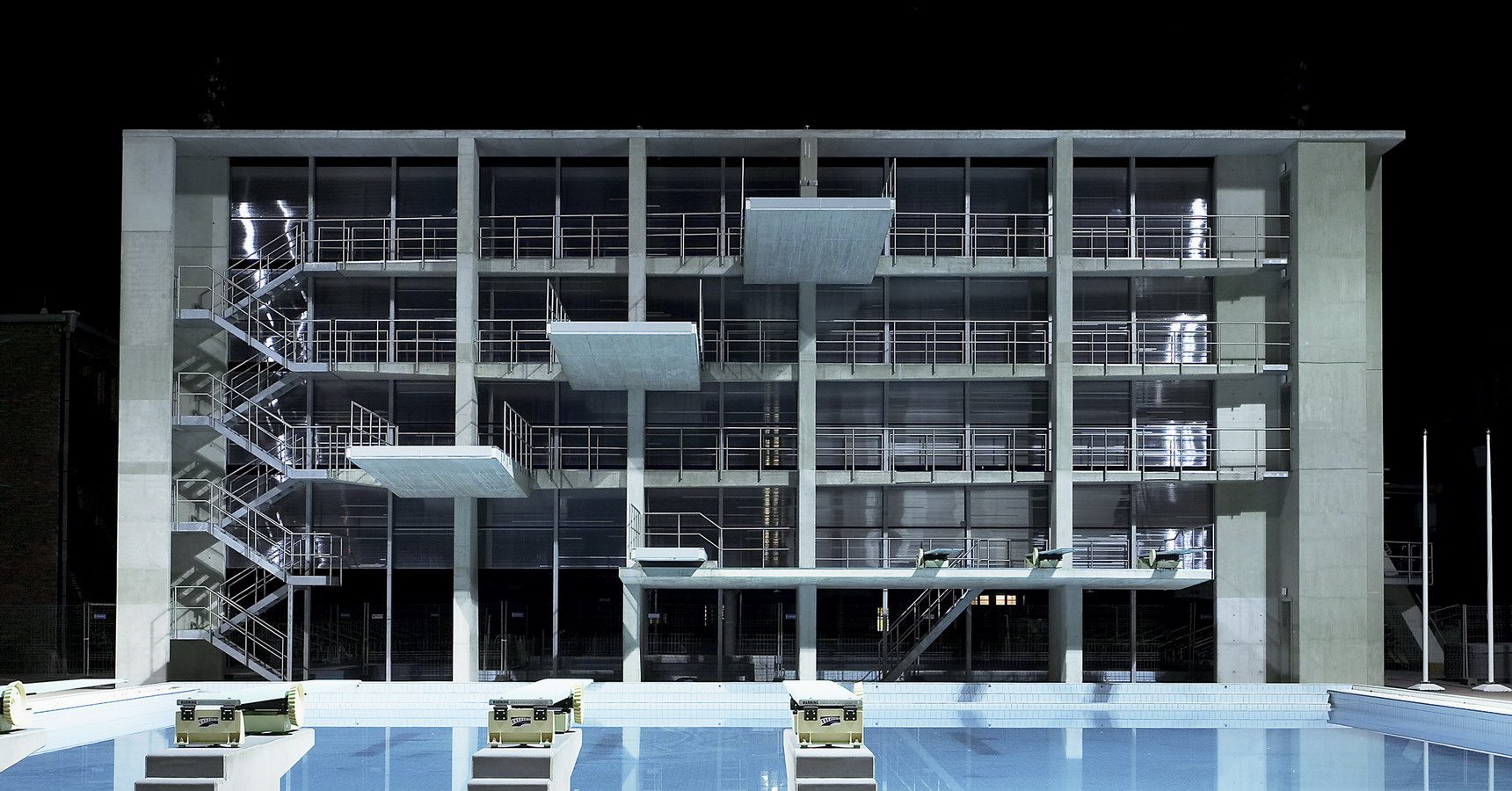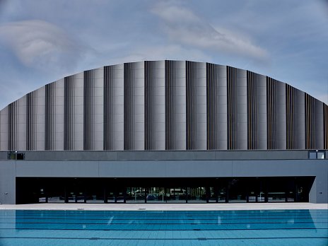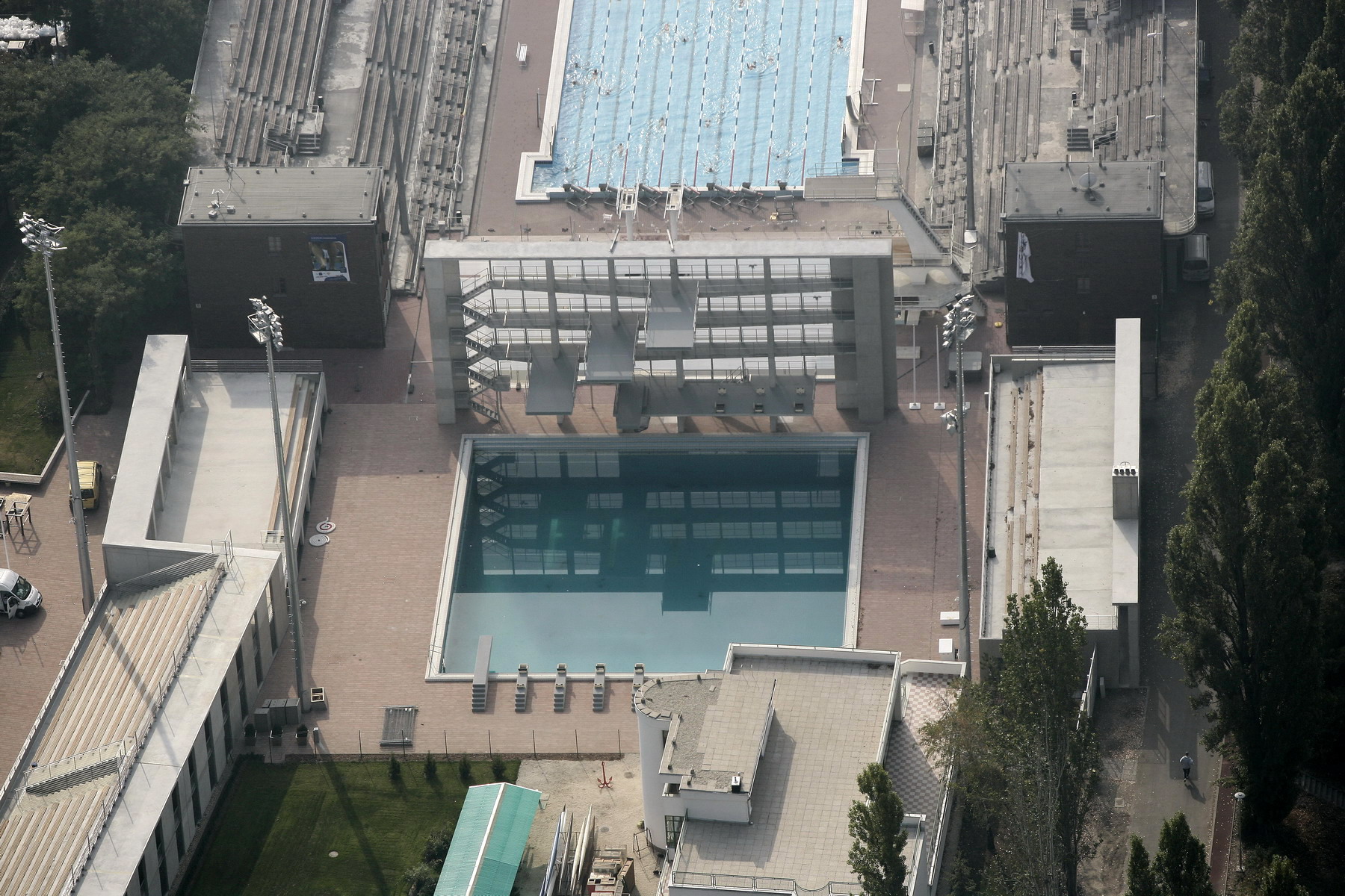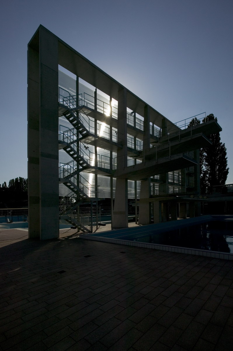 Plocha vymedzená pre stavbu neumožnila ideálne lineárne usporiadanie nových bazénov. Menší skokanský bazén bol teda umiestnený vedľa existujúceho plaveckého v predpísanom smere sever - juh. Vzhľadom k priestorovým obmedzeniam aj toto usporiadanie bolo možné iba vďaka demolácii tribúny vedľa pôvodnej skokanskej veže. Oba bazény sa podarilo umiestniť vedľa seba a tvoria jeden funkčný celok. Ďalším problémom bola severná strana jestvujúceho bazénu. Bolo tu treba integrovať nový architektonický prvok skokanskej veže tak, aby nadväzoval na odkaz pôvodného architektonického riešenia. Veža slúži aj ako bariéra oddeľujúca bazény. Pozdĺžny tvar vyplíva z potreby odlíšiť sa od pôvodných mostíkov, pri starom bazéne.