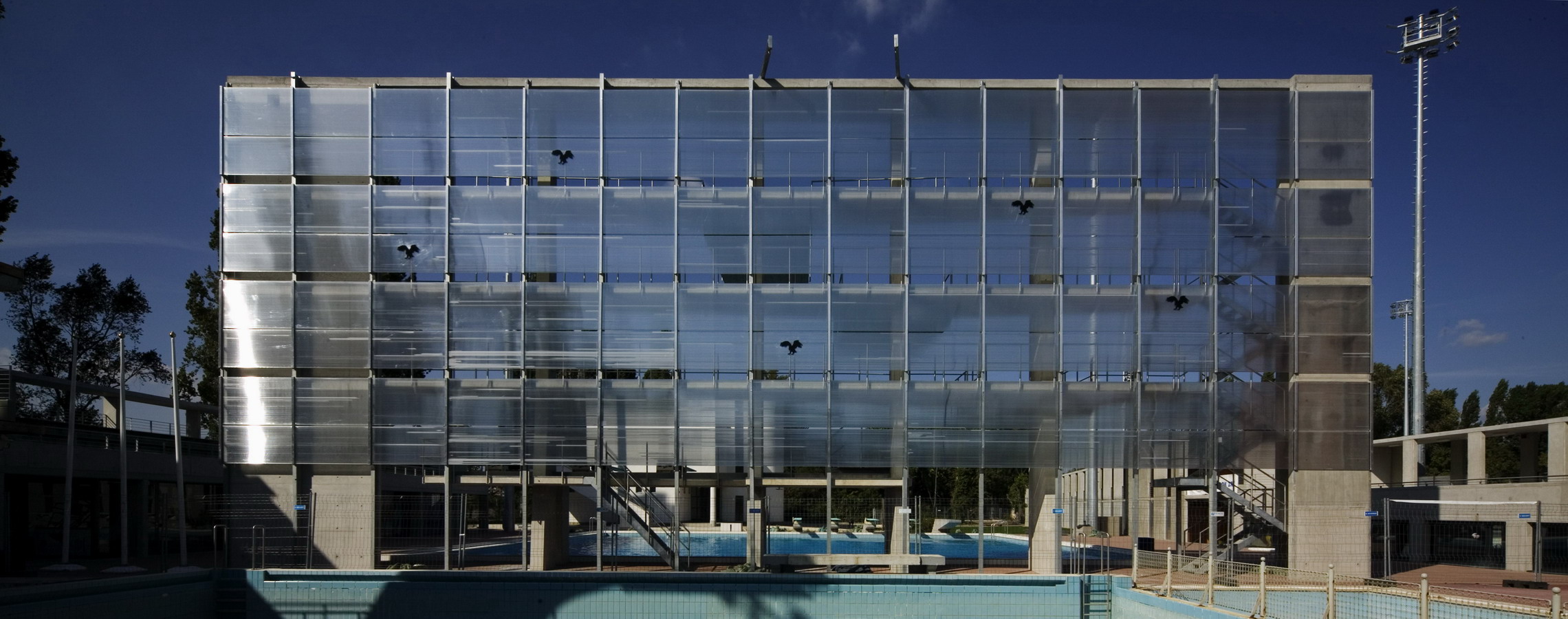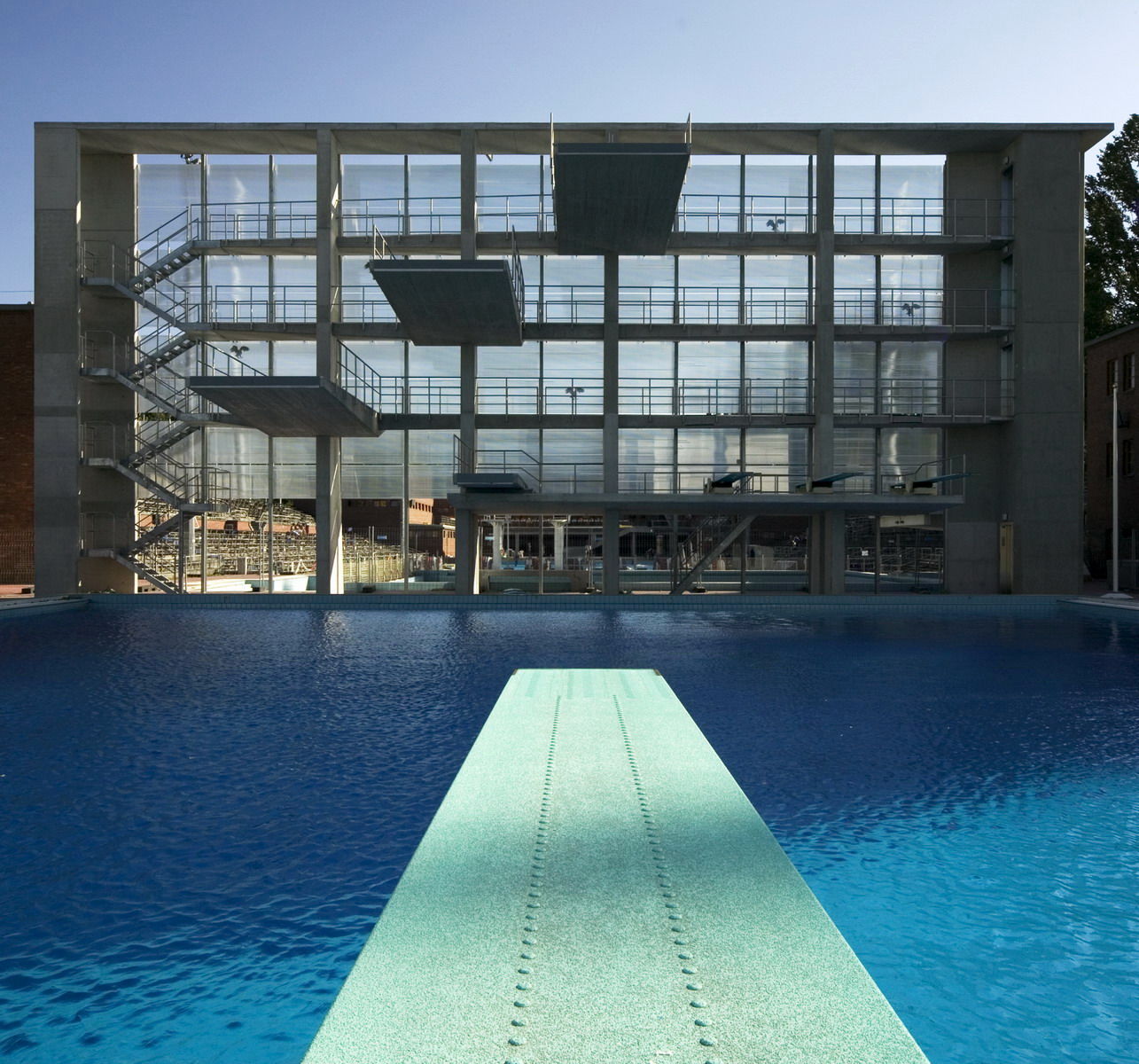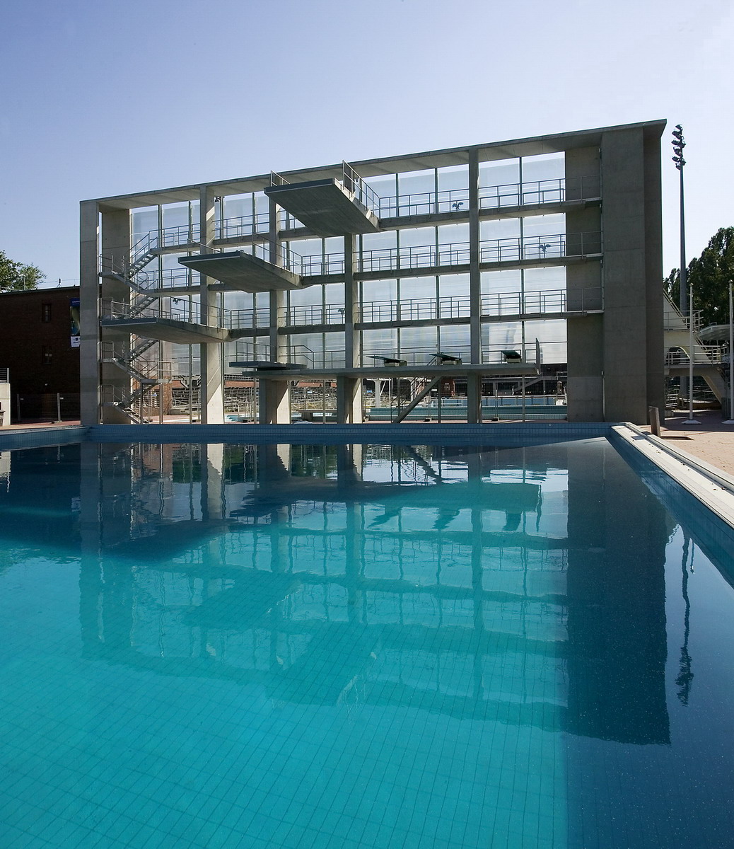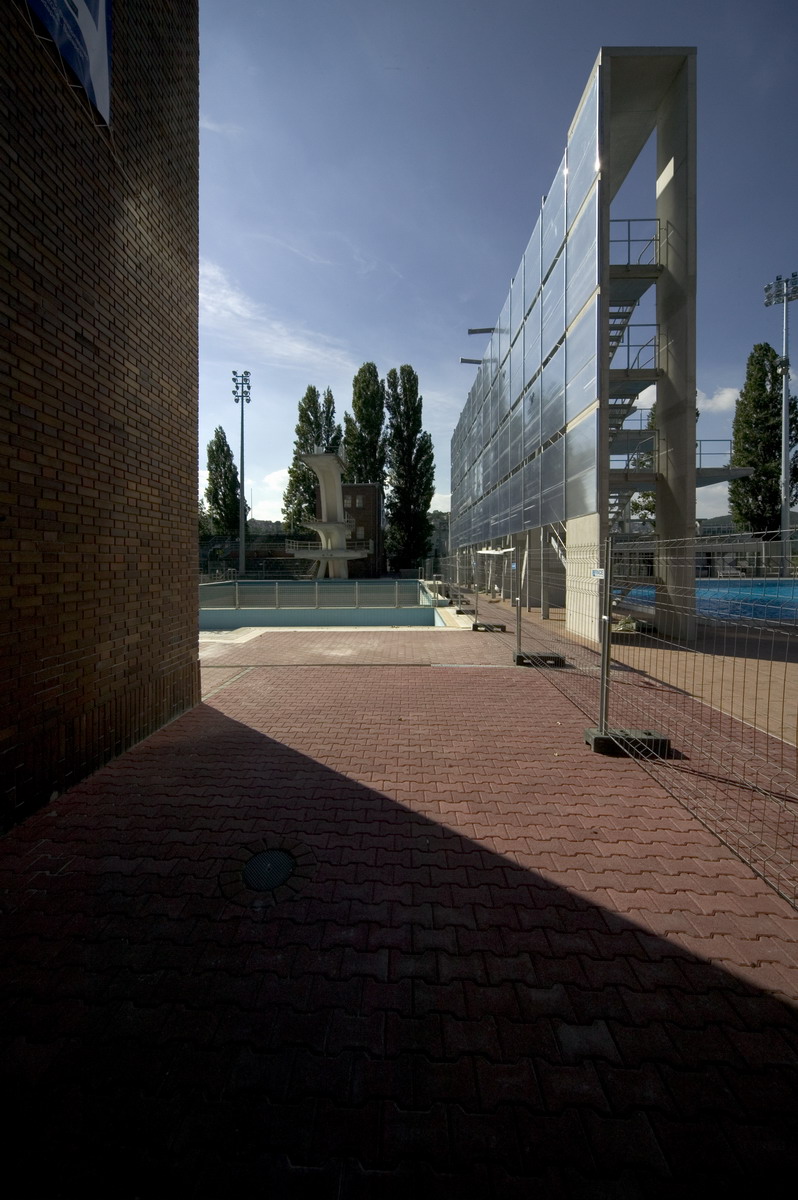 Trvalé tribúny, terasa, šatne, sprchy, toalety, a telocvičňa boli tiež umiestnené medzi týmito dvoma bazénmi, aby vznikla jednotná vertikálna stavba. Usporiadanie bazénov umožňuje naplnenie potrieb prevádzky vyplývajúcej z funkcie bazéna a požiadavky ohľadom prístupu zvonku. Tribúny sú postavené z monolitického železobetónu doplneného oceľovými pozinkovaných lištami a sedadlami z tropického dreva vhodného na vonkajšie použitie. Skokanská veža a pomocné konštrukcie sú zhotovené z monolitického železobetónu.