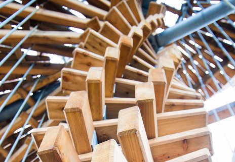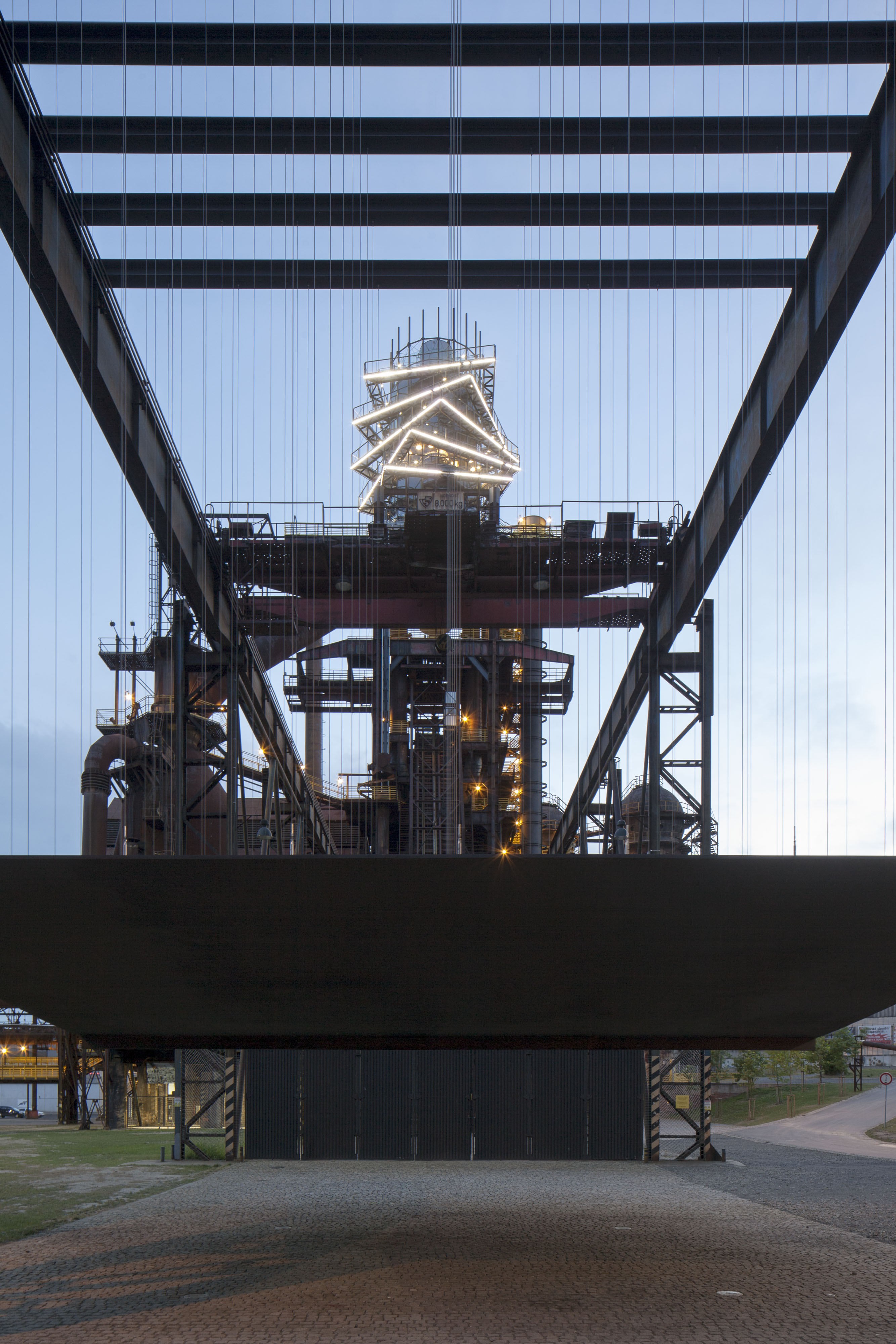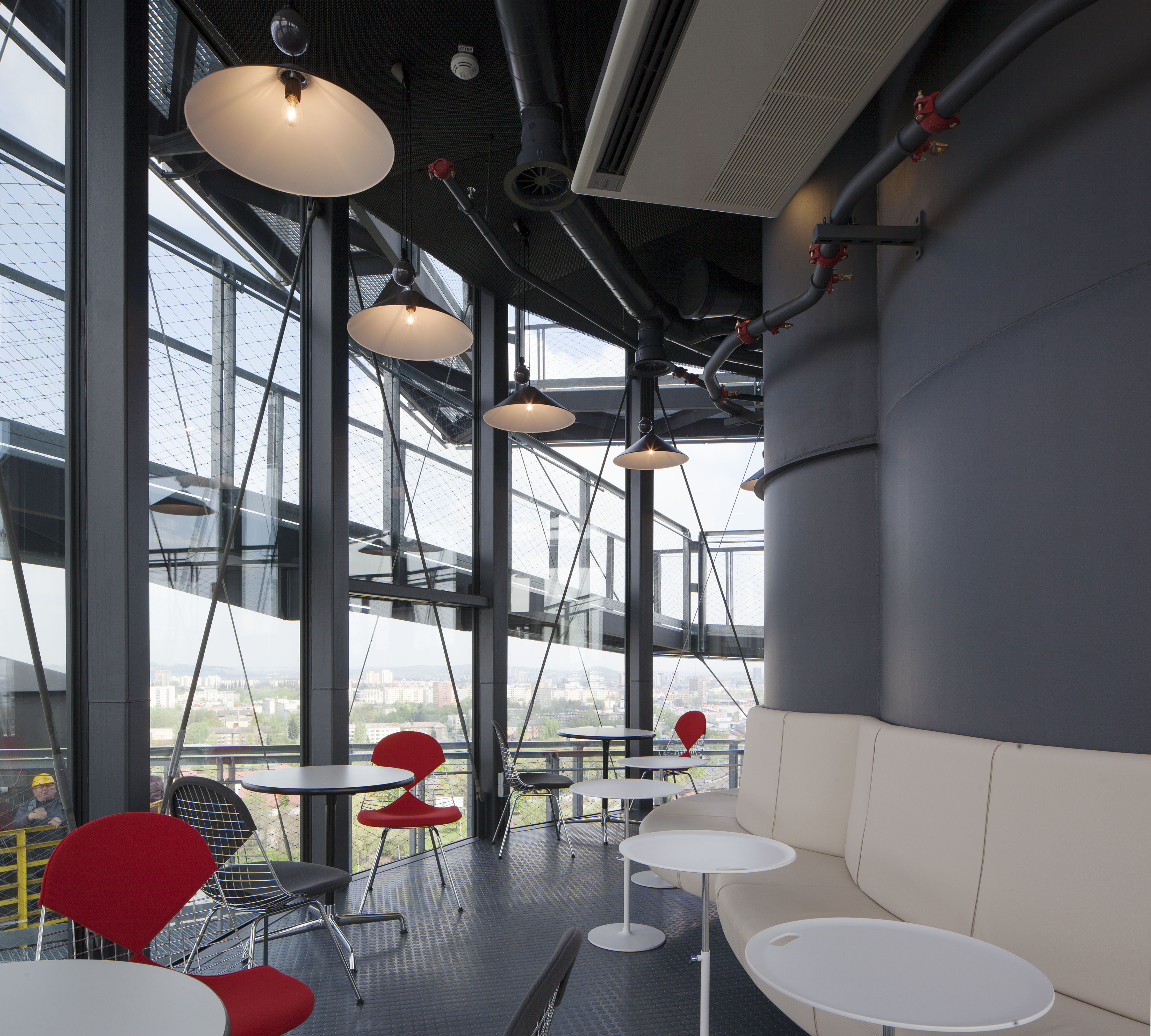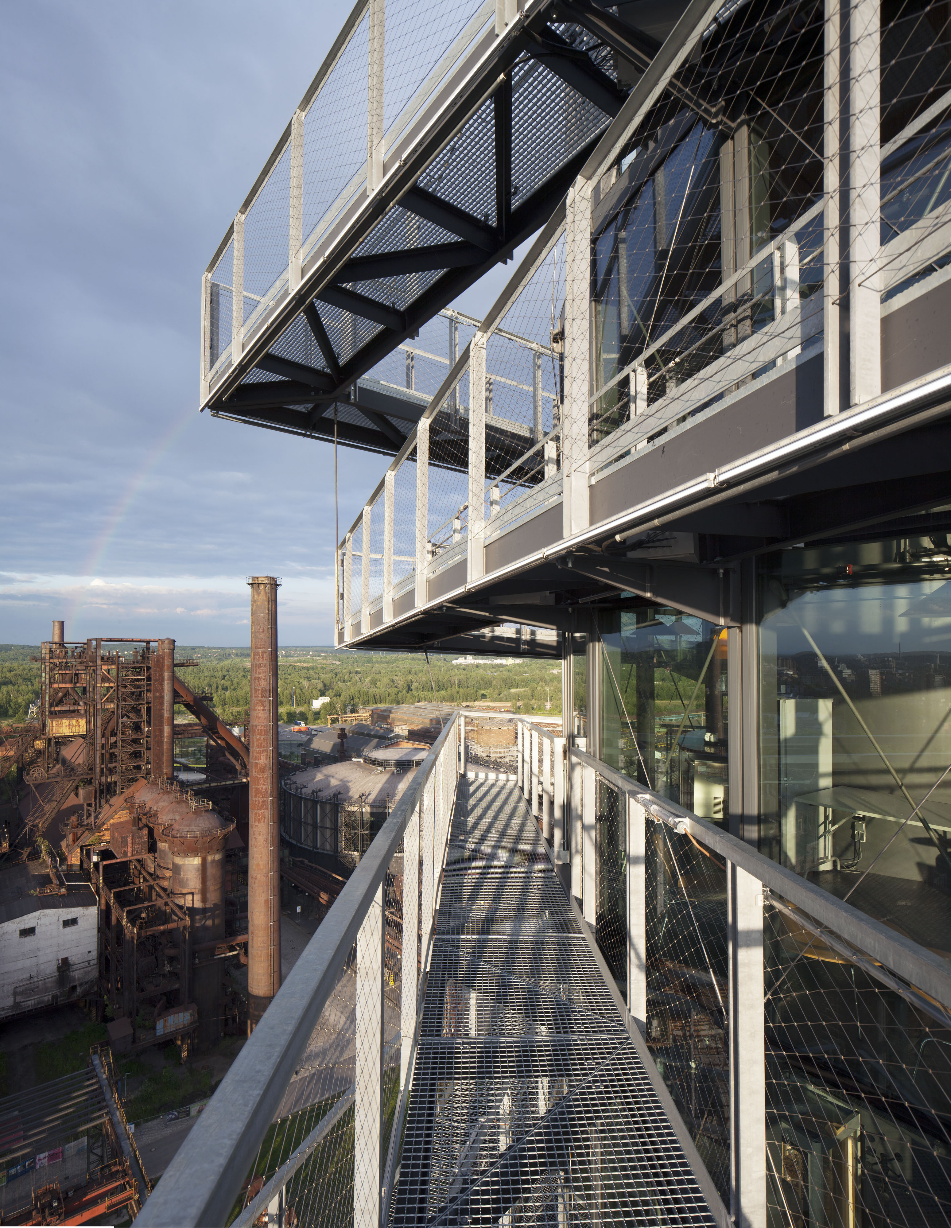 Nosná konštrukcia objektu je oceľová a je zavesená do vrcholu existujúcej oceľovej konštrukcie vysokej pece č.1. Stena tubusu je tvorená 19-timi stĺpikmi, ktoré sú v úrovniach jednotlivých poschodí nadstavby po obvode spojené nosníkmi. Tuhosť steny tubusu je zaistená vnútornými a vonkajšími šikmými tiahlami v rovine preskleného plášťa. Vnútri tubusu je vnútorný plnostenný tubus, ktorý vzniká prienikom troch rúr rôznych priemerov. Oba tubusy, vonkajšie i vnútorné, sú v spodnej časti nezávisle vyvesené systémom predpínaných šikmých tiahel do konštrukcie vysokej pece a to v rohoch existujúcej štvorbokej rámovej veže. Zvislé reakcie sú tak prenášané len osovými silami a subtílny vzhľad konštrukcie bol zachovaný. Prenos vodorovných síl je zaistený dvoma úrovňami predpínaných vodorovných stužidiel v spodnej časti nadstavby, ktoré prepájajú nadstavbu s konštrukciou pece. Tiahla boli predpäté na hodnoty zaisťujúce rovnomerné rozdelenie síl do existujúcej aj do novej konštrukcie. Sily v tiahlach boli merané tenzometricky na všetkých tiahlach. Po vonkajšom obvode preskleného tubusu sú "špirálovito" vedené evakuačné lávky. Celkovo sa jedná o 19 ramien lávok šírky cca 1m, s pozdĺžnym sklonom cca 6%. Oba pozdĺžne nosníky lávky sú v polovici rozpätia uložené na konzolách vedených zo stĺpikov vonkajšieho tubusu. V rohoch sú lávky vzájomne prepojené tiahlami, najvyššia úroveň tiahel je vyvesená z vrcholu nadstavby, kde je vodorovné stužidlo. Spodné ramená lávok sú pomocou laniek spojené s existujúcou konštrukciou pece. Nástup na lávky je z podesty schodiskovej veže vo výške + 59,1, na ktorú nadväzuje nová krátka plošina prepájajúca schodiskovú vežu so spodným ramenom evakuačnej lávky. Ako pochôdzna plocha sú navrhnuté pororošty s protišmykovou úpravou, ktoré museli byť z geometrických dôvodov lávky rozdelené na trojuholníkové dielce. Pororošty sú po obvode podopreté diagonálnymi prvkami lávky a pozdĺžnymi nosníkmi. Zábradlie je vedené po vnútornom aj vonkajšom pozdĺžnom nosníku lávky a je tvorené nerezovým lankovým systémom. Medzi vnútorným a vonkajším tubusom sú vedené radiálne nosníky, na ktorých sú uložené podlahy. Tu bol použitý systém ľahkých podláh s vylúčením mokrého procesu a to z cementotrieskových dosiek uložených na trapézové plechy. Ako nášľapná plocha potom bola zvolená priemyselná guma.