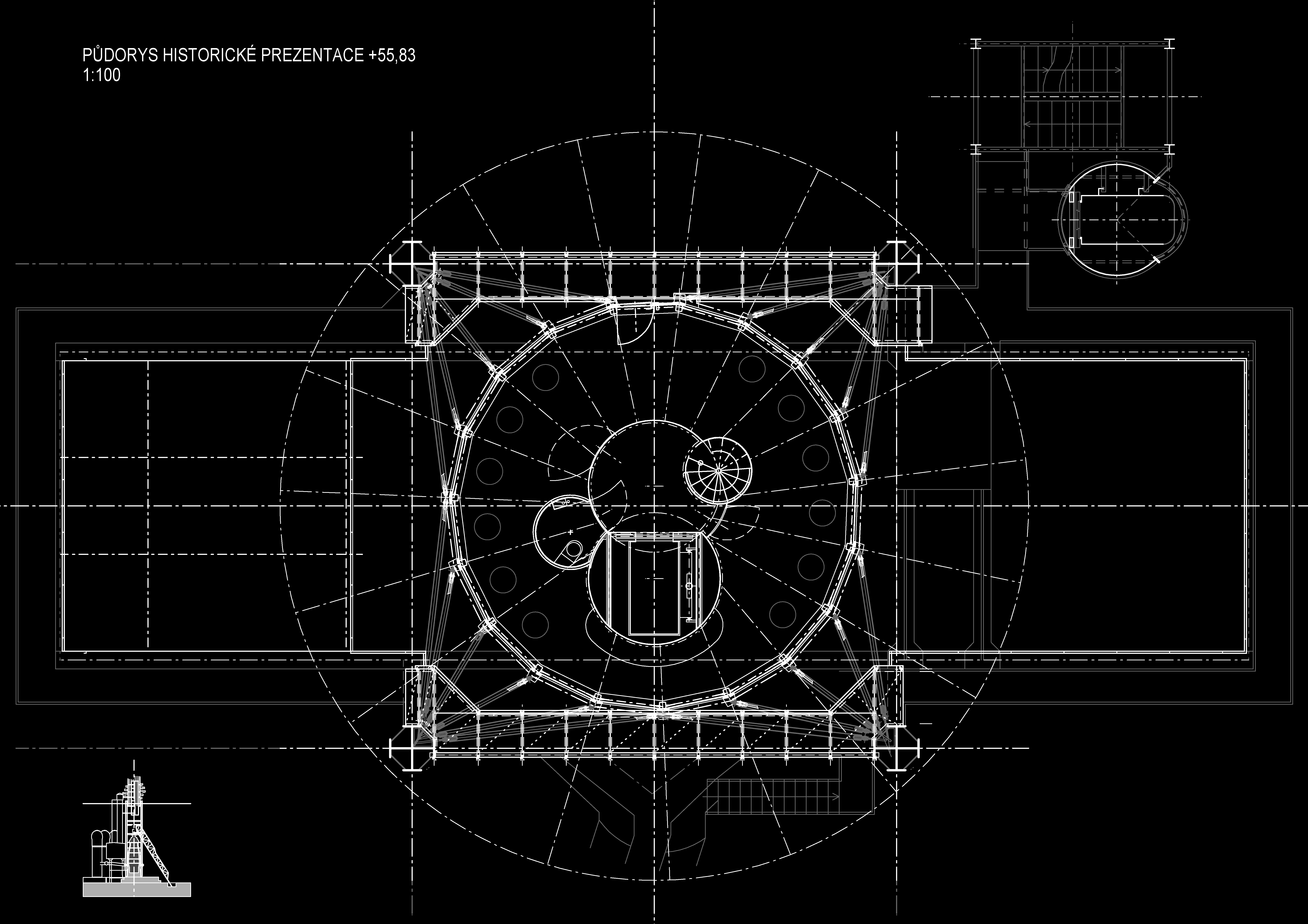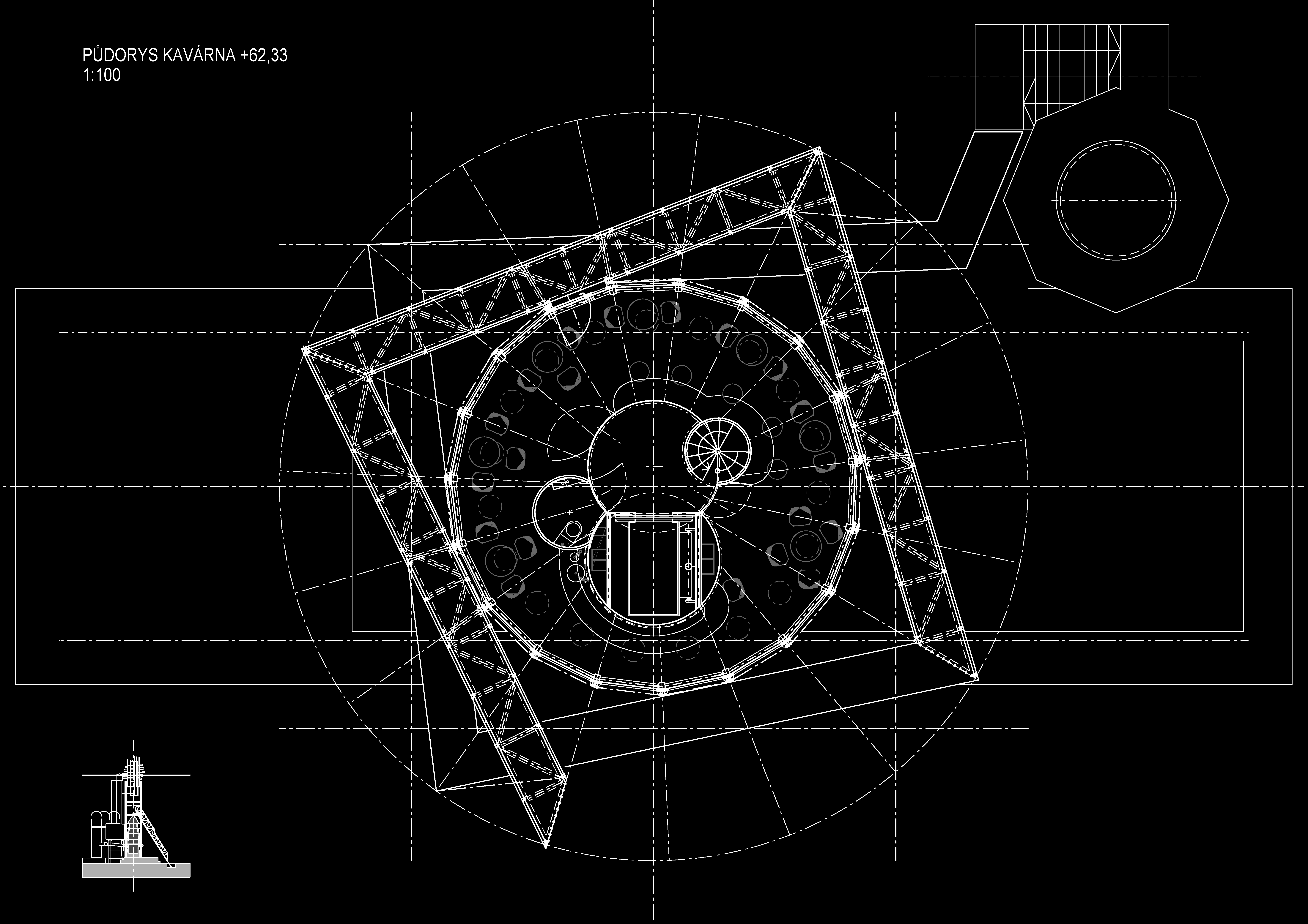 Os - pevné jadro nadstavby, tvorí sieť oceľových trubiek. Je umiestnené v osi telesa samotnej vysokej pece i rámovej kostry. Toto oceľové jadro zabezpečujúce vertikálnu dopravu osôb výťahom a prevádzkovým točitým schodiskom je zvonka obalené už vyššie spomenutým valcom s presklenou fasádou. Vzniknutý medzipriestor potom v jednotlivých poschodiach - úrovniach - tvorí hlavný úžitkový priestor so svojimi funkciami. Pozdĺž preskleného valca, s podstavou 19 hranného polygónu, sa v úrovni vrcholu kostry od evakuačného schodiska vinie špirála - sústava lávok, prepájajúca jednotlivé funkčné podlažia mimo objektu a zaisťujúca požiarnu evakuáciu osôb z nadstavby. Prepája na úrovni A +55,825 prezentačný priestor - súčasť náučnej trasy po peci, na úrovni B +62,325 kaviareň, na úrovni C +66,225 klub a na úrovni D +71,425 strešnú vyhliadkovú terasu.