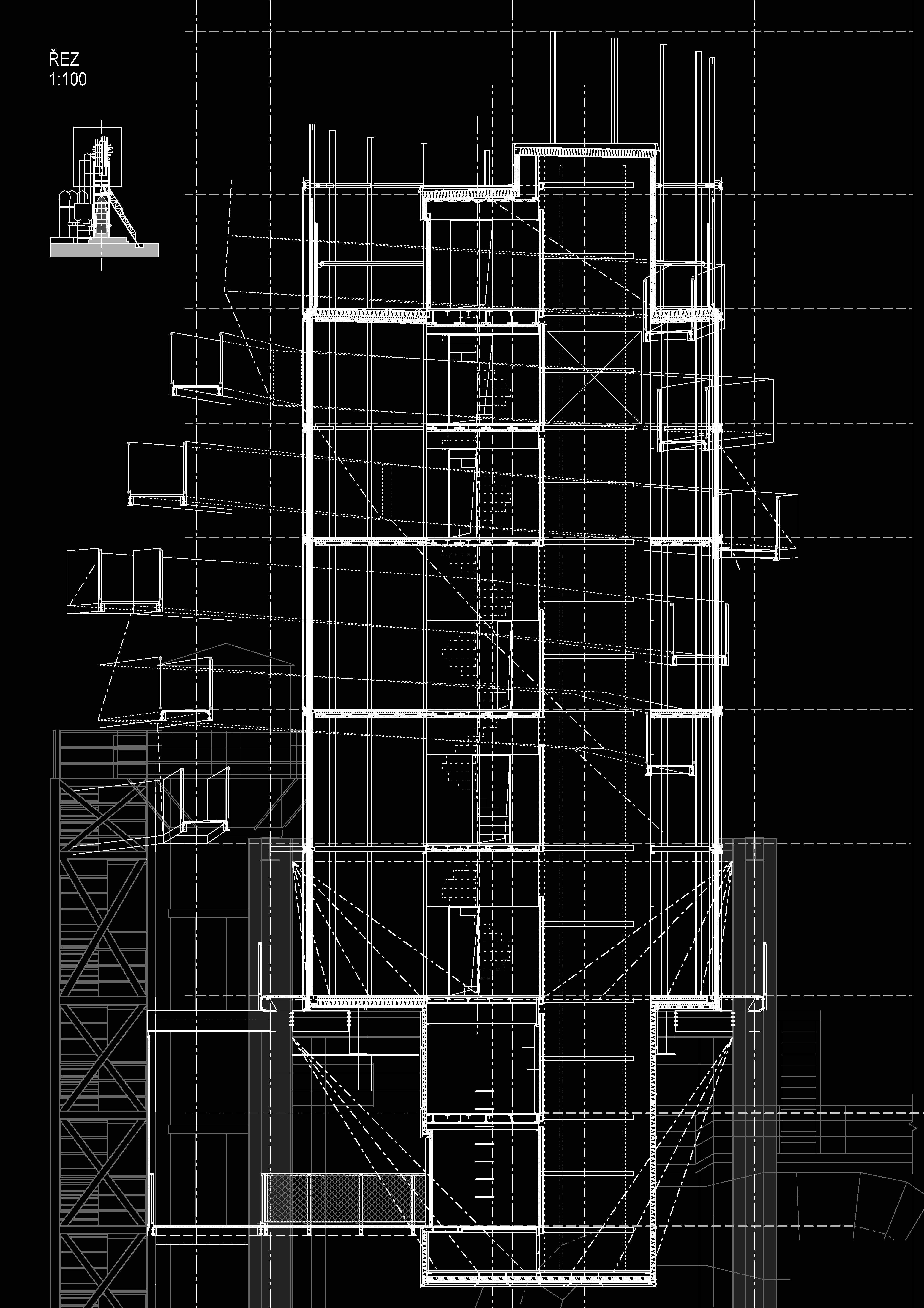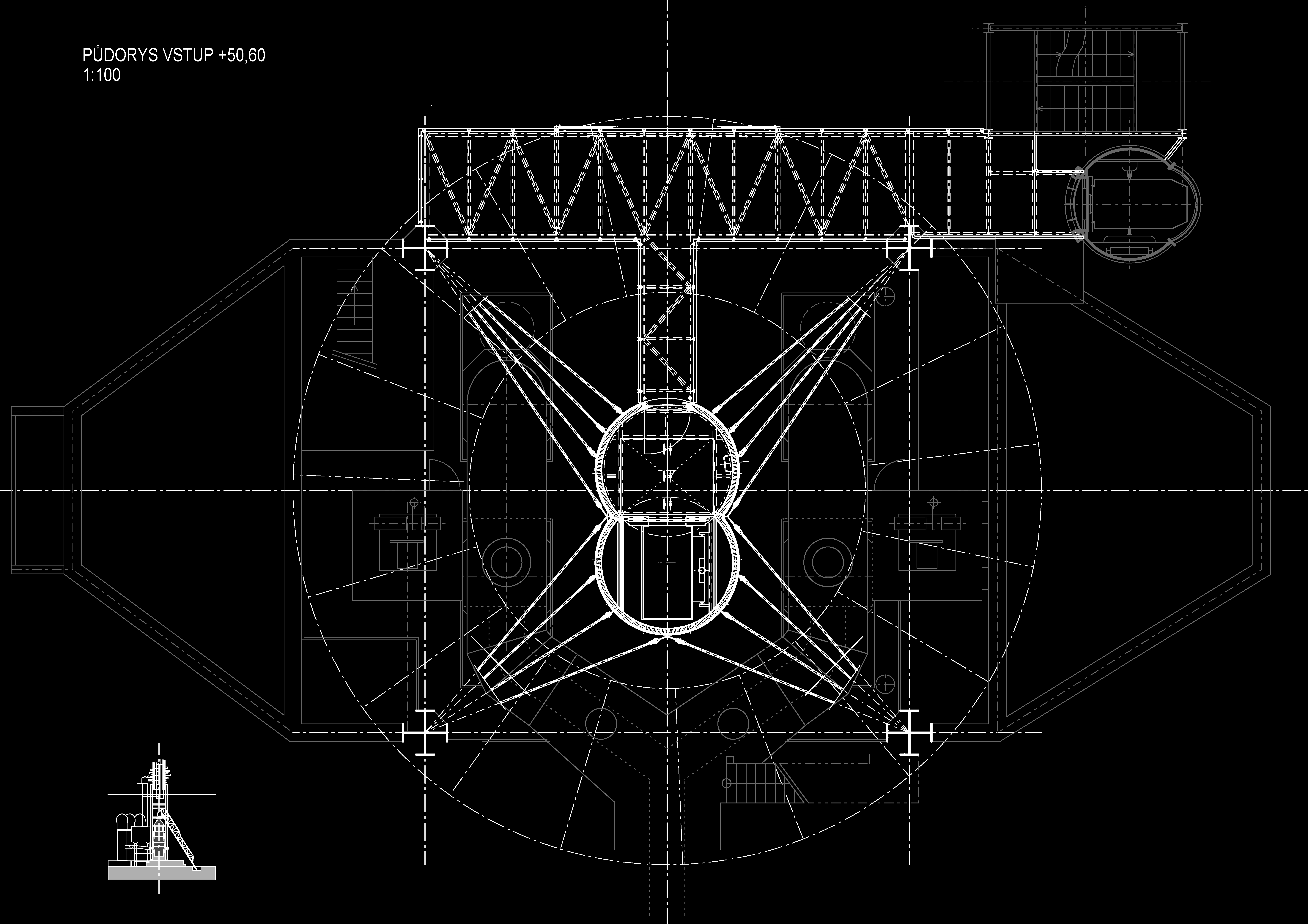 Základný objem nadstavby tvorí valec s priemerom 9m zavesený do servisnej kostry VP1 (11x11m vztýčenej do výšky 60m nad okolitý terén). Týmto 18-metrovým preskleným valcom prechádza stredom z úrovne +50,600 driek - vnútorný tubus, ktorý zaisťuje hlavný vstup a vnútorné vertikálne komunikácie nadstavby. Ten je ukončený na úrovni strešnej vyhliadkovej terasy. Dopravné riešenie bolo súčasťou projektu „Doprovodná infrastruktura cestovního ruchu pro NKP“ a je teda súčasťou komplexného dopravného riešenia oblasti DOV. Samotný prístup k telesu nadstavby vysokej pece potom stavebno zabezpečila predchádzajúce stavebná etapa - stavba "Reaktivácia vysokej pece č.1", ktorá realizovala tiež šikmý "skipový" výťah.