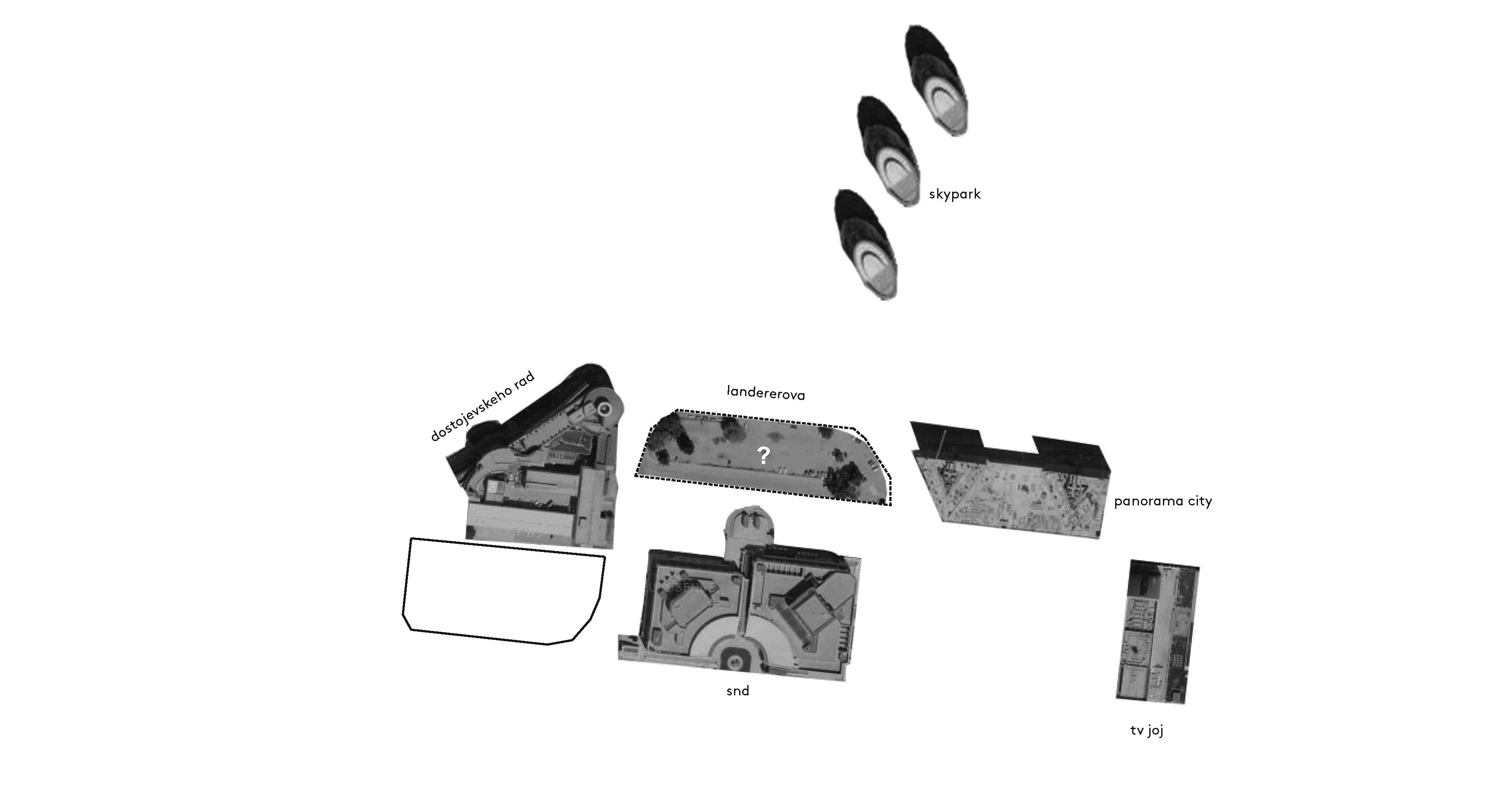 Očakávaním veľkého počtu pokračujúceho rastu stavieb väčšieho objemu ako Panorama city, Skypark, a konfrontovaním pozemku s dalšími okolitými veľkosťou monumentálnymi objemami sa urbanistická koncepcia tohto priestoru obracia na myšlienku konfrontácie okolia javom zvaným ”break from the monuments” (pauza od monumentov).