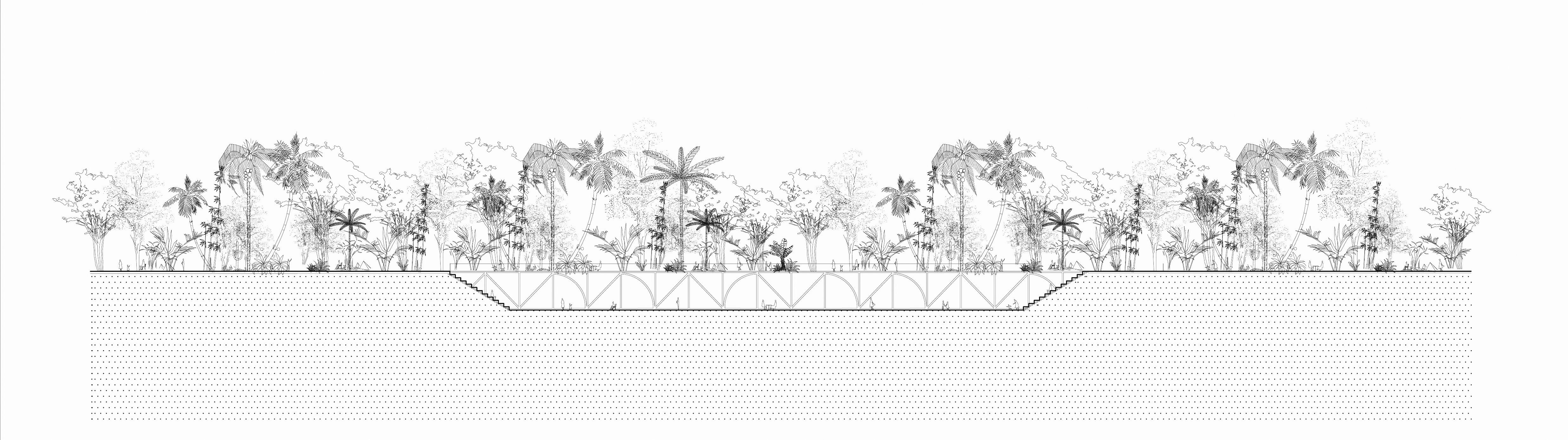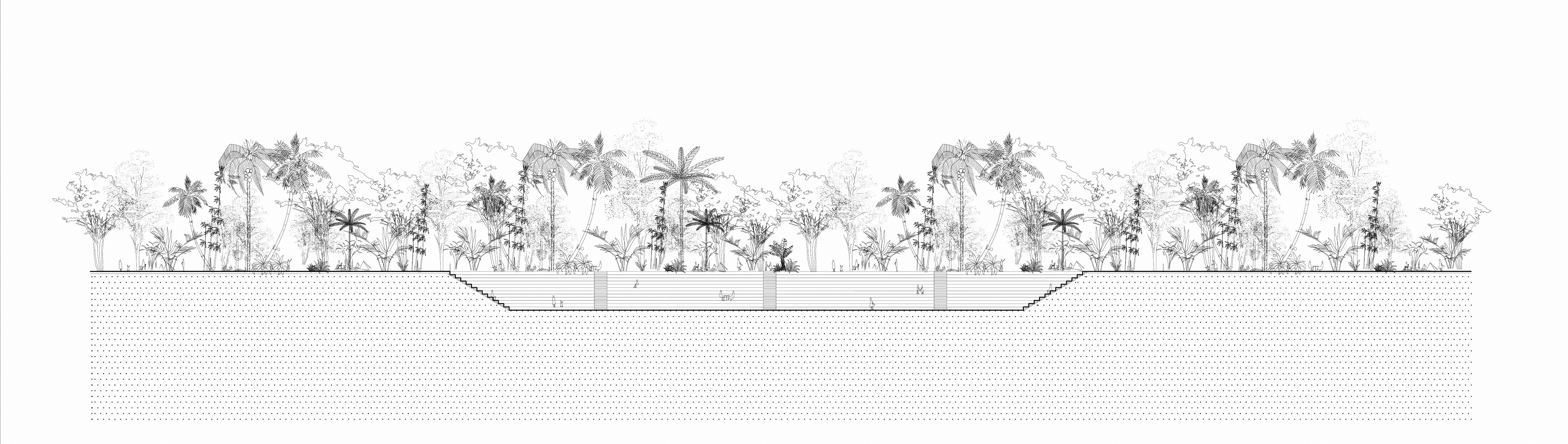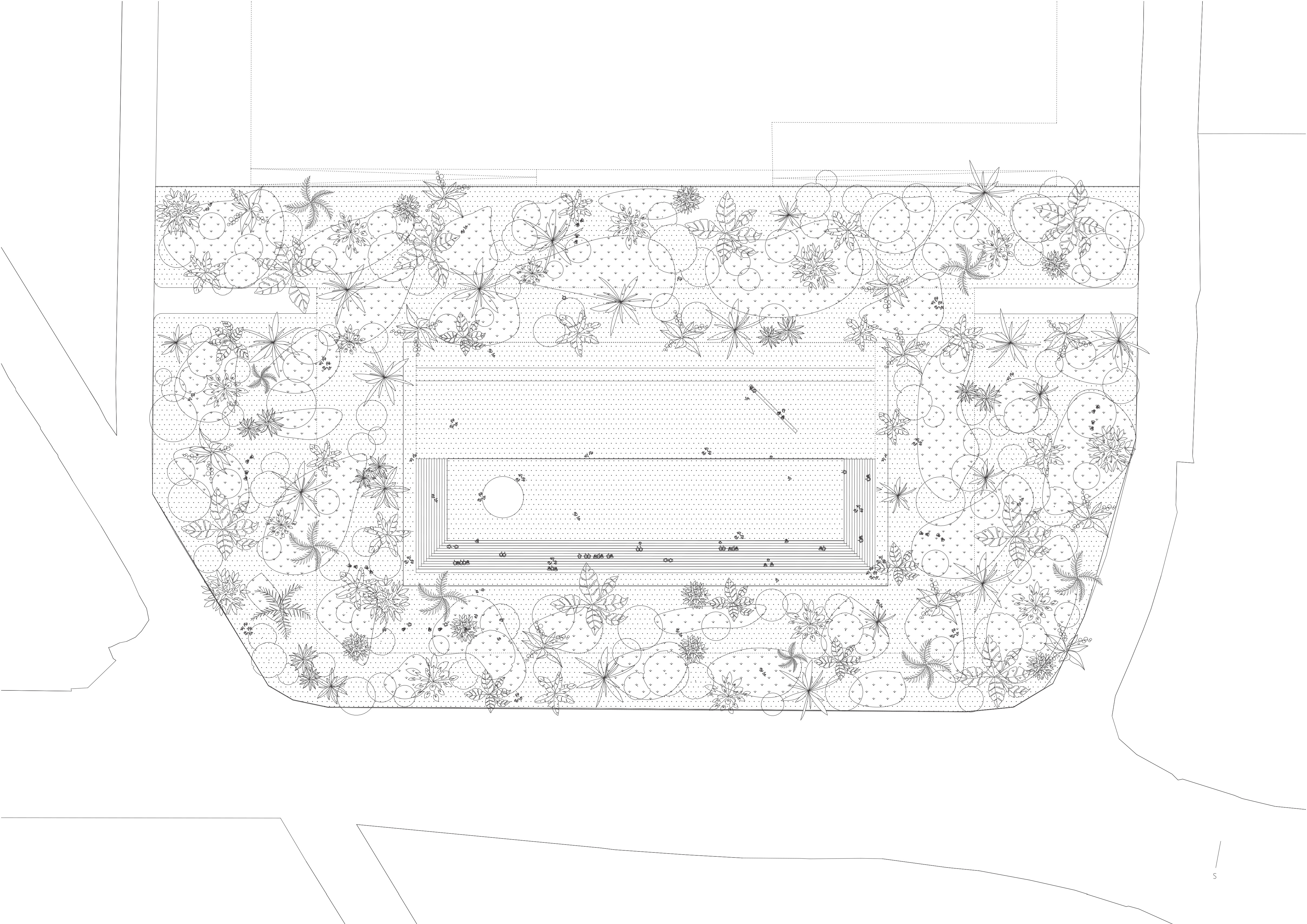 Spätý vzťah medzi objektom, jamou a pralesom dostáva do priestoru kontrastnú ale zároveň intímnu mierku mestskosti.
