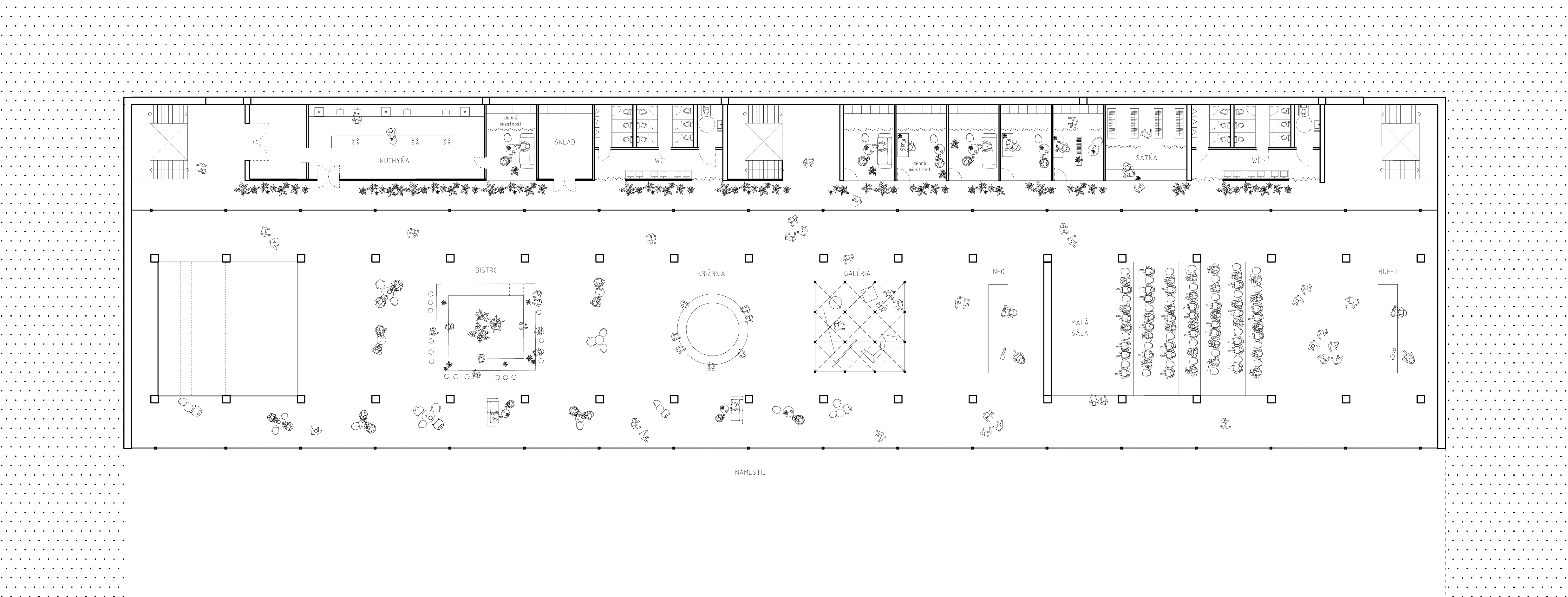 Program objektu je jednoduchý. Na úrovni jamy je objem koncipovaný na intenzívnejšie a frekventovanejšie funkcie, ako sú bistro, knižnica, galéria alebo malá eventová sála. Pravú podstatu objektu nachádzame pod touto úrovňou, s ktorou je zároveň dôrazne prepojená a vytvára tak malú pozorovateľnú krajinu differencujúcich úrovní objektu.